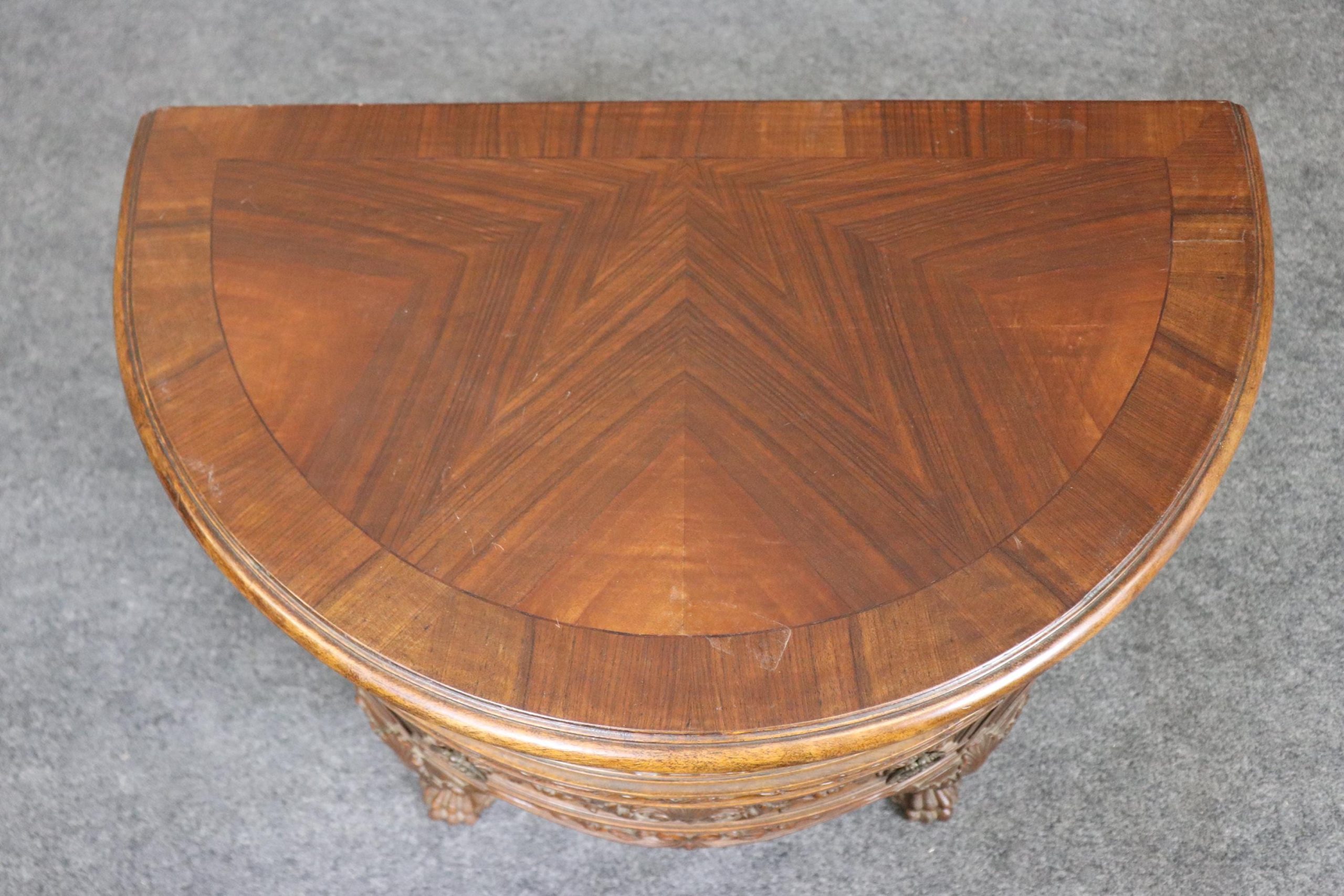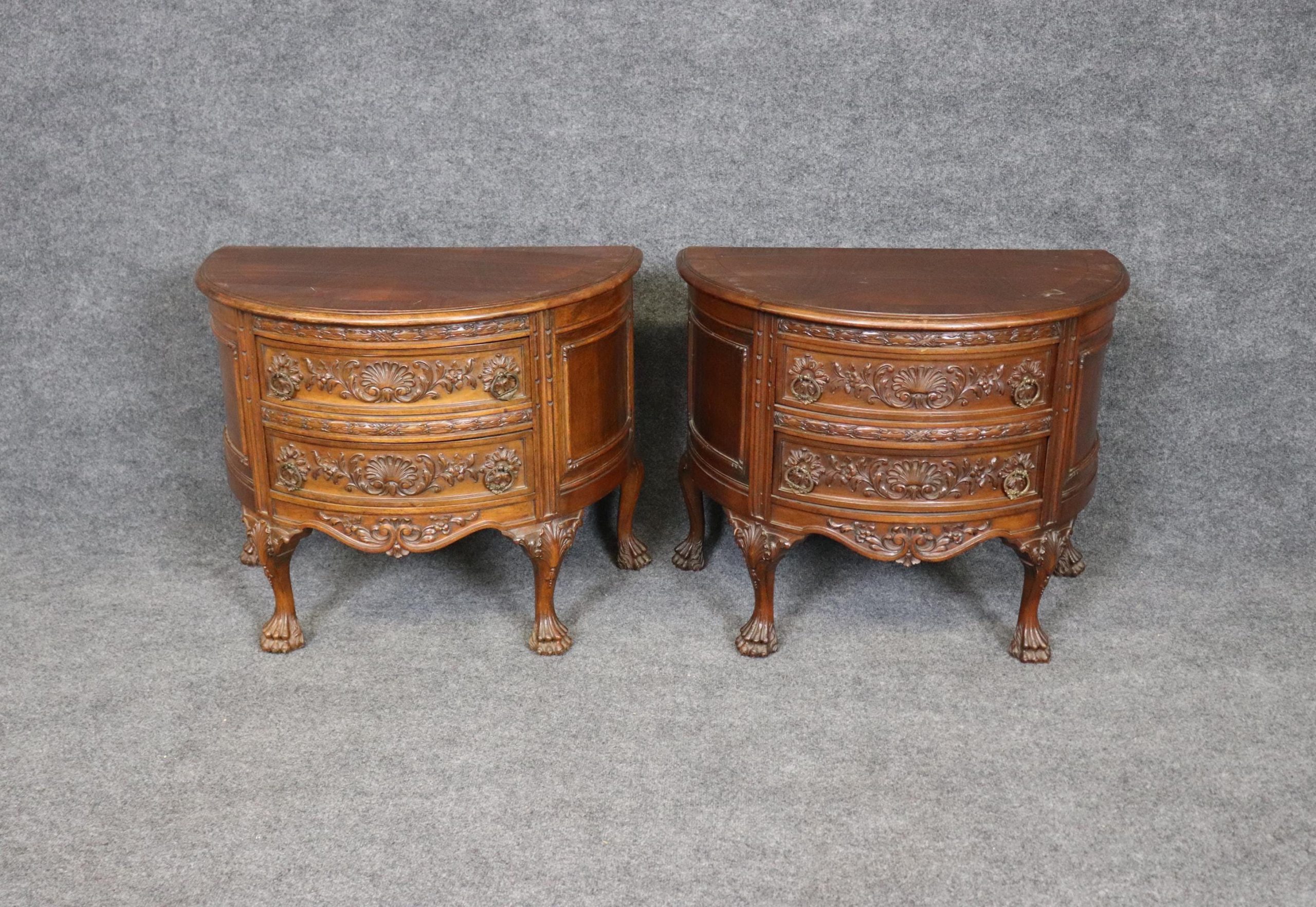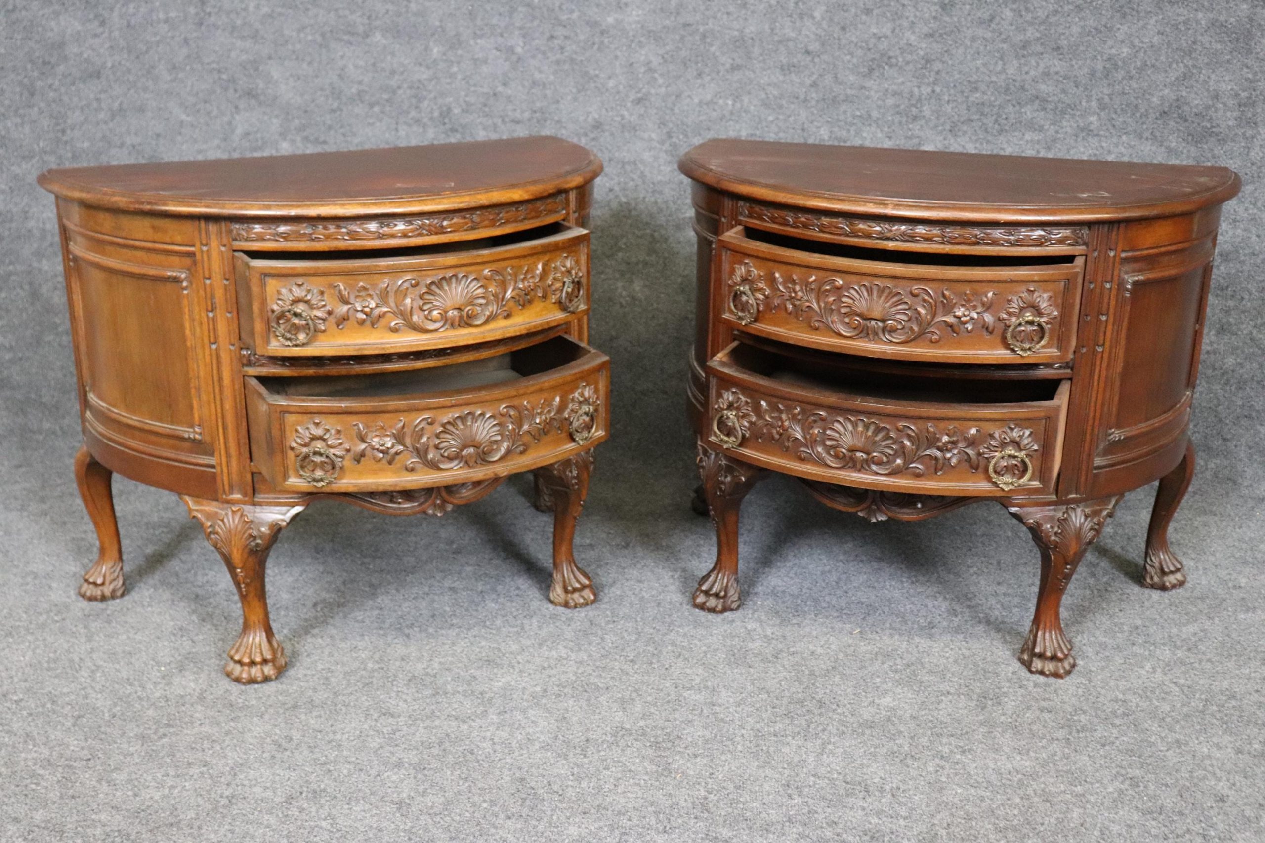 This 1960s vintage pair of Georgian style carved demilune nightstands / end tables is perfect for you and your home! One nice thing about this pair is its ability to not only be used in a variety of areas such as your living room, bedroom, office, or entryway as end tables but they could also be used as nightstands. The nightstands are equipped with 2 drawers, perfect for storing your personal belongings. This pair is bound to bring a sense of sophistication and character into your home or place choosing and will certainly be a topic of conversation at your next gathering or event! Antique furniture and vintage pieces have stood the test of time and this pair is no exception! With their quality materials and great craftsmanship this pair is bound to last you and your family for many years to come! The pair is in good antique/vintage condition with the exception of some light surface scratches and minor finish loss, but otherwise really good condition!