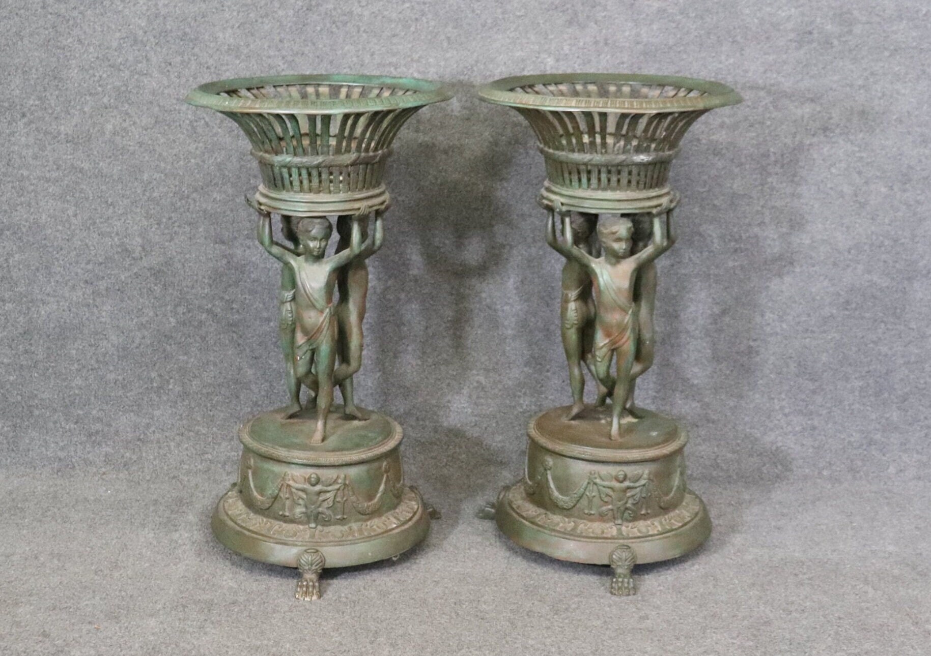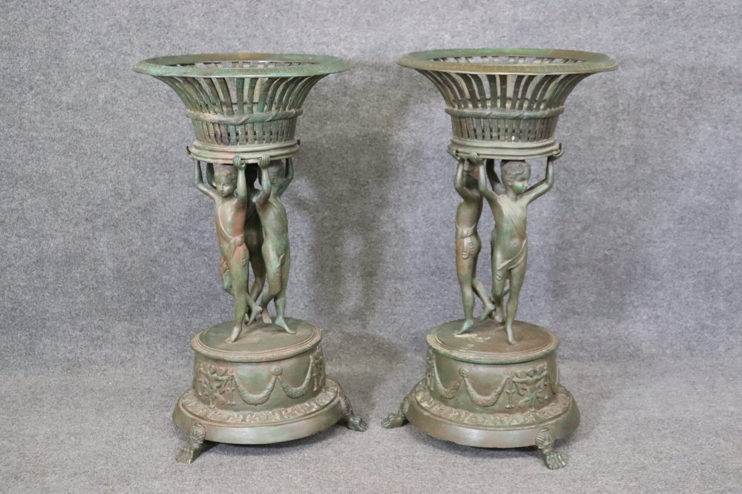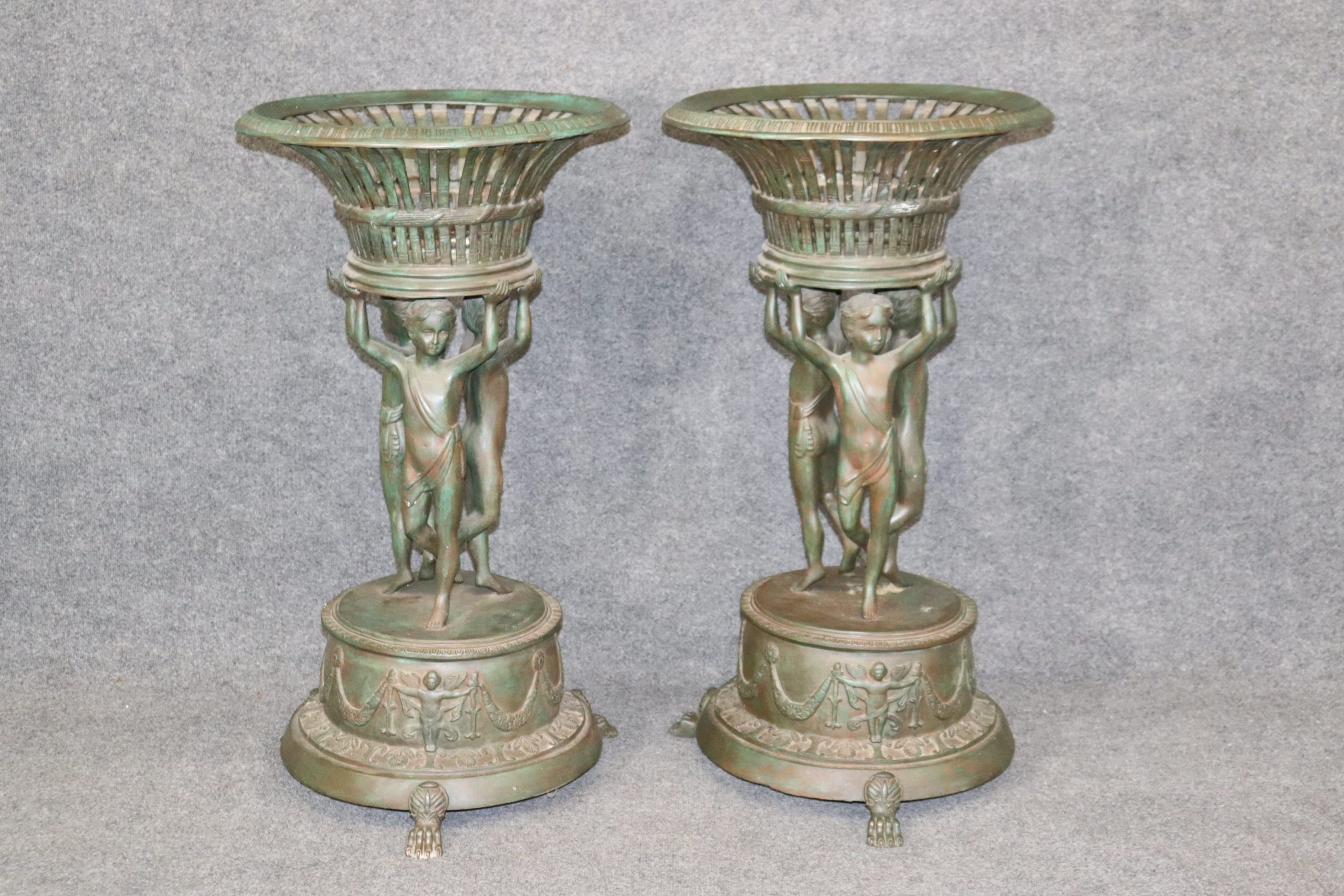 This pair of vintage Grand Tour style metal planters, made after C. M. Clodion, is truly exceptional. Claude Michel (20, December, 1738 – 29, March, 1814), known as Clodion, was a French sculptor in the Rococo style and specialized in elaborate Terracotta and Bronze sculptures. Clodion is one of the most renowned French Sculptors of the 18th and early 19th Century. He used subjects just as Bacchus, Venus, and other Mythological Figures. If you look up Clodion’s work you will also notice the use of tambourines and gourds within some of his sculptures. If you look at the photos provided, you can see the detail in the metal work. These planters will last you for many years and will add a sense of sophistication and character to your patio, entryway, home, office or place of your choosing! They are in good, vintage, condition with some oxidation to the metal and light surface scratches to the finish. Otherwise good condition.