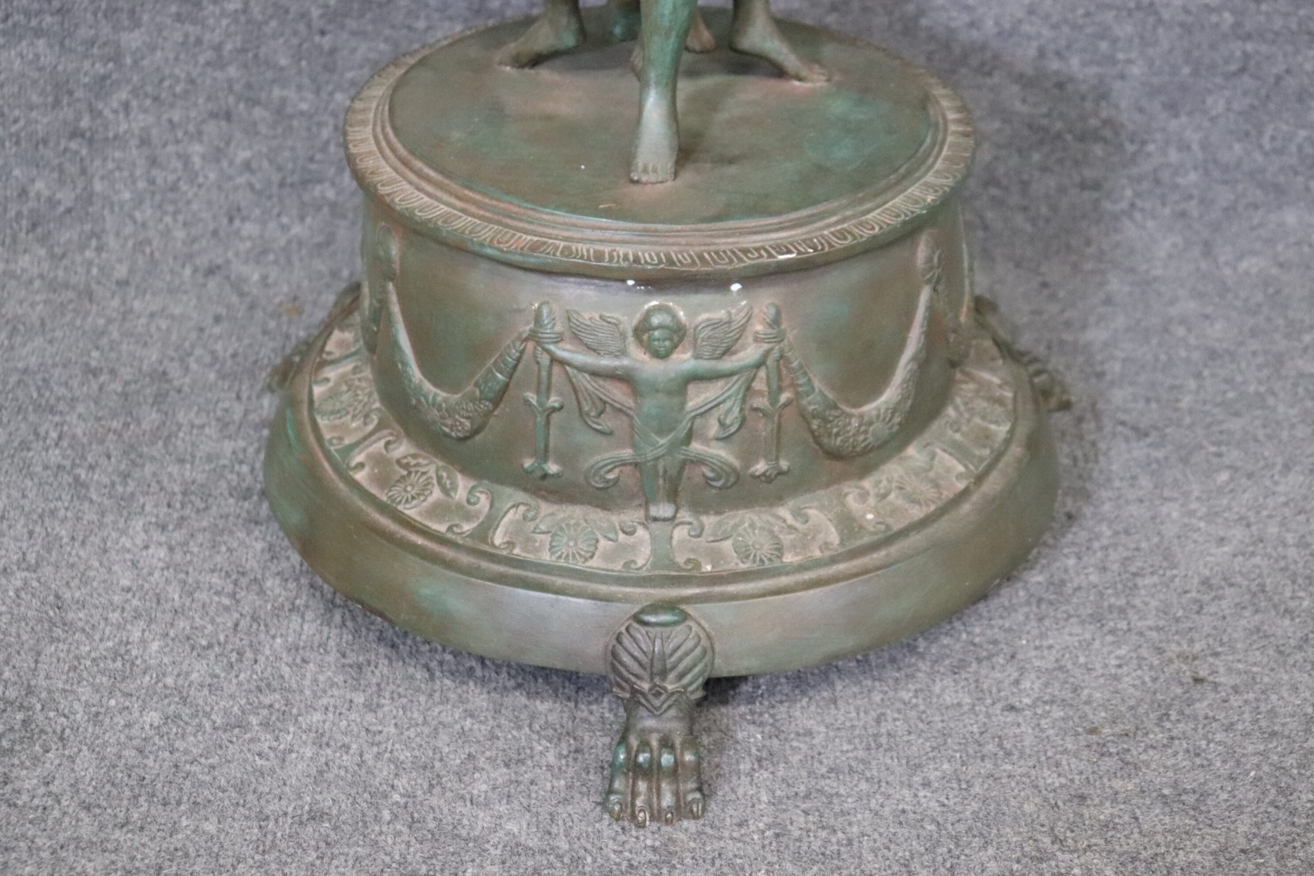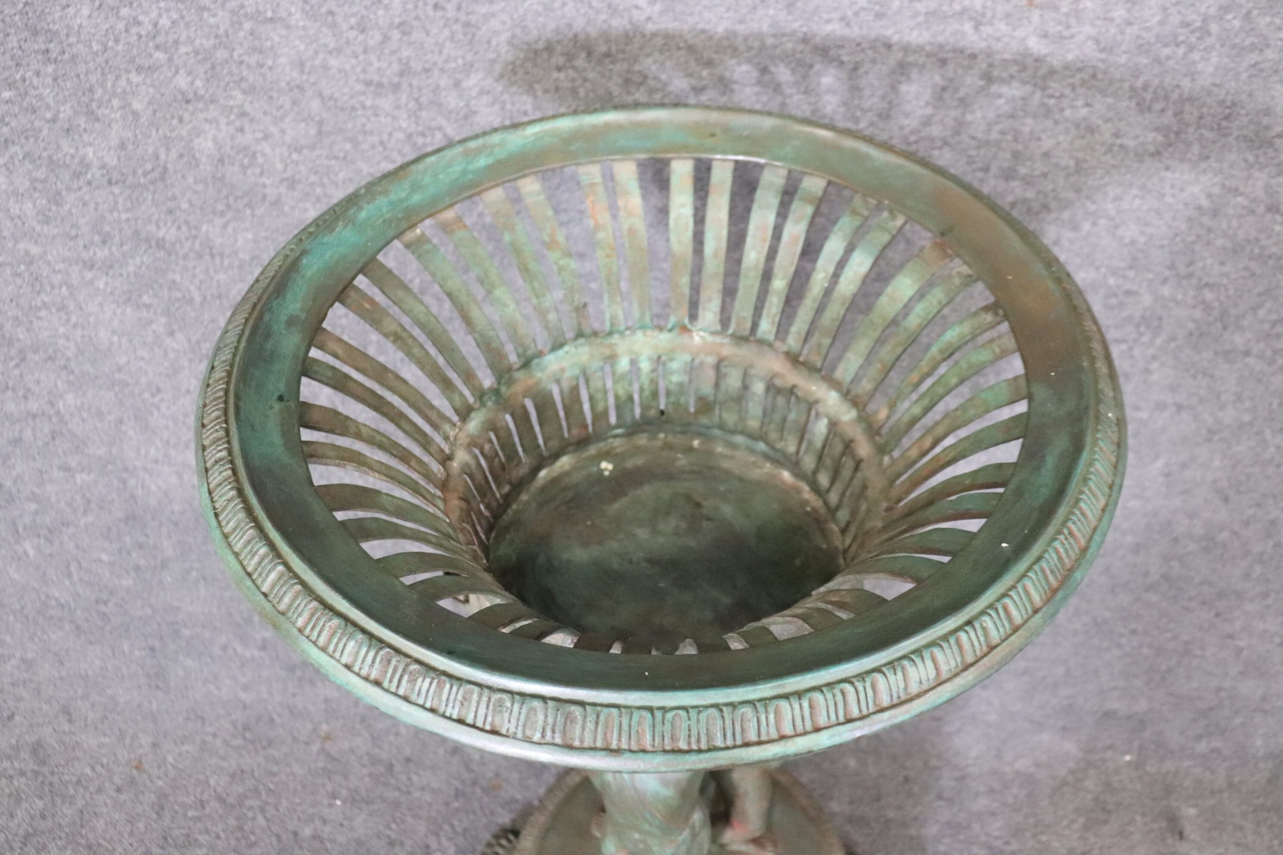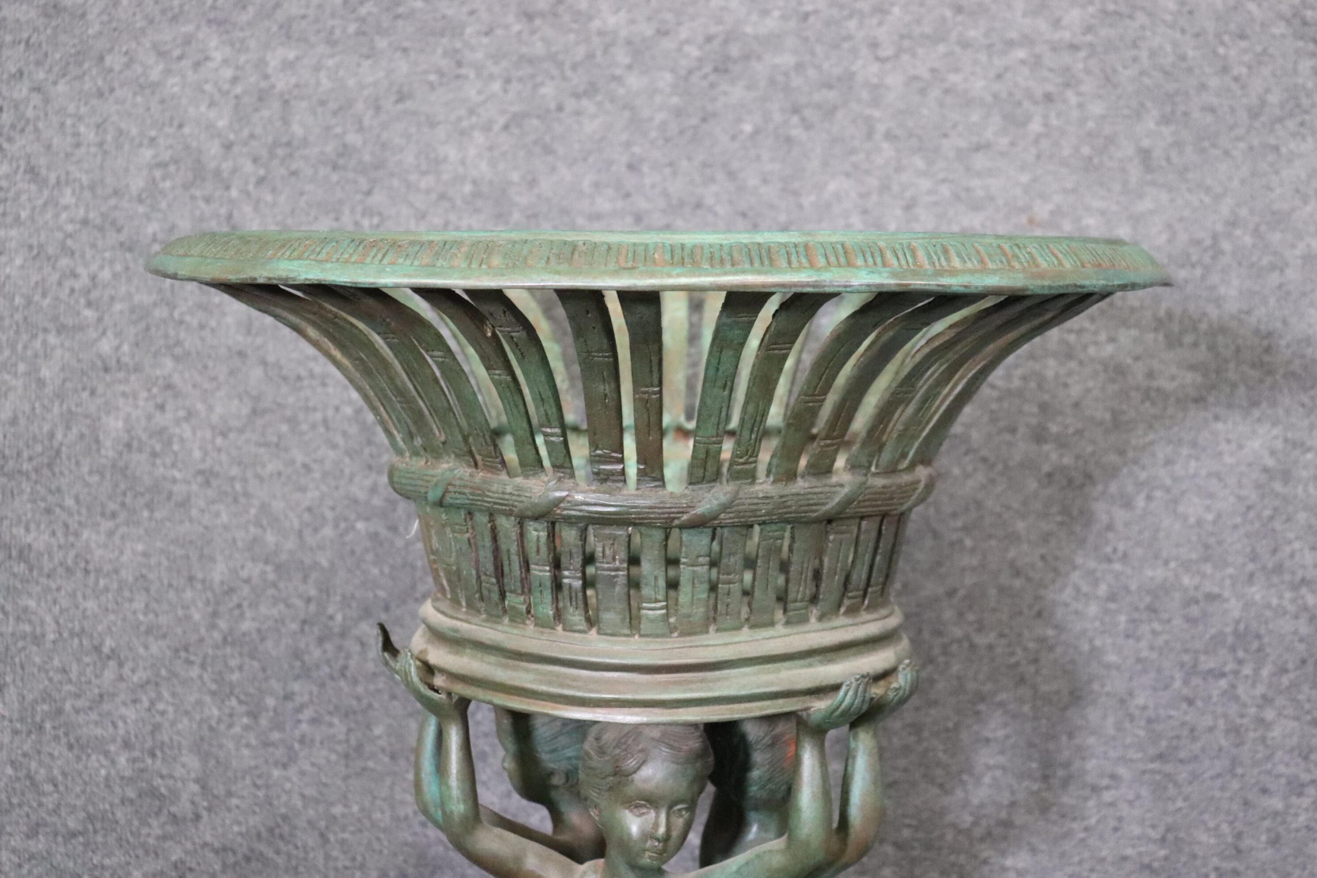 This pair of vintage Grand Tour style metal planters, made after C. M. Clodion, is truly exceptional. Claude Michel (20, December, 1738 – 29, March, 1814), known as Clodion, was a French sculptor in the Rococo style and specialized in elaborate Terracotta and Bronze sculptures. Clodion is one of the most renowned French Sculptors of the 18th and early 19th Century. He used subjects just as Bacchus, Venus, and other Mythological Figures. If you look up Clodion’s work you will also notice the use of tambourines and gourds within some of his sculptures. If you look at the photos provided, you can see the detail in the metal work. These planters will last you for many years and will add a sense of sophistication and character to your patio, entryway, home, office or place of your choosing! They are in good, vintage, condition with some oxidation to the metal and light surface scratches to the finish. Otherwise good condition.