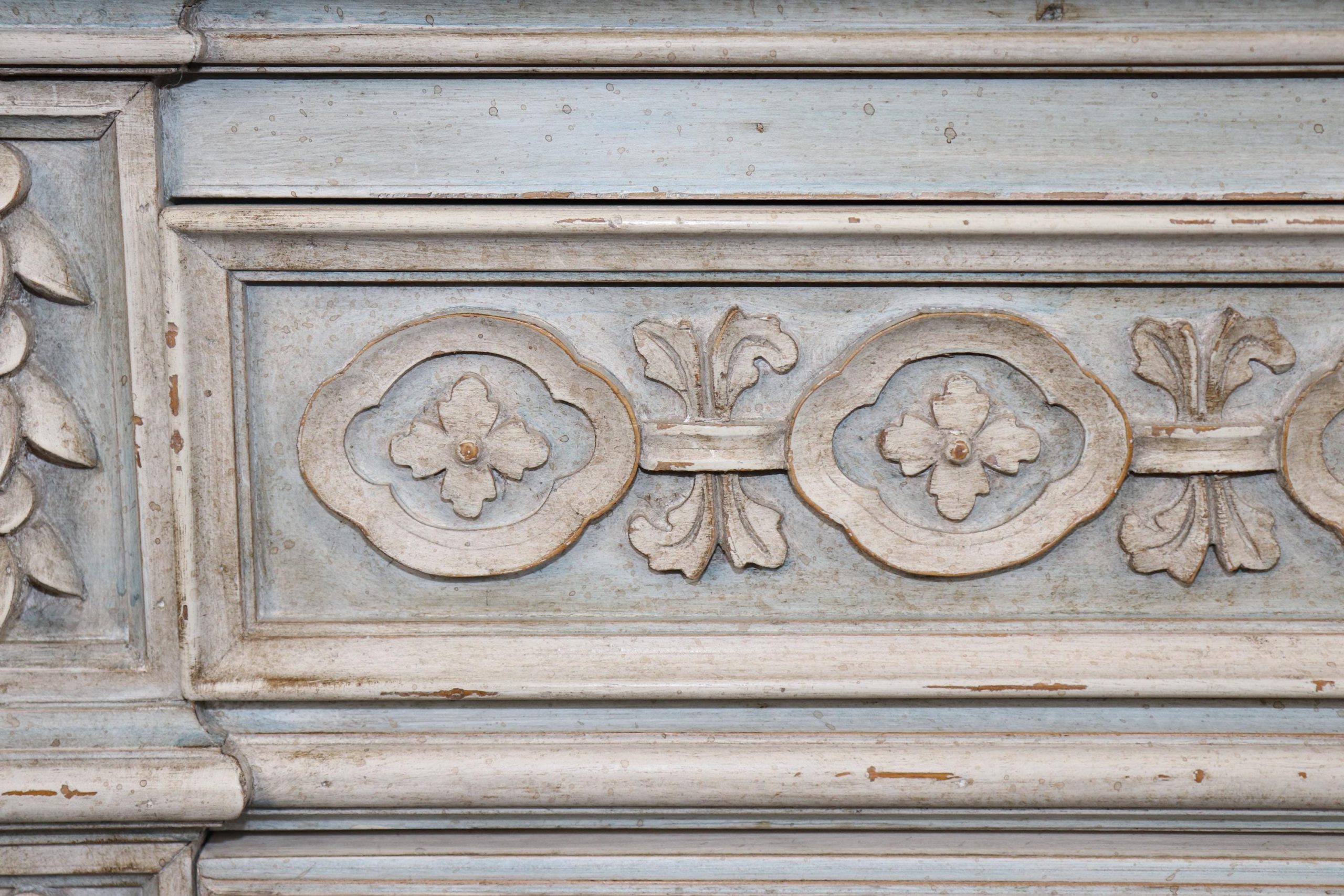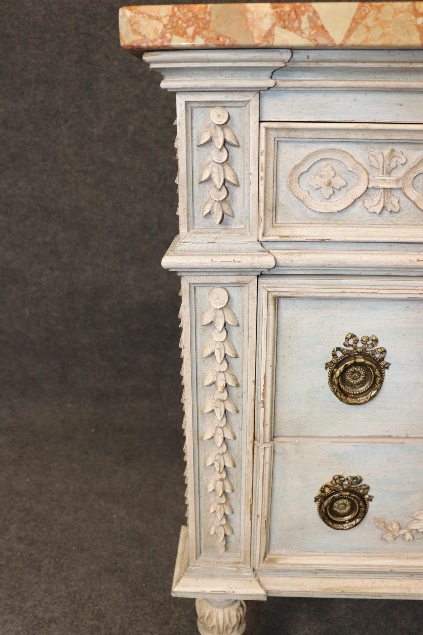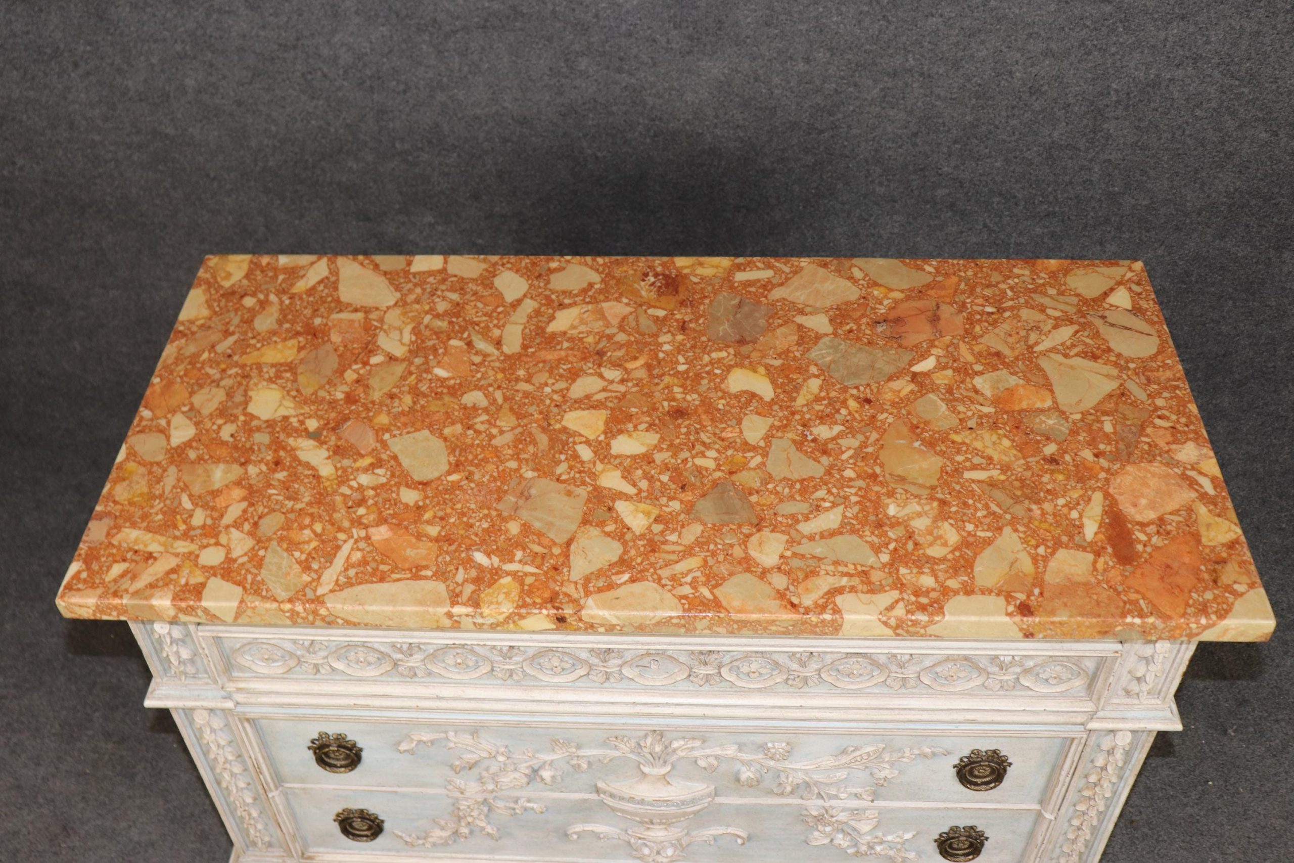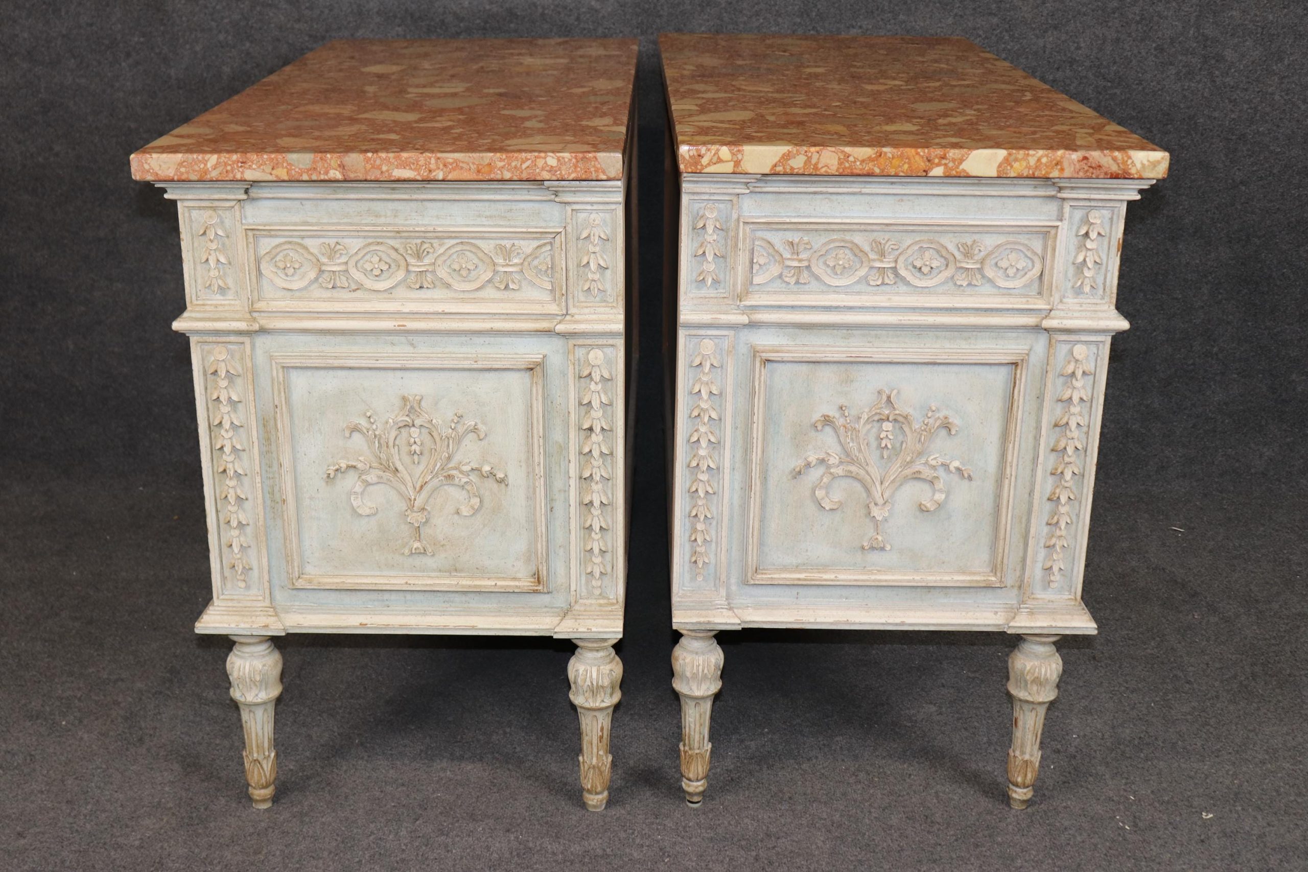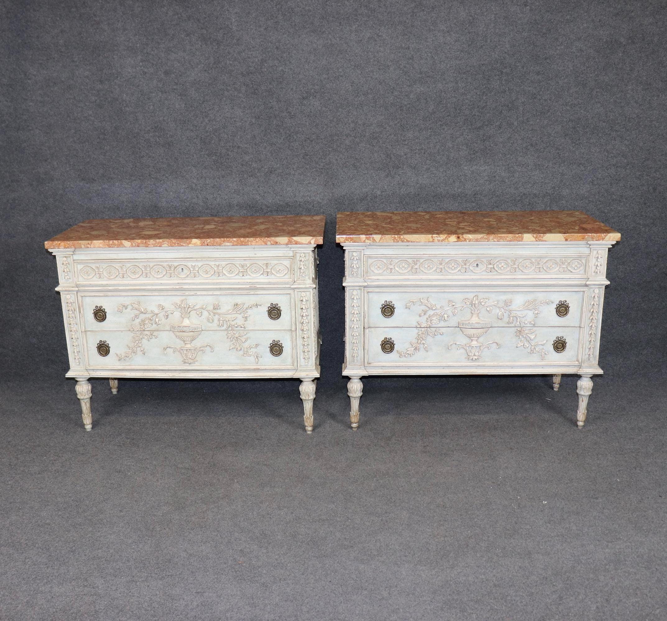 This pair of vintage Louis XVI style carved paint decorated marble top commodes, chests of drawers, is made of the highest quality and is the perfect addition for your living room, entryway, bedroom, office or place of your choosing! This pair is bound to bring a sense of luxury and elegance into your home! Each commode is equipped with 3 drawers making it perfect to store away your personal belongings. One of the best part about these pieces is how rare it is to find a matching pair, as most of the time pairs are split up during family settlements or estates among family members. Antique furniture and vintage pieces have stood the test of time and this pair of commodes is no exception! With their quality materials and great craftsmanship this pair is bound to last you and your family for many years to come. This pair is in good vintage condition with the exception of some light surface scratches and minor scuffing as to be expected with items of age.