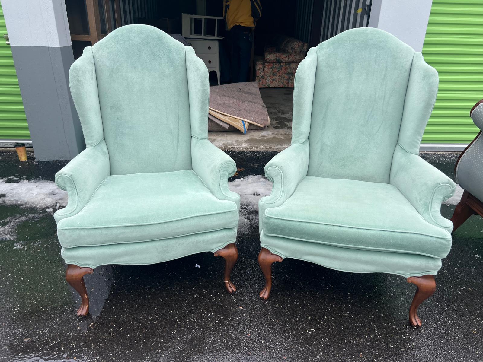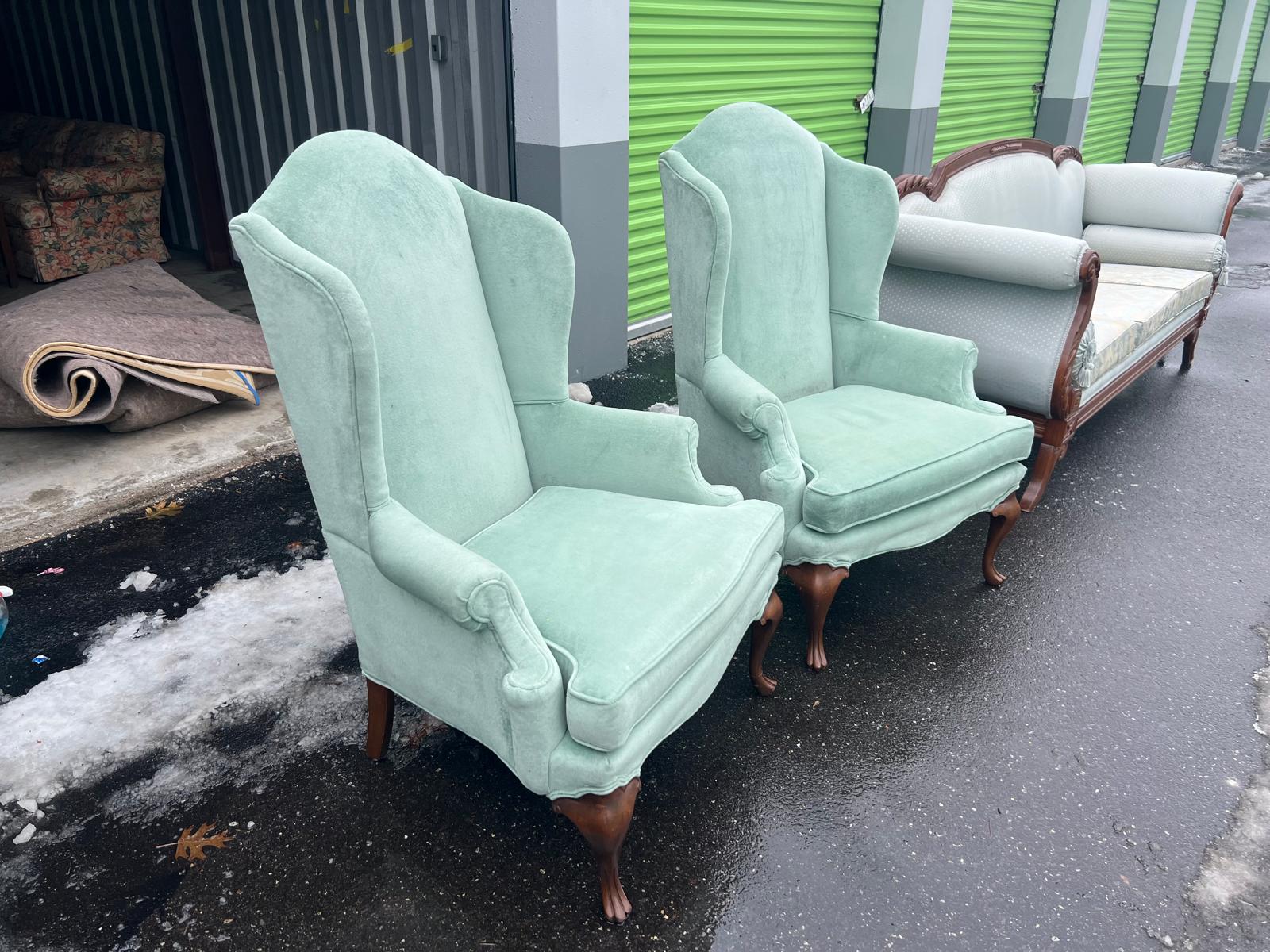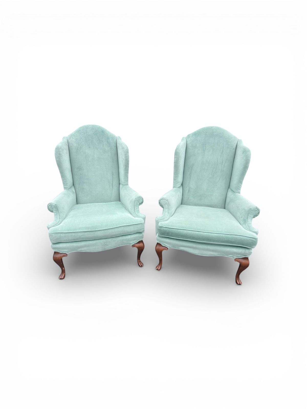 This elegant set of two vintage wingback chairs by Pinnacle in the 1980s features classic traditional Queen Anne style lines, beautifully executed in a soft, sophisticated blue velvet upholstery. The tall winged backs, gently rolled arms, and cabriole legs create a timeless silhouette that works equally well in formal living rooms, studies, or bedroom seating areas. Crafted with Pinnacle’s reputation for quality construction, these chairs offer deep, comfortable seating and sturdy hardwood frames. The light blue velvet upholstery is in overall good condition except on the backs of the chairs there are a few spots at the bottom of discoloration; please see photos. The chair frames are in good condition as well with a few minor scrapes from moving but nothing considerable.