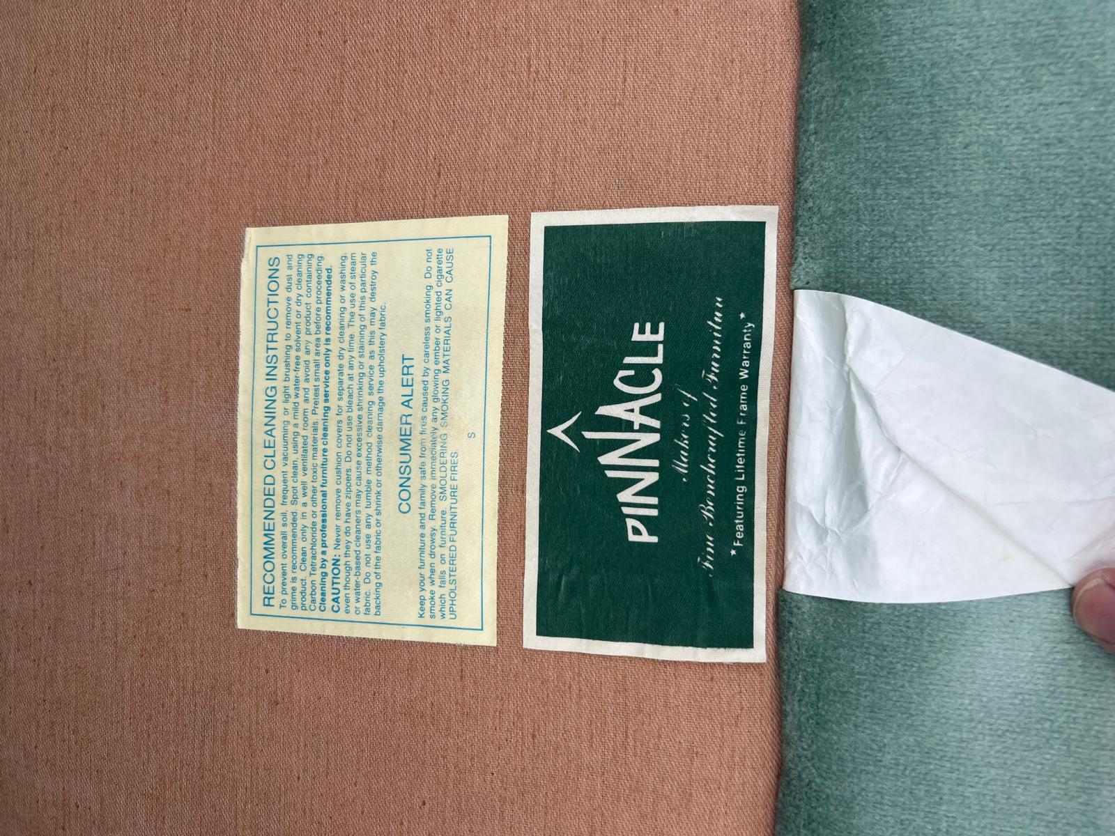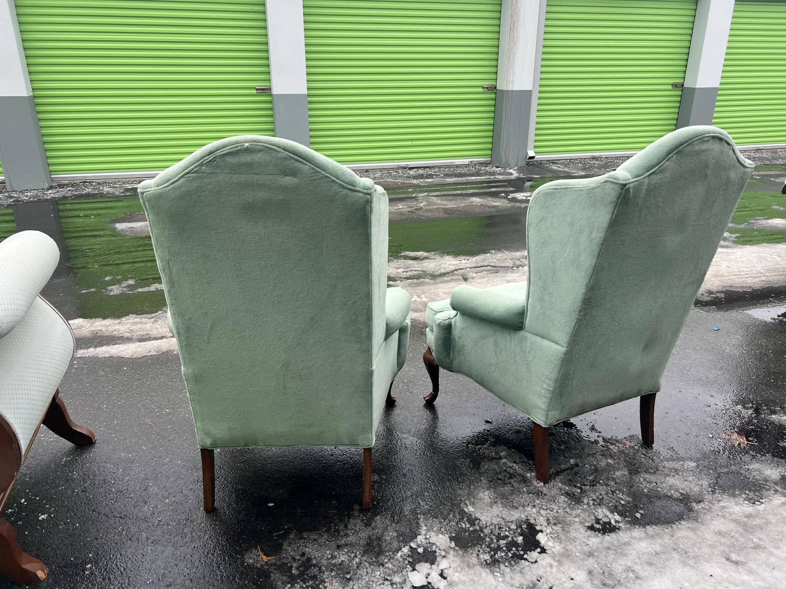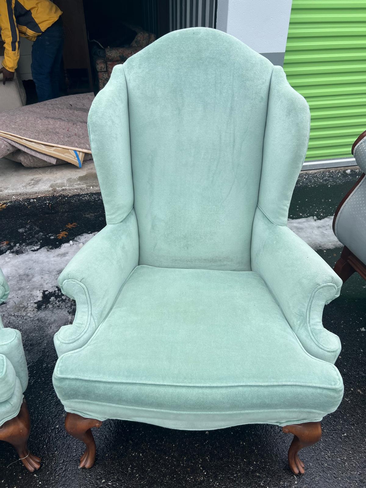 This elegant set of two vintage wingback chairs by Pinnacle in the 1980s features classic traditional Queen Anne style lines, beautifully executed in a soft, sophisticated blue velvet upholstery. The tall winged backs, gently rolled arms, and cabriole legs create a timeless silhouette that works equally well in formal living rooms, studies, or bedroom seating areas. Crafted with Pinnacle’s reputation for quality construction, these chairs offer deep, comfortable seating and sturdy hardwood frames. The light blue velvet upholstery is in overall good condition except on the backs of the chairs there are a few spots at the bottom of discoloration; please see photos. The chair frames are in good condition as well with a few minor scrapes from moving but nothing considerable.