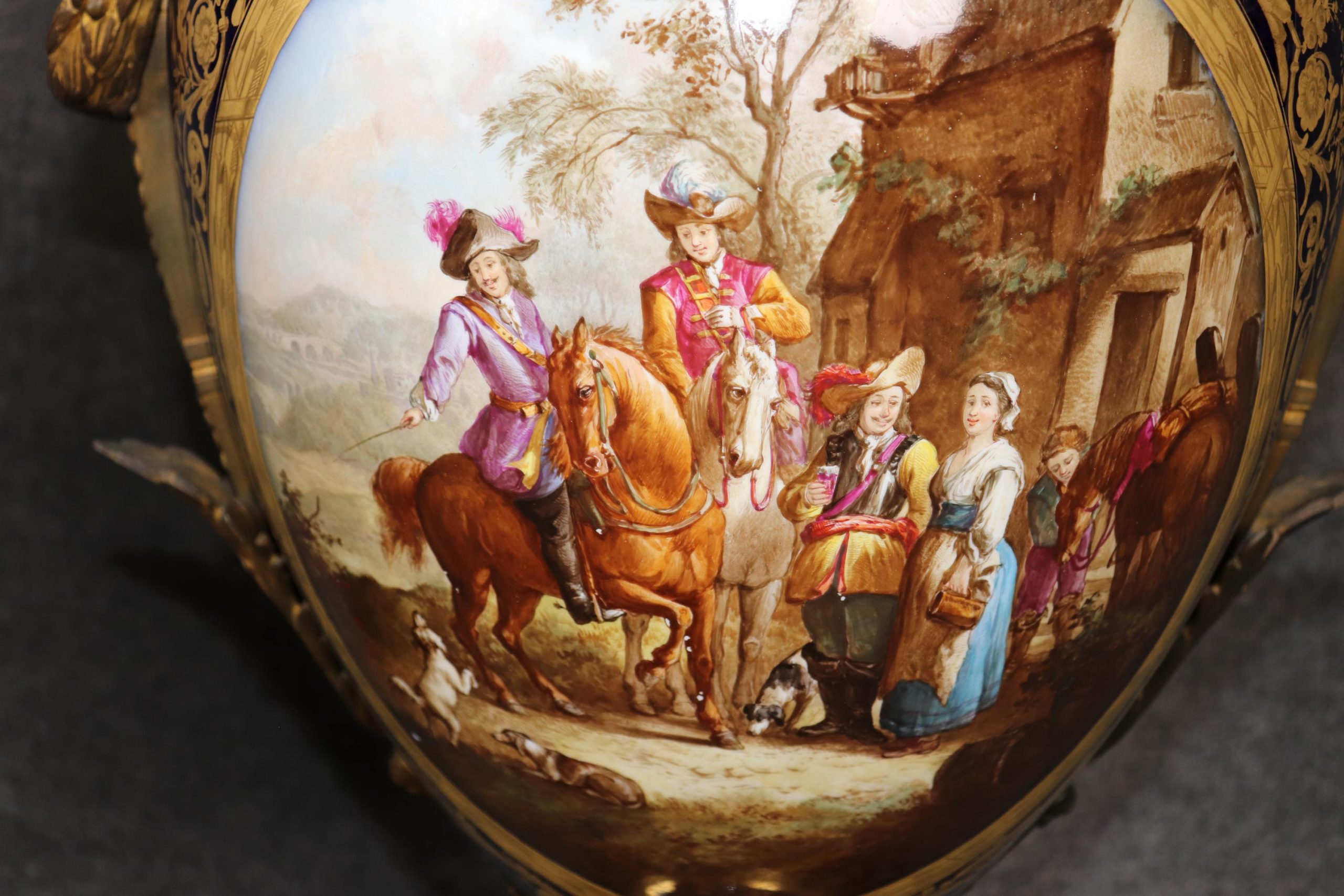 Each vase is decorated with two distinct hand-painted scenes one being figural, allowing for visual versatility and exceptional artistic depth. The front panels depict lively genre scenes of figures on horseback traveling through a charming village or town, rendered with remarkable detail and movement. The riders, architecture, and surrounding figures are painted with precision and warmth, capturing the romantic spirit of 19th-century French narrative porcelain.