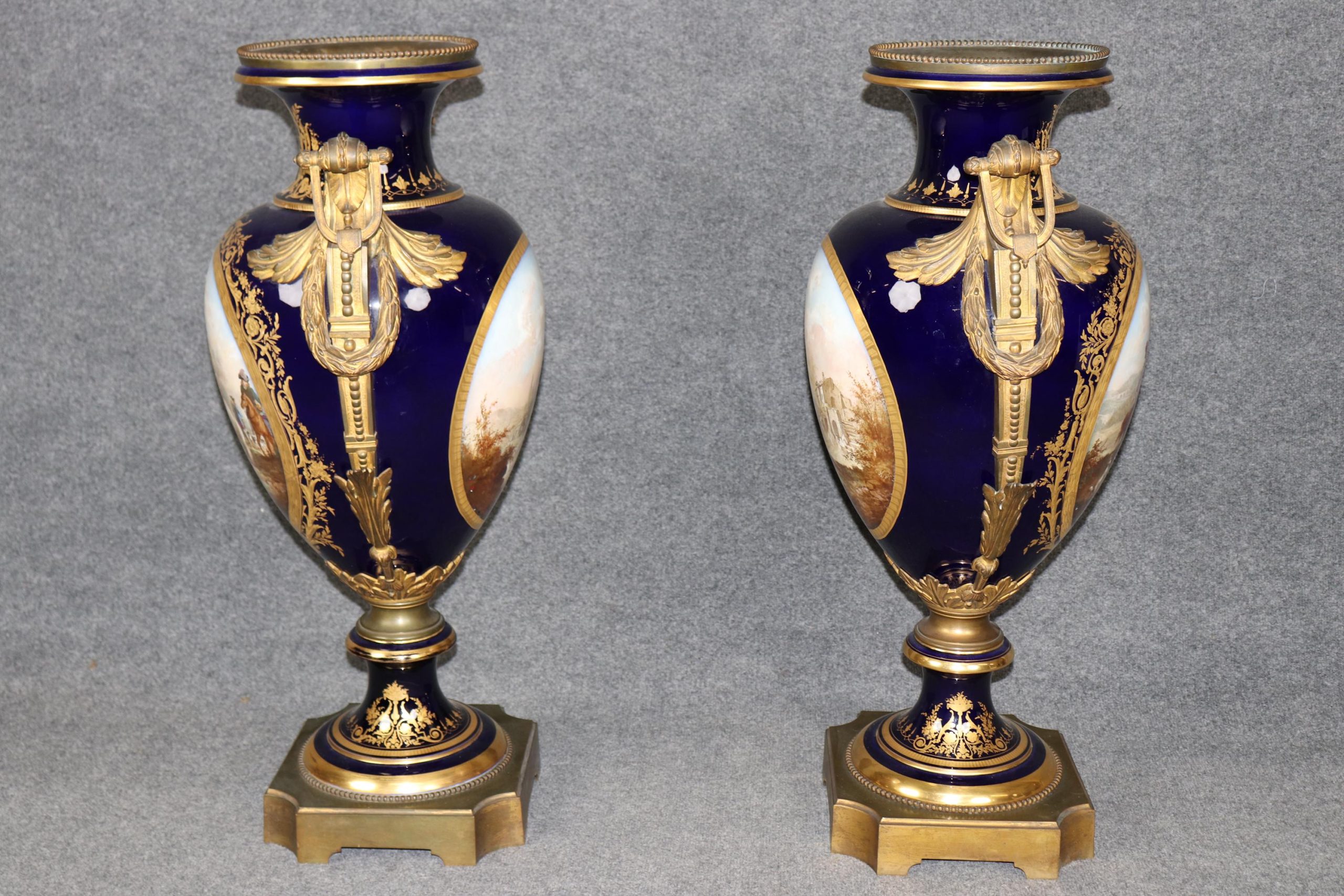 The rich cobalt blue glaze, a hallmark of high-quality French porcelain, serves as a dramatic backdrop to the painted reserves and gilt bronze mounts, further enhancing the regal presence of the pair. The overall effect is one of grandeur, elegance, and unmistakable Parisian sophistication.