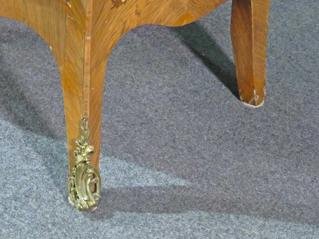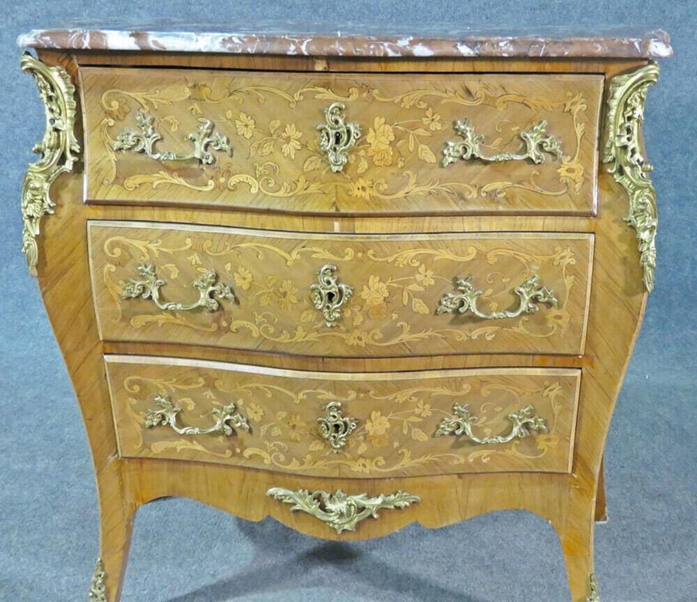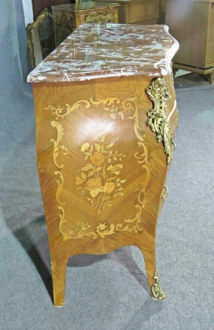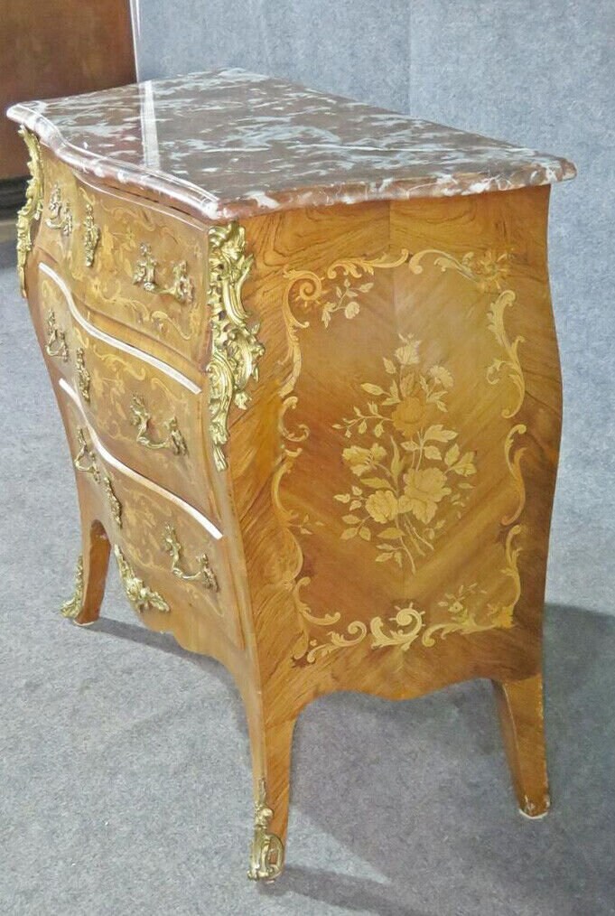 This early 20th century Louis XV style petite marble top commode, Chest is a great example of quality french furniture. The satinwood inlay is super high quality and crisp as well as the attention to detail. This is a piece that will last you for many years and will add a sense of luxury into your entryway, living room, office or place of your choosing! The commode is in good condition considering the age with some minor surface scratches and blemishes to the finish, otherwise good condition.