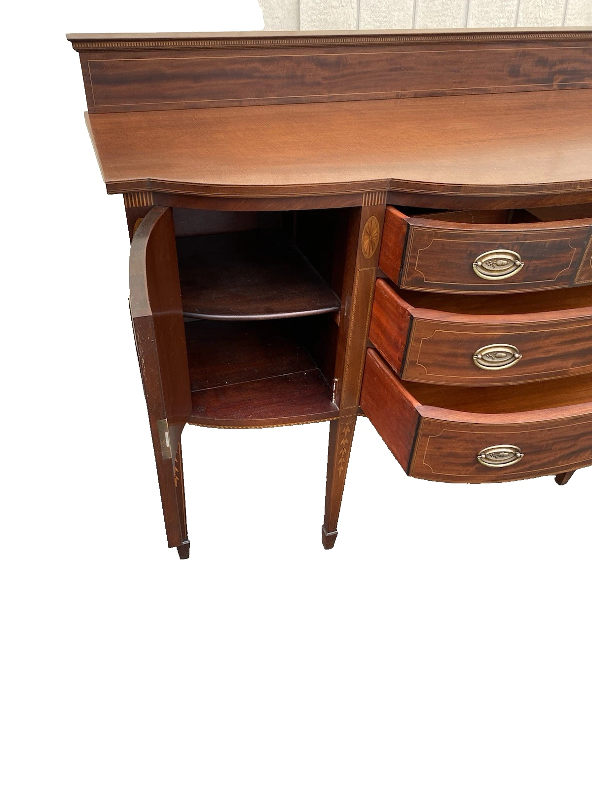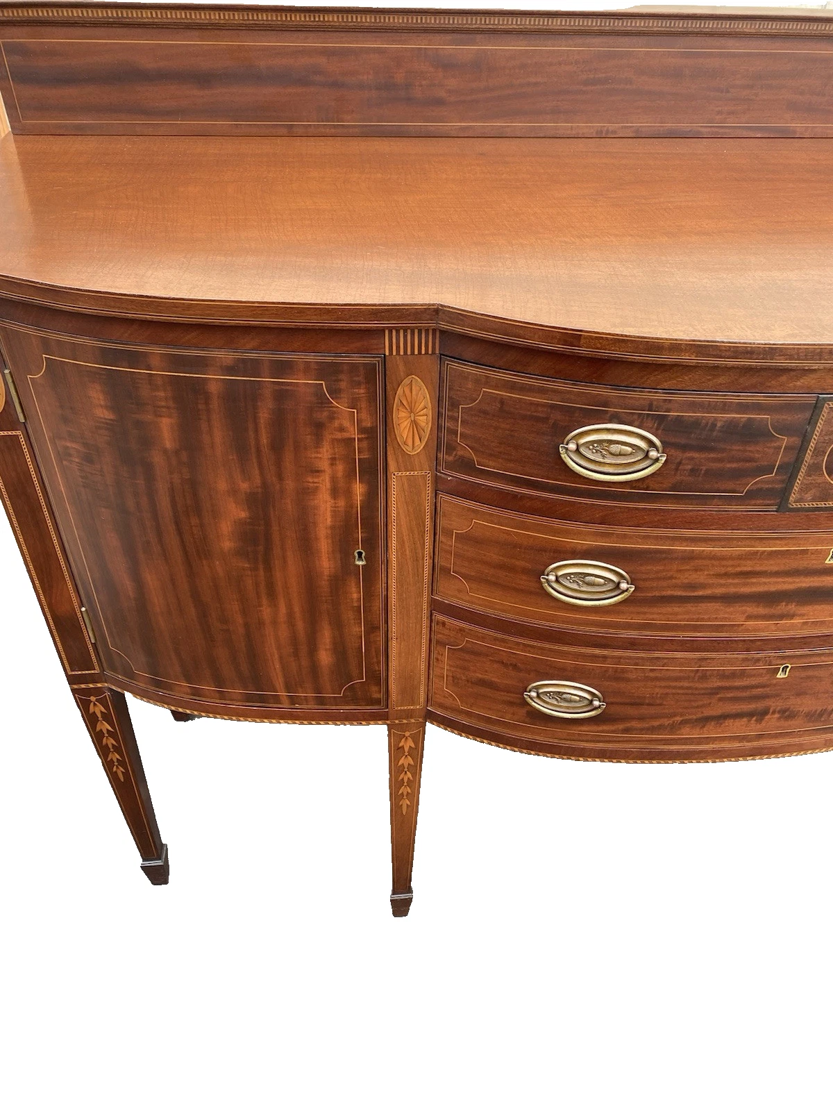 This exquisite sideboard cabinet by Potthast Brothers embodies the timeless elegance of the Hepplewhite style, showcasing intricate inlaid designs that reflect the artistry of its era. Crafted from rich mahogany, this piece features three spacious drawers and two doors, offering both beauty and functionality for your dining space. Dating back to the 1920s, its sturdy construction and warm patina tell a story of craftsmanship and care, making it a cherished addition to any home. Let this stunning sideboard bring a touch of history and sophistication to your gatherings.