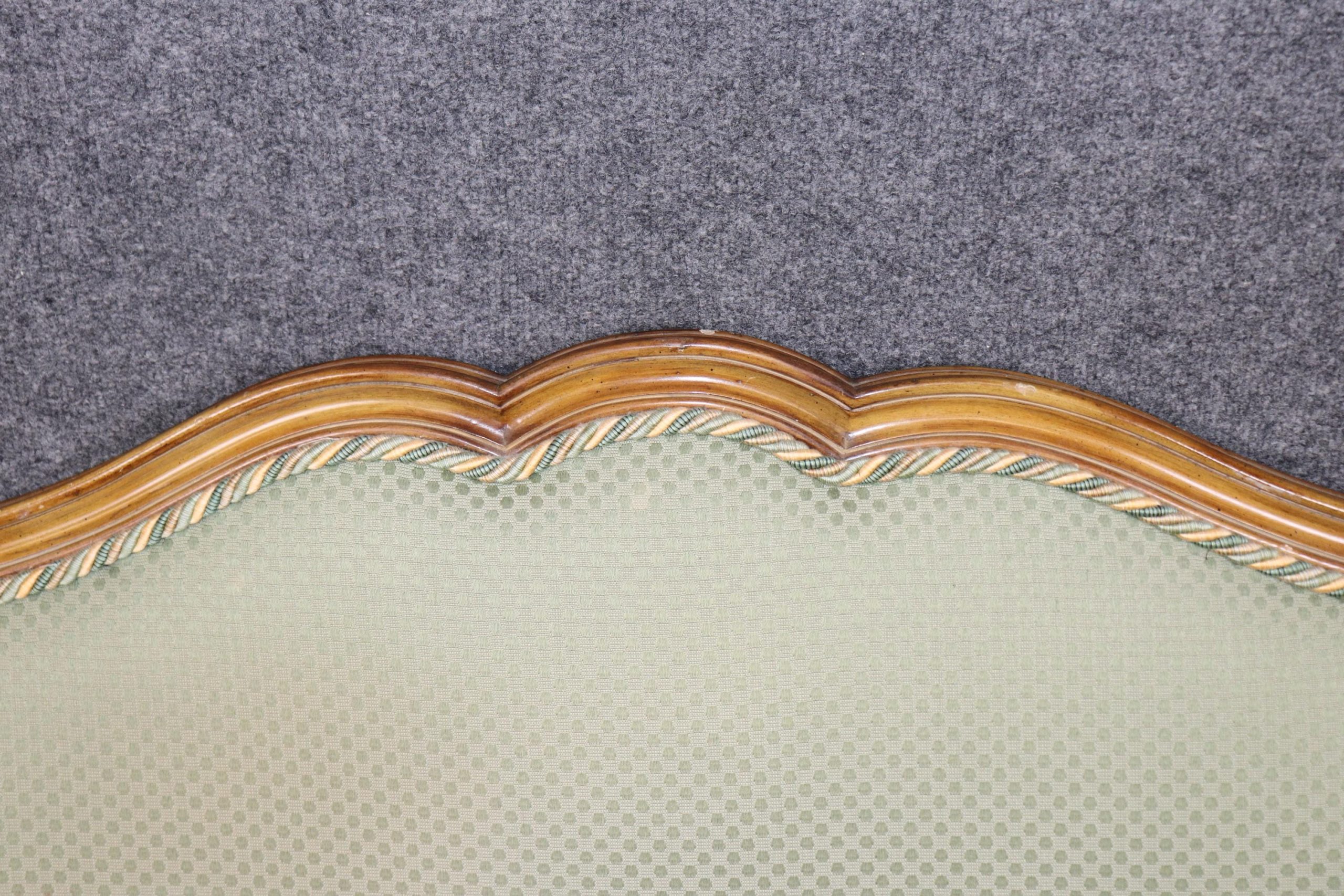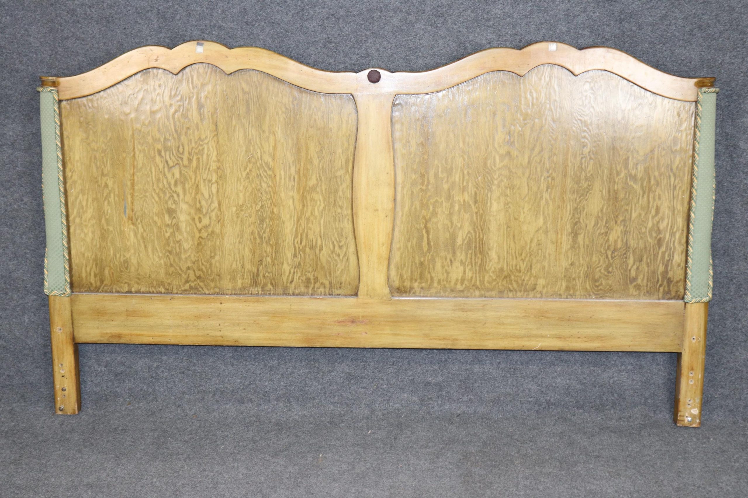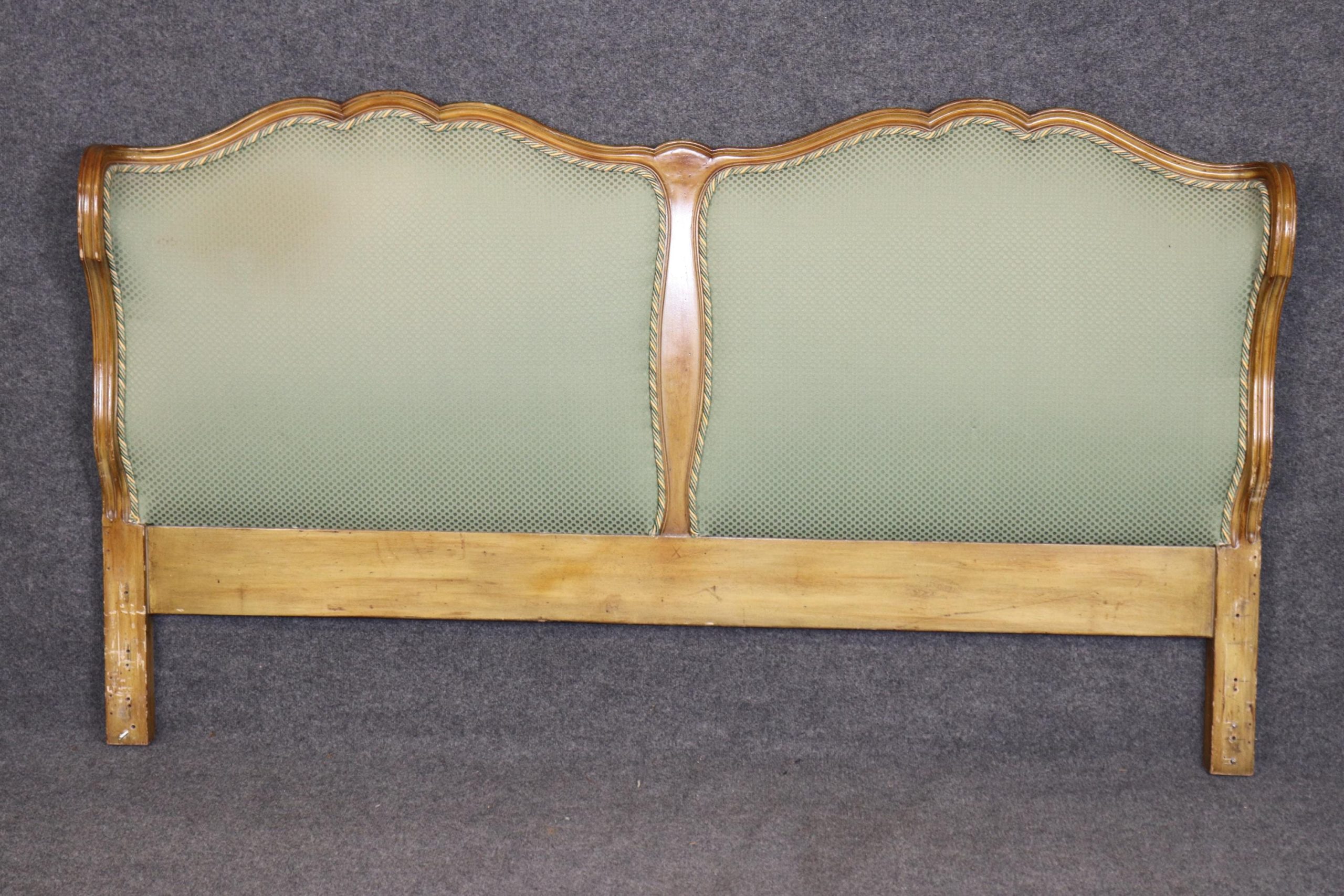 This vintage Country French Provincial style king size upholstered headboard is made of the highest quality! If you look at the photos provided you can see the sophisticated upholstery. This piece is perfect for any bedroom as it can go with a variety of styles! This piece is will add a sense of luxury into your home and will definitely be a conversation starter! Antique furniture and vintage pieces have stood the test of time and this headboard is no exception! With its quality materials and great craftsmanship this piece is bound to last you and your family for many years to come. The headboard is in good vintage condition with the exception of some light surface scratches and minor imperfections including some staining to the upholstered panels as to be expected with vintage or antique items.