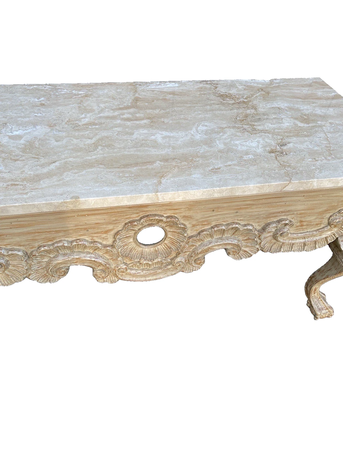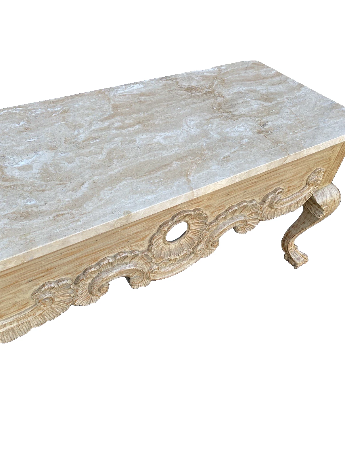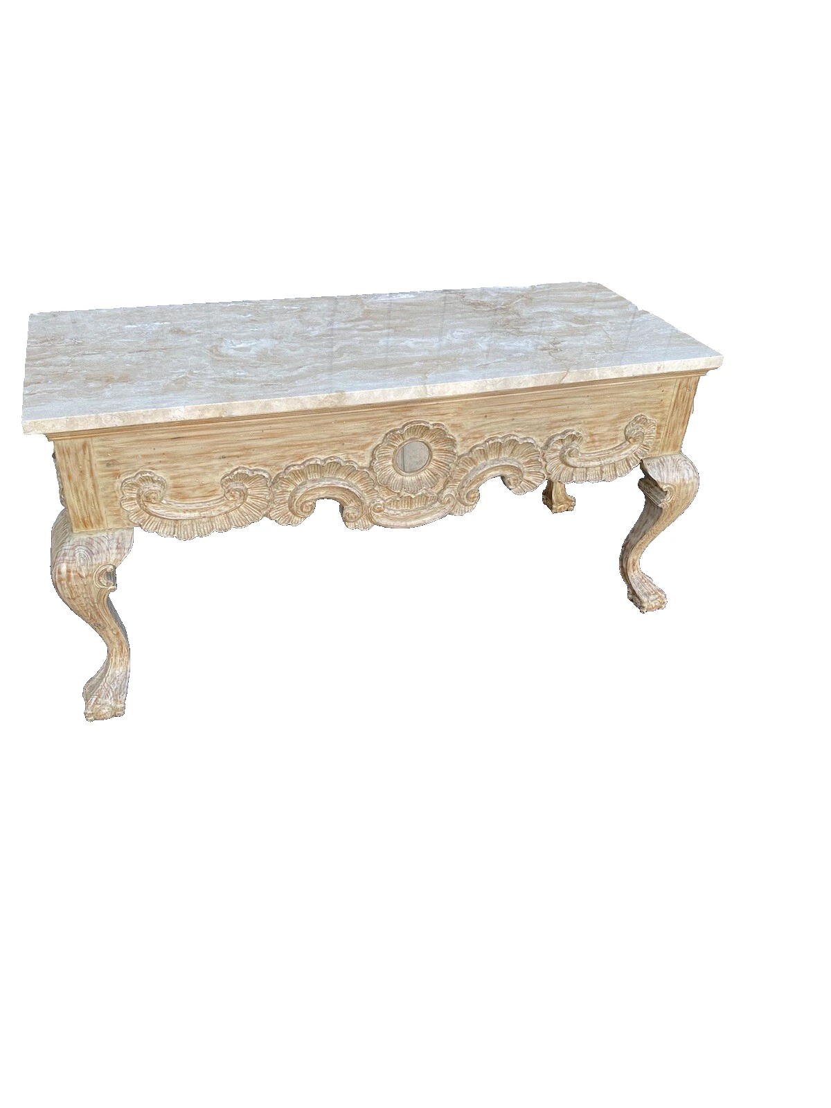 This exquisite console table boasts a stunning marble top that adds a touch of elegance to any space. Custom crafted in the United States, its rich wood base beautifully complements the unique veining of the marble, showcasing the artistry and attention to detail that went into its creation. Ideal for use as a sideboard or entryway accent, this piece combines functionality with timeless style, inviting warmth and character into your home. Its sturdy build ensures it will serve as a cherished staple for years to come.