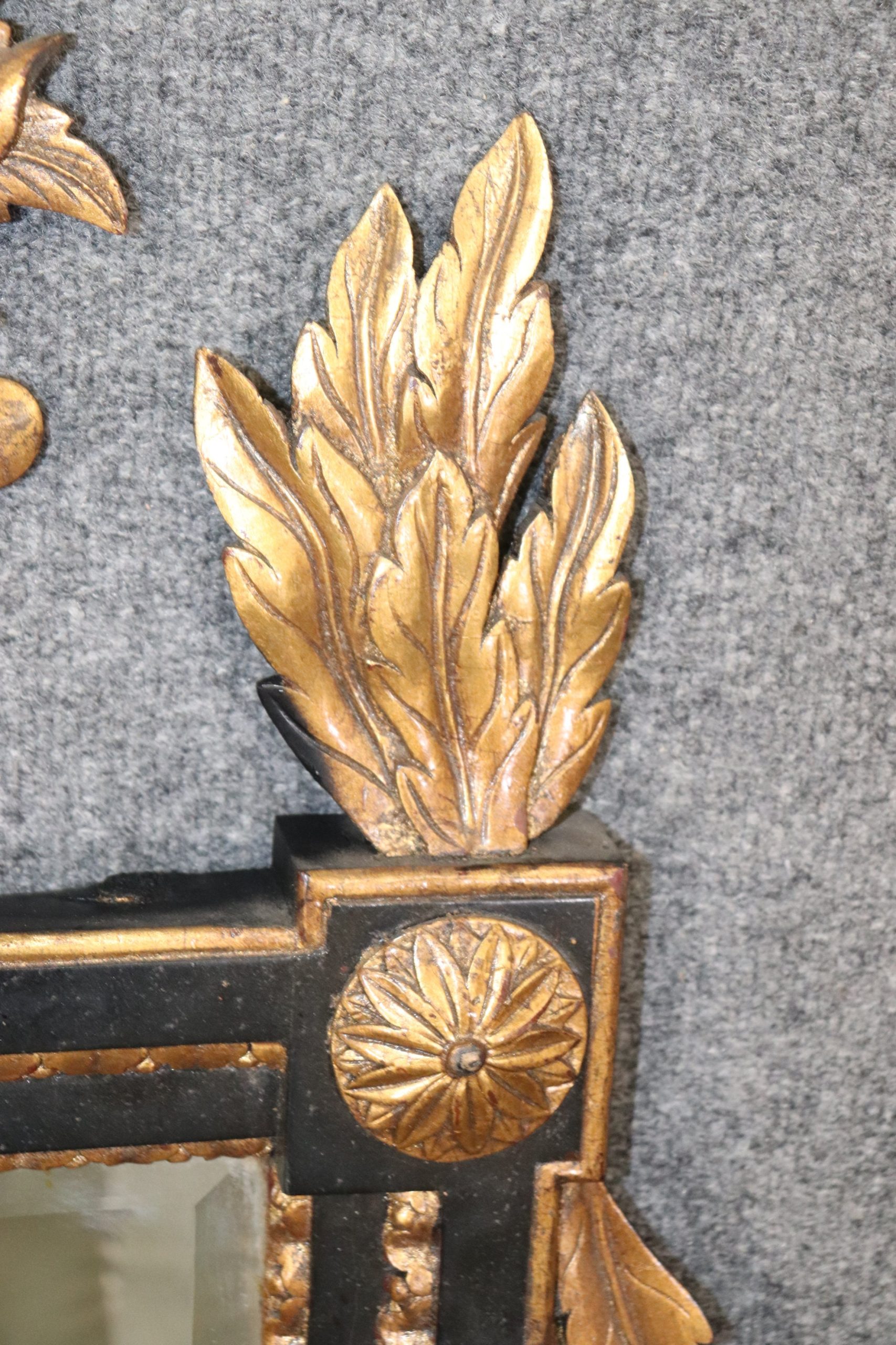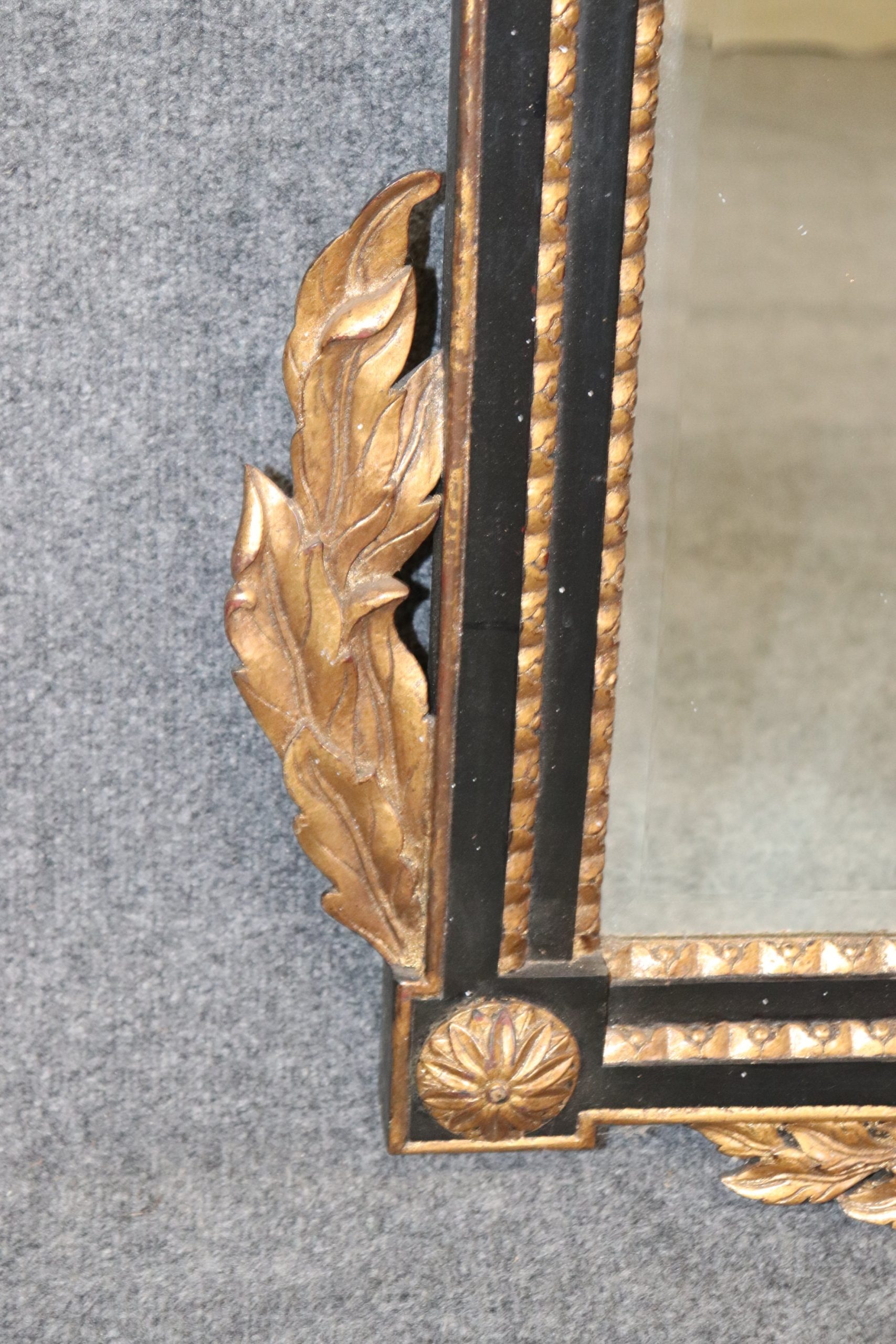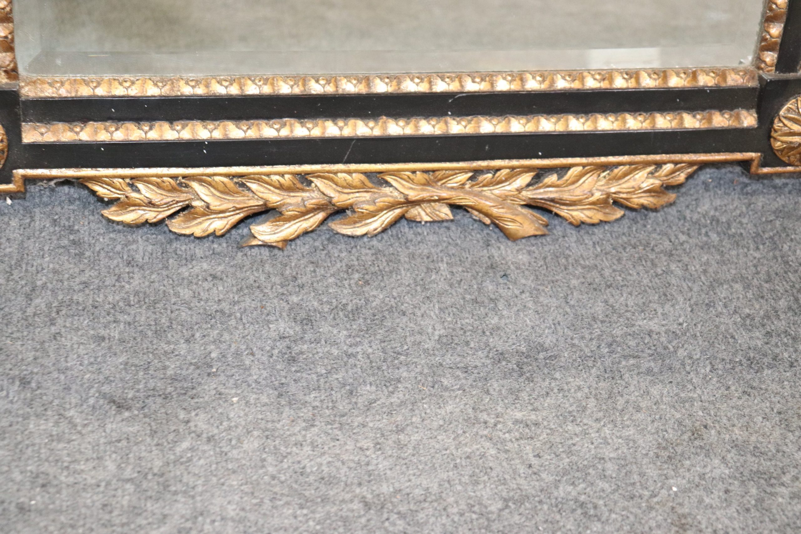 This vintage Regency style ebonized and gilt carved mirror is an exceptional example of 20th century decor! This mirror is perfect for any entryway, living room, bathroom, office, hallway or bedroom and is bound to bring a charismatic and luxurious look into your home or place of choosing! This mirror is equipped with detailed carved gilt decoration over an ebonized frame, and a beveled glass mirror. The mirror can be paired with a variety of styles from The mirror is in good vintage condition with the exception of some light surface scratches and minor finish loss, but otherwise good condition considering age!