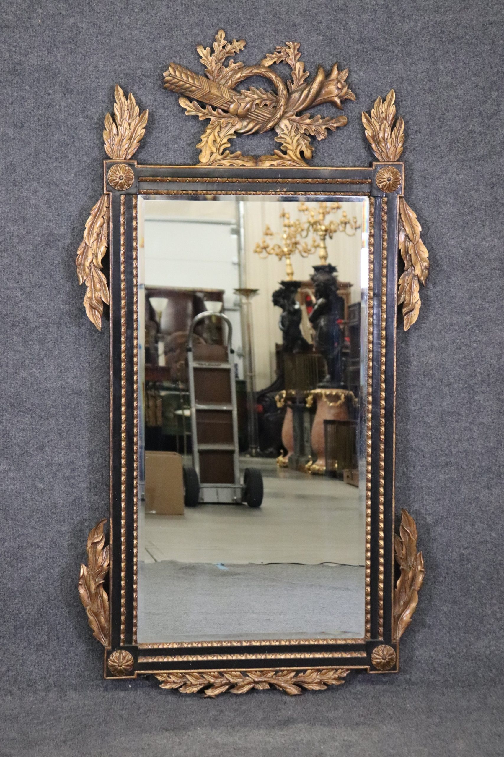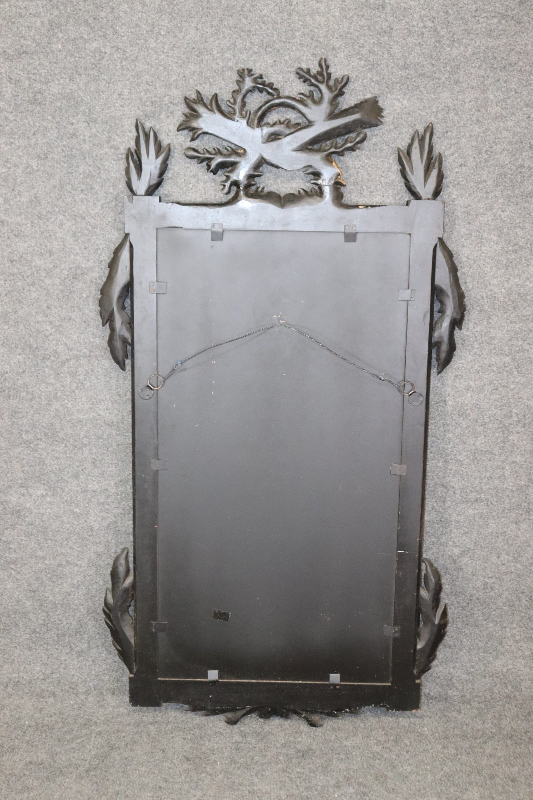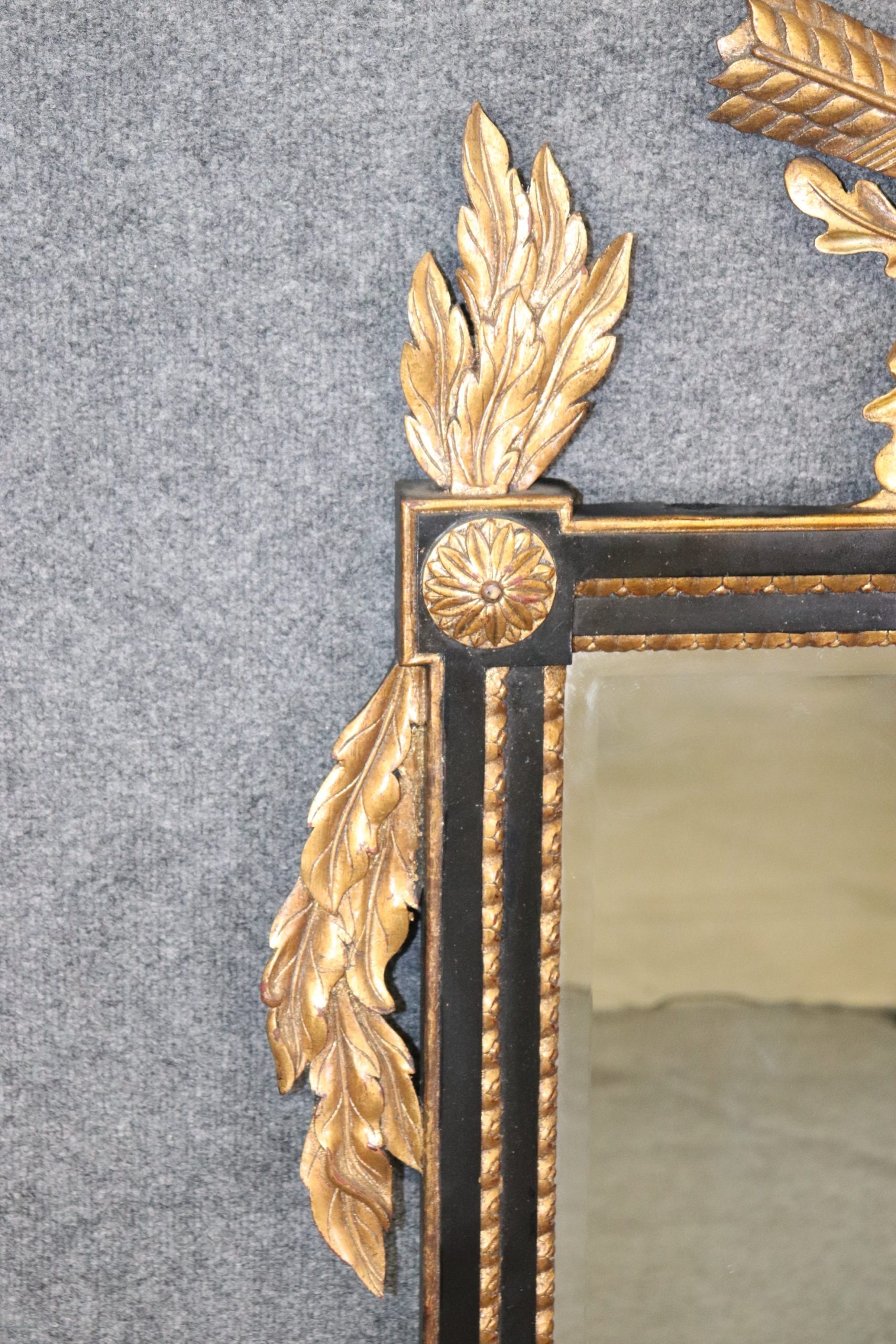 This vintage Regency style ebonized and gilt carved mirror is an exceptional example of 20th century decor! This mirror is perfect for any entryway, living room, bathroom, office, hallway or bedroom and is bound to bring a charismatic and luxurious look into your home or place of choosing! This mirror is equipped with detailed carved gilt decoration over an ebonized frame, and a beveled glass mirror. The mirror can be paired with a variety of styles from The mirror is in good vintage condition with the exception of some light surface scratches and minor finish loss, but otherwise good condition considering age!