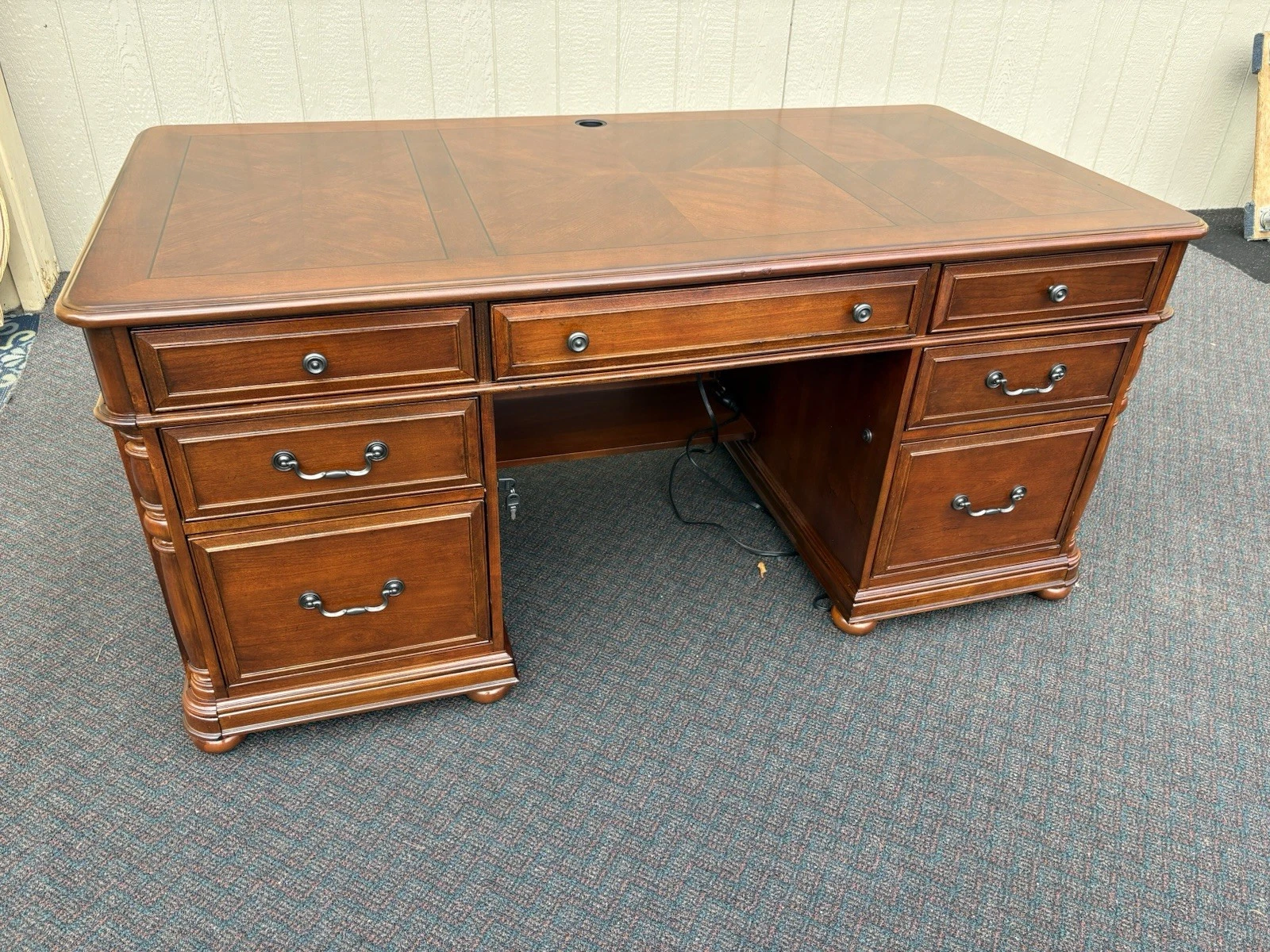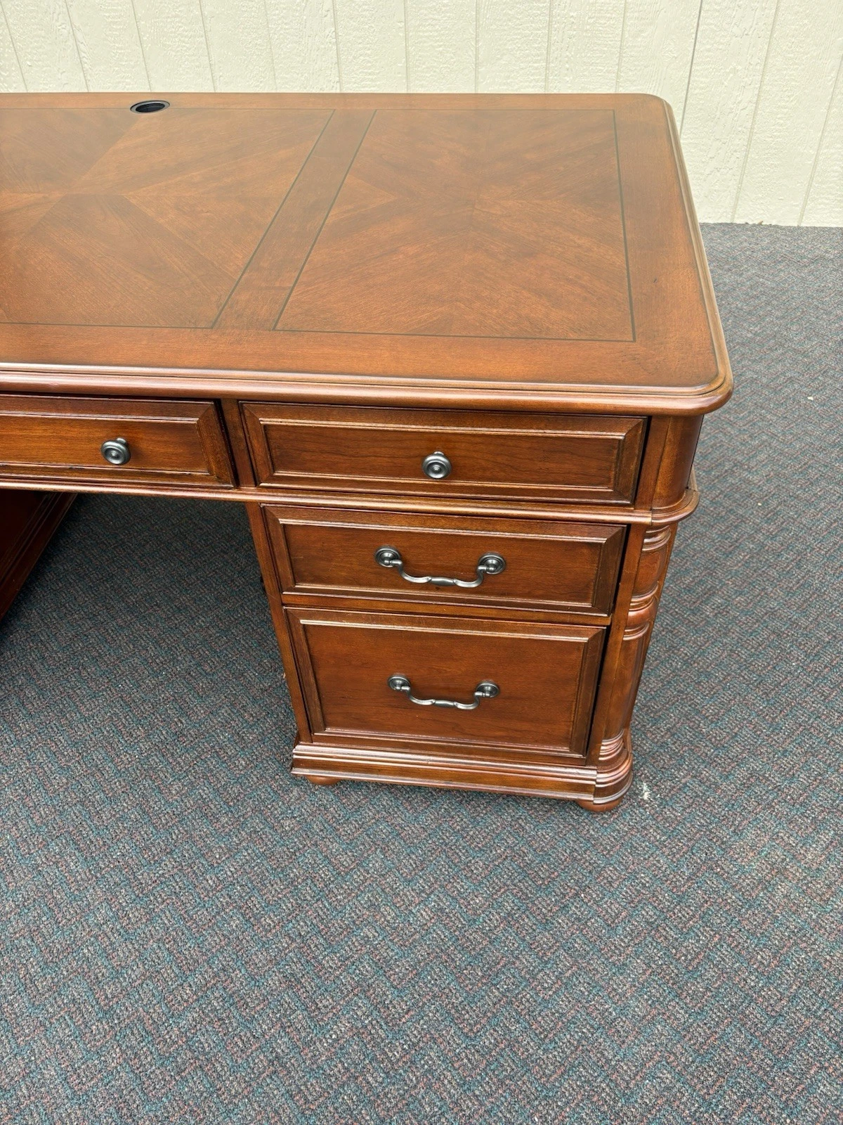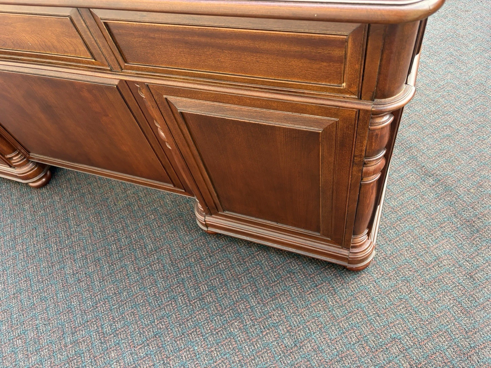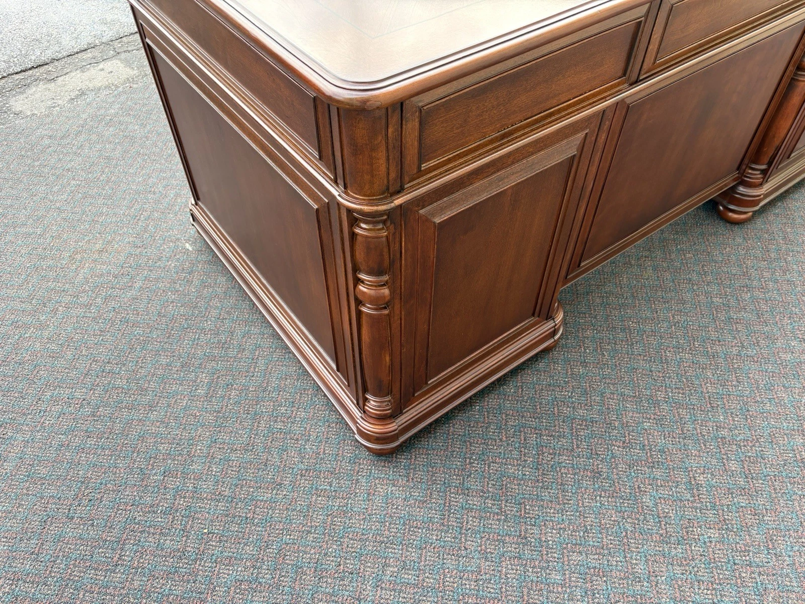 This elegant Riverside Furniture executive desk is a fine example of traditional craftsmanship, exuding warmth with its rich mahogany finish. Featuring six spacious drawers adorned with classic hardware, it seamlessly combines functionality and style, making it a perfect centerpiece for your home office or study. With its timeless design and sturdy construction, this desk not only serves as a practical workspace but also carries with it a sense of history and character, inviting you to create your own stories within its embrace.