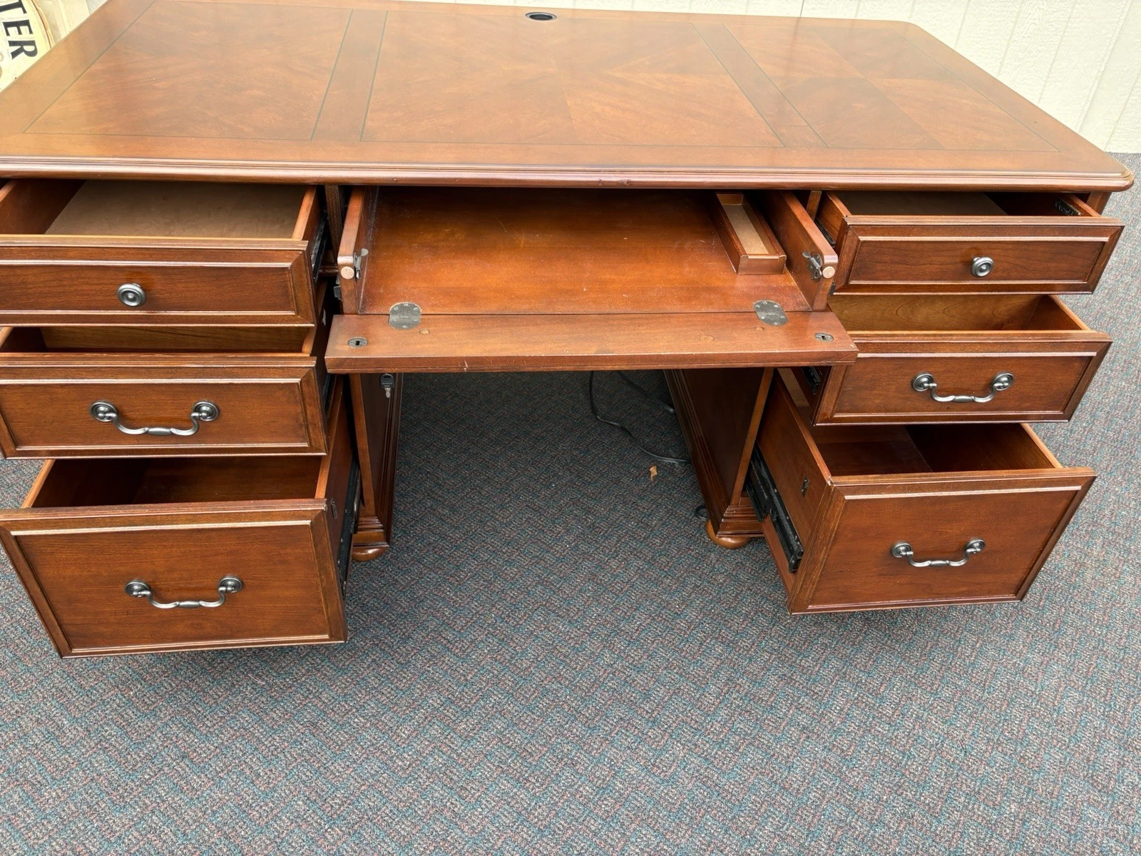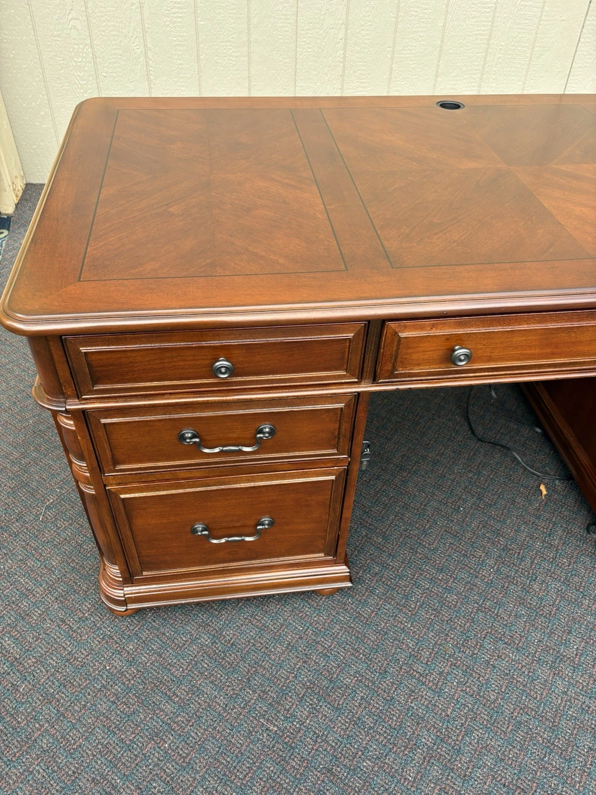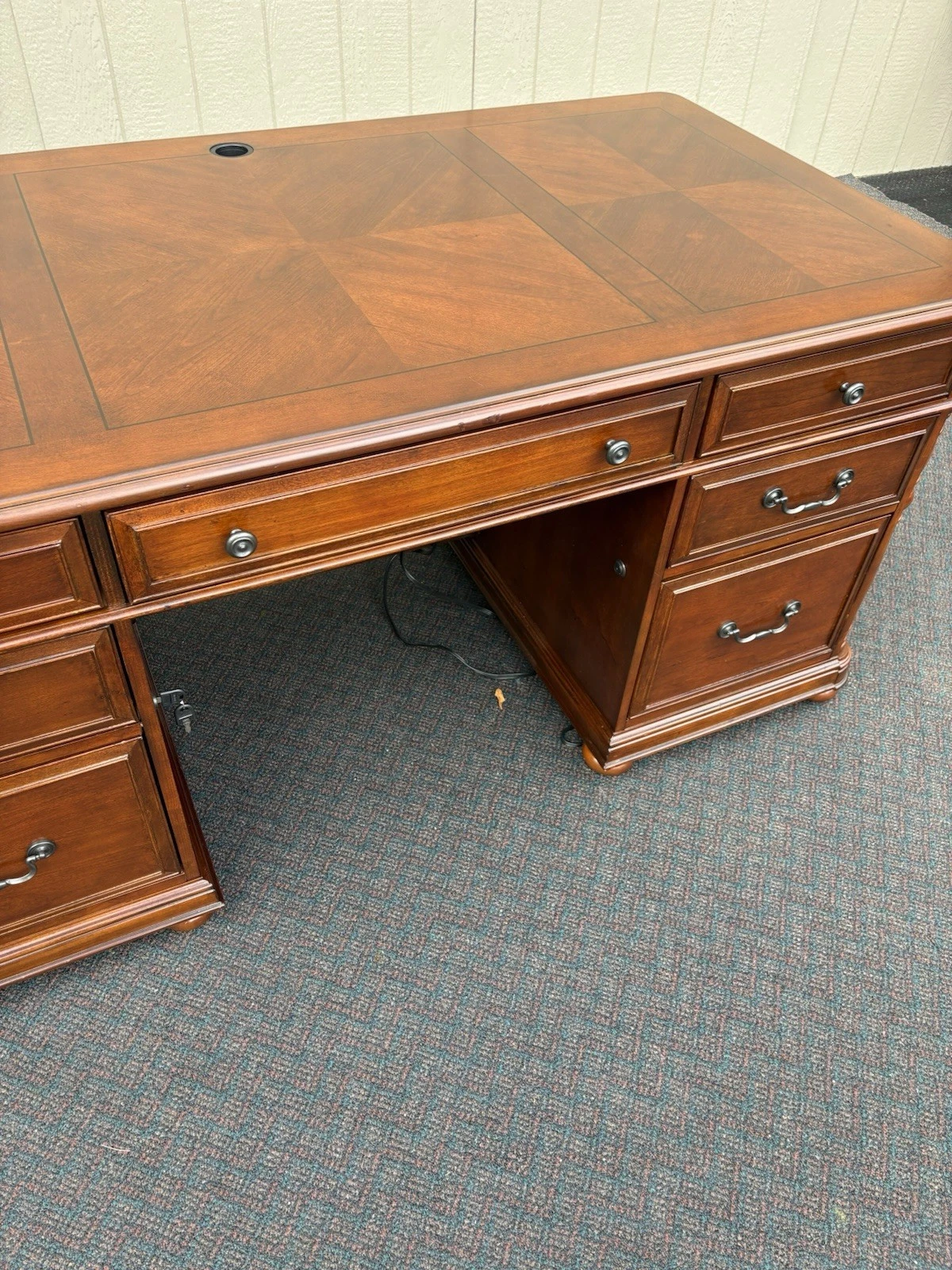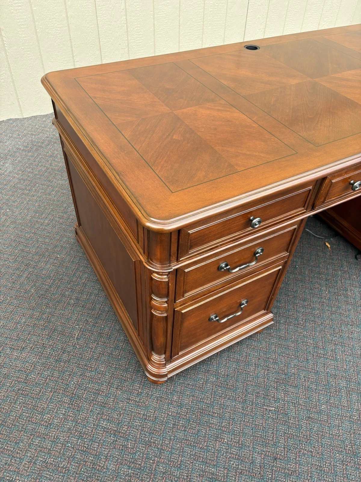 This elegant Riverside Furniture executive desk is a fine example of traditional craftsmanship, exuding warmth with its rich mahogany finish. Featuring six spacious drawers adorned with classic hardware, it seamlessly combines functionality and style, making it a perfect centerpiece for your home office or study. With its timeless design and sturdy construction, this desk not only serves as a practical workspace but also carries with it a sense of history and character, inviting you to create your own stories within its embrace.
