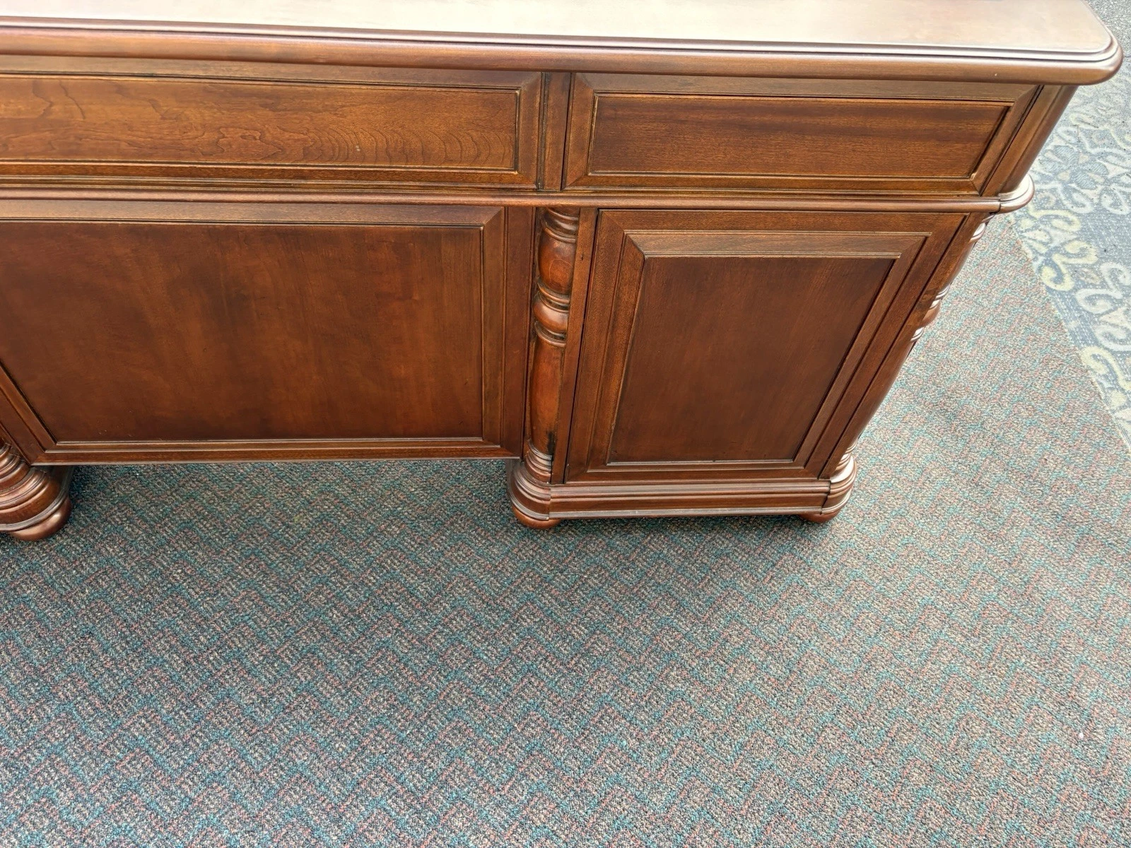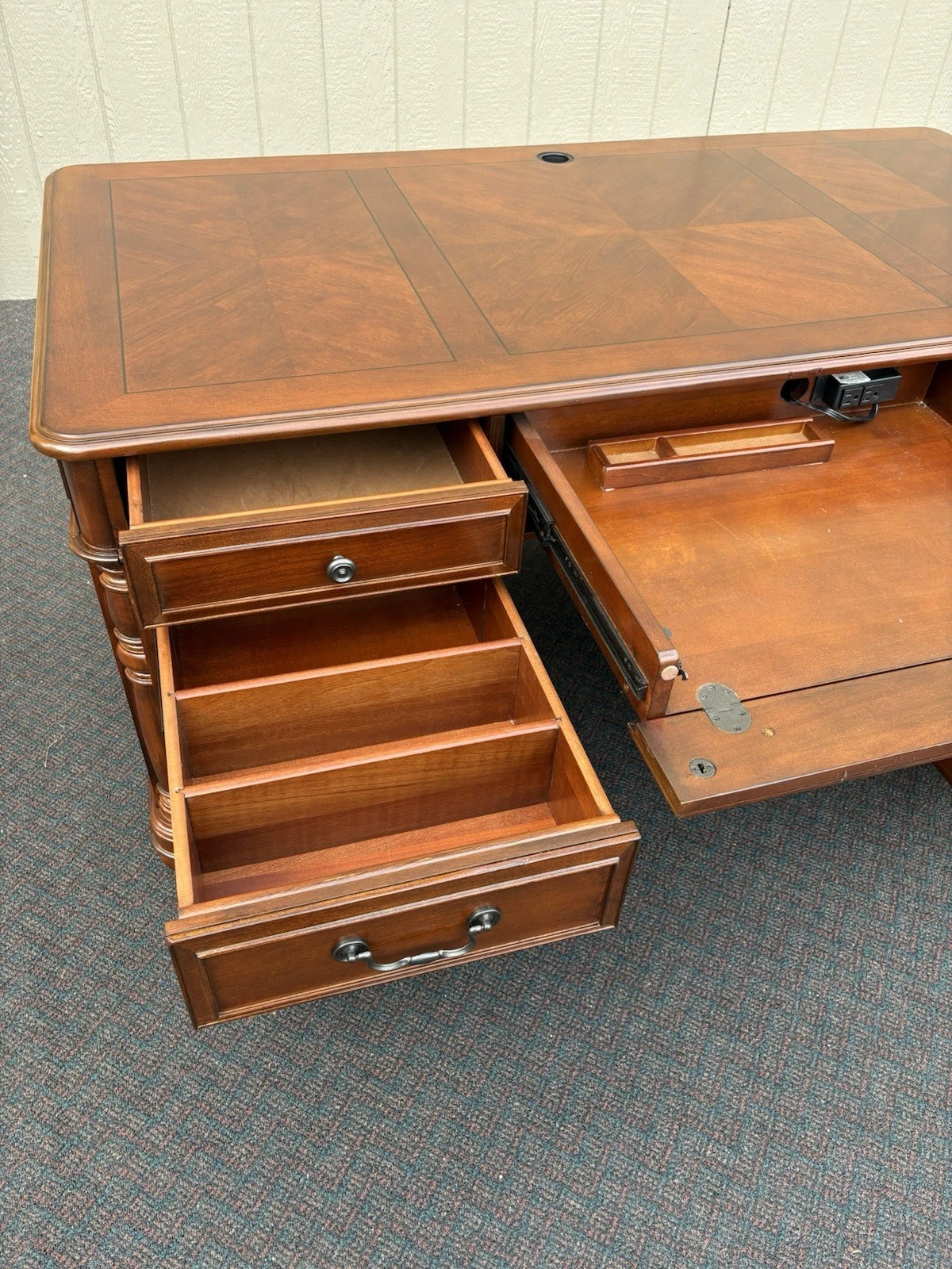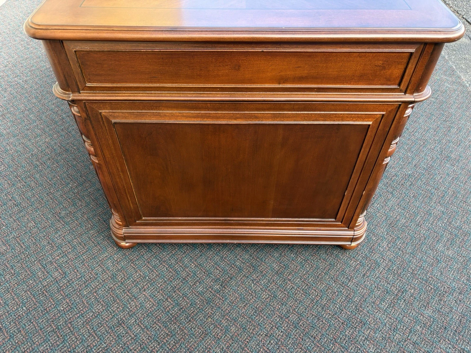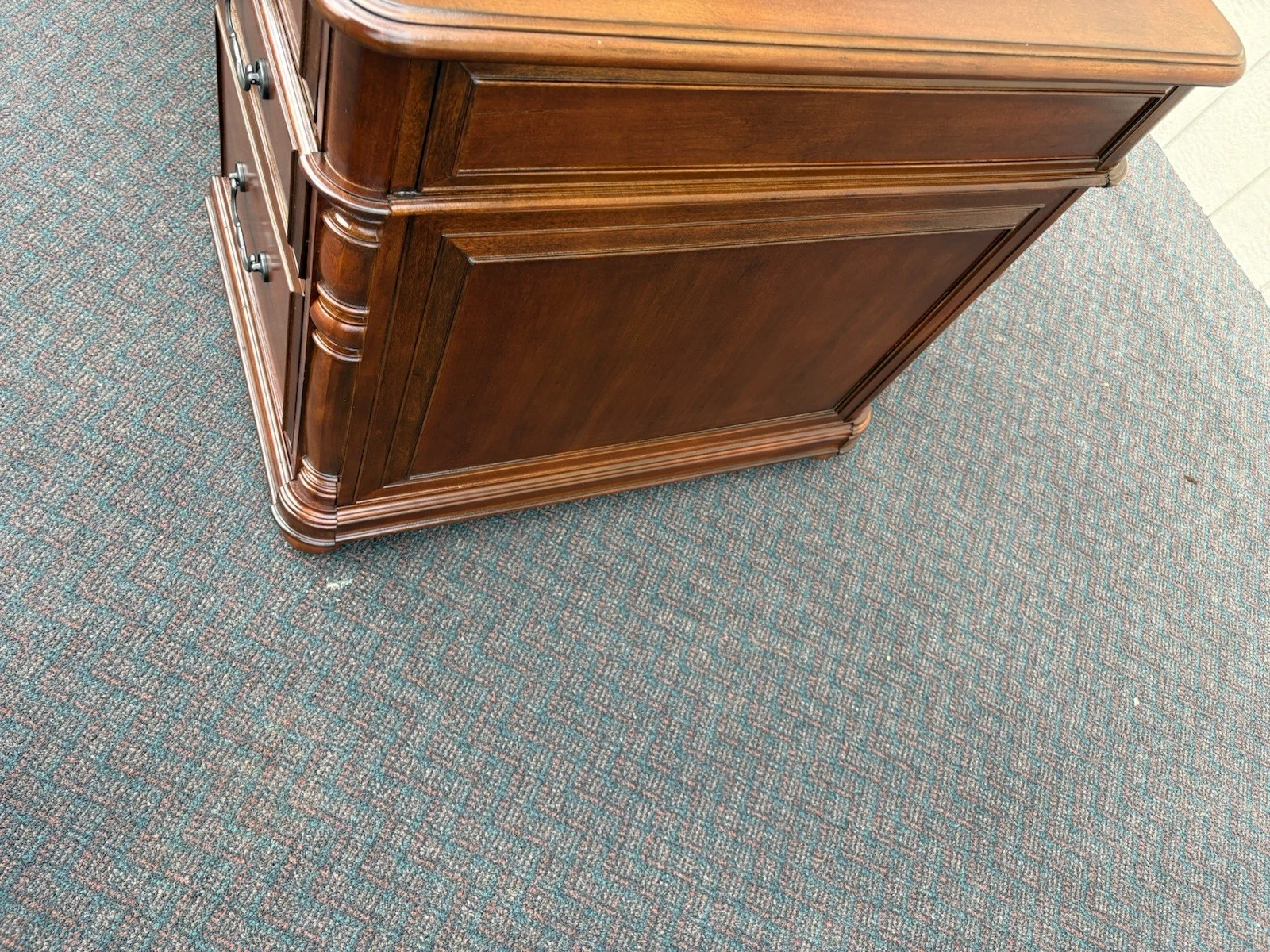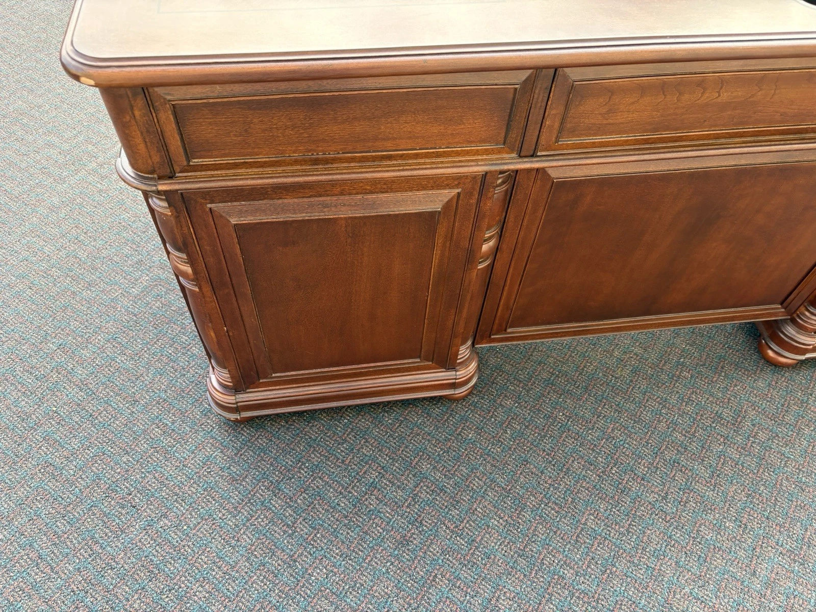 This elegant Riverside Furniture executive desk is a fine example of traditional craftsmanship, exuding warmth with its rich mahogany finish. Featuring six spacious drawers adorned with classic hardware, it seamlessly combines functionality and style, making it a perfect centerpiece for your home office or study. With its timeless design and sturdy construction, this desk not only serves as a practical workspace but also carries with it a sense of history and character, inviting you to create your own stories within its embrace.