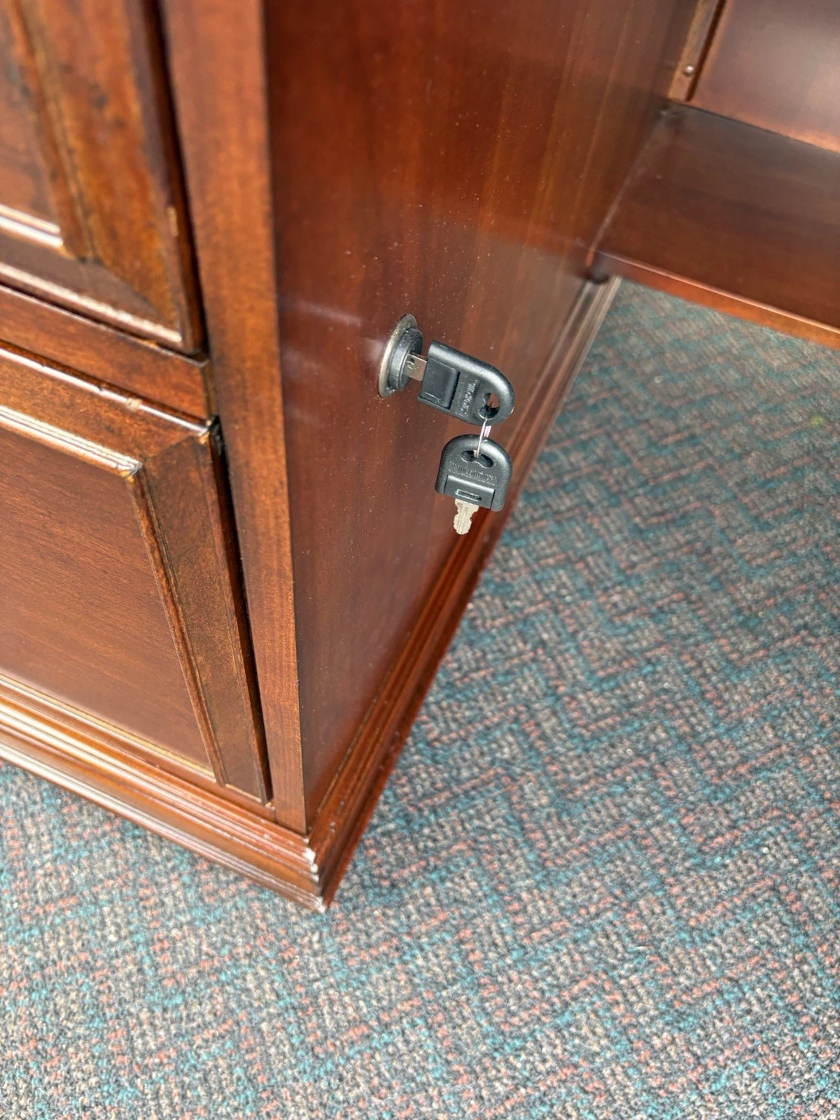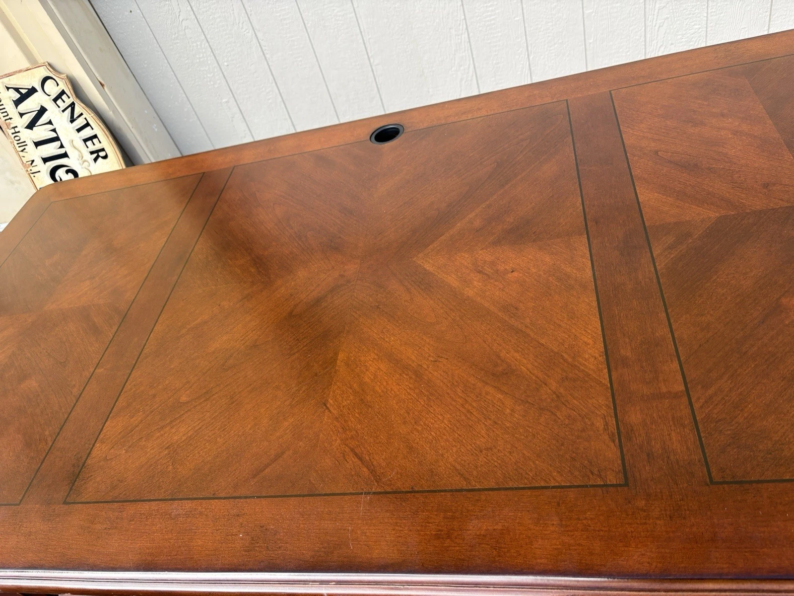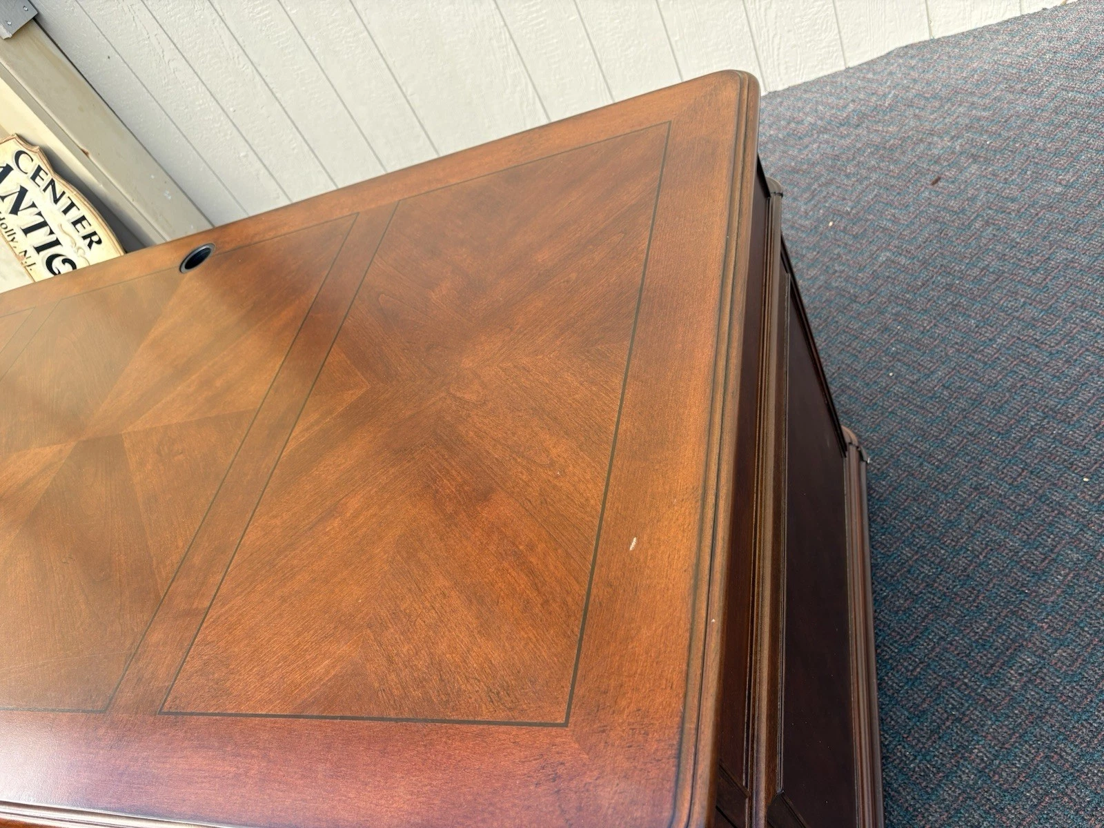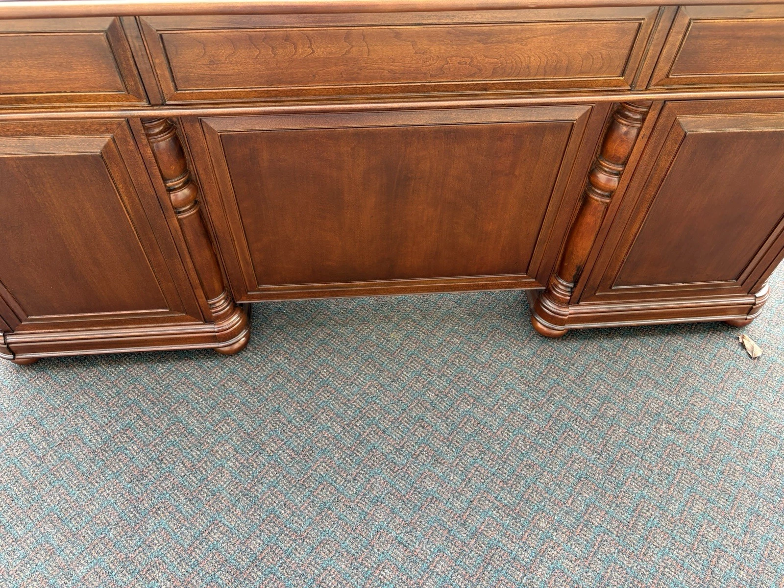 This elegant Riverside Furniture executive desk is a fine example of traditional craftsmanship, exuding warmth with its rich mahogany finish. Featuring six spacious drawers adorned with classic hardware, it seamlessly combines functionality and style, making it a perfect centerpiece for your home office or study. With its timeless design and sturdy construction, this desk not only serves as a practical workspace but also carries with it a sense of history and character, inviting you to create your own stories within its embrace.