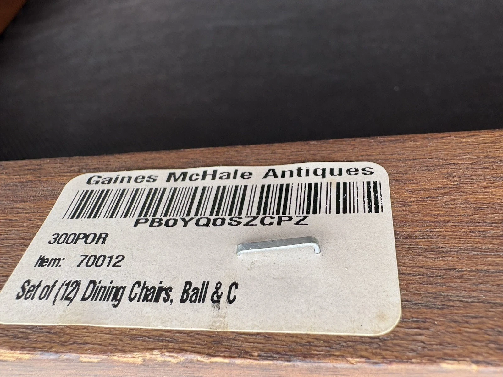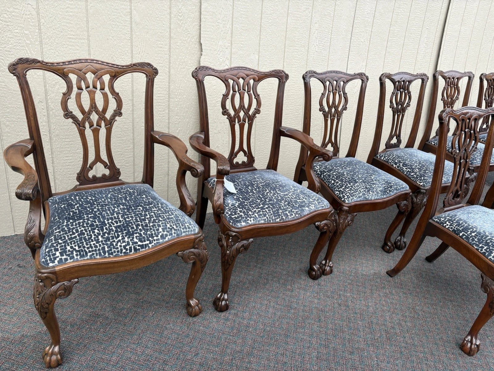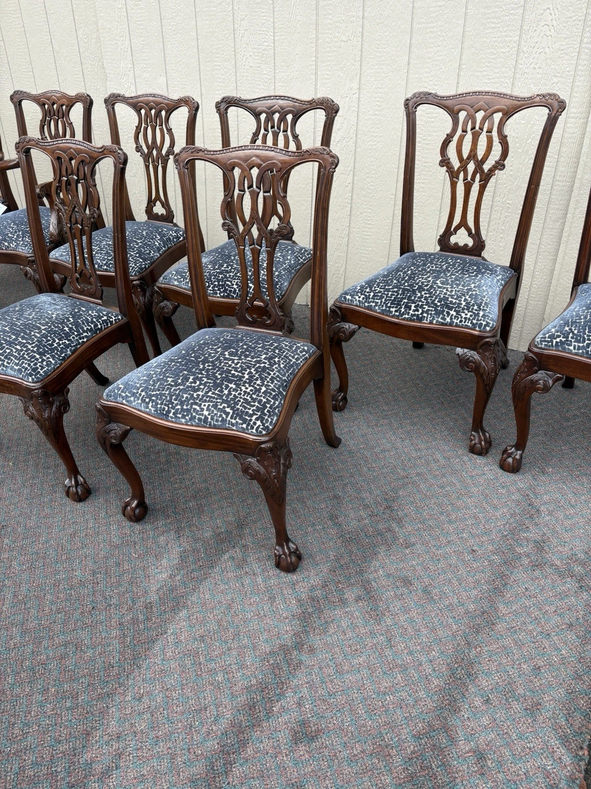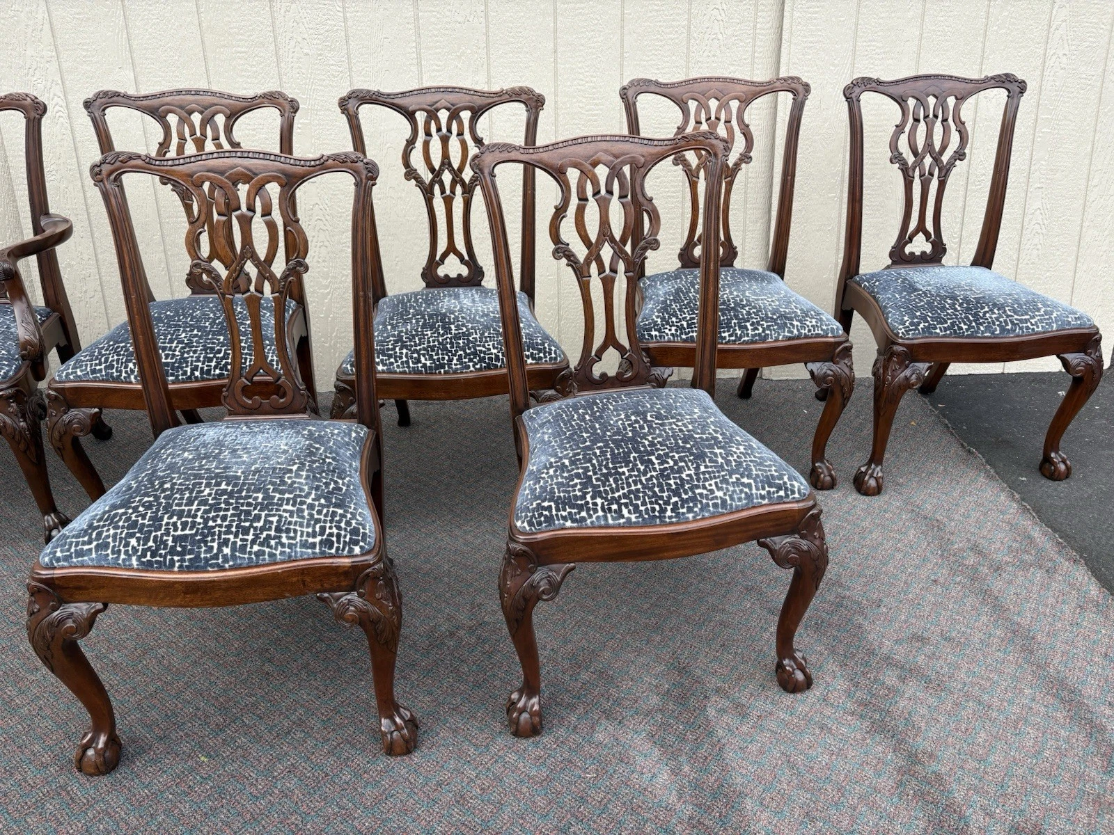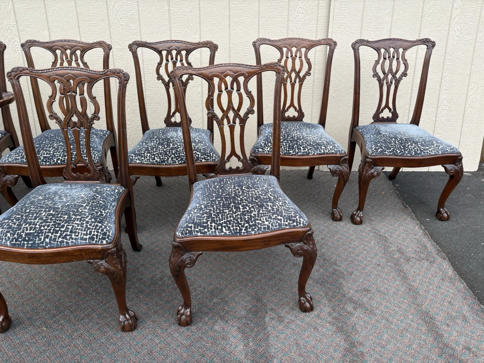 Introducing a stunning set of eight mahogany dining chairs by Gaines McHale, each embodying the elegant Chippendale style with exquisite craftsmanship. This collection includes two gracefully curved armchairs and six side chairs, all showcasing the rich, warm tones of mahogany that have beautifully aged over time. The chairs are not only visually striking but also remarkably comfortable, making them ideal for both lively family dinners and quiet evenings. Perfect for adding a touch of classic sophistication to your dining room, this set is a testament to quality American craftsmanship from the late 20th century.