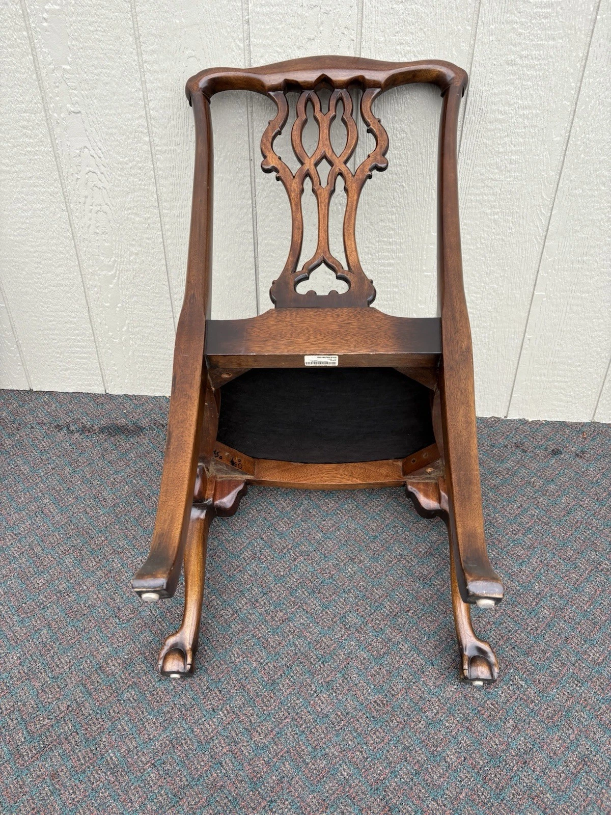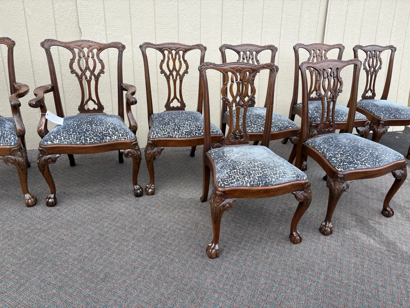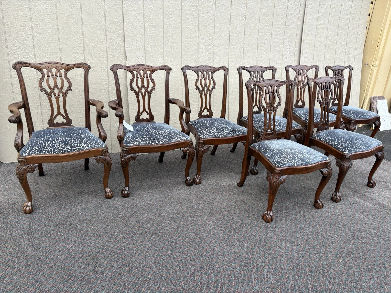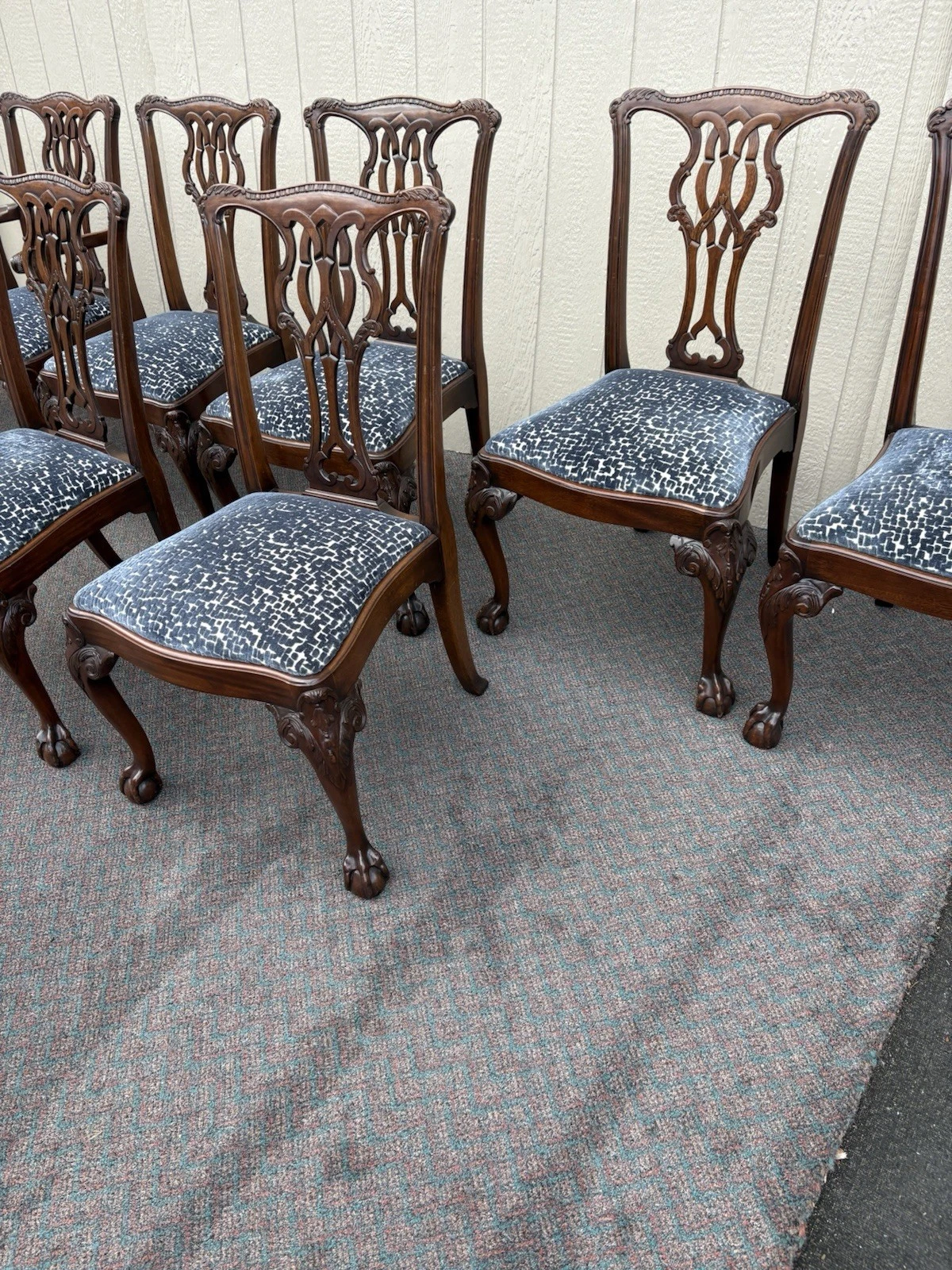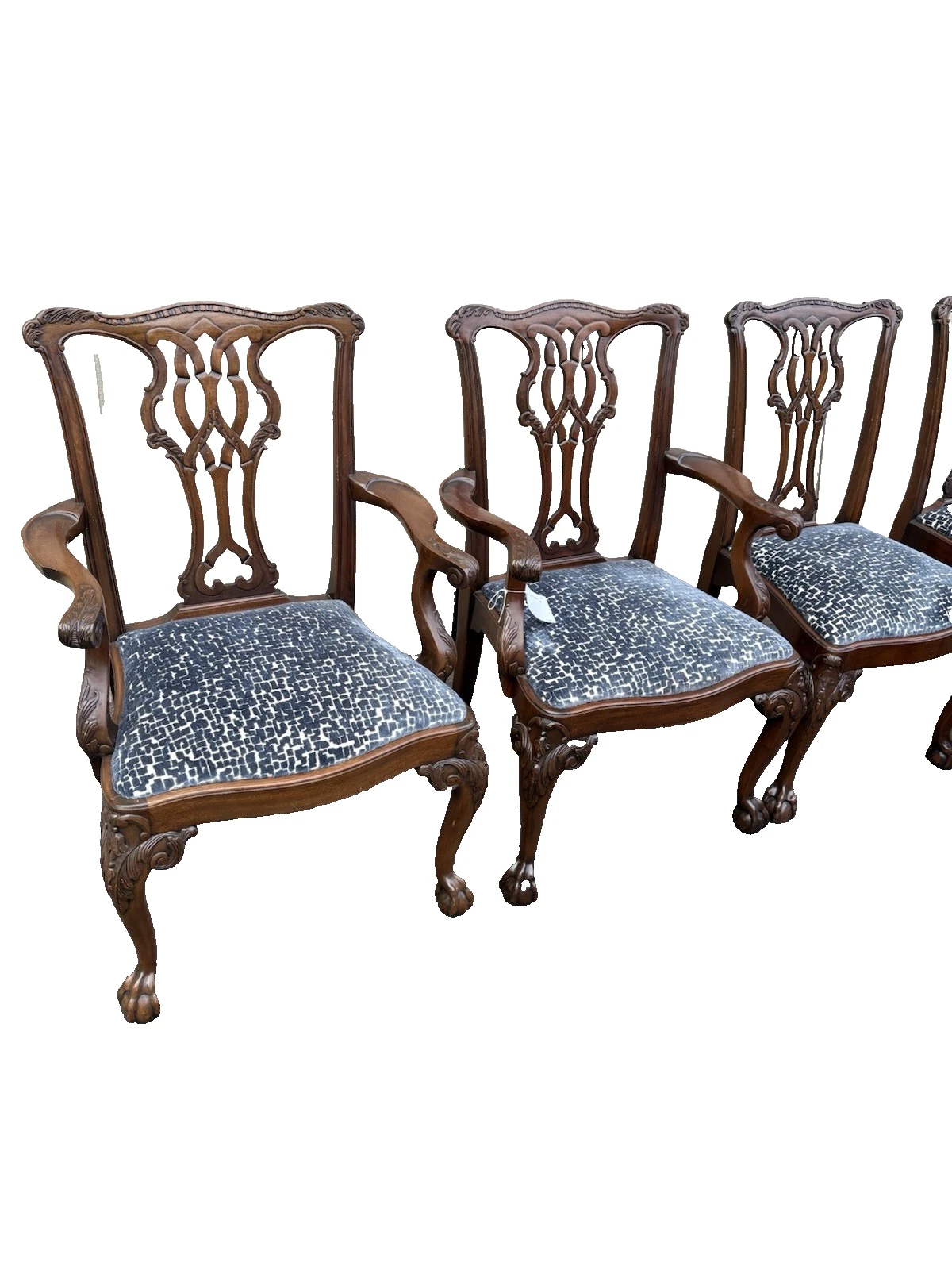 Introducing a stunning set of eight mahogany dining chairs by Gaines McHale, each embodying the elegant Chippendale style with exquisite craftsmanship. This collection includes two gracefully curved armchairs and six side chairs, all showcasing the rich, warm tones of mahogany that have beautifully aged over time. The chairs are not only visually striking but also remarkably comfortable, making them ideal for both lively family dinners and quiet evenings. Perfect for adding a touch of classic sophistication to your dining room, this set is a testament to quality American craftsmanship from the late 20th century.