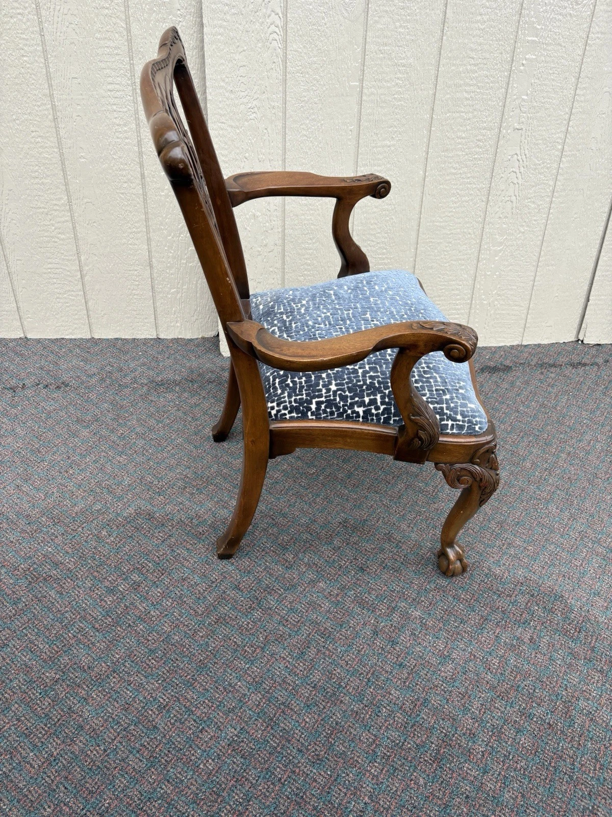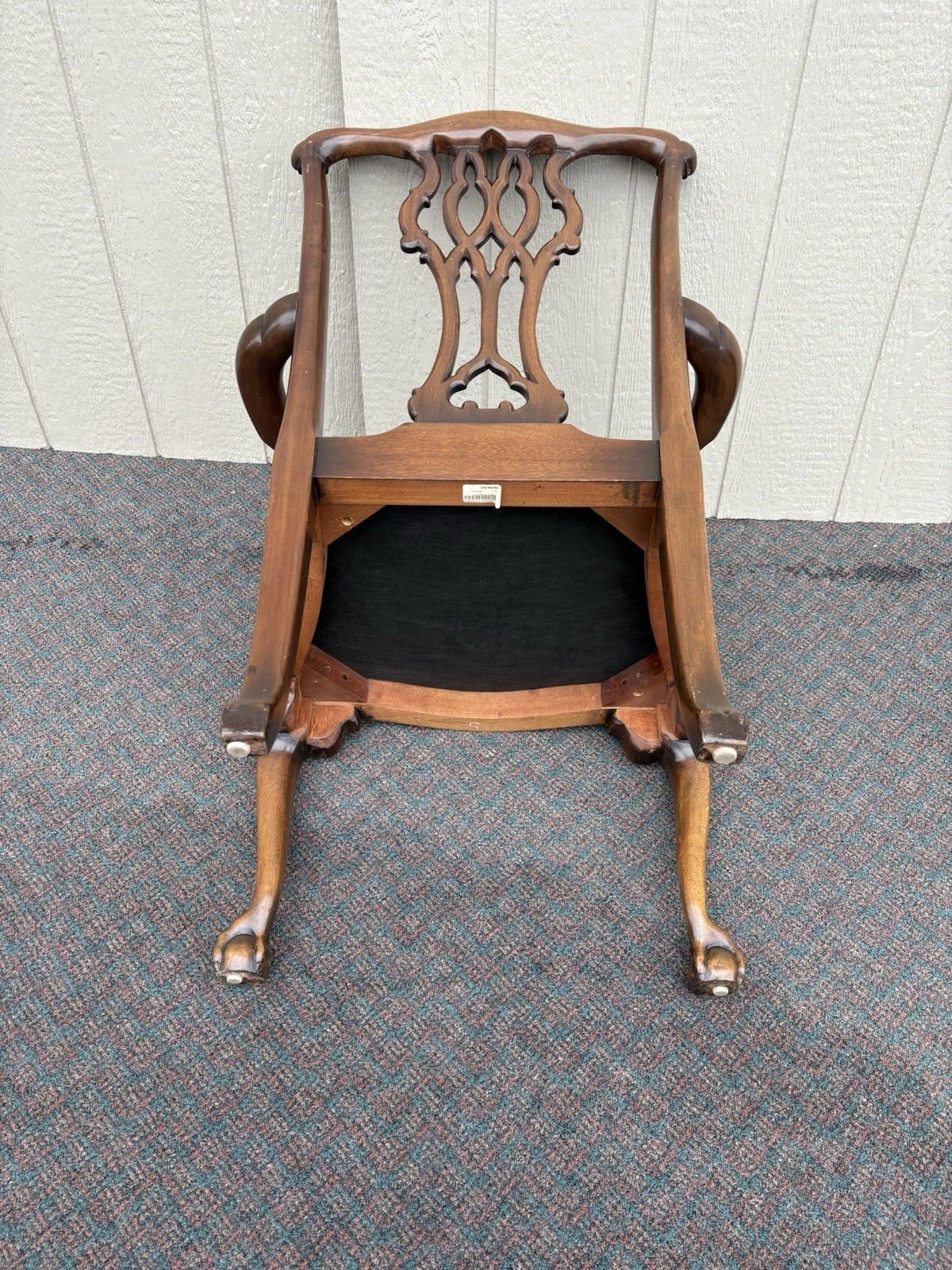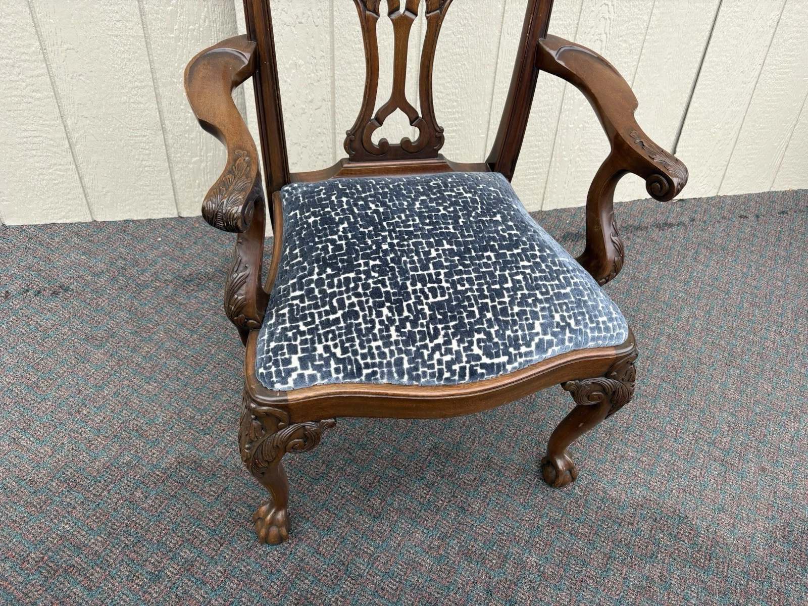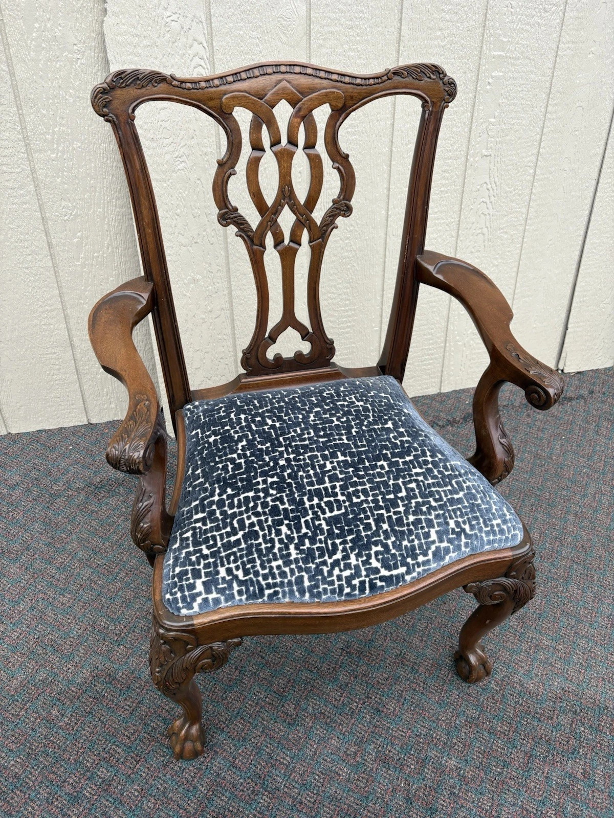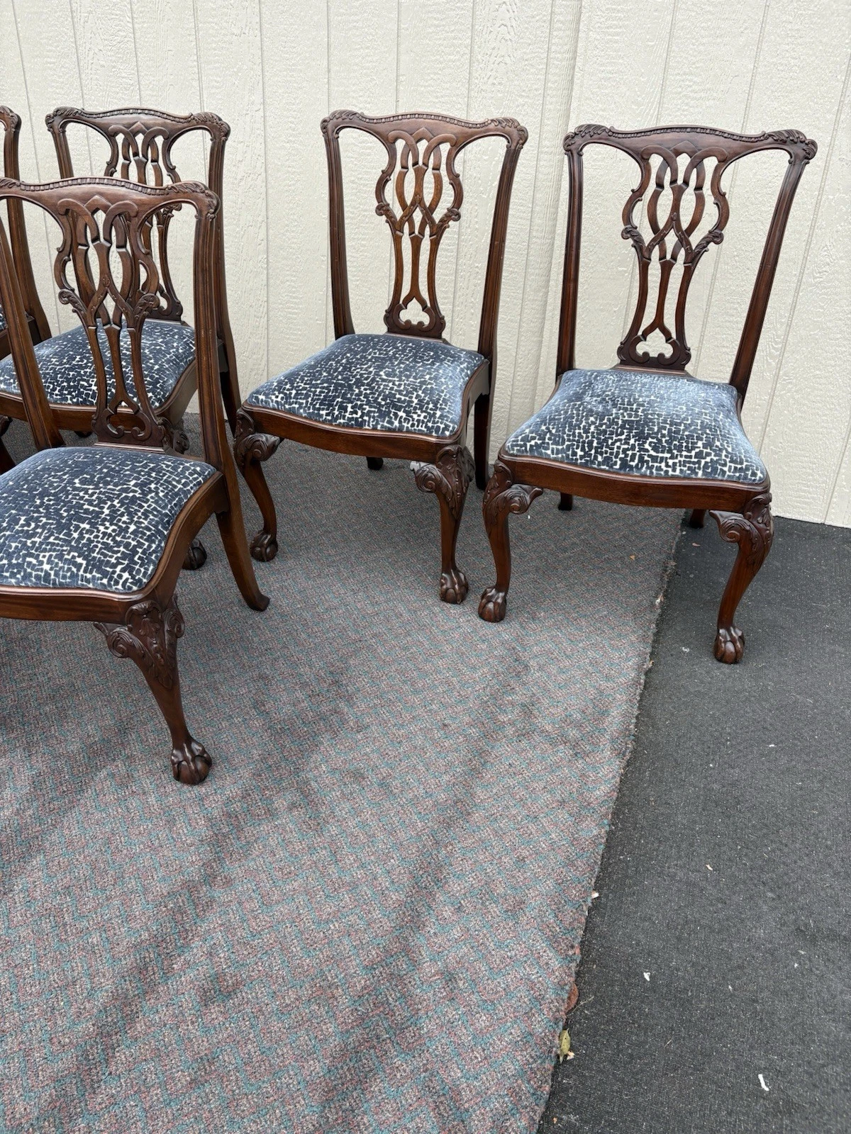 Introducing a stunning set of eight mahogany dining chairs by Gaines McHale, each embodying the elegant Chippendale style with exquisite craftsmanship. This collection includes two gracefully curved armchairs and six side chairs, all showcasing the rich, warm tones of mahogany that have beautifully aged over time. The chairs are not only visually striking but also remarkably comfortable, making them ideal for both lively family dinners and quiet evenings. Perfect for adding a touch of classic sophistication to your dining room, this set is a testament to quality American craftsmanship from the late 20th century.