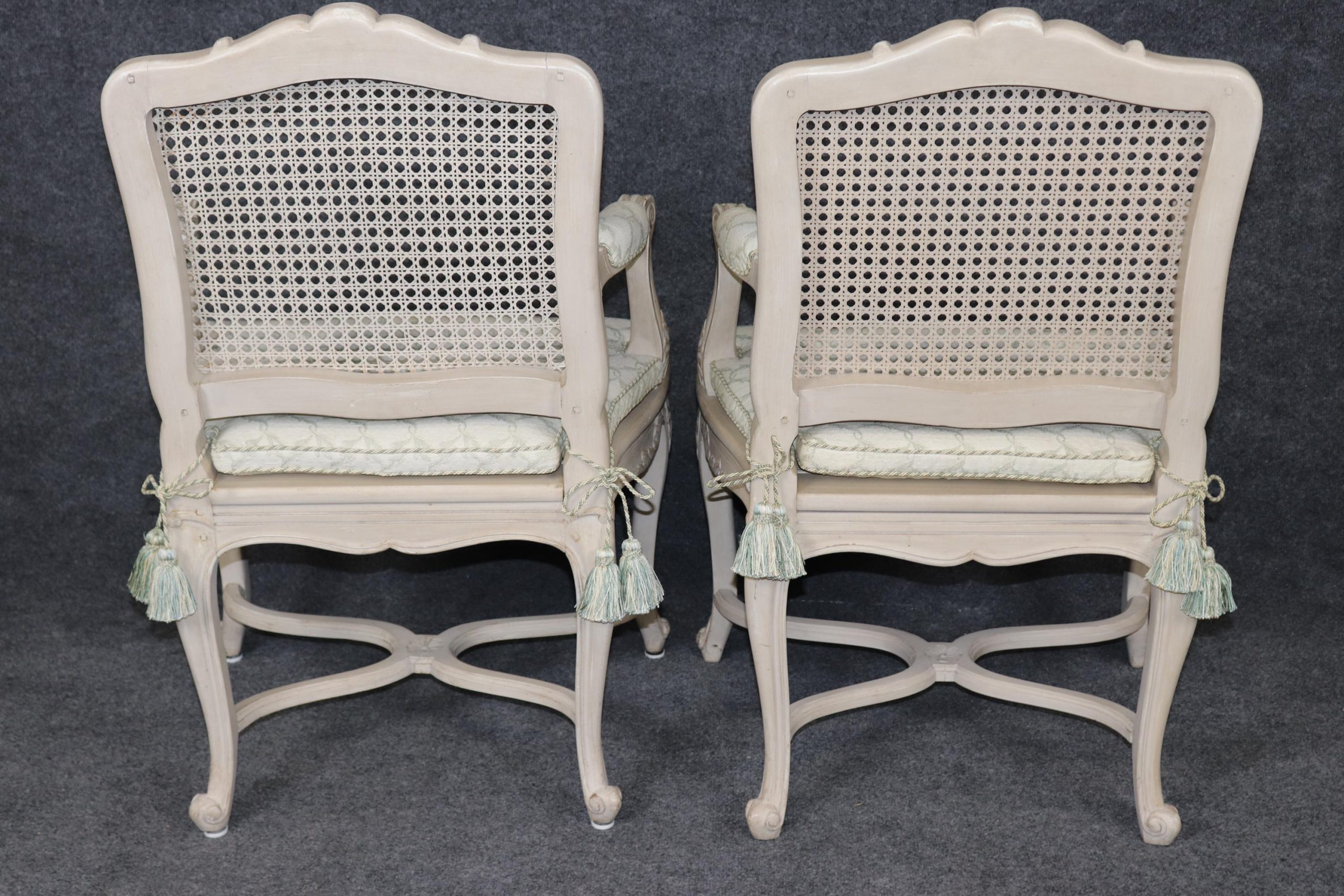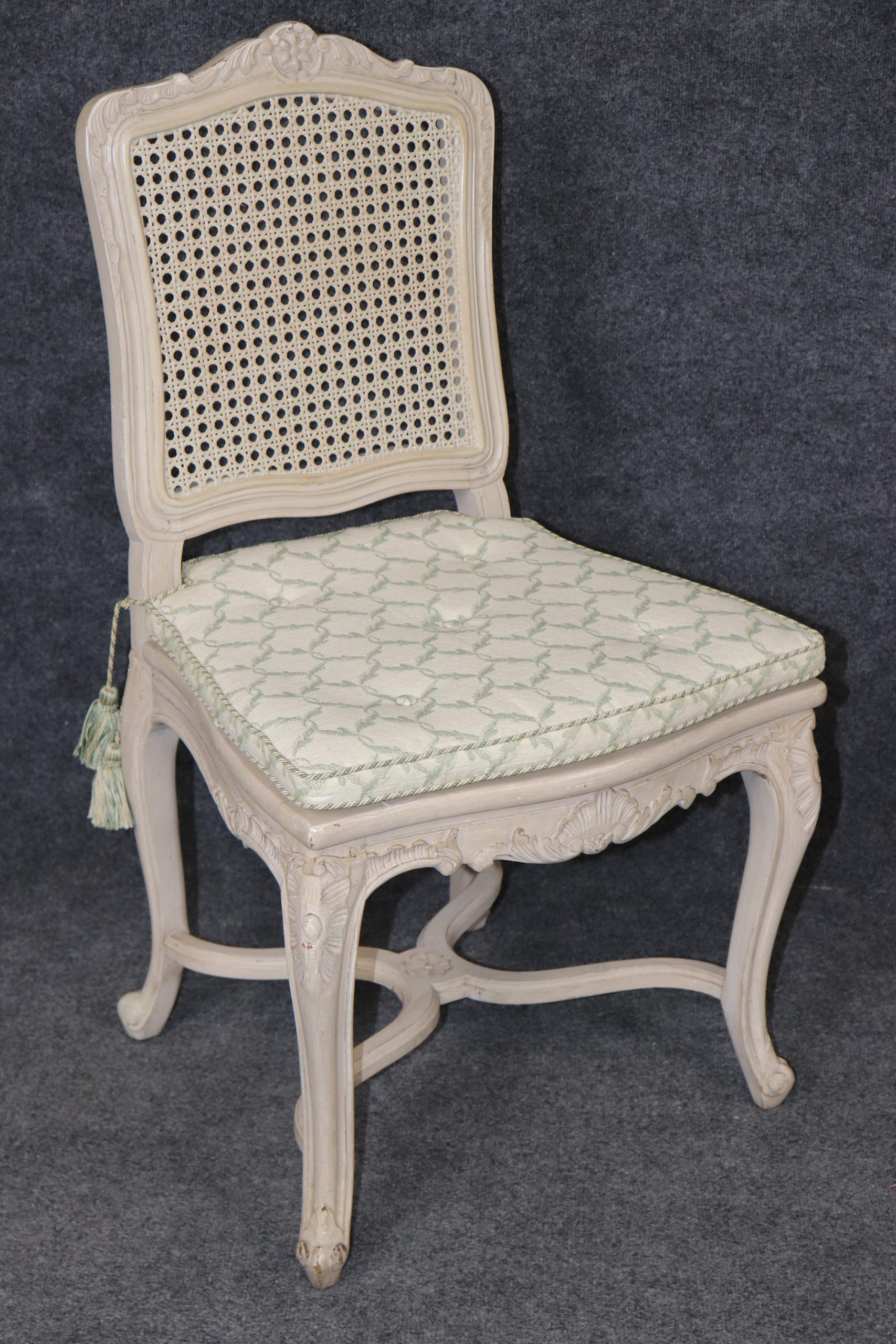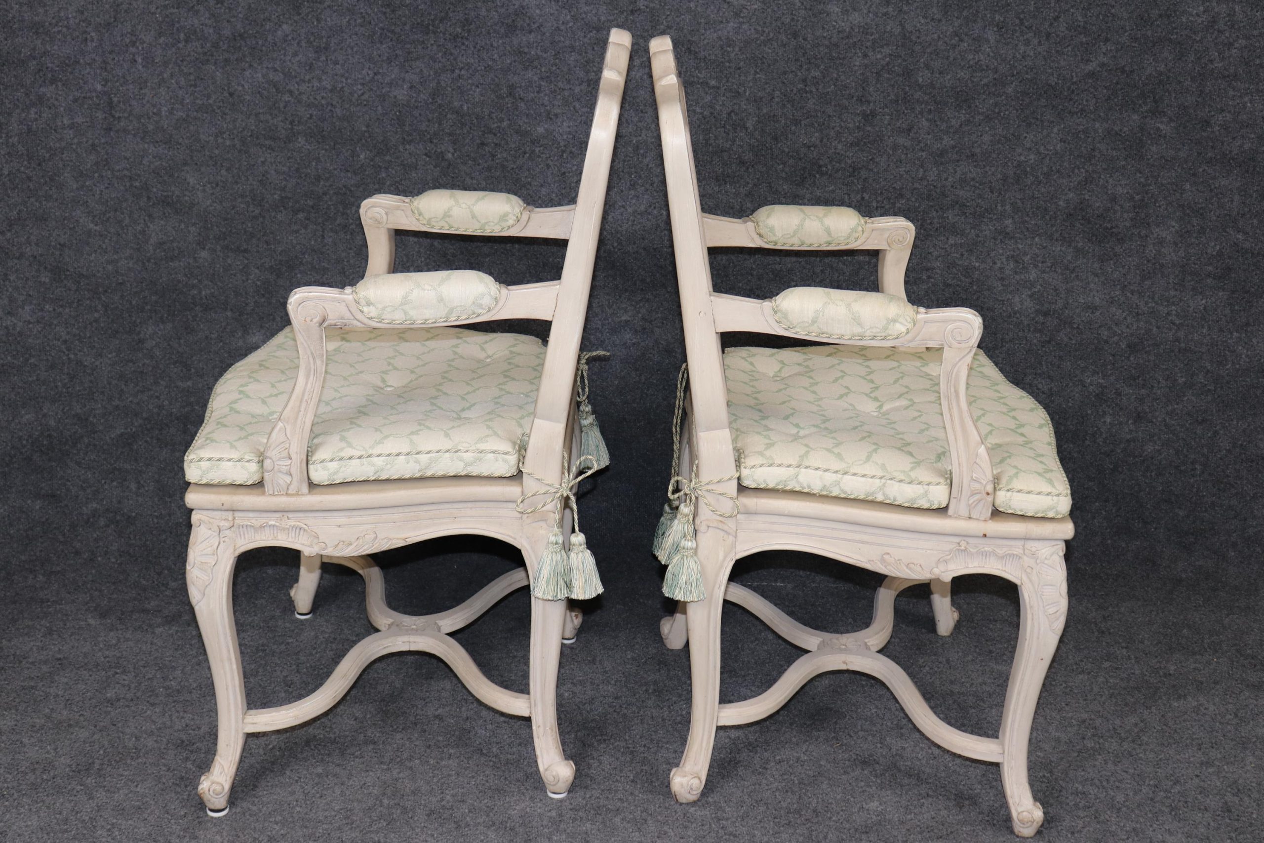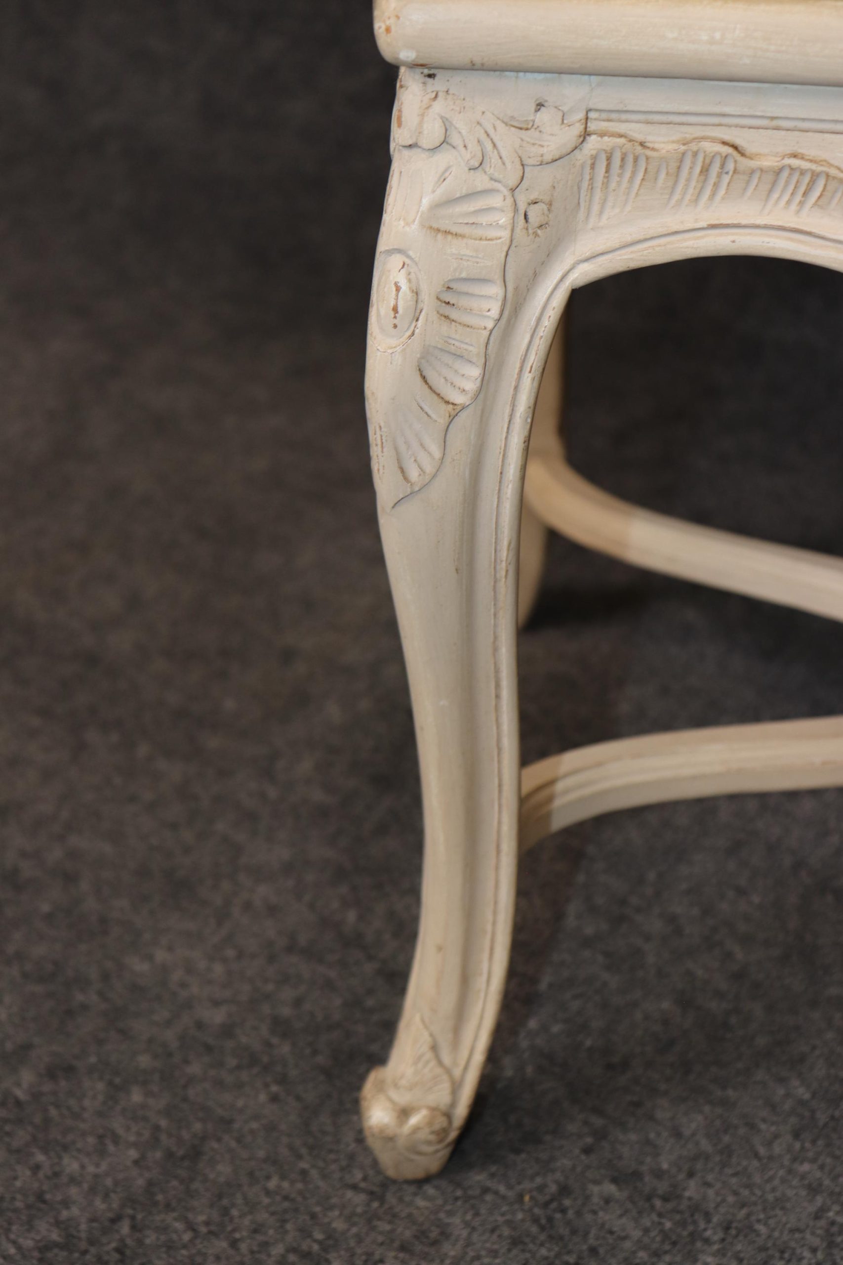 Each chair is finely carved with hand-tooled details accentuating the curving forms of the Louis XV style — from the sinuous lines of the backs and aprons to the cabriole legs ending in whorl feet. The paint decoration, soft and delicately worn, enhances the relief of the carvings while maintaining a gentle antique aesthetic.