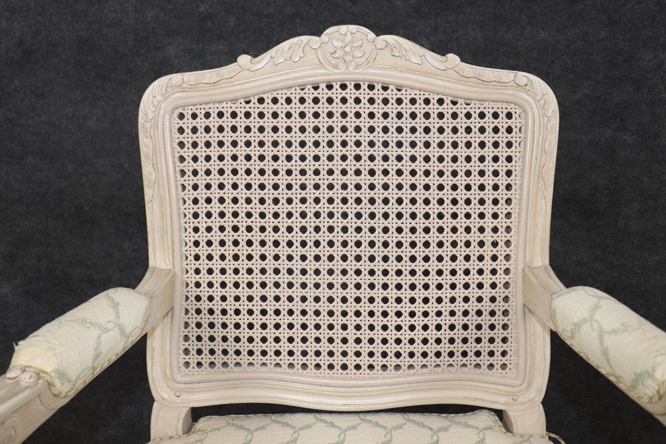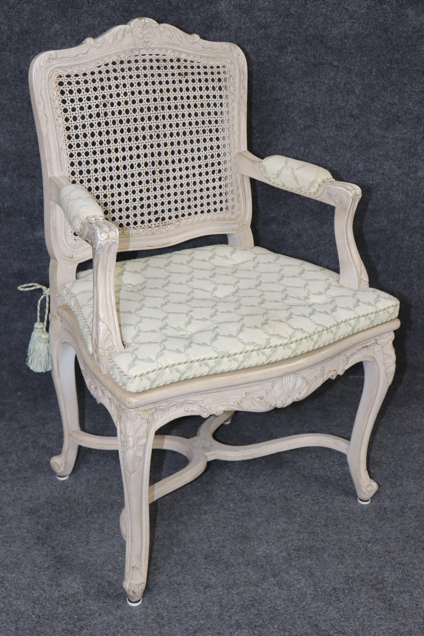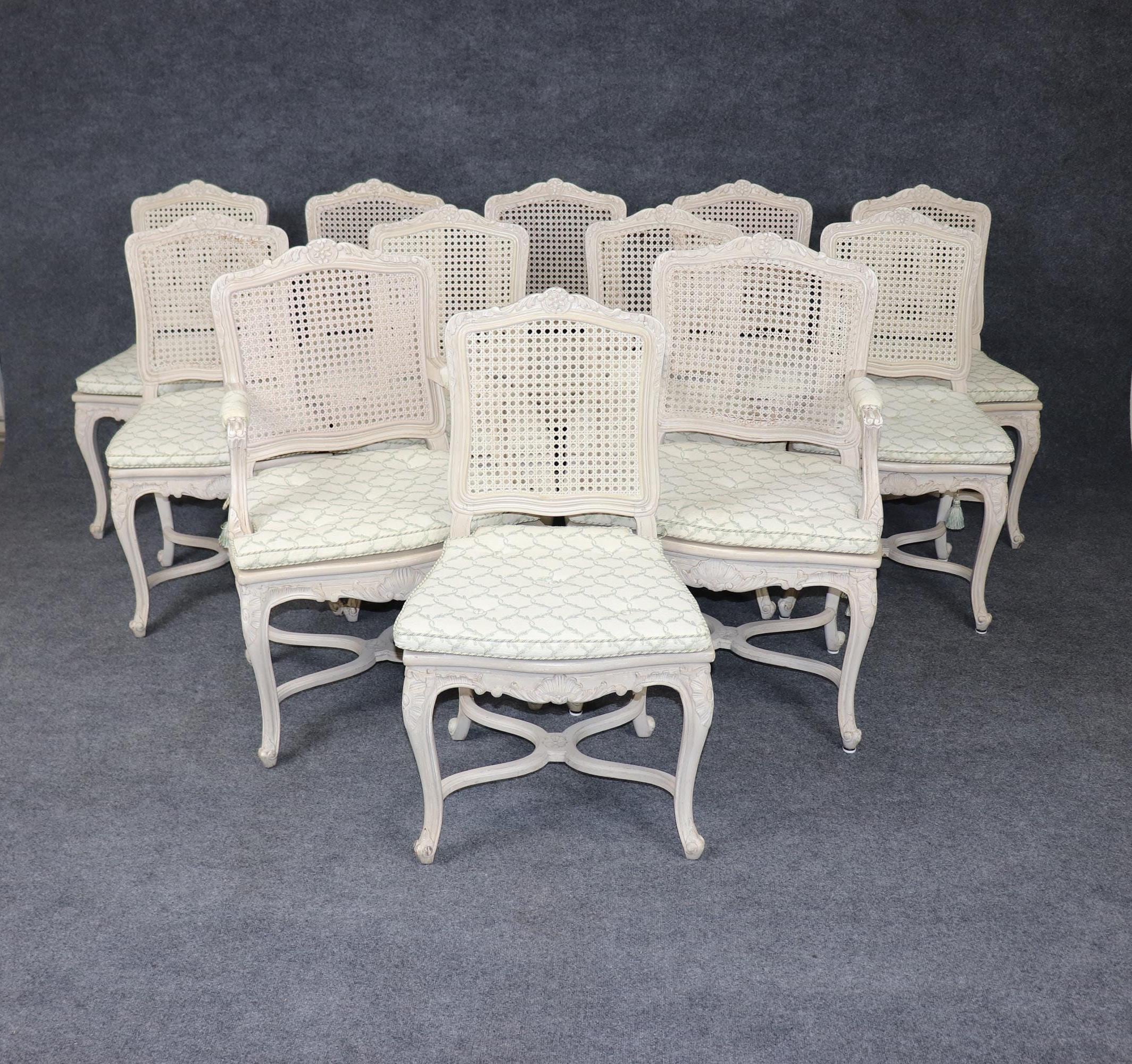 The result is a superbly cohesive set — seldom found in groups of twelve — ideal for a grand formal dining room, an estate home, or a château-inspired interior seeking authentic French sophistication. The chairs are in good antique/vintage condition with cane damage, surface scratches and finish loss as to be expected of a set from the 1950’s.