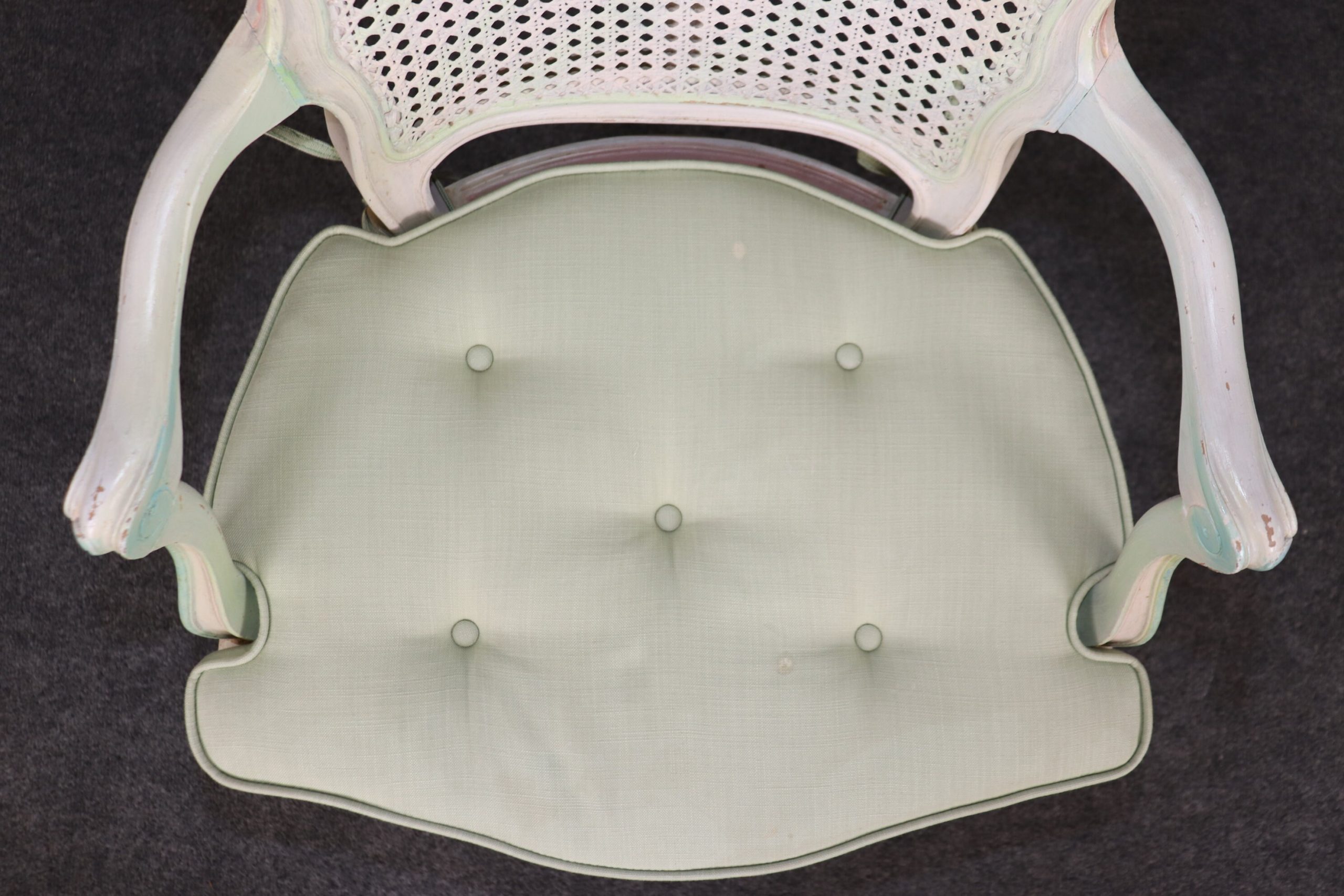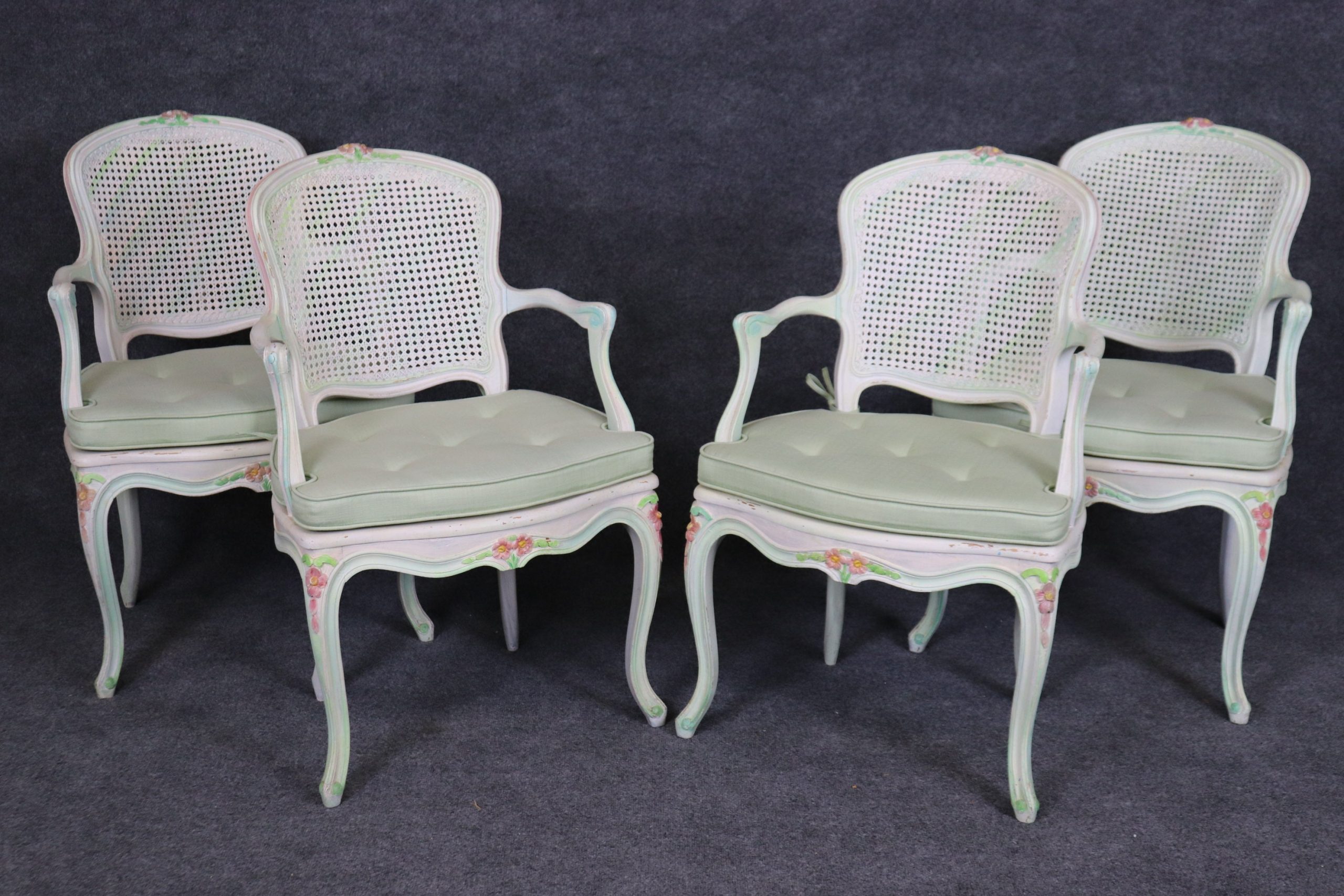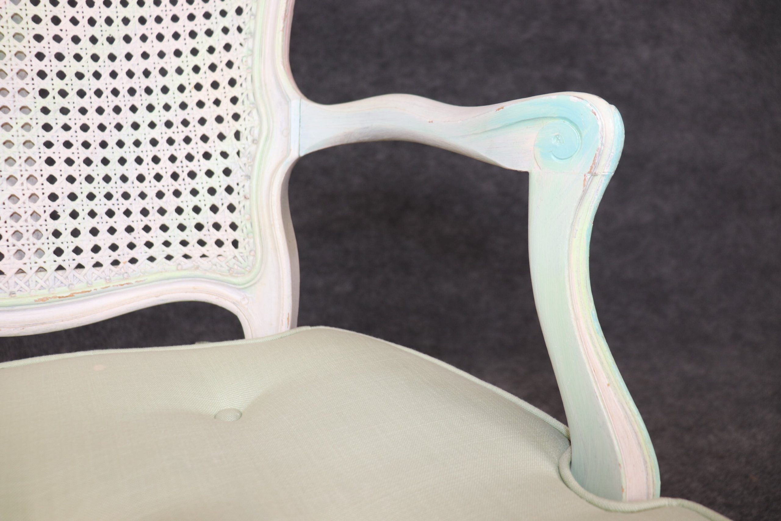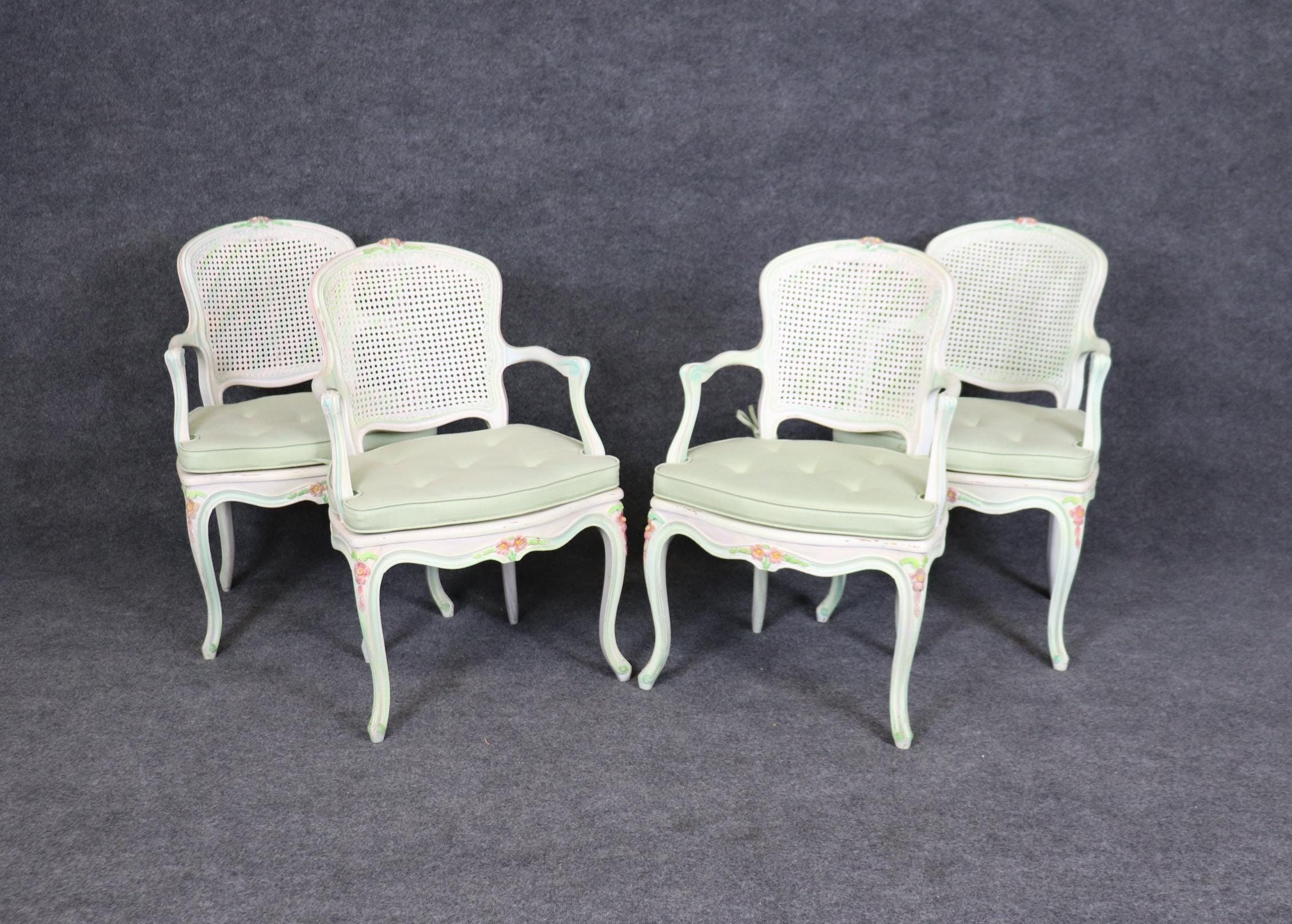 This set of 4 Louis XV style cane back armchairs is made with immense detail and of the highest quality and is up to par with brands such as Baker and Bodart! If you look at the photos provided, you’ll see the mint green paint decorated frames as well as the tufted cushions! These chairs are perfect for you and your home, and will bring a sense of luxury and sophistication into your home or place of choosing! These chairs can be used as dining room chairs or as kitchen chairs. Antique furniture and vintage pieces have stood the test of time and this set of chairs is no exception! With its quality materials and great craftsmanship this set is bound to last you and your family for many years to come. The chairs are in good vintage condition with light surface scratches and minor finish loss. No Significant imperfections to note.