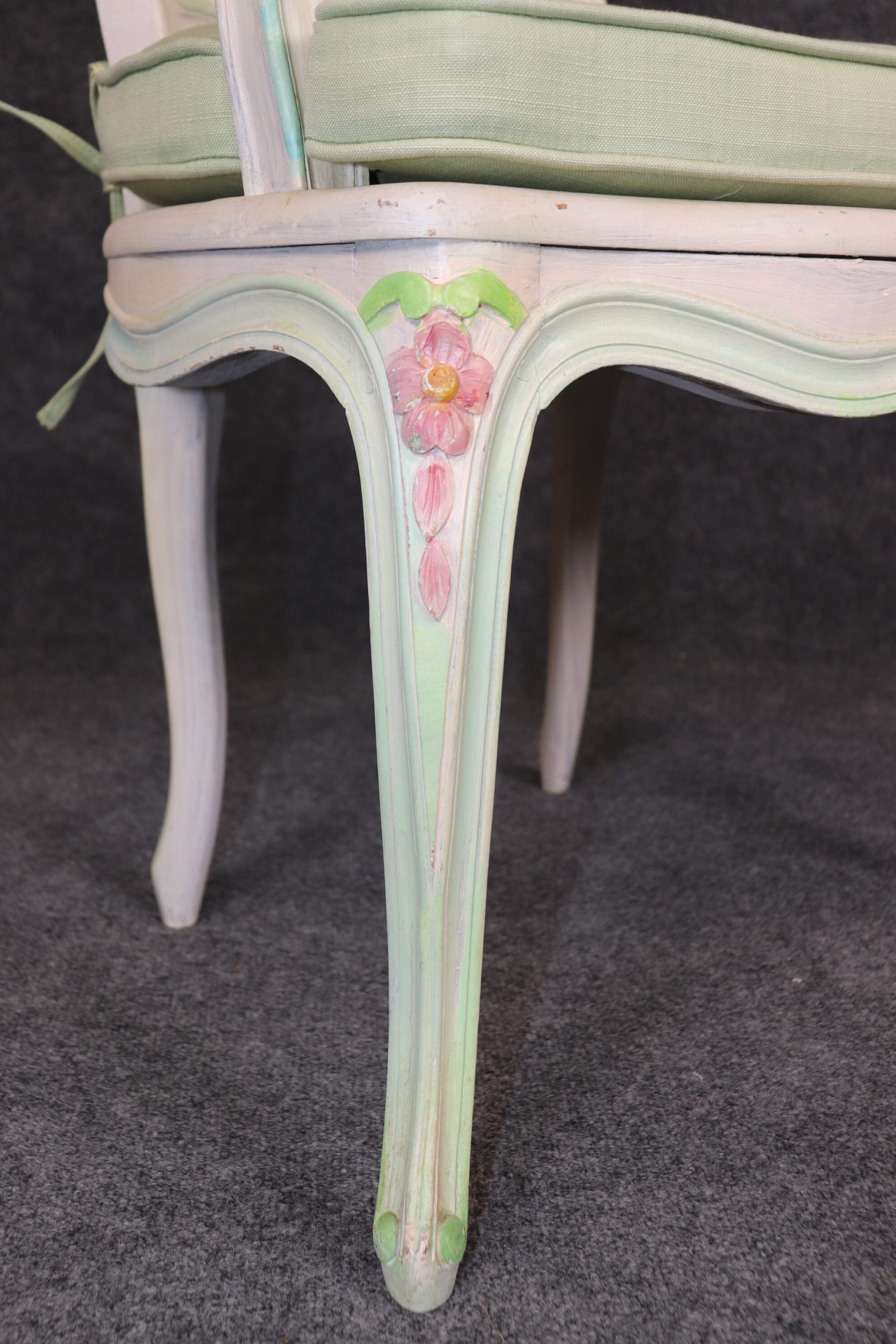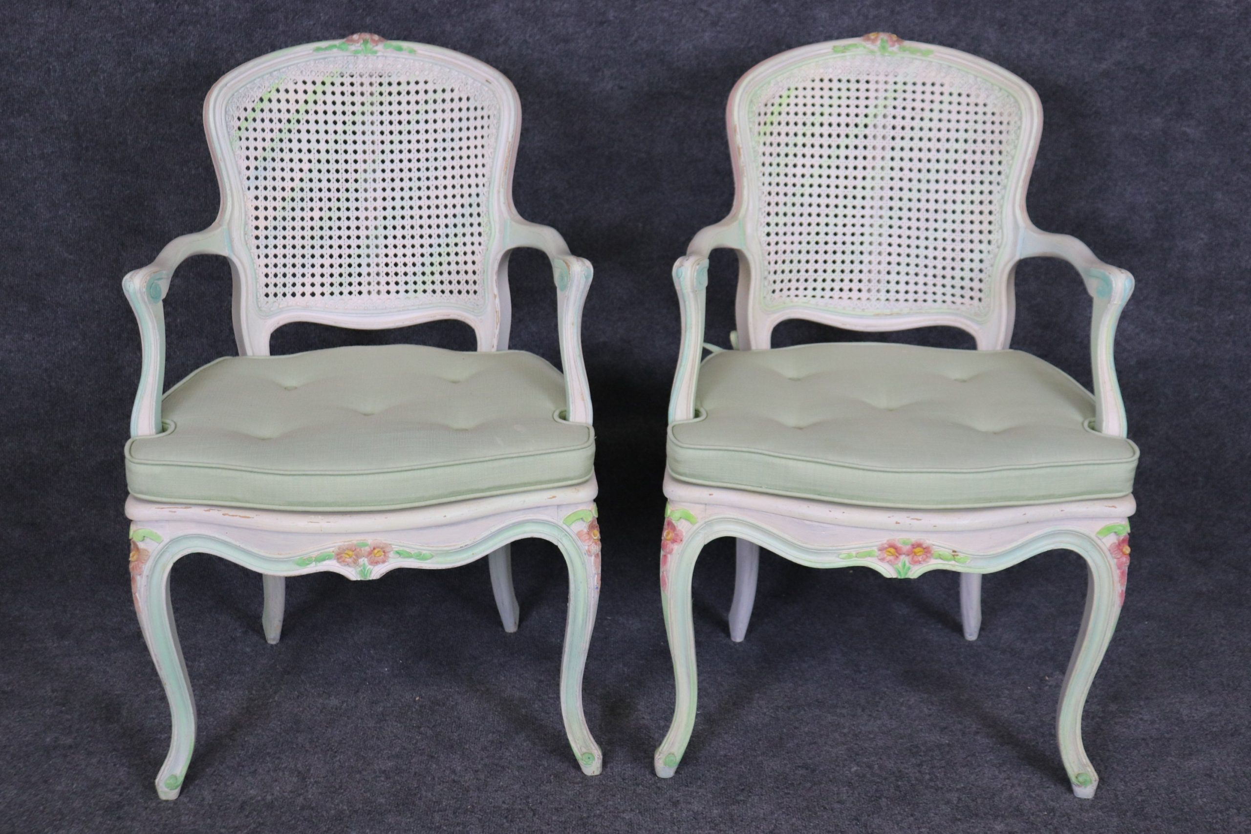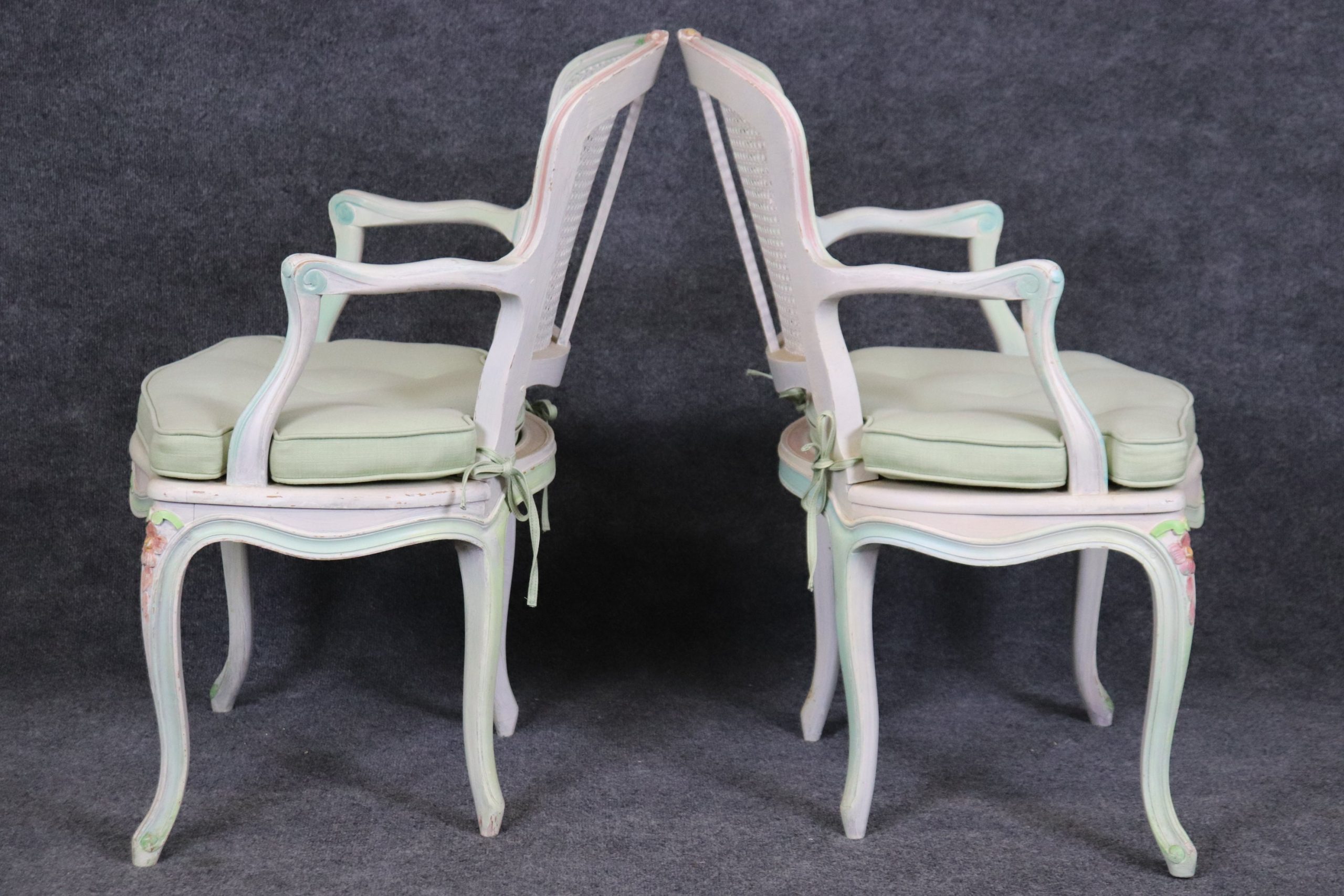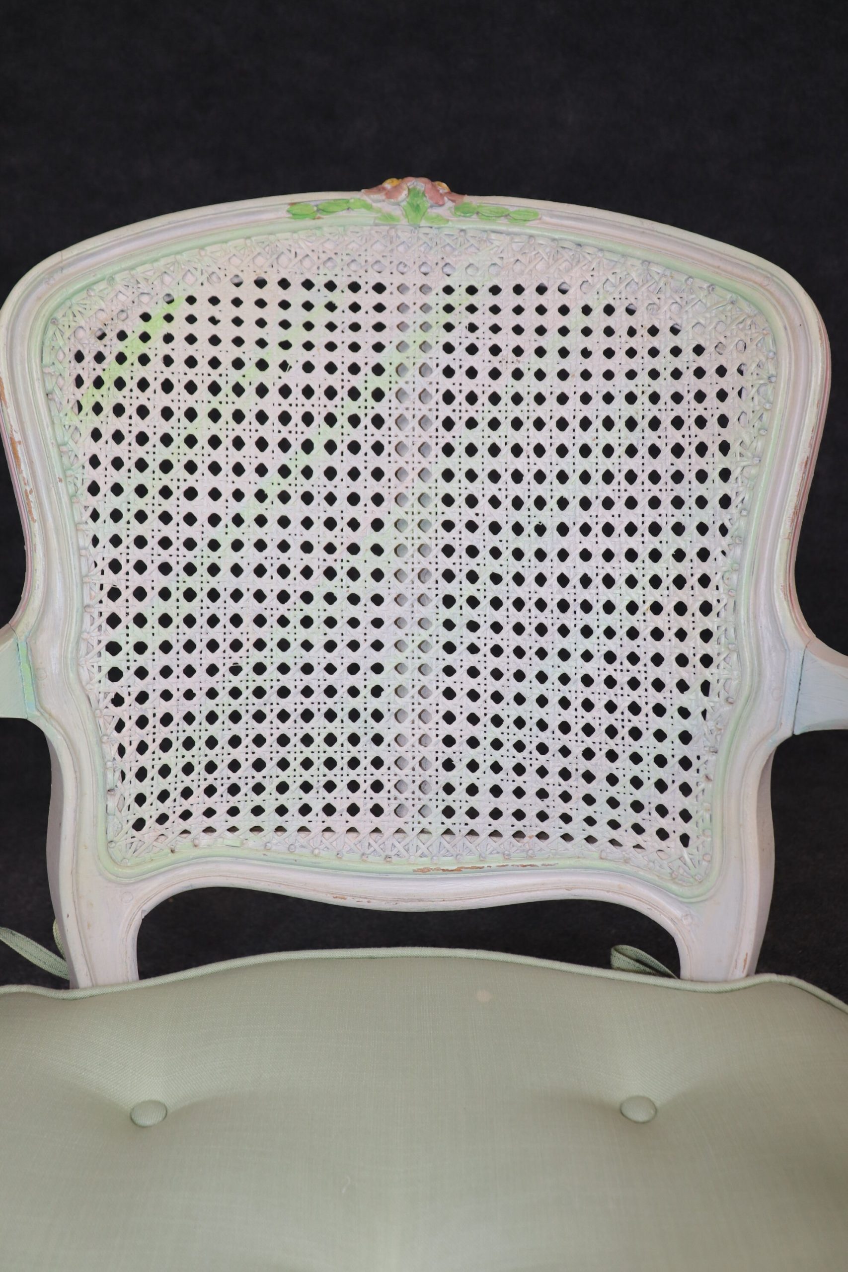 This set of 4 Louis XV style cane back armchairs is made with immense detail and of the highest quality and is up to par with brands such as Baker and Bodart! If you look at the photos provided, you’ll see the mint green paint decorated frames as well as the tufted cushions! These chairs are perfect for you and your home, and will bring a sense of luxury and sophistication into your home or place of choosing! These chairs can be used as dining room chairs or as kitchen chairs. Antique furniture and vintage pieces have stood the test of time and this set of chairs is no exception! With its quality materials and great craftsmanship this set is bound to last you and your family for many years to come. The chairs are in good vintage condition with light surface scratches and minor finish loss. No Significant imperfections to note.