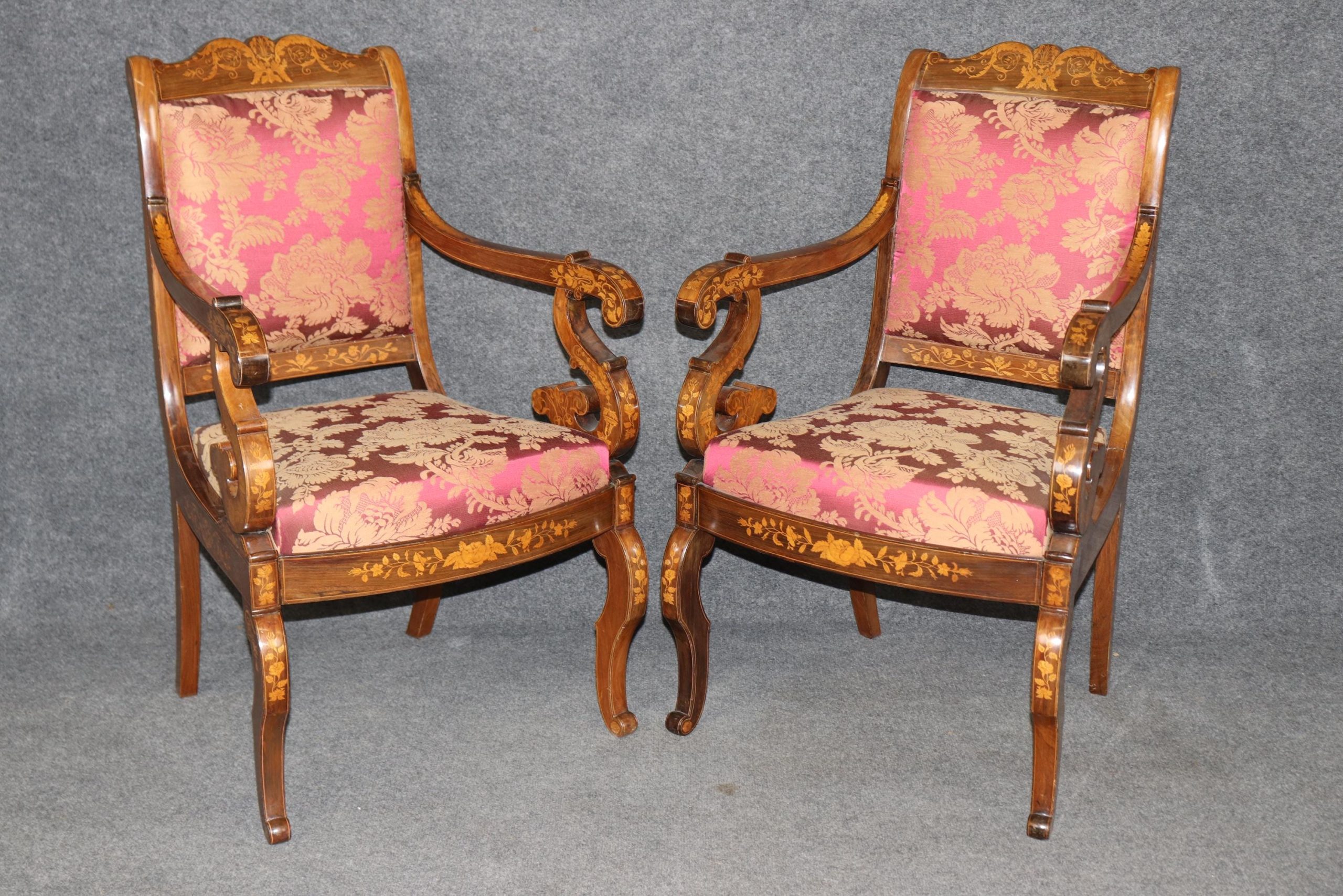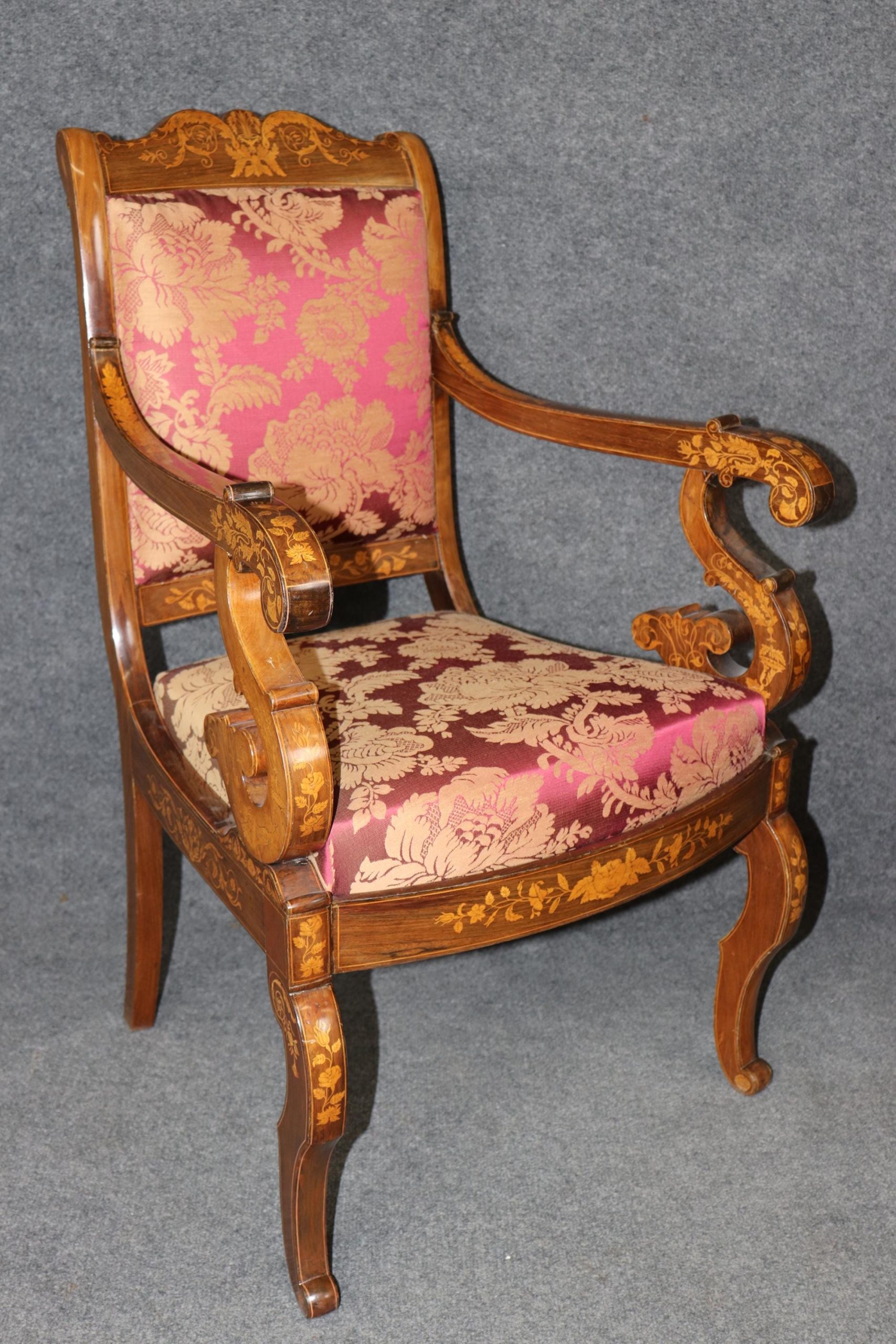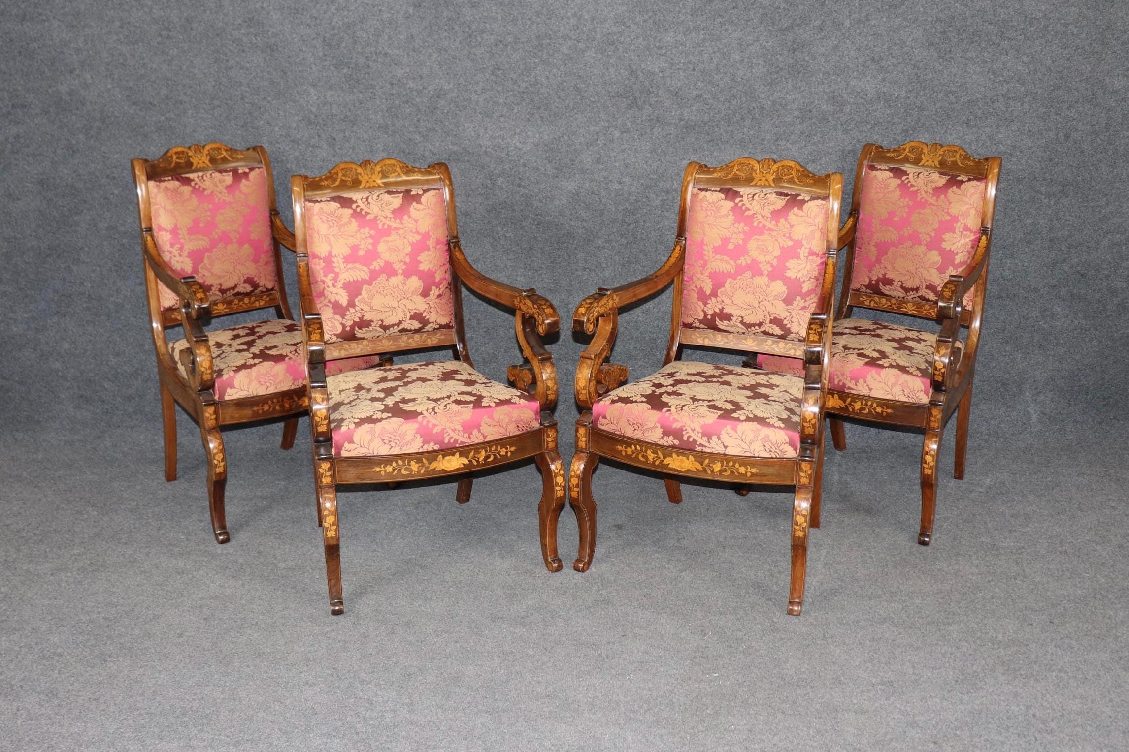 This set of 4 vintage Dutch marquetry inlaid armchairs is made with immense detail and of the highest quality! If you look at the photos provided, you’ll see the outstanding detail in the inlay throughout the chairs! These chairs are perfect for you and your home, and will bring a sense of luxury and sophistication into your home or place of choosing! These chairs can be used as dining room chairs, kitchen chairs or even accent chairs in your living room or office. Antique furniture and vintage pieces have stood the test of time and this set of chairs is no exception! With their quality materials and great craftsmanship this set is bound to last you and your family for many years to come. The chairs are in good vintage condition with light surface scratches and minor finish loss. No Significant imperfections to note. The upholstery appears to be in good condition, but may show minor signs of wear.