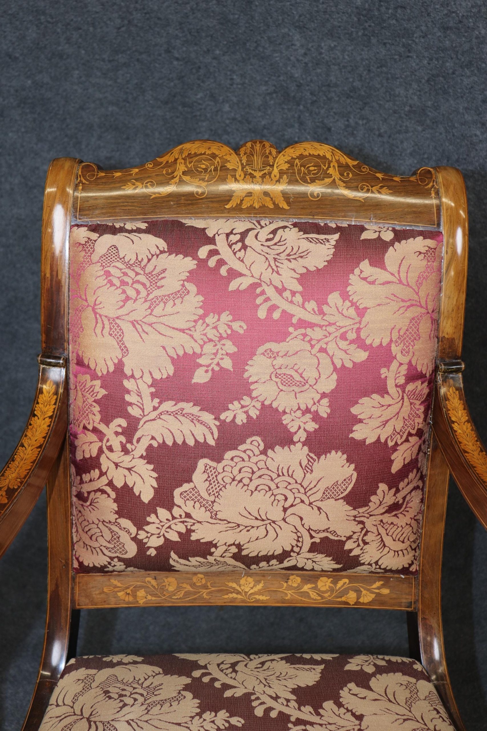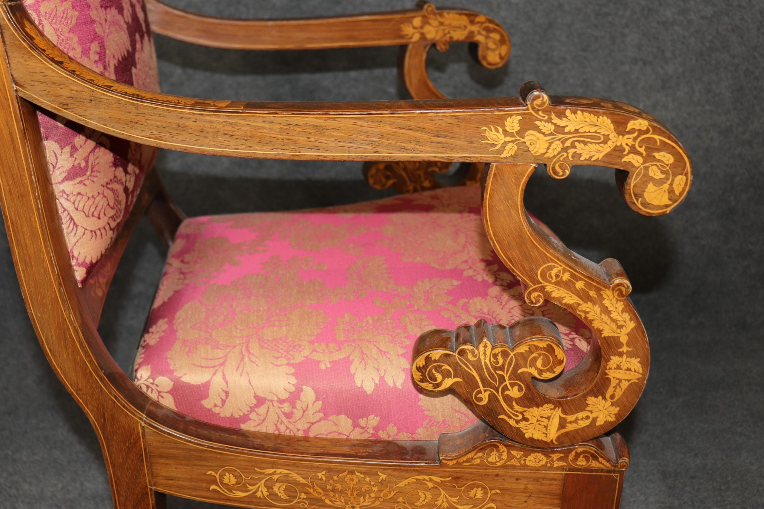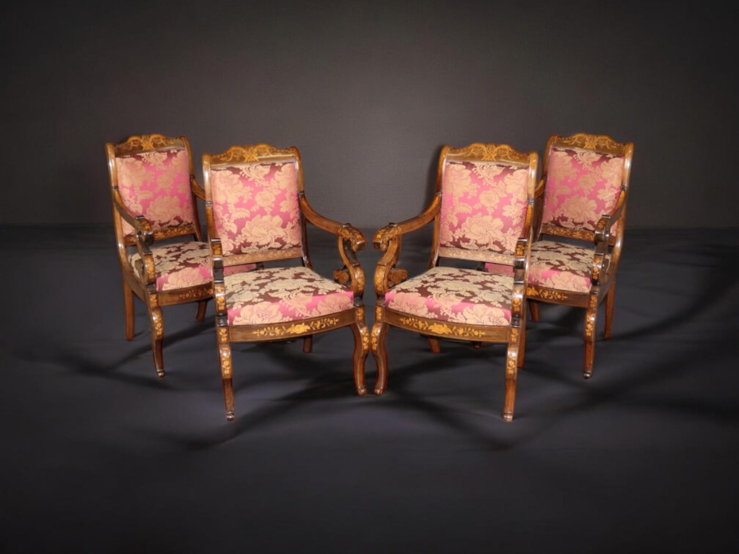 This set of 4 vintage Dutch marquetry inlaid armchairs is made with immense detail and of the highest quality! If you look at the photos provided, you’ll see the outstanding detail in the inlay throughout the chairs! These chairs are perfect for you and your home, and will bring a sense of luxury and sophistication into your home or place of choosing! These chairs can be used as dining room chairs, kitchen chairs or even accent chairs in your living room or office. Antique furniture and vintage pieces have stood the test of time and this set of chairs is no exception! With their quality materials and great craftsmanship this set is bound to last you and your family for many years to come. The chairs are in good vintage condition with light surface scratches and minor finish loss. No Significant imperfections to note. The upholstery appears to be in good condition, but may show minor signs of wear.