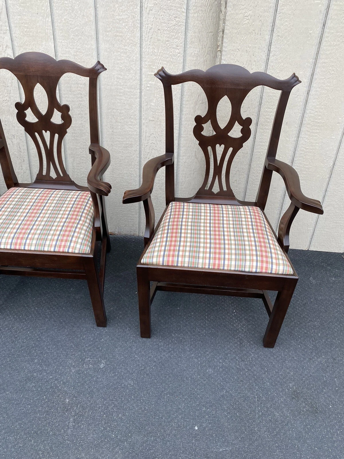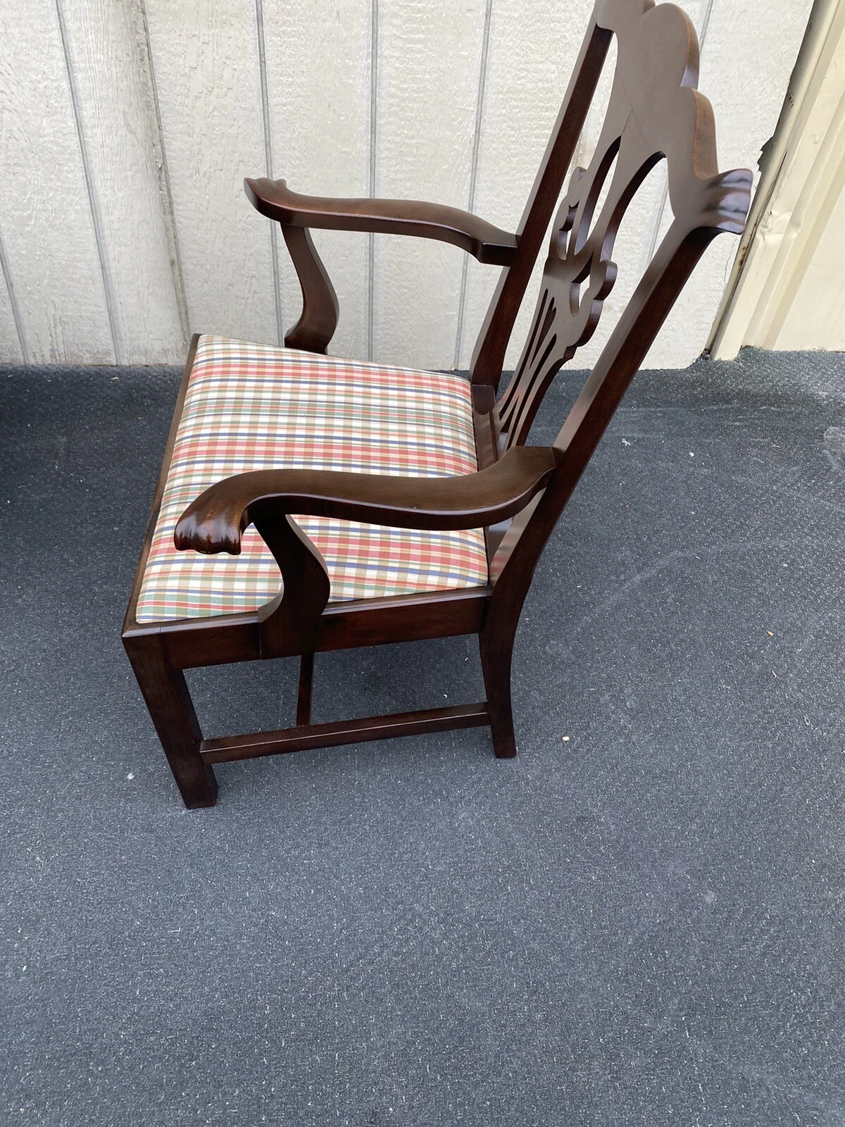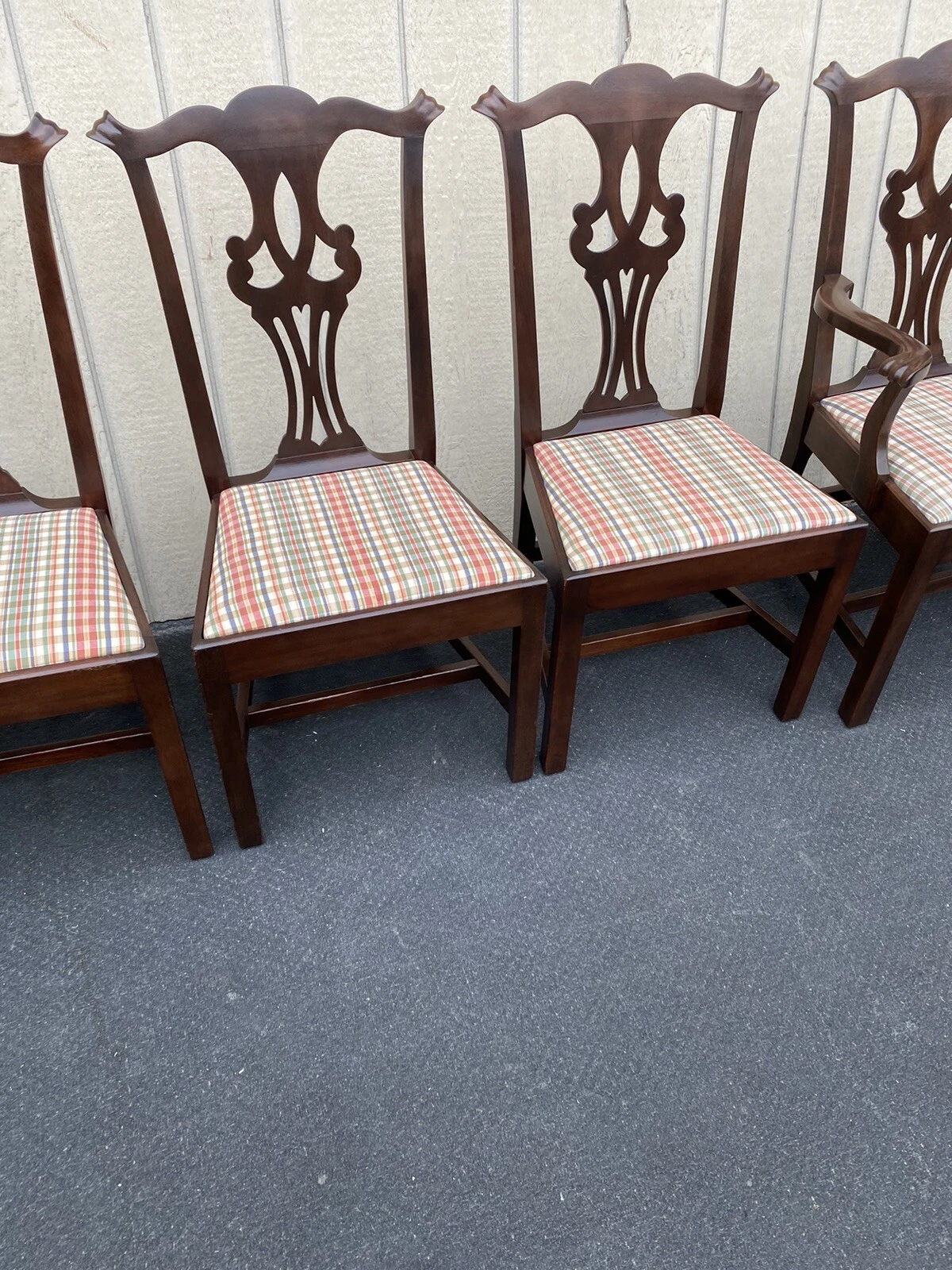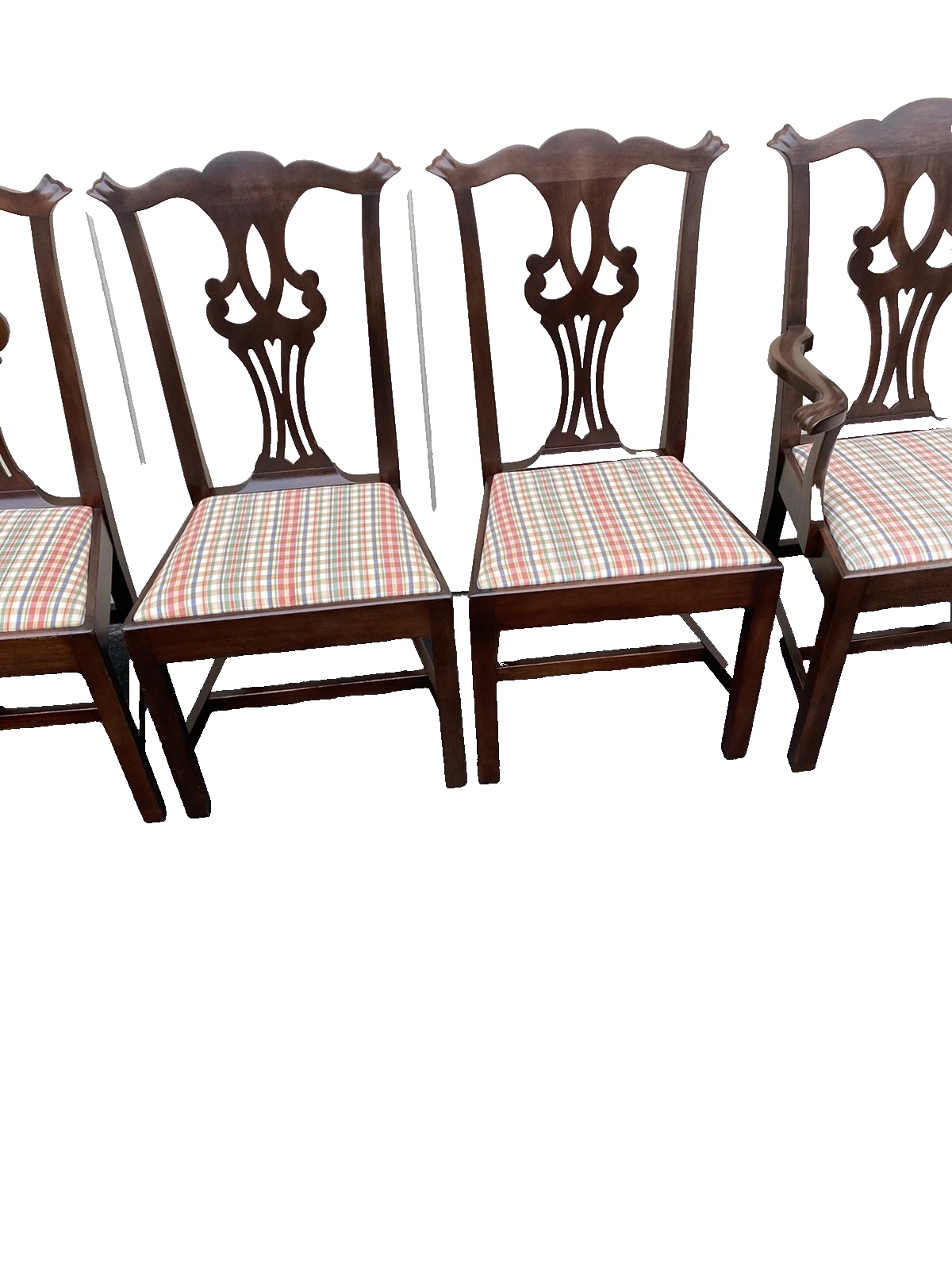 This exquisite set of six solid mahogany dining chairs embodies the timeless elegance of the Chippendale style, dating back to the 1920s. Each chair showcases the rich, warm tones of mahogany, beautifully highlighting the intricate craftsmanship that defines this era. With their sturdy construction and graceful lines, these chairs not only provide comfort but also bring a touch of history to your dining room. Their inviting presence encourages cherished gatherings and shared meals, making them a perfect addition to any family home.
