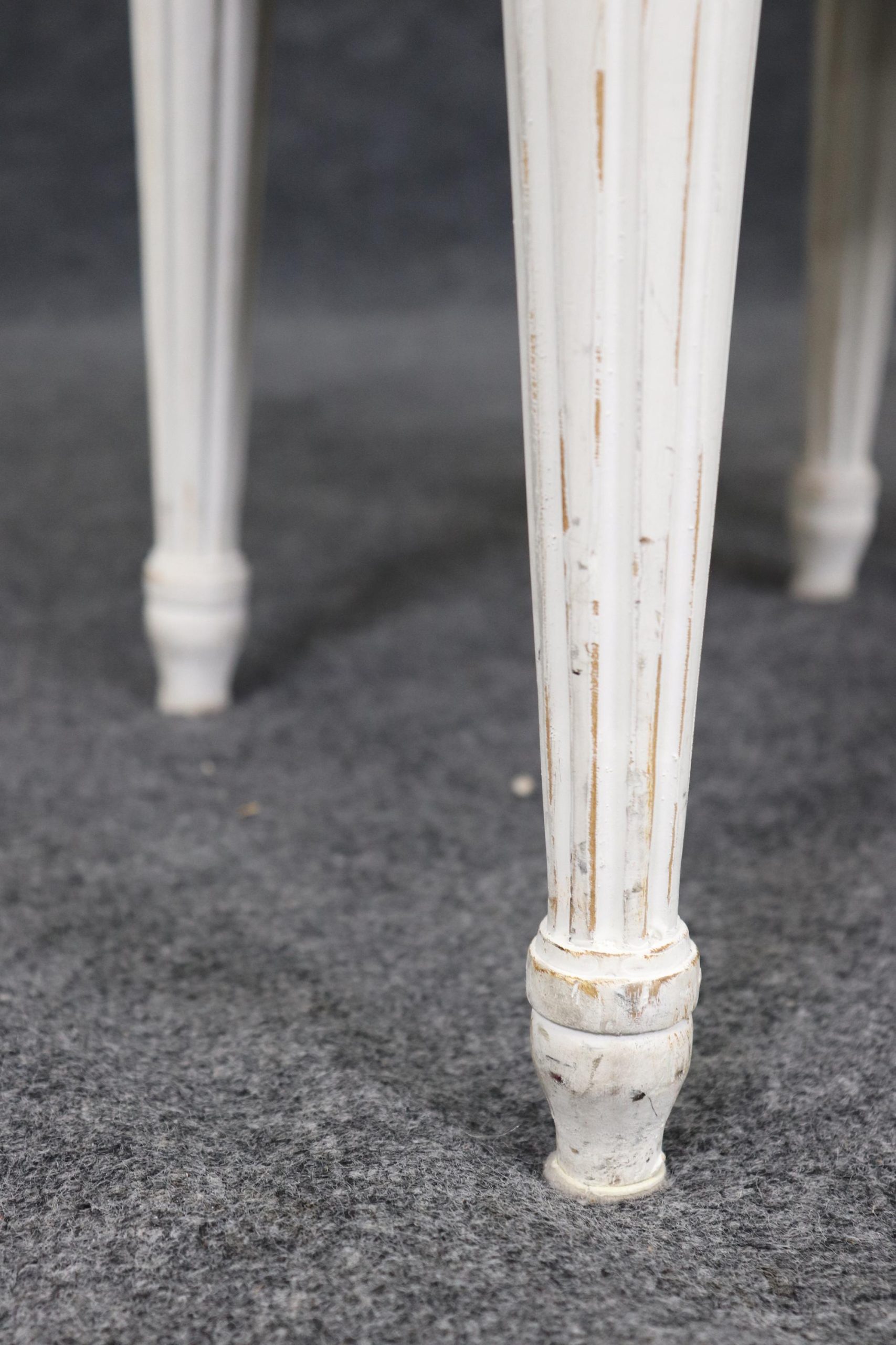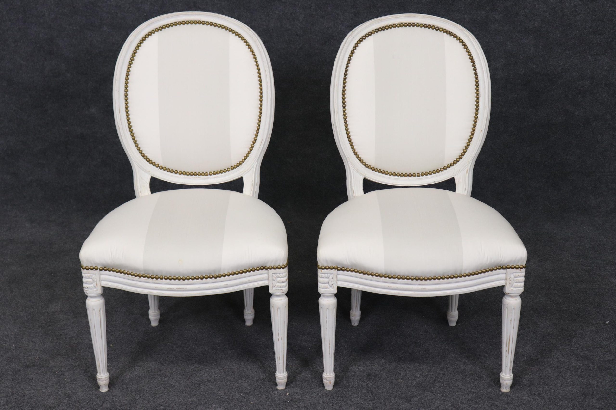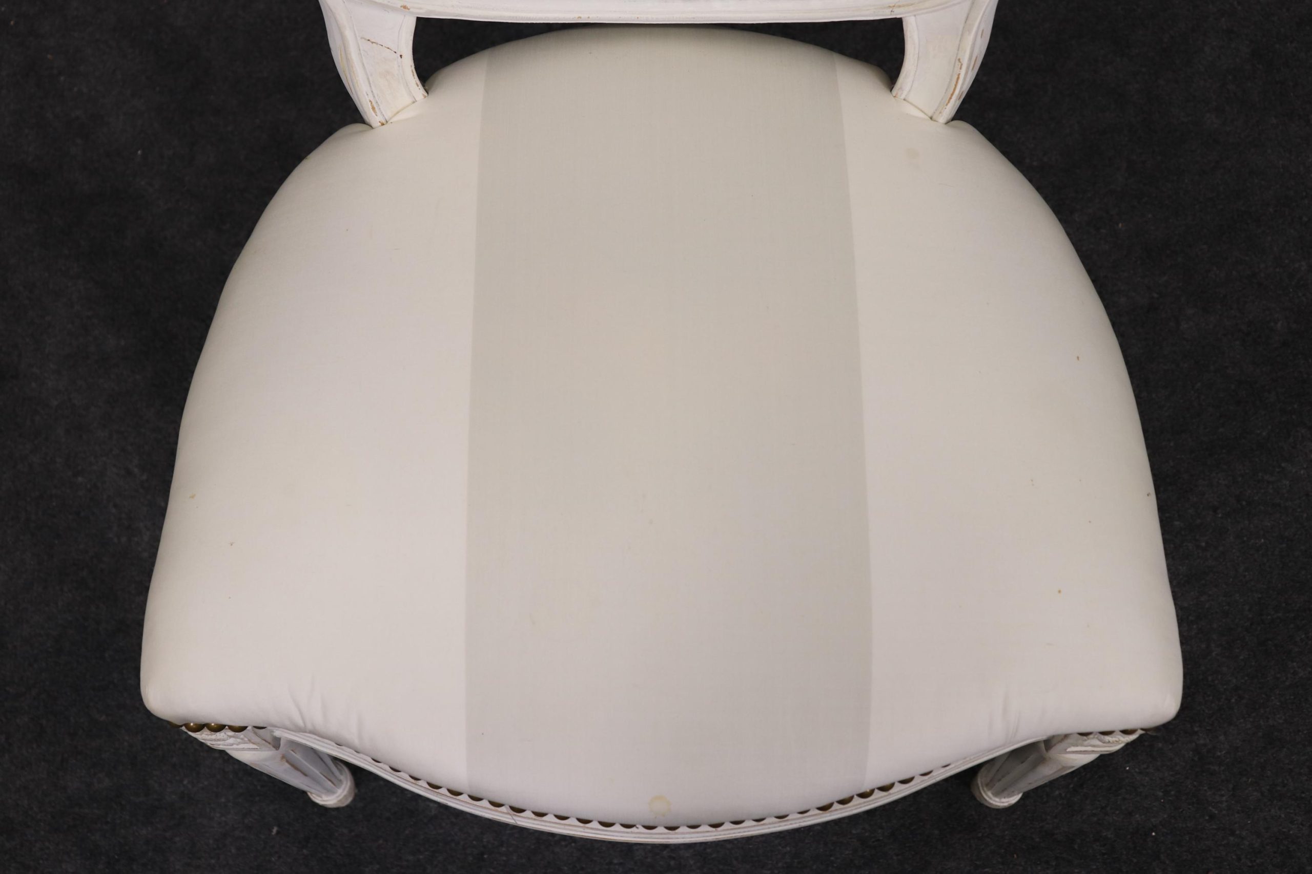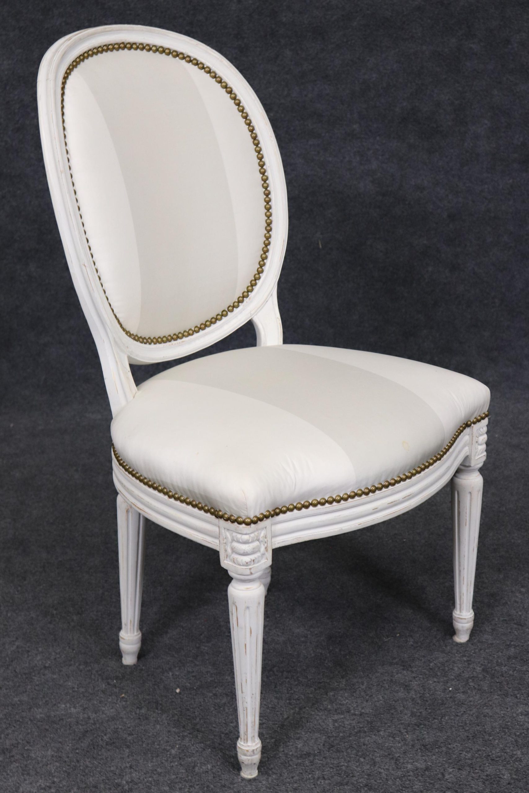 This vintage set of 8 Louis XVI style paint decorated dining room side chairs is of the highest quality! These chairs are perfect for you and your home and will bring a sense of luxury and sophistication into your dining room, office or place of choosing! These chairs can be used as dining room chairs, conference chairs or as kitchen chairs. If you look closely at the photos provided, you will see the attention to detail within the nicely done carved frames as well as the luxurious upholstery. One really nice aspect of these chairs in particular is their capability to be paired with a variety of other styles you may already have in your home. Antique furniture and vintage pieces have stood the test of time and this set of chairs is no exception. With their quality materials and great craftsmanship this set is bound to last you and your family for many years to come. The chairs are in good vintage condition with light surface scratches and minor finish loss. The upholstery does show signs of wear and staining.