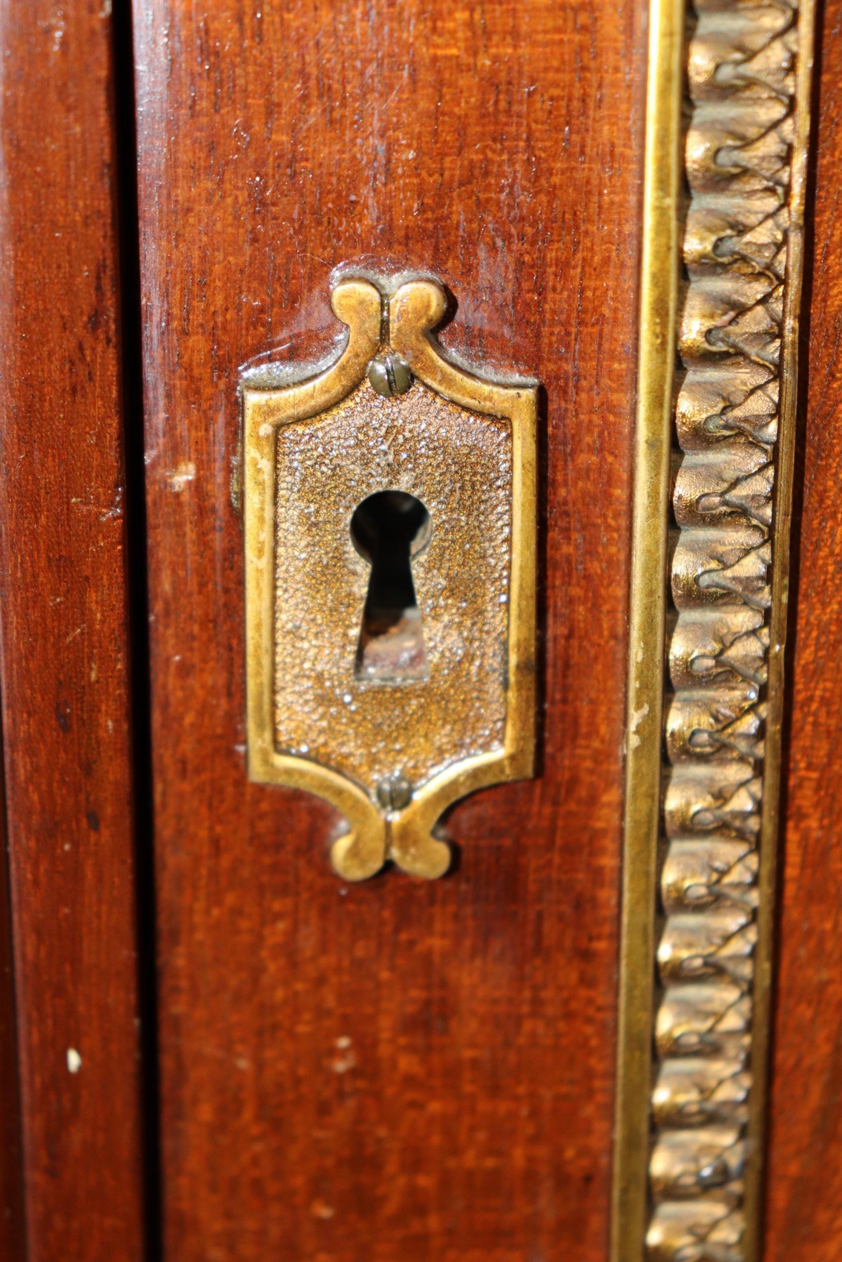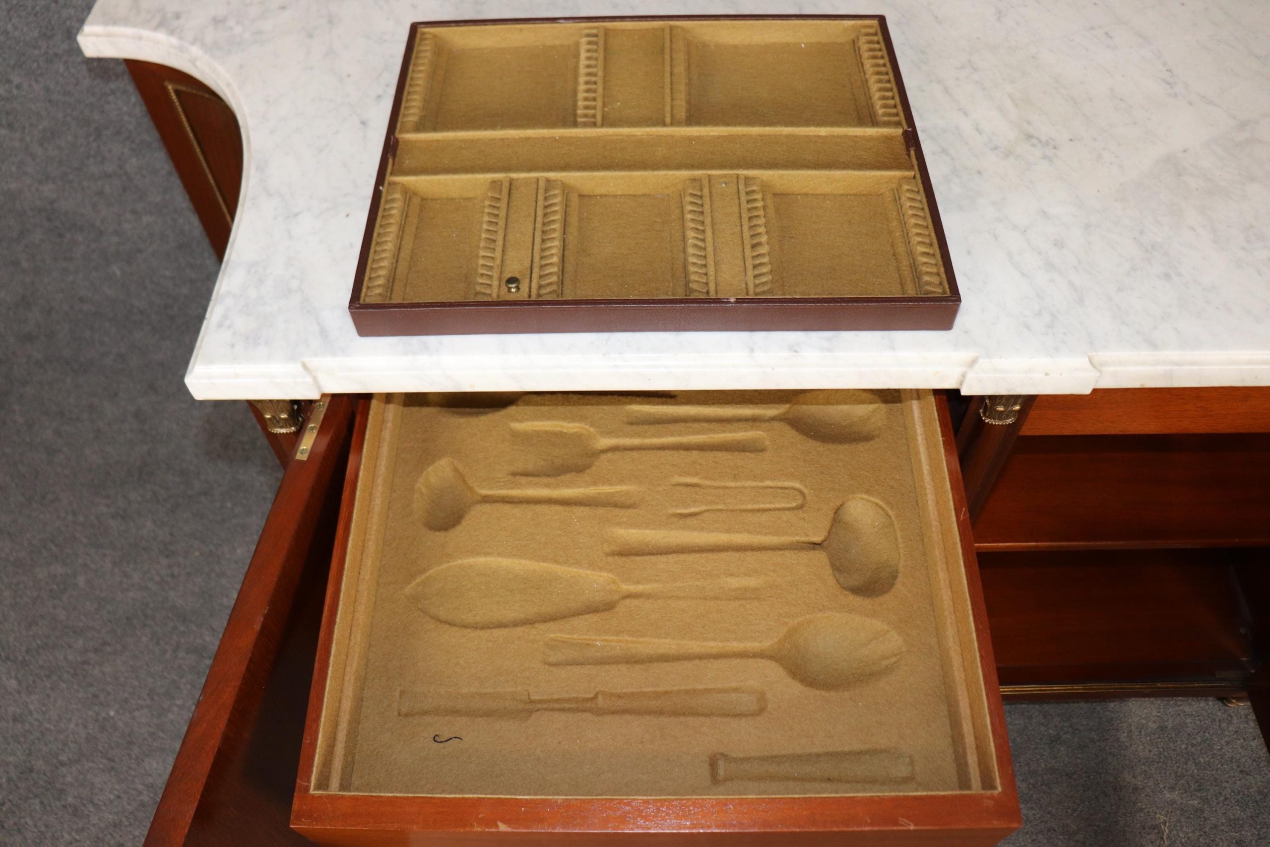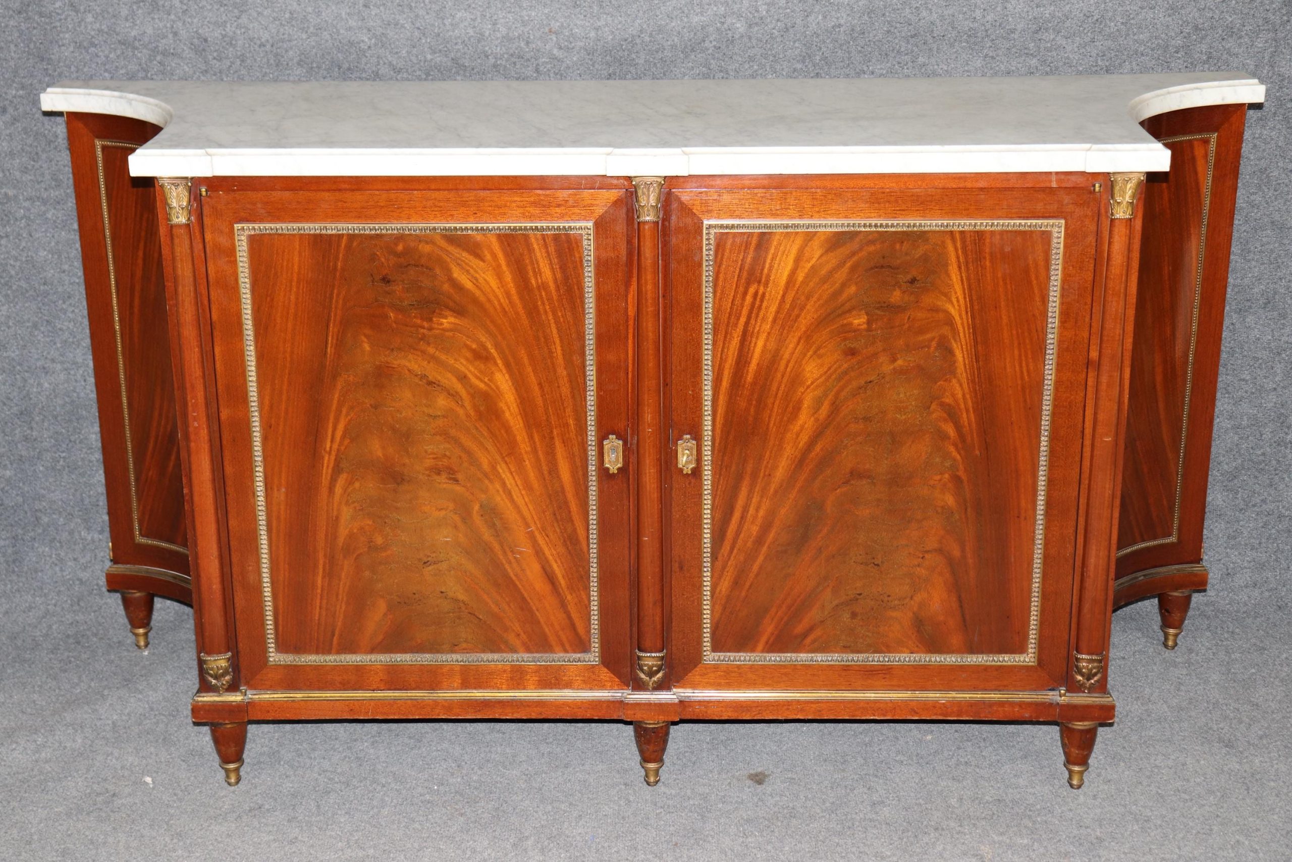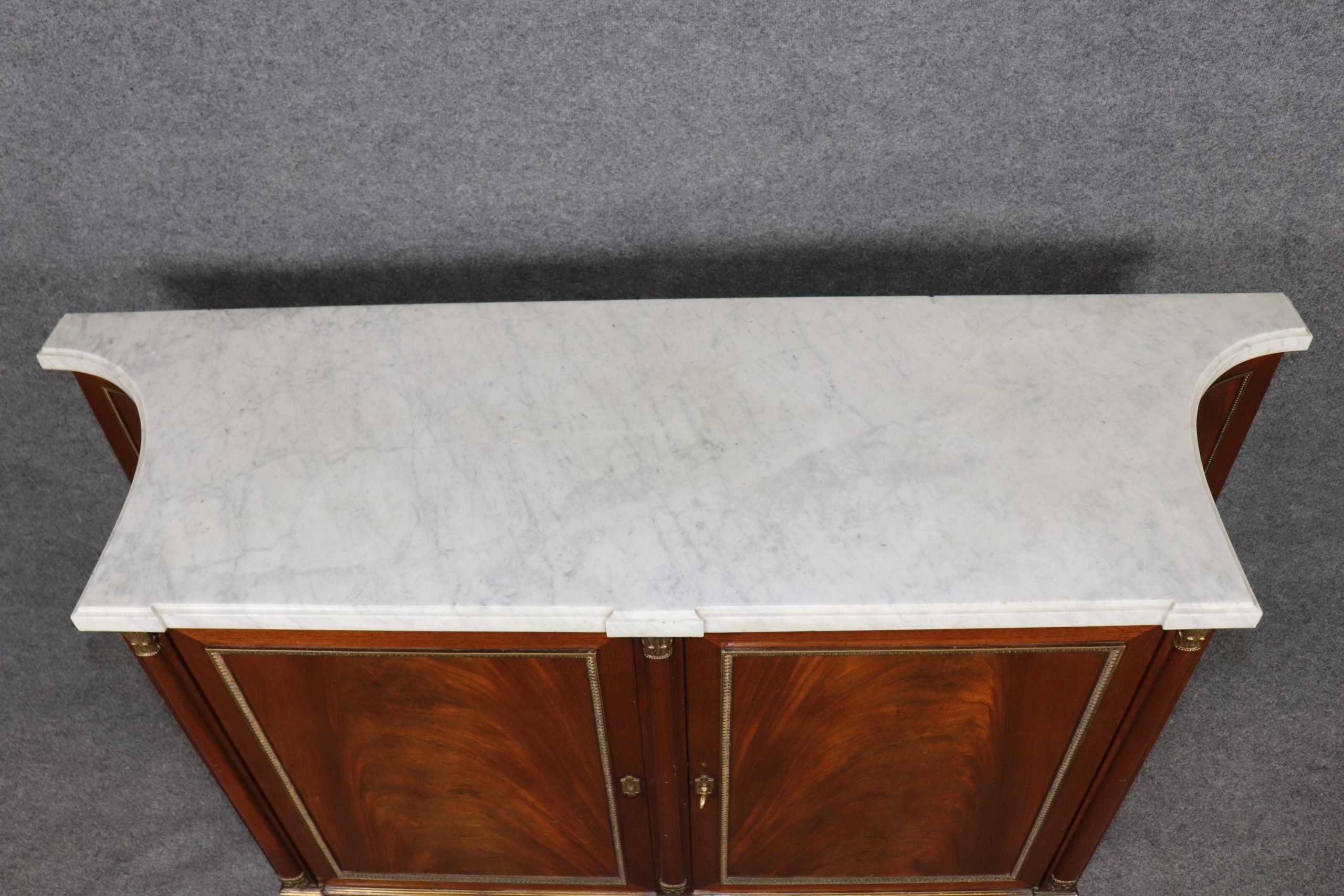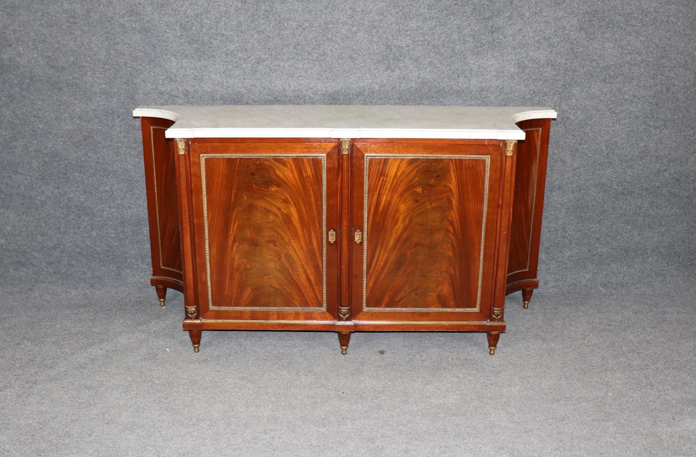 This signed Maison Jansen Louis XVI Directoire style marble top sideboard buffet is made of the highest quality and is bound to bring a sense of class and luxury into your home or place of choosing! Maison Jansen was a Paris-based interior decoration office founded in 1880 by Dutch-born Jean-Henri Jansen. Jansen is considered the first truly global design firm. This sideboard is equipped with an exceptional marble top. This piece has 2 doors that contain 2 drawers and 2 shelves, perfect for storing away your personal belongings! One nice thing about this piece is that it has fitted drawers for utensils. This is an item that will surely be a topic of conversation at your next gathering or event and will without a doubt separate your home from all of your friends and family. Antique furniture and vintage pieces have stood the test of time and this sideboard is no exception. With its quality materials and great craftsmanship this is bound to last you and your family for many years to come. This piece is in good antique condition with the exception of some light surface scratches and some minor finish loss as to be expected with an item of this age, but otherwise good condition.