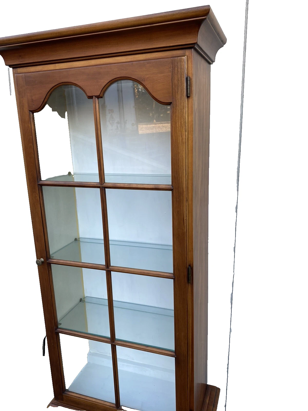 This exquisite Solid Cherry Curio Cabinet by Statton embodies timeless craftsmanship and traditional elegance, making it a cherished addition to any home. With its rich cherry finish, intricate detailing, and sturdy construction, this piece showcases the skill of American artisans from the post-1950 era. The cabinet features three spacious shelves and two drawers, perfect for displaying your treasured collectibles while providing functional storage. Its warm, inviting character is sure to enhance your living space, inviting stories and memories to be shared for generations.