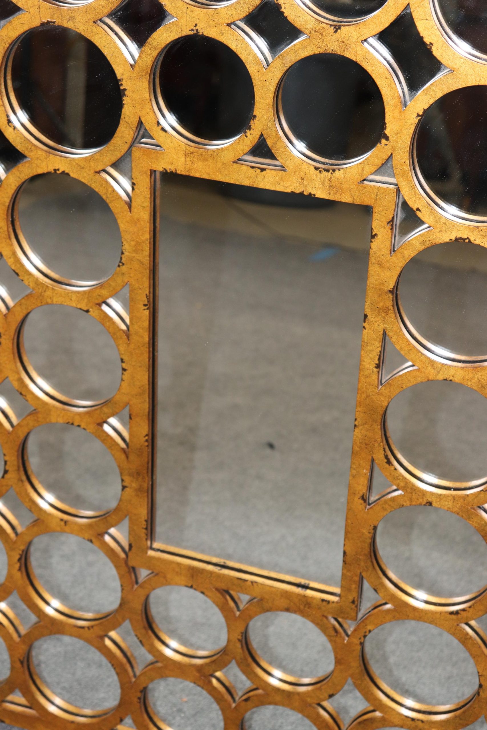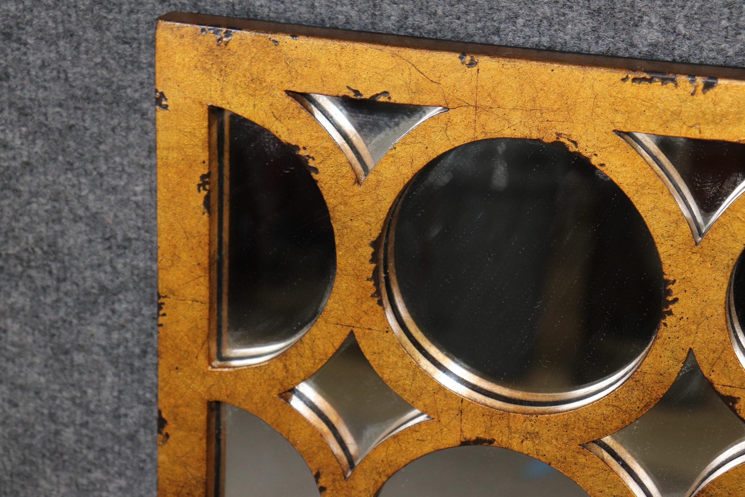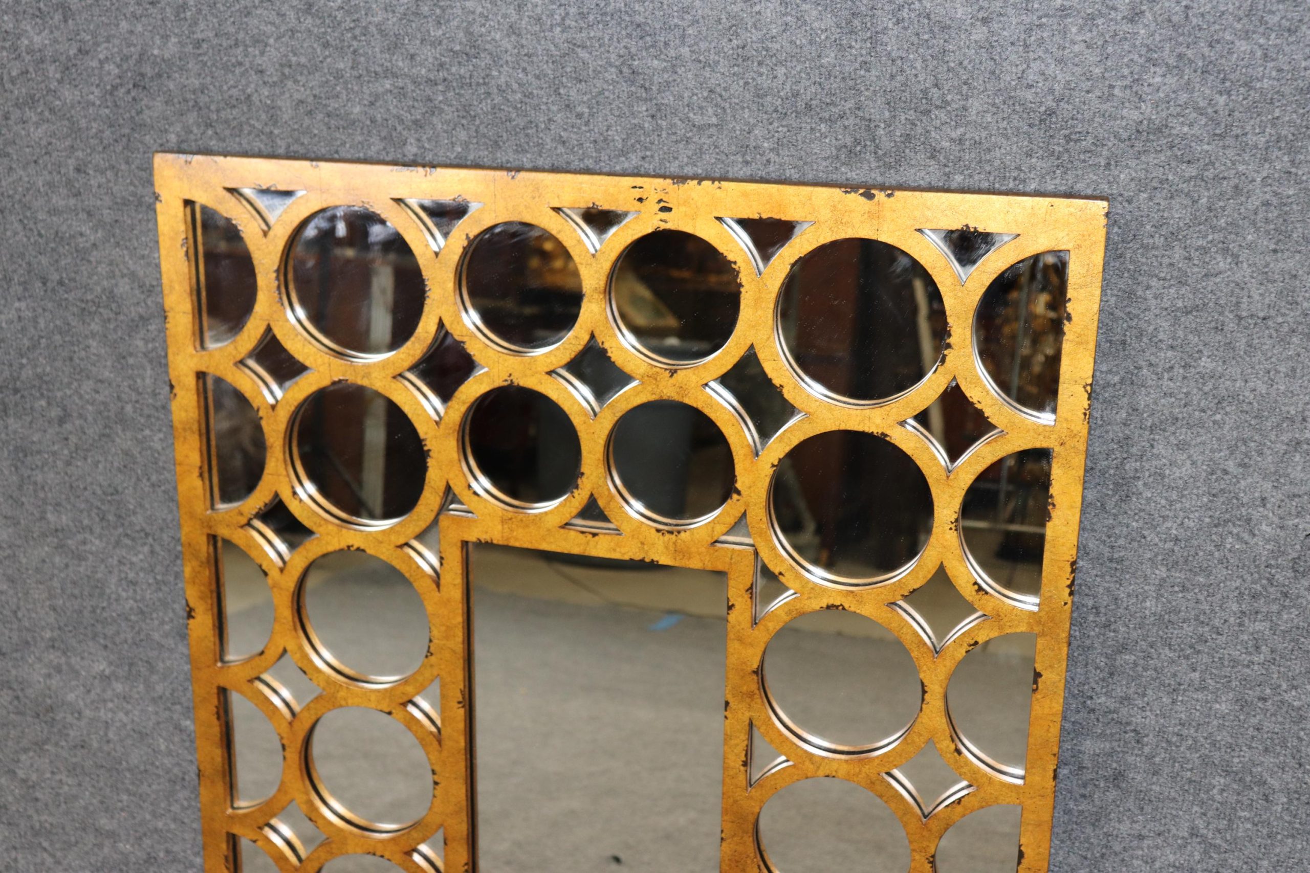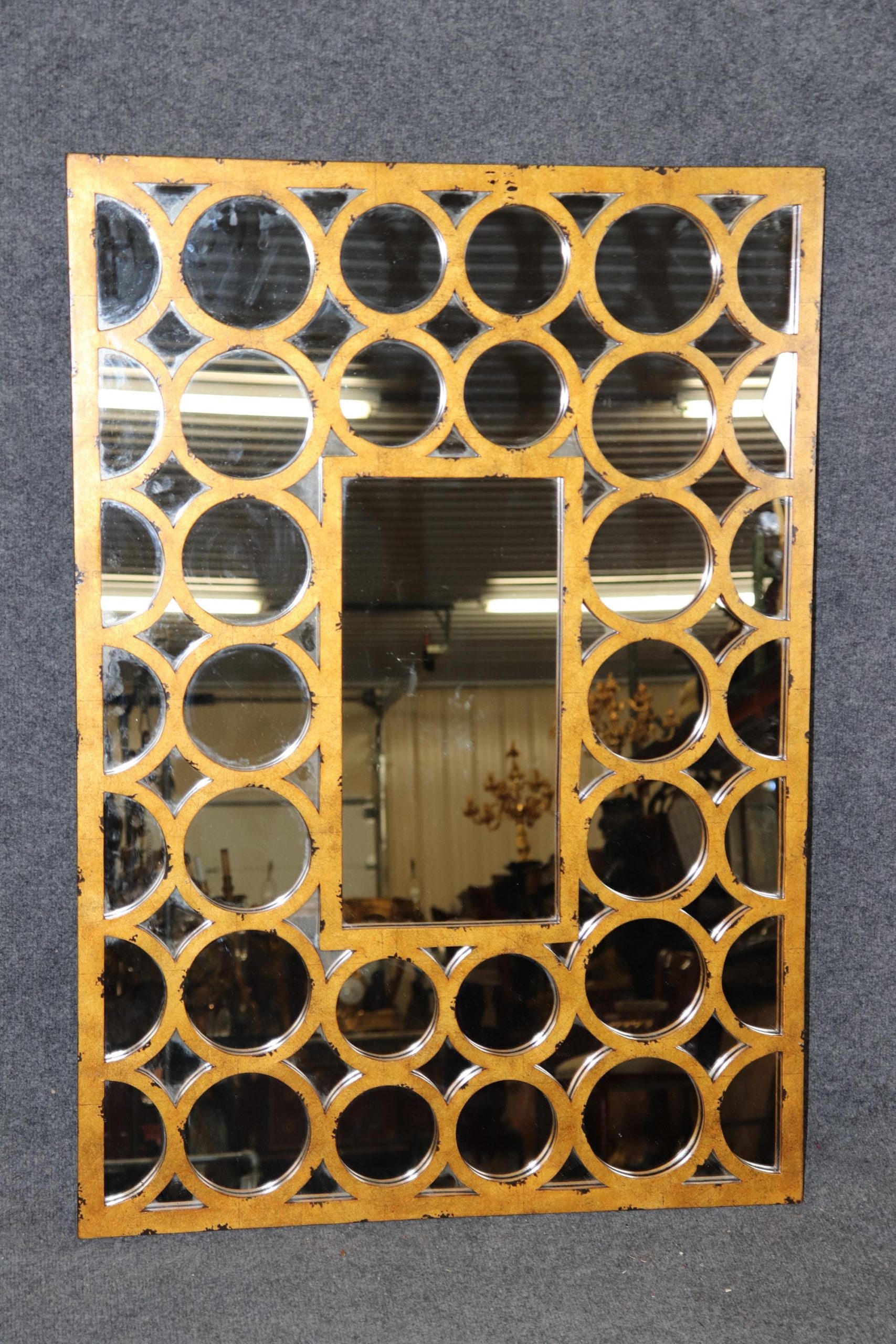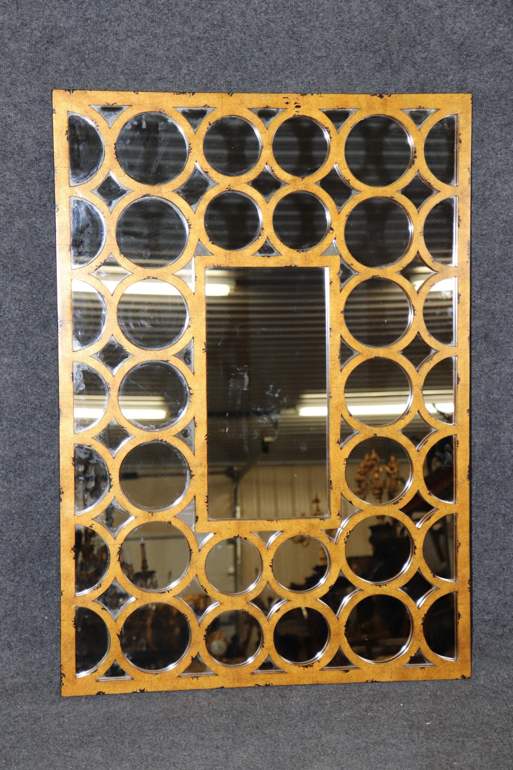 This beautifully designed mirror features a richly distressed gold finish, lending the piece an aged, vintage charm while enhancing its reflective appeal. The rectangular frame is adorned with gently molded contours and subtle architectural lines, reminiscent of French neoclassical and regency-era influences. The combination of clean symmetry and ornate patina creates a truly versatile statement piece that is both refined and theatrical—hallmarks of the Hollywood Regency aesthetic. The piece is in good vintage condition with the exception of some light surface scratches, Minor finish loss and normal age related wear. As to be expected with items of age and use.