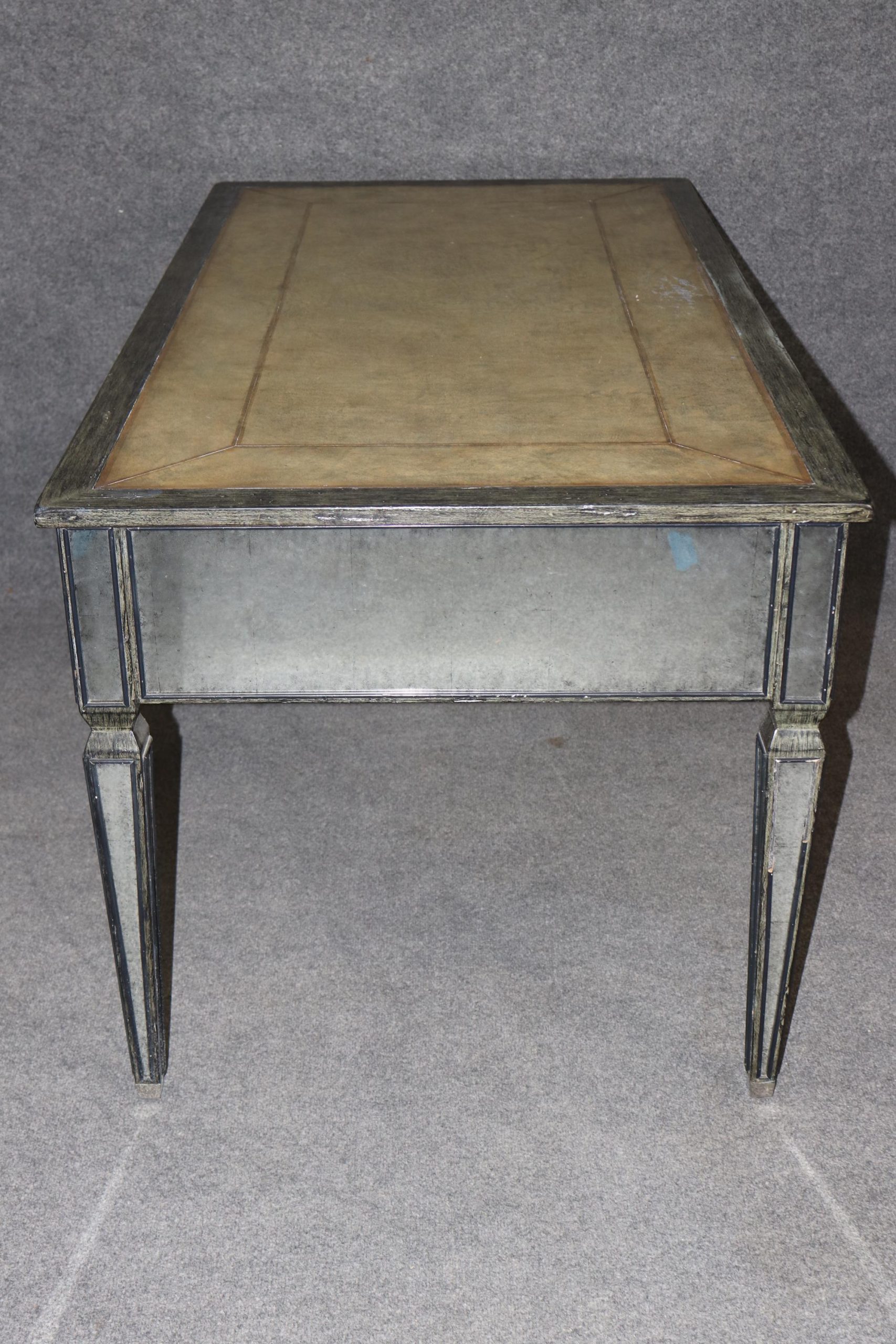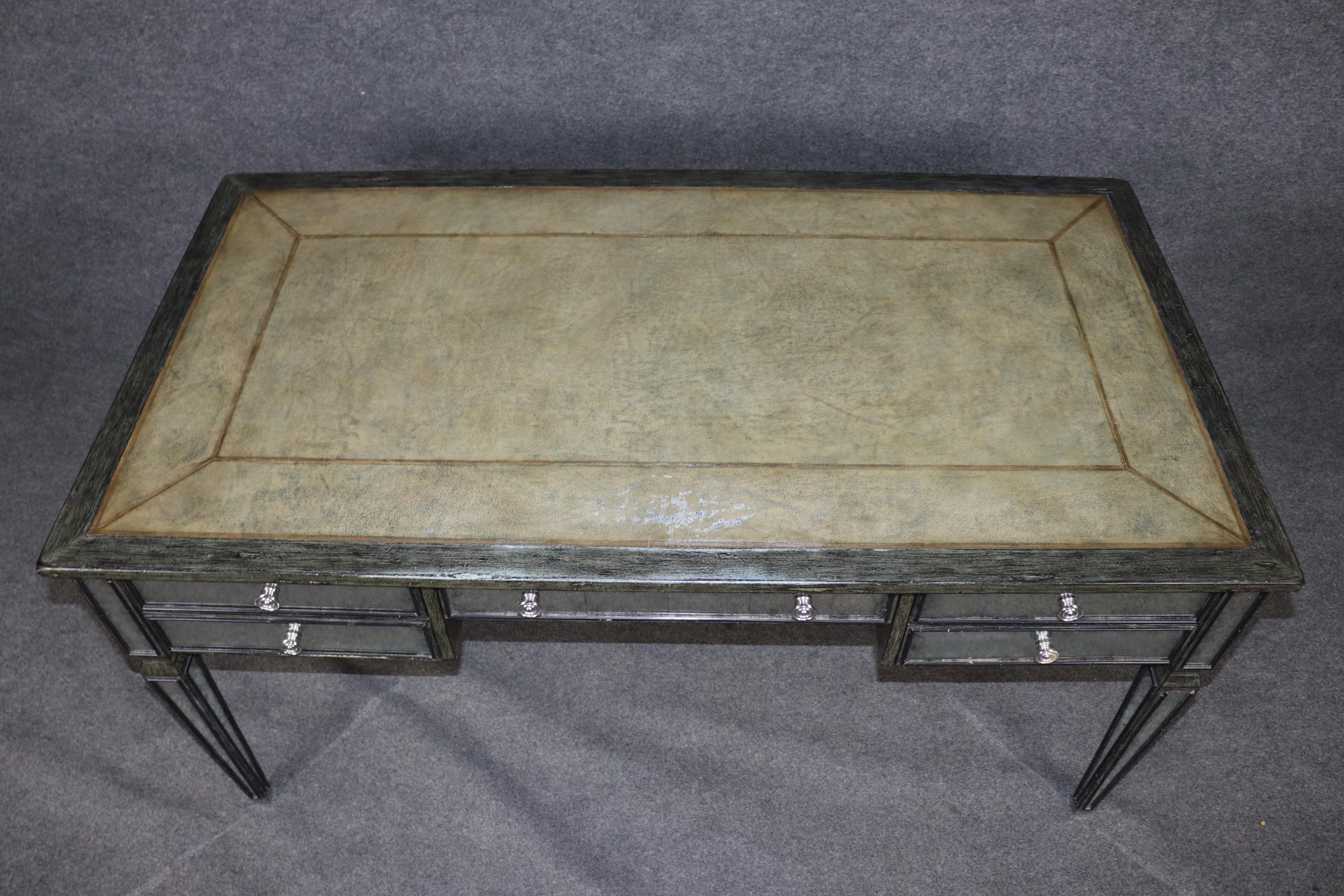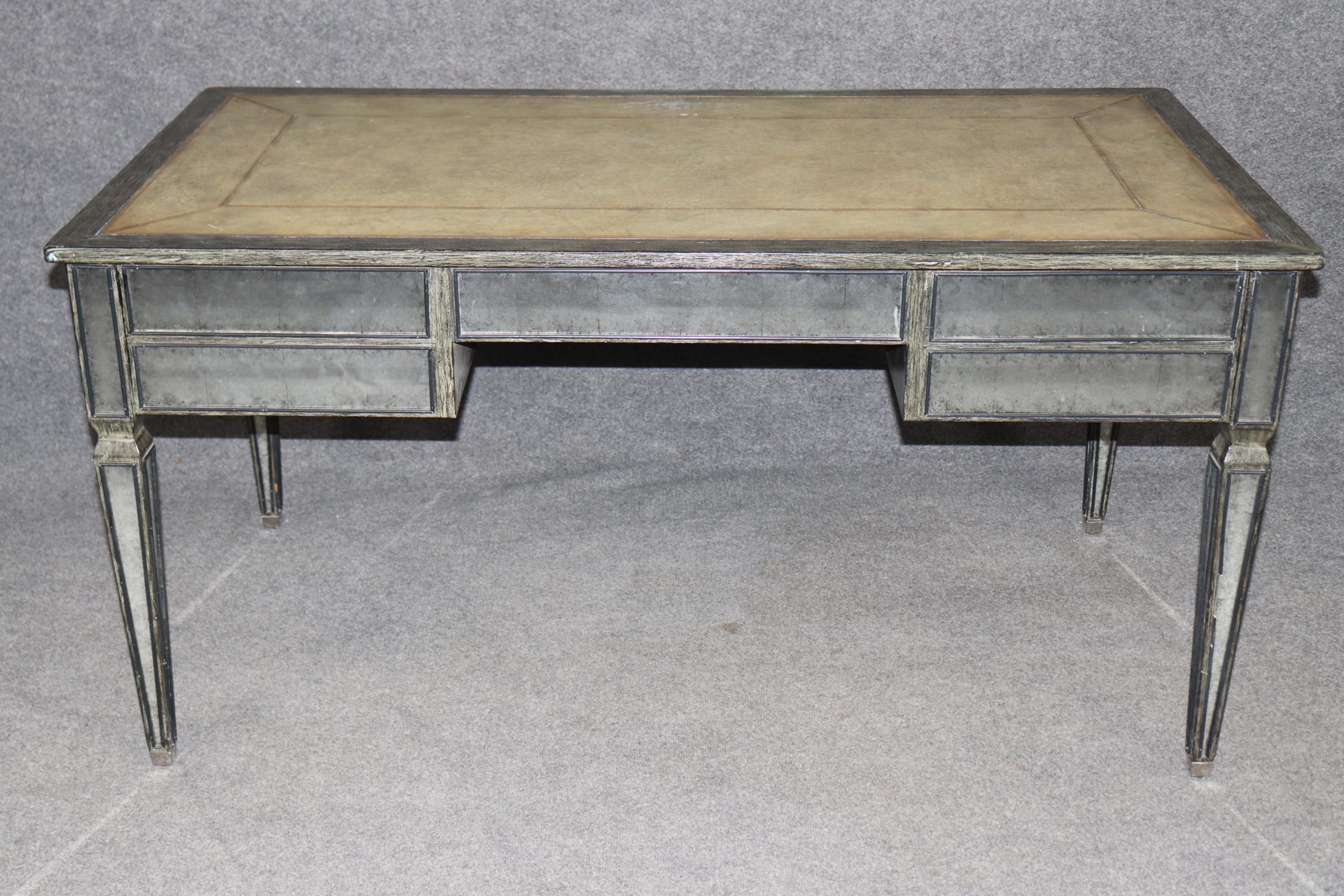 The standout feature of this desk is its églomisé mirrored panels, which adorn the drawer fronts and side panels. These Silver leafed reverse-glass details lend a subtle, luminous quality to the piece, reflecting light in a way that adds depth and sophistication to any room. The leather inset top, framed with delicate embossed tooling, offers both a refined writing surface and a tactile contrast to the gleaming mirrored elements.