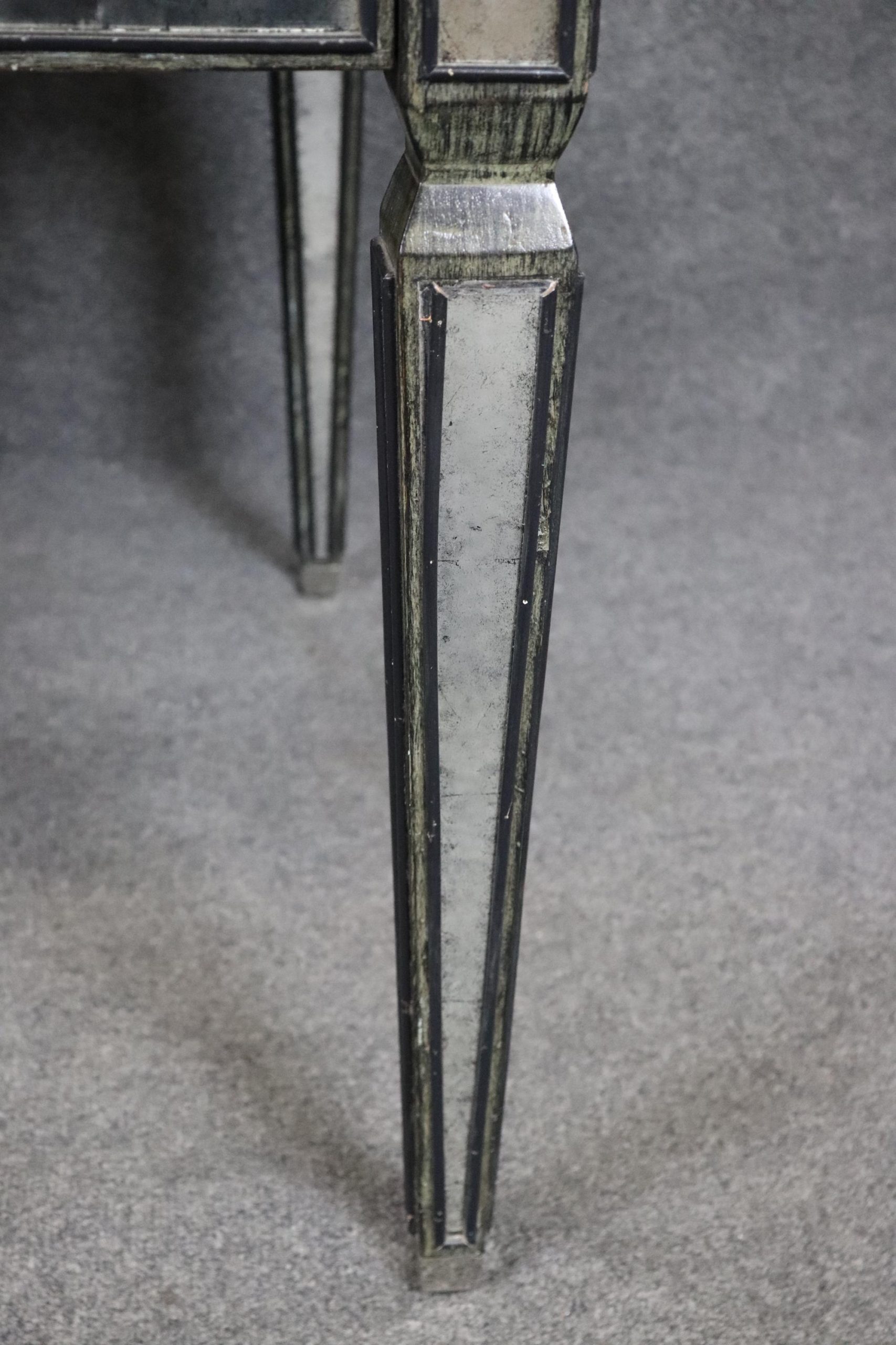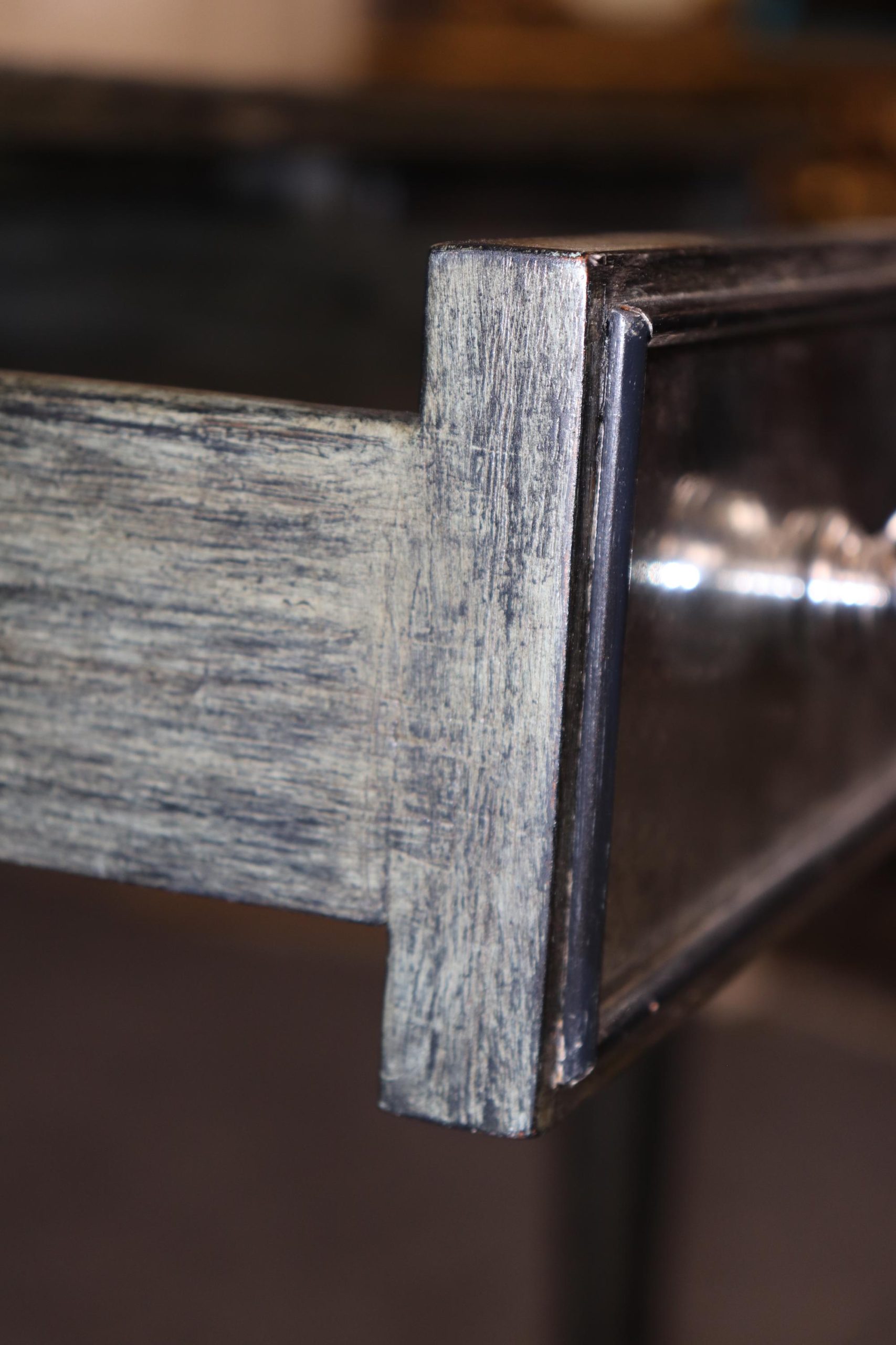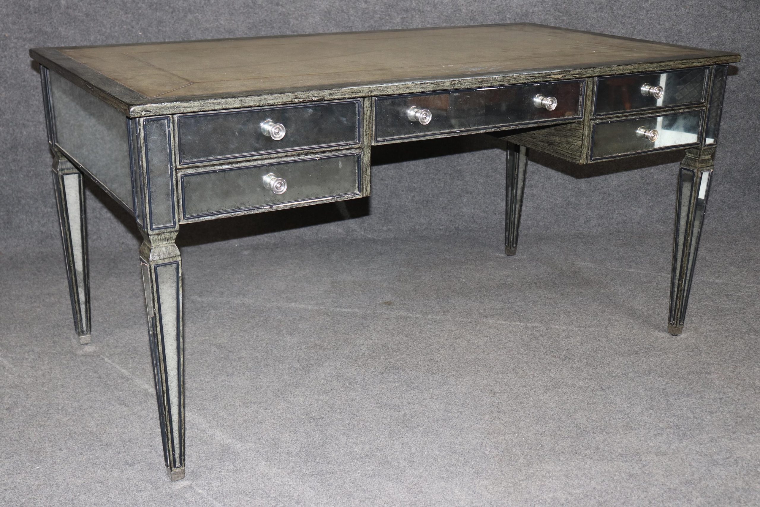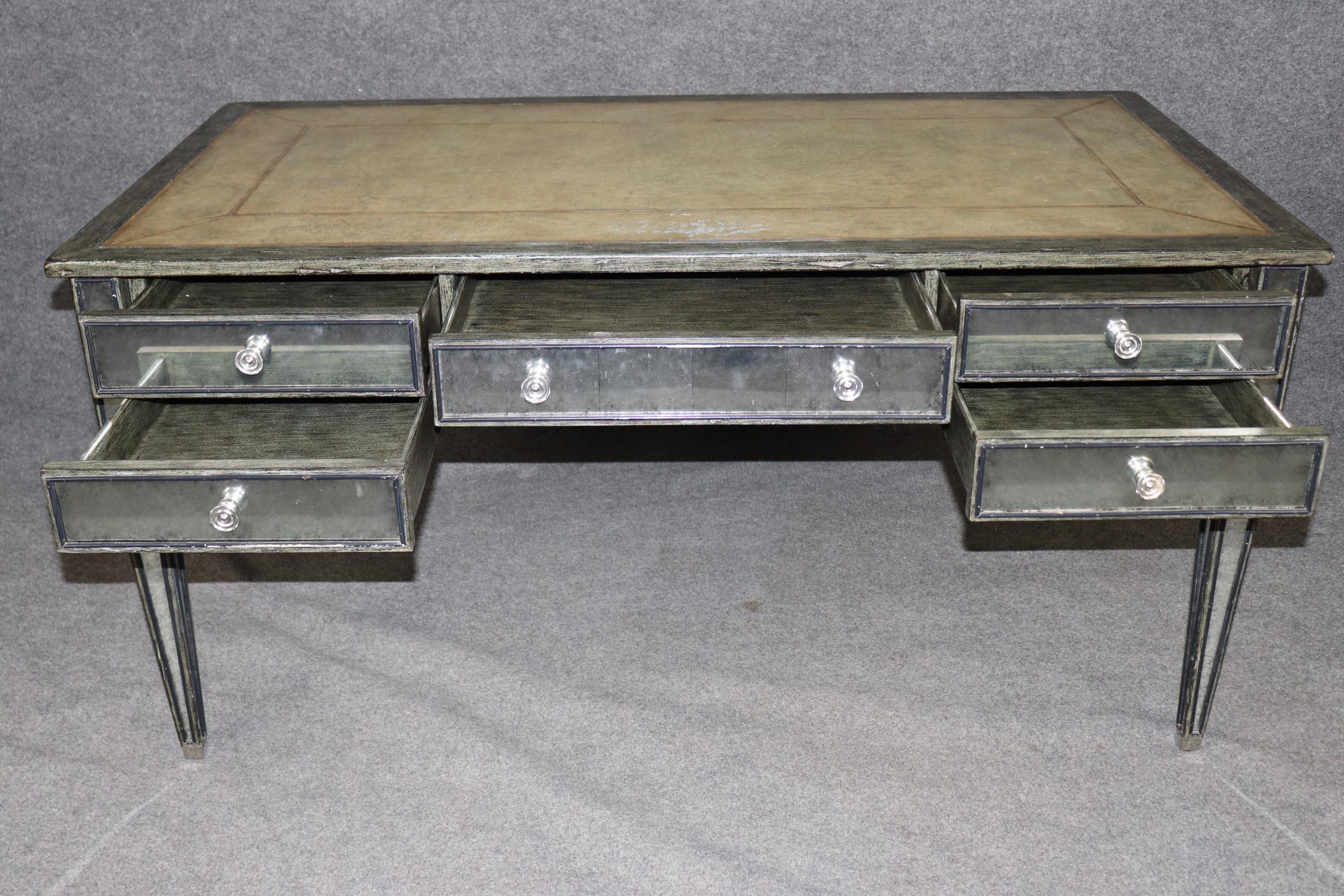 The standout feature of this desk is its églomisé mirrored panels, which adorn the drawer fronts and side panels. These Silver leafed reverse-glass details lend a subtle, luminous quality to the piece, reflecting light in a way that adds depth and sophistication to any room. The leather inset top, framed with delicate embossed tooling, offers both a refined writing surface and a tactile contrast to the gleaming mirrored elements.
