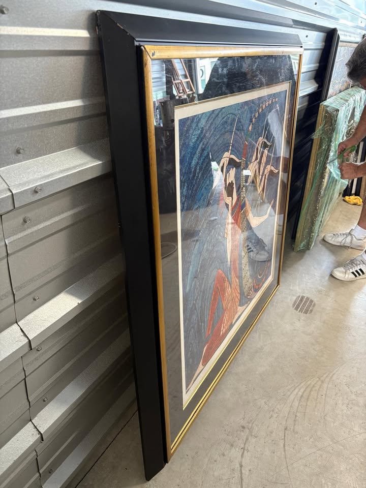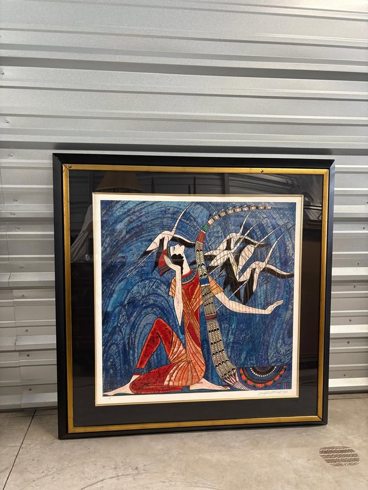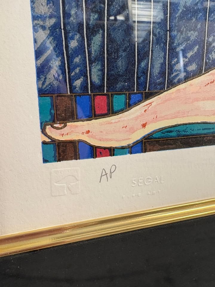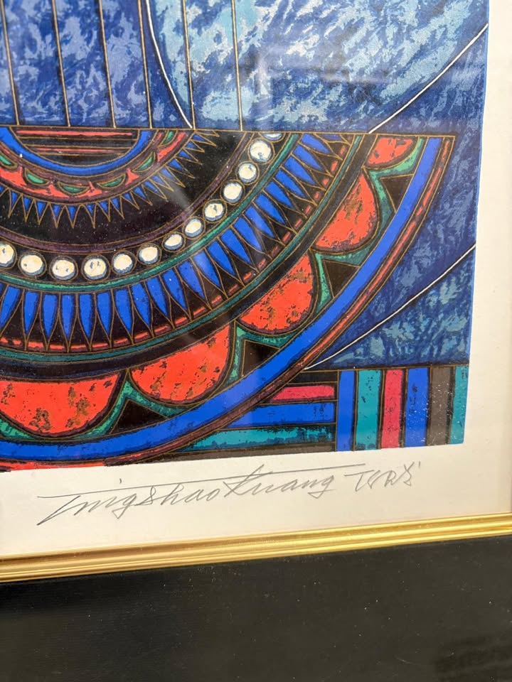 Rendered in brilliant blues, reds, and golds, the piece depicts a stylized seated figure surrounded by flowing, abstracted forms. Ting’s signature linear detailing and bold color blocking give the work a jewel-like vibrancy that immediately draws the eye. The print is hand-signed by the artist in pencil on the lower right and embossed with the Segal Fine Artmark on the lower left, confirming authenticity. This example is particularly desirable because it is signed Artist’s Proof (AP).Condition is good. There is a minor scuff on the top left of the frame.