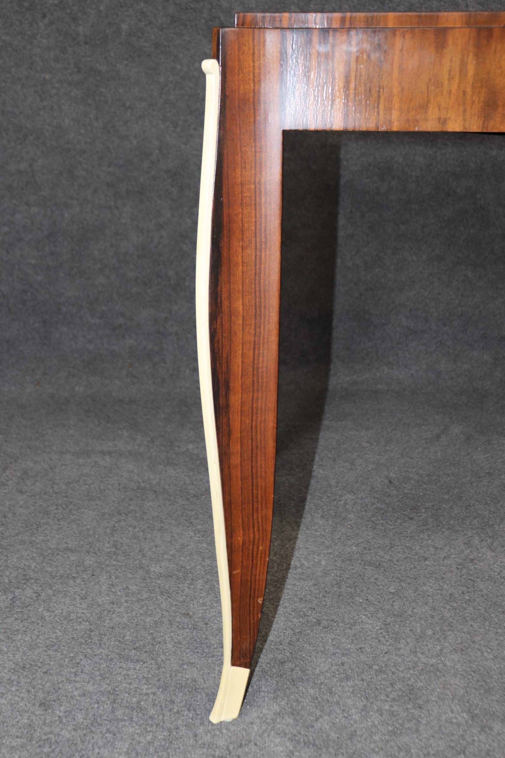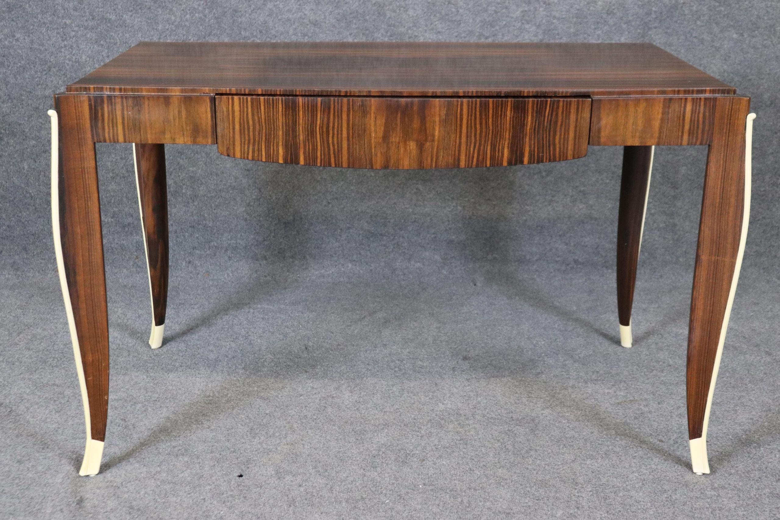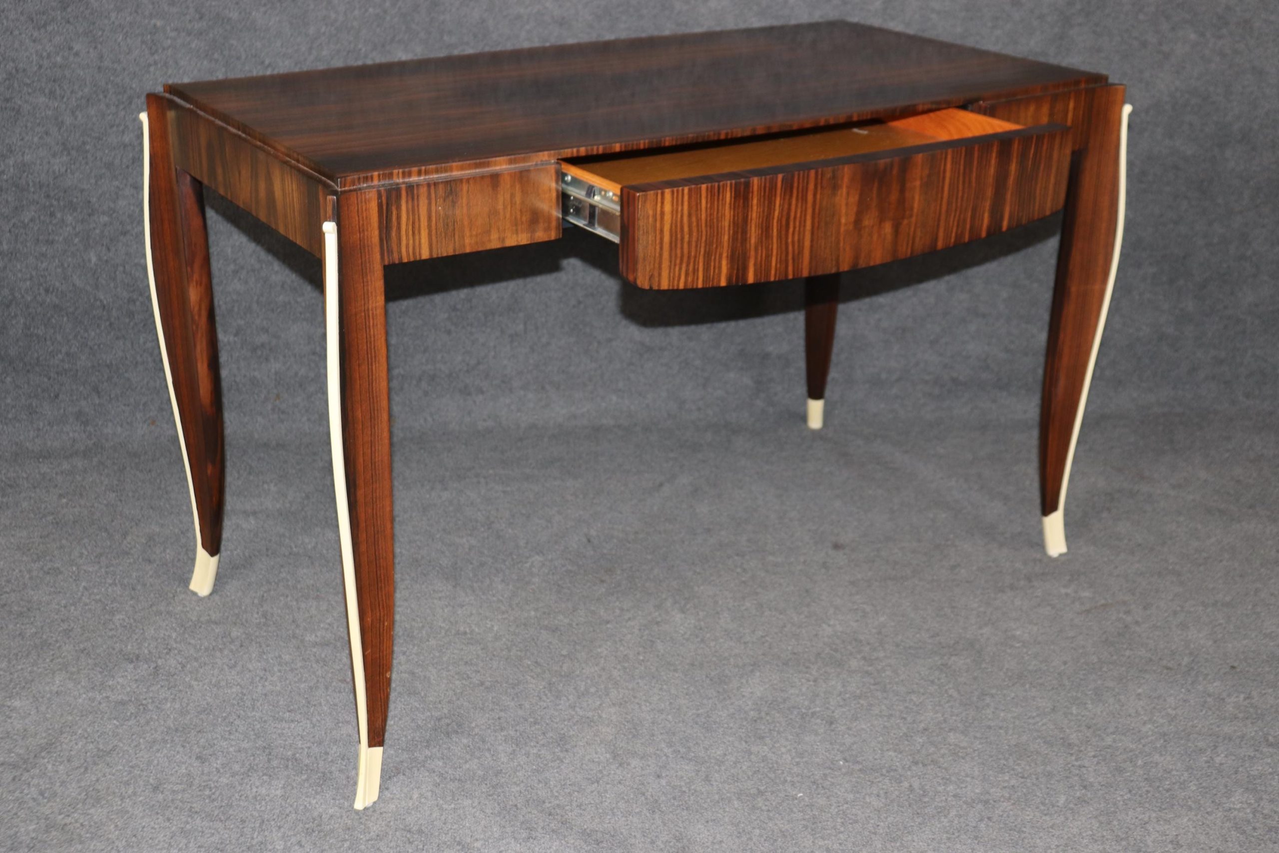 This vintage Art Deco style Rosewood writing desk, in the manner of Emile-Jacques Ruhlmann, is bound to bring a sense of sophistication and character into your home or place of choosing! This desk is equipped with 1 drawer – perfect for storing your personal belongings. Émile-Jacques Ruhlmann, was a French furniture designer and interior decorator, who was one of the most important figures in the Art Deco movement. His furniture featured sleek designs, expensive and exotic materials and extremely fine craftsmanship, and became a symbol of the luxury and modernity of Art Deco. This item is perfect for any living room, den, office, or bedroom and can be paired with a variety of other styles you may already have in your home due to its simplistic yet luxurious design! This is a piece that will have your guests mesmerized by its detail and will certainly be a conversation starter at your next gathering! The piece, overall, is in good vintage condition with light surface scratches, otherwise good condition. No significant imperfections to note.