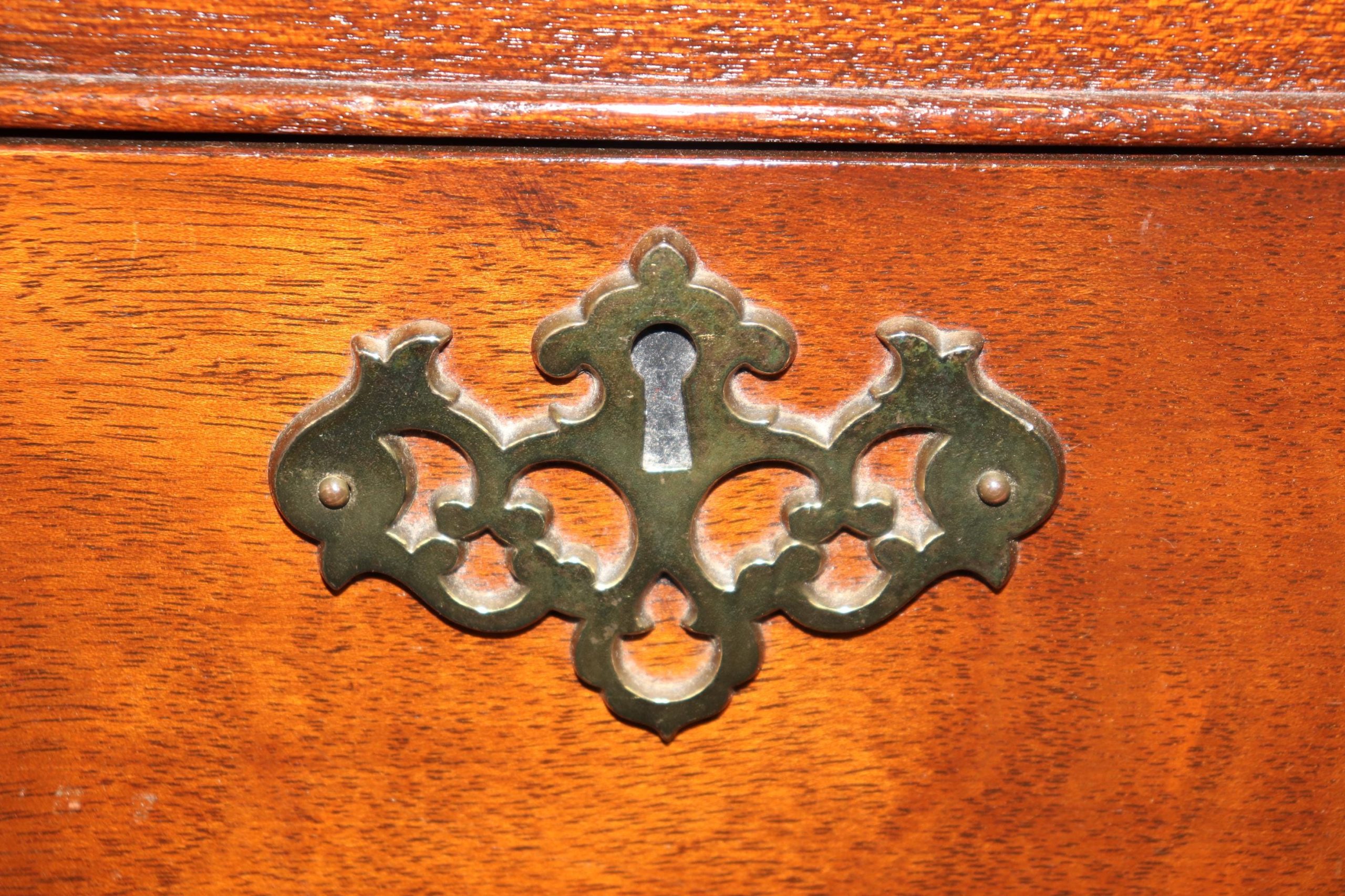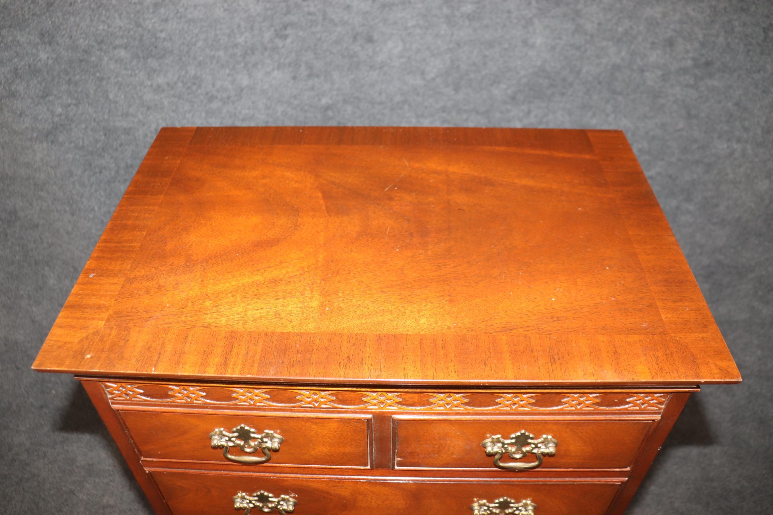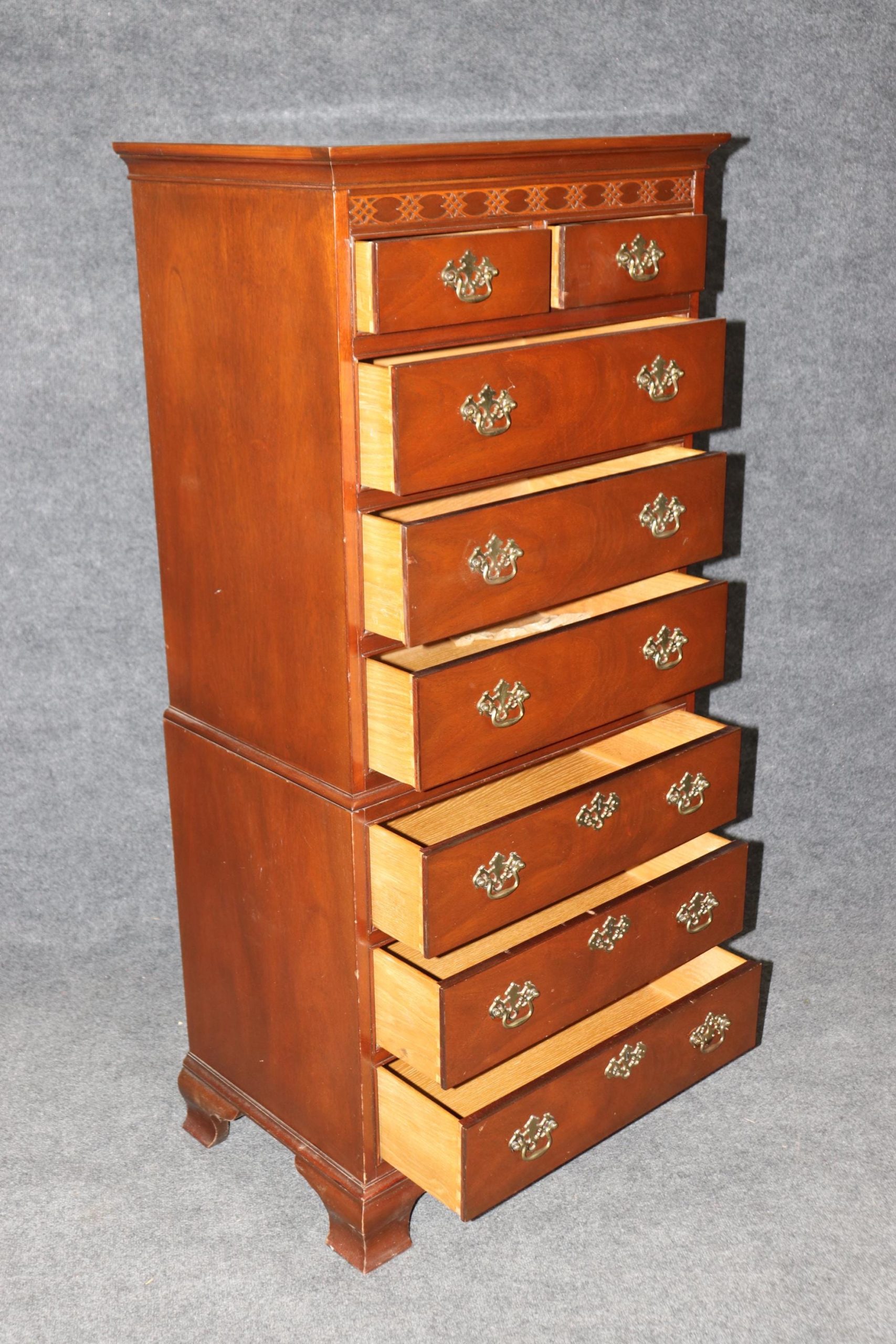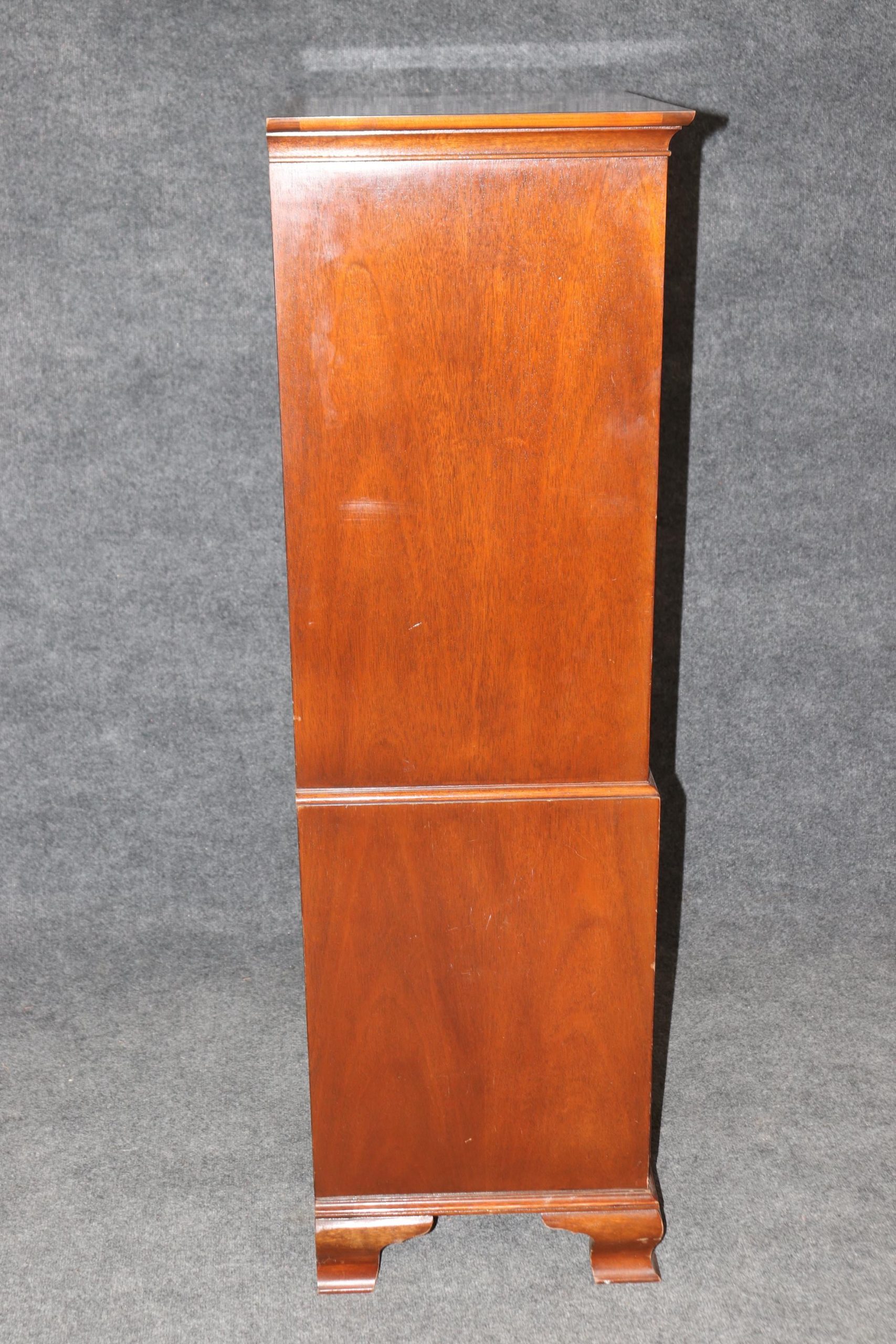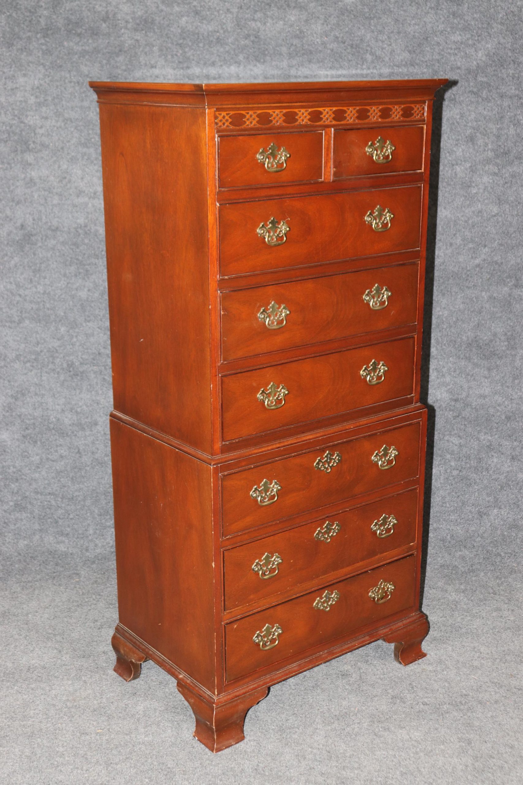This vintage Baker Furniture lingerie chest, in the Chippendale style, is made of the highest quality and is perfect for you and your home! If you look at the photos provided you will see that this piece is equipped with 8 spacious drawers, making it a perfect piece to store your belongings in and features carved accents as well as quality brass hardware. This piece is perfect to be used as bedroom furniture and is bound to bring a sense of sophistication and class into your home or place of choosing. Baker furniture has been one of the leading manufacturer’s of the late 20th and 21st century with their quality level being up to par with other companies such as Karges, Henredon, Ethan Allen and many more. Antique furniture and vintage pieces have stood the test of time and this Baker High Chest is no exception! With its quality materials and great craftsmanship this chest is bound to last you and your family for many years to come. The chest is in good vintage condition with light surface scratches and minor finish loss as to be expected of an item from the 1960’s, otherwise good condition.