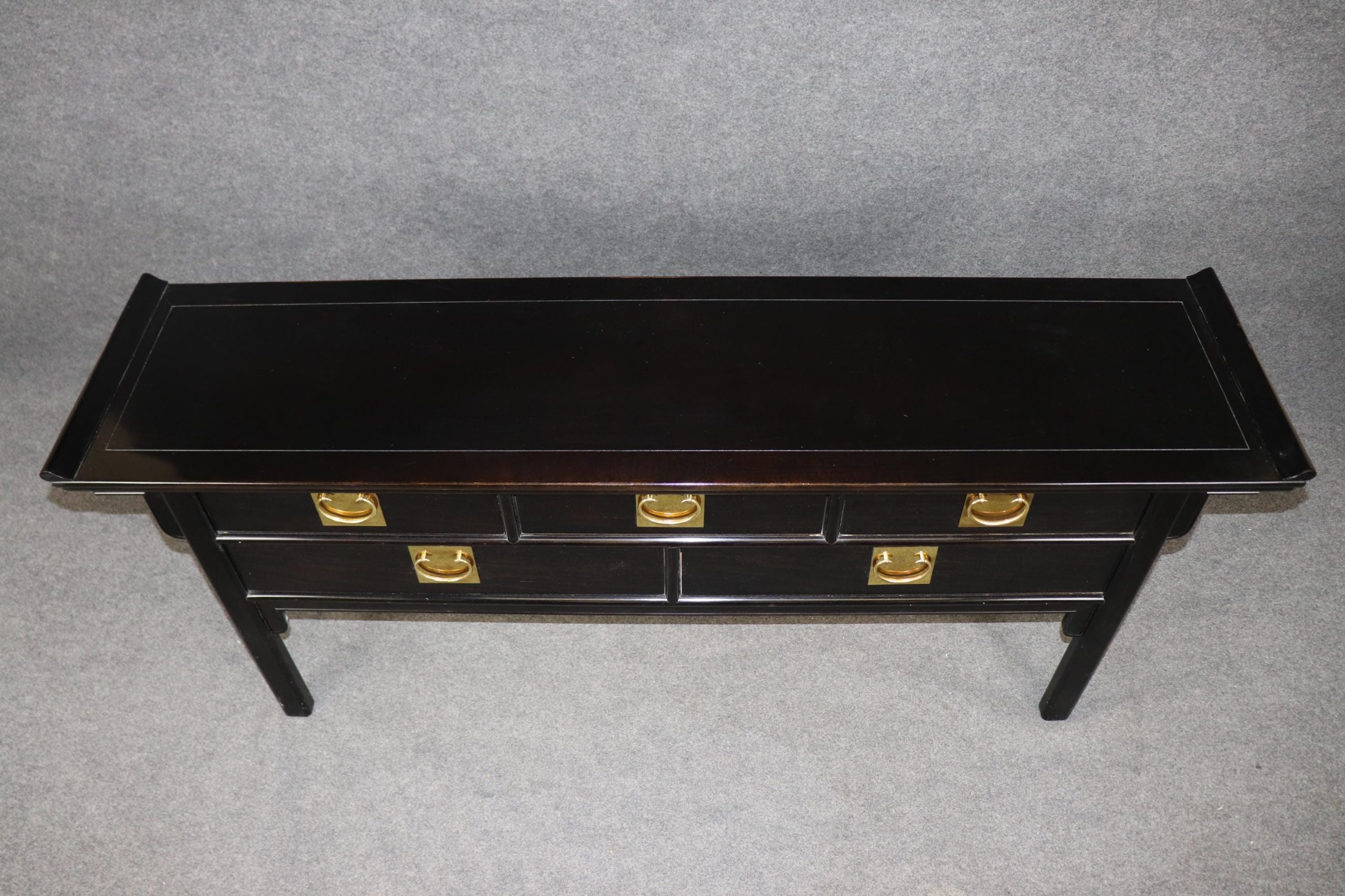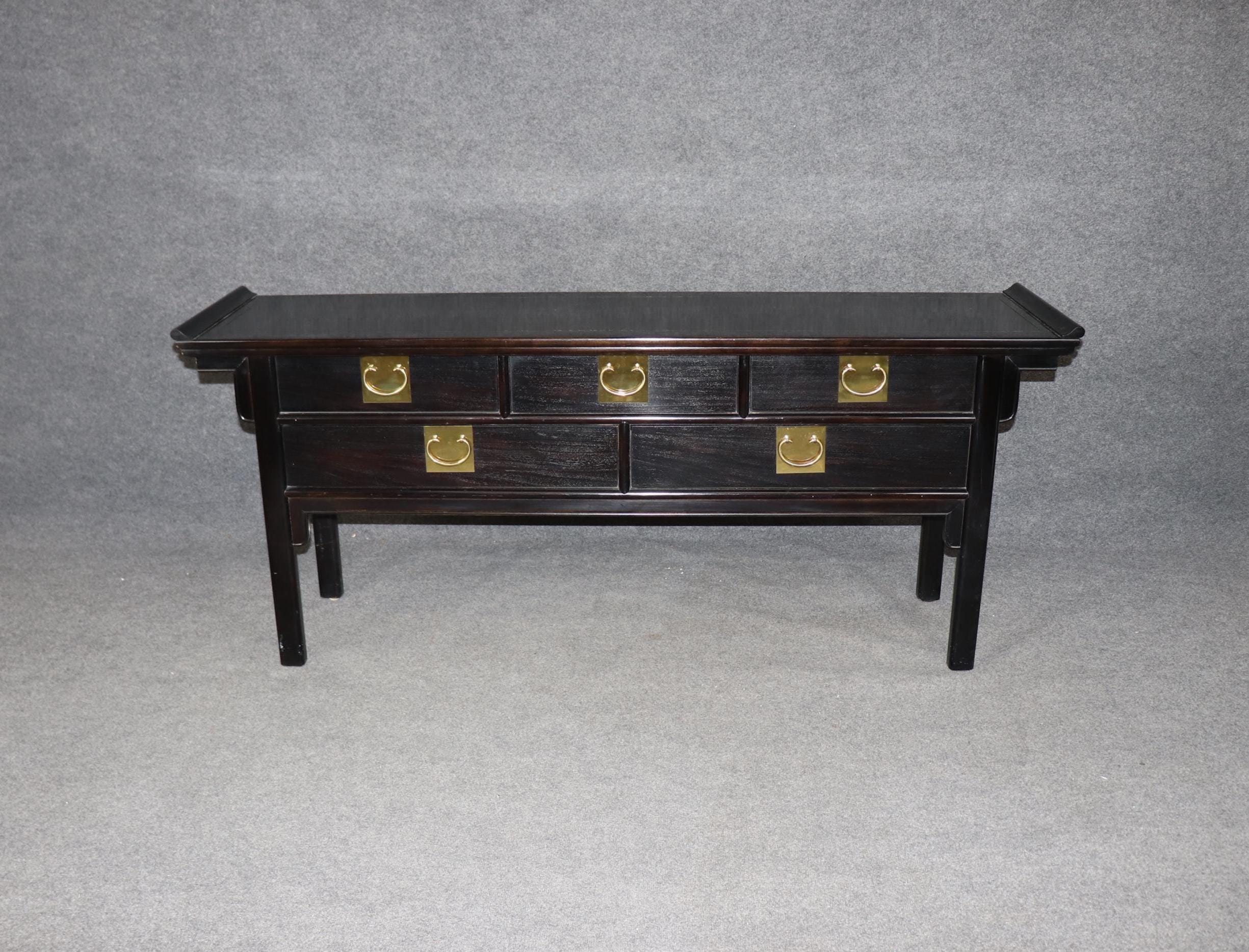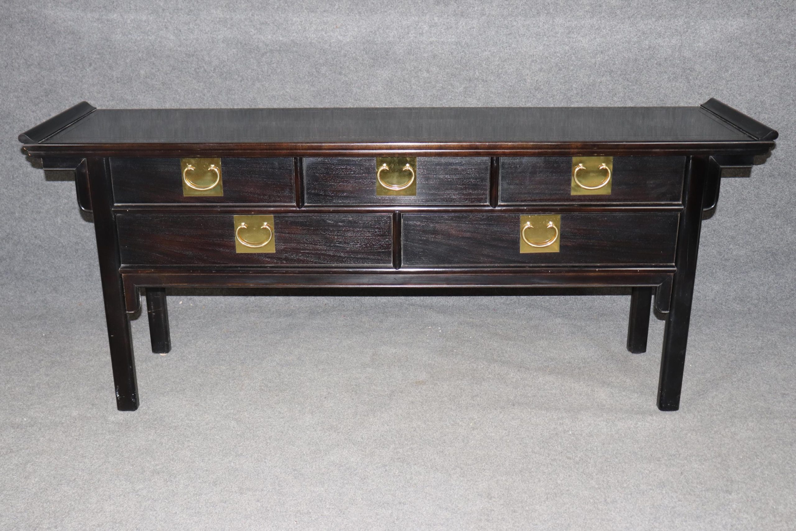 The console features a rich dark mahogany finish that is so dark it looks ebonized in most lighting conditions, offering a bold and elegant statement. Its clean lines and Asian-inspired silhouette are enhanced by original brass hardware, which adds a warm metallic contrast to the dark wood. The minimalist profile is both versatile and dramatic, making this piece ideal for entryways, living rooms, dining areas, or hallways.