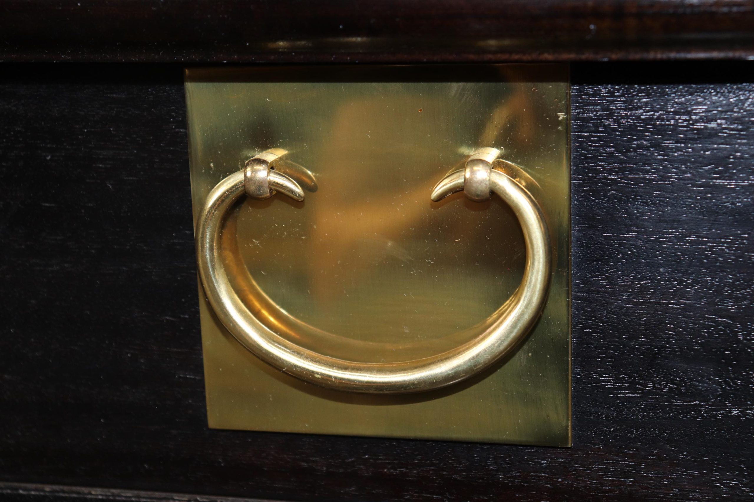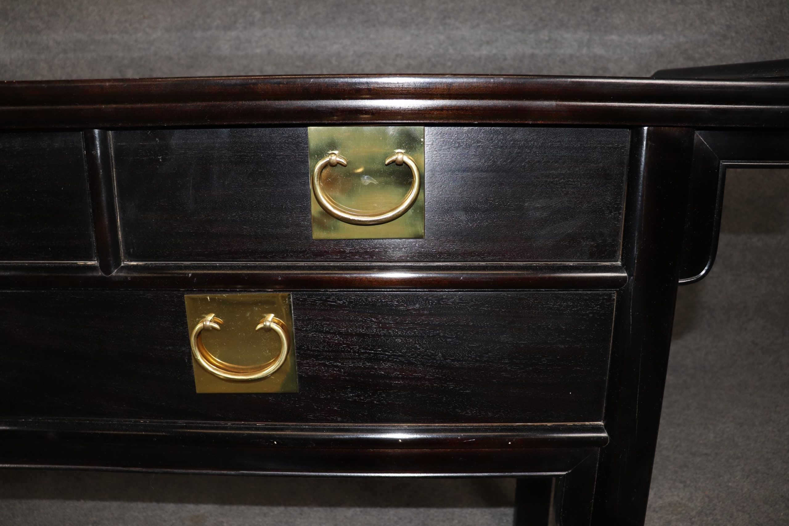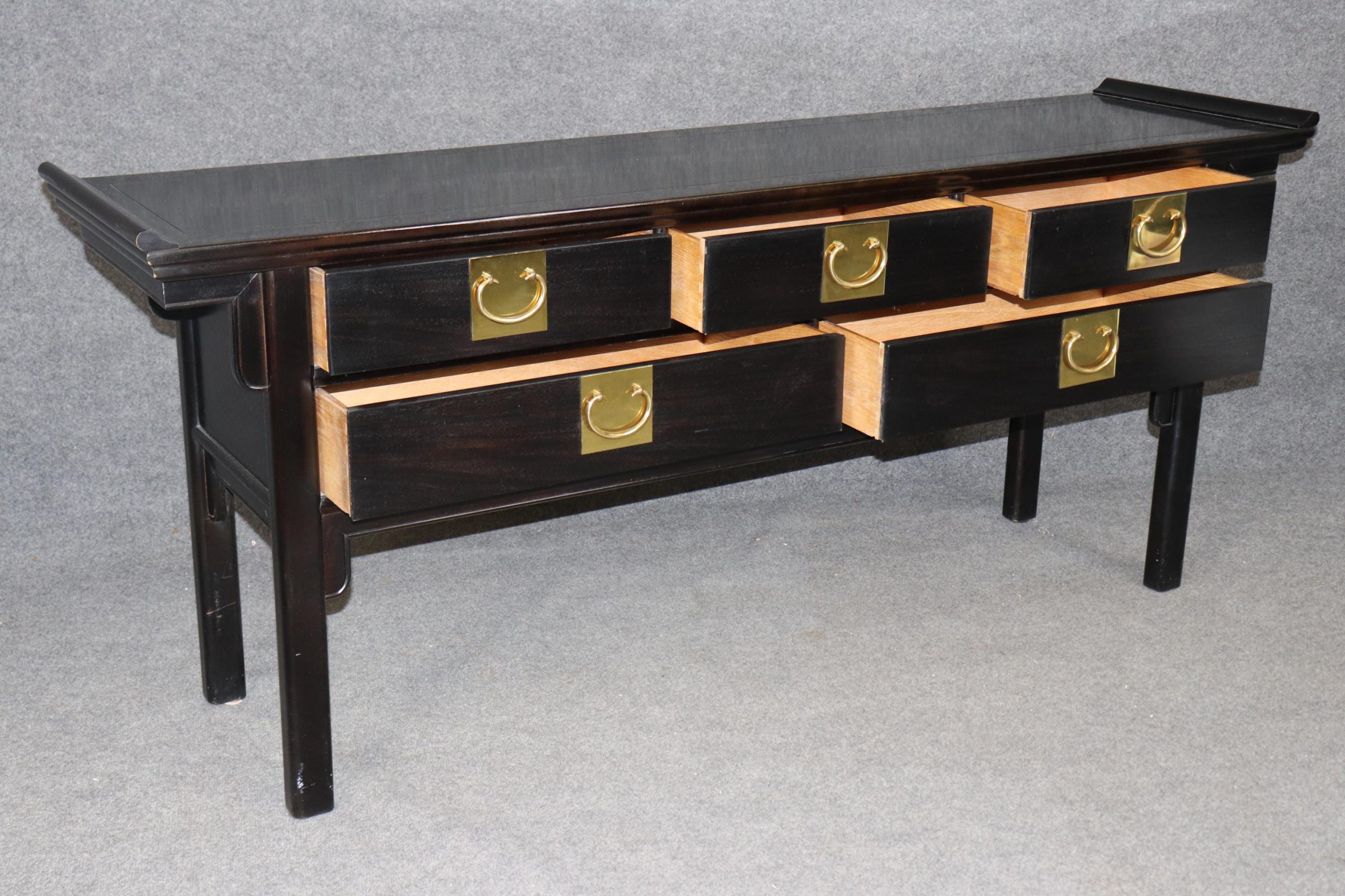 The console features a rich dark mahogany finish that is so dark it looks ebonized in most lighting conditions, offering a bold and elegant statement. Its clean lines and Asian-inspired silhouette are enhanced by original brass hardware, which adds a warm metallic contrast to the dark wood. The minimalist profile is both versatile and dramatic, making this piece ideal for entryways, living rooms, dining areas, or hallways.