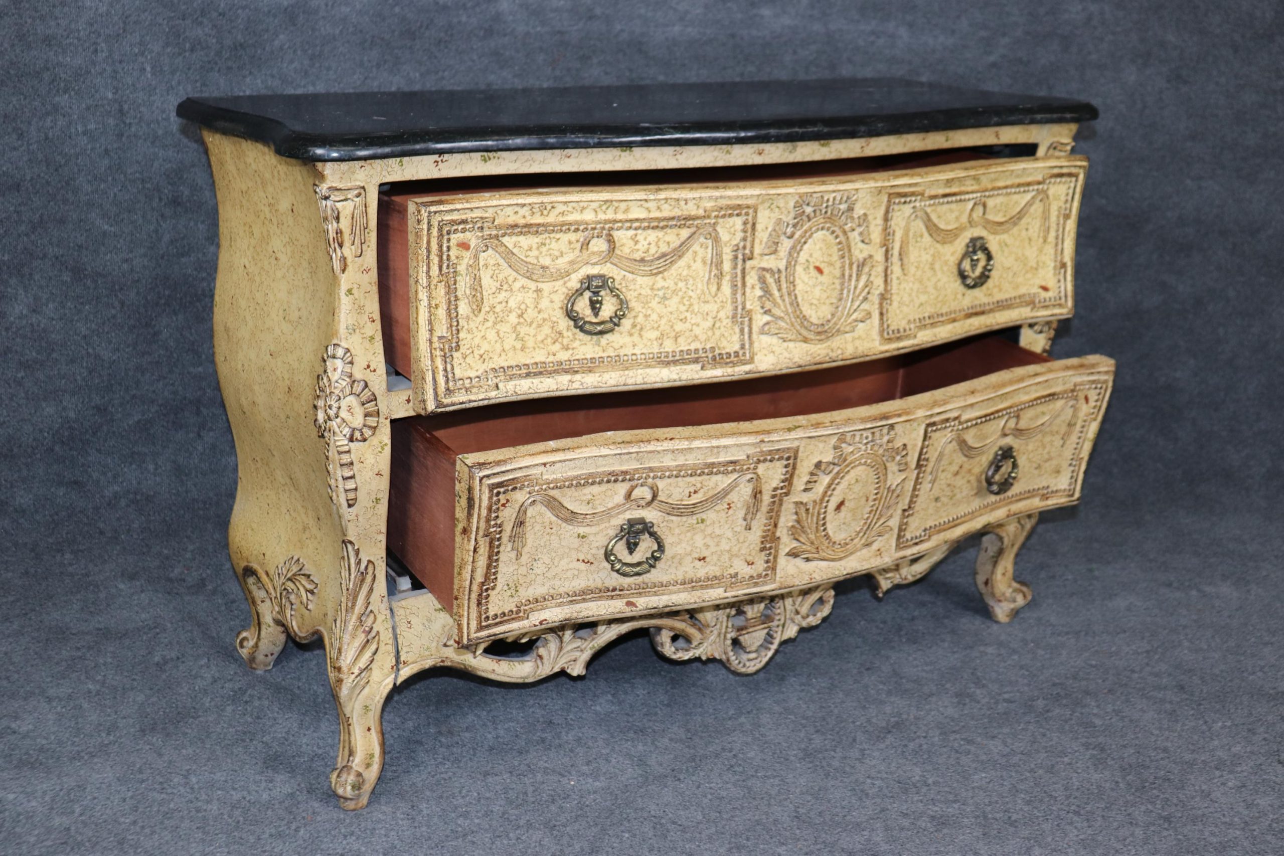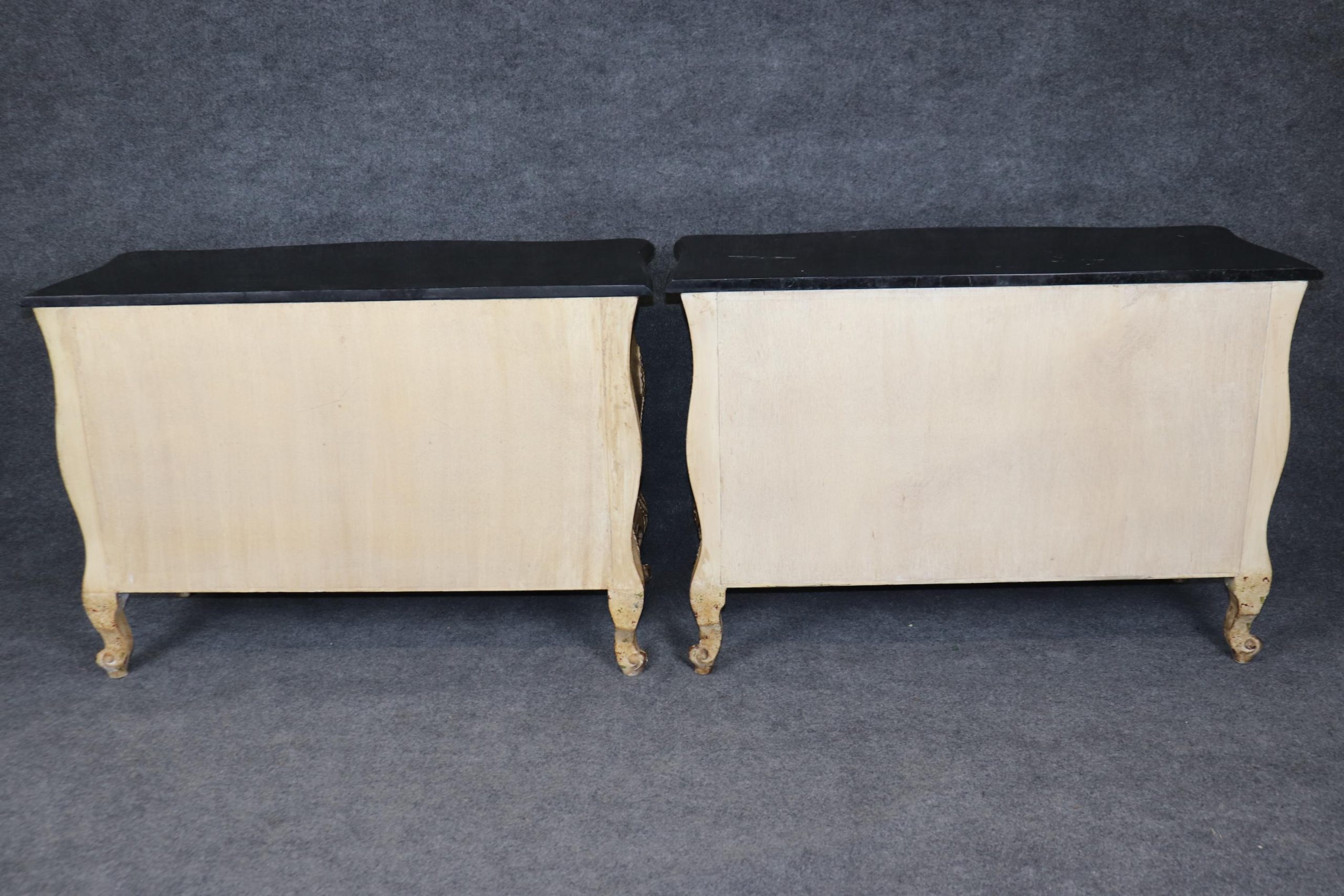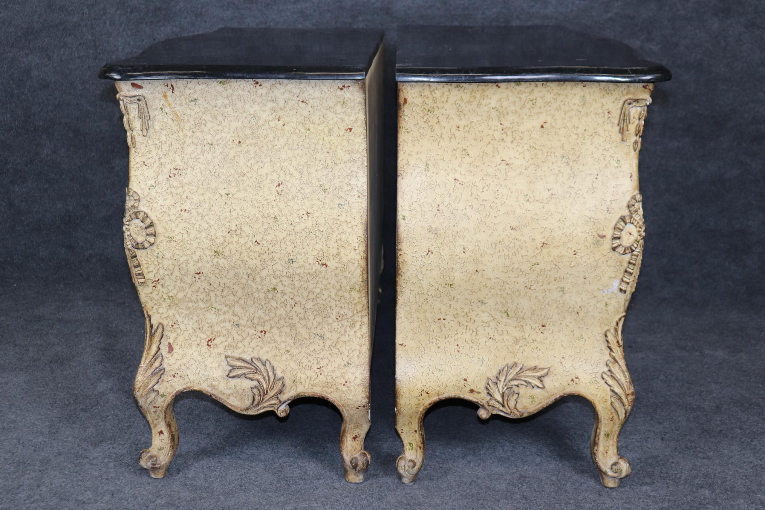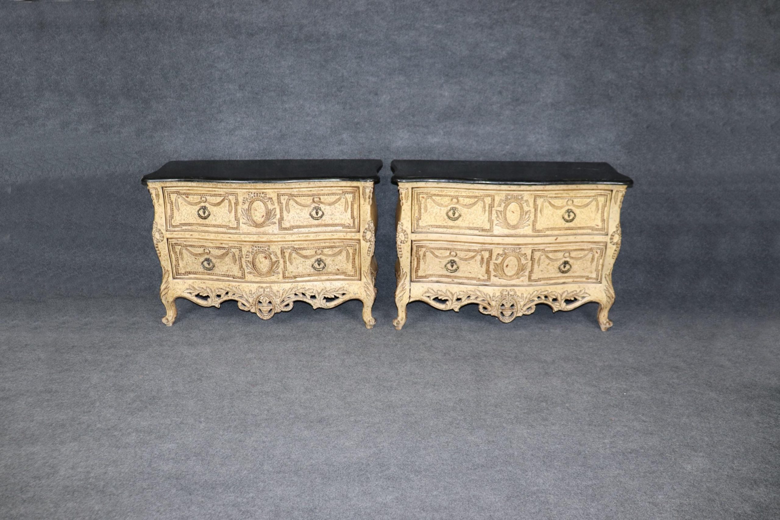 This vintage pair custom Continental style commodes with distressed tessellated tops is made of the highest quality and is perfect for your home! If you look at the photos provided, you can see the attention to detail in the carvings throughout the commodes. These pieces are perfect for any living room, bedroom, office, or place of your choosing! They each have 2 drawers, perfect for storing your personal belongings. Antiques are known to stand the test of time as new furniture from brands such as IKEA are meant to deteriorate over a couple of years in order to have you buy more of their products. I can assure you this pair will last your family for many generations! The commodes are in good vintage condition with normal finish losses and wear. Although the tops are distressed, one top does need repair.