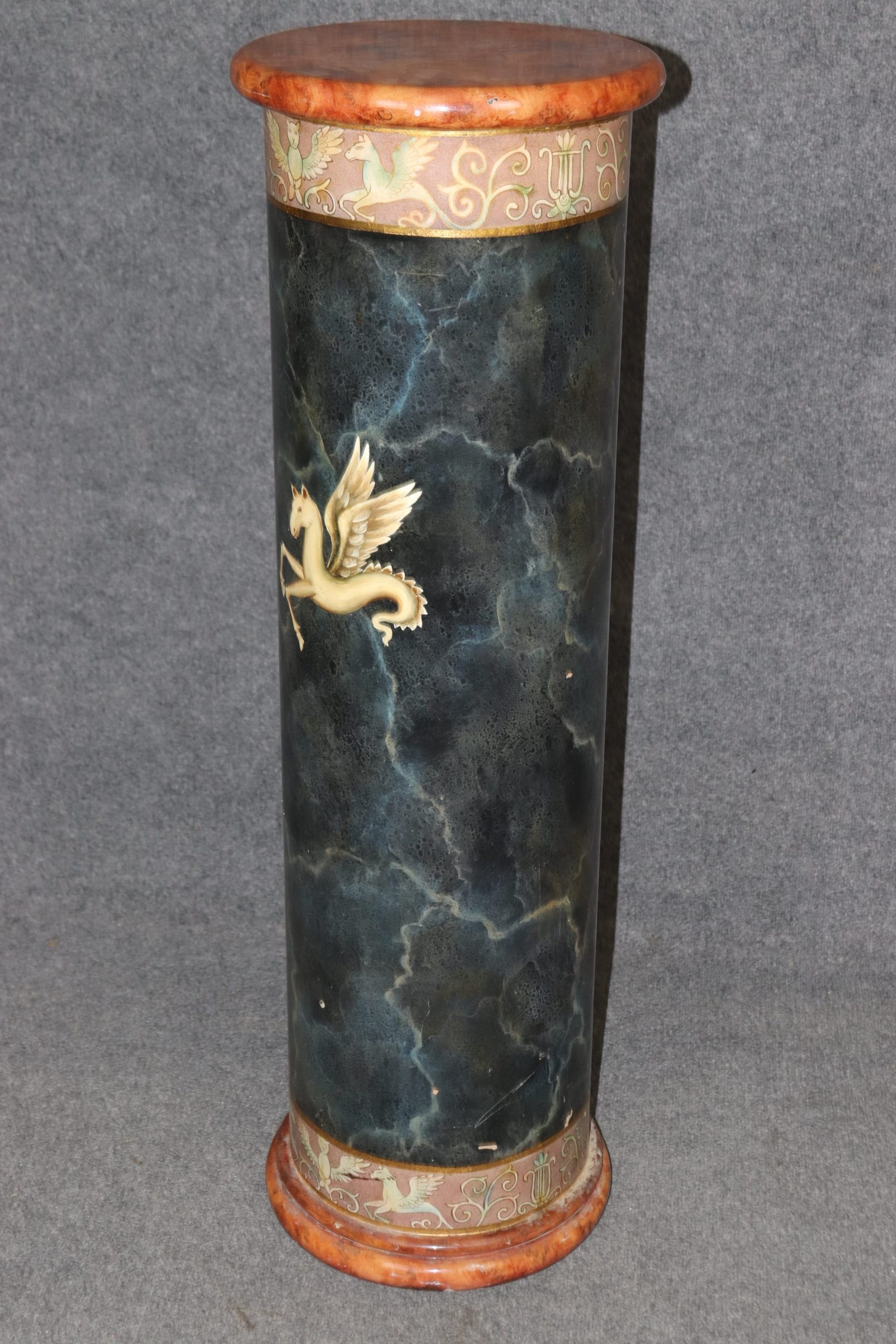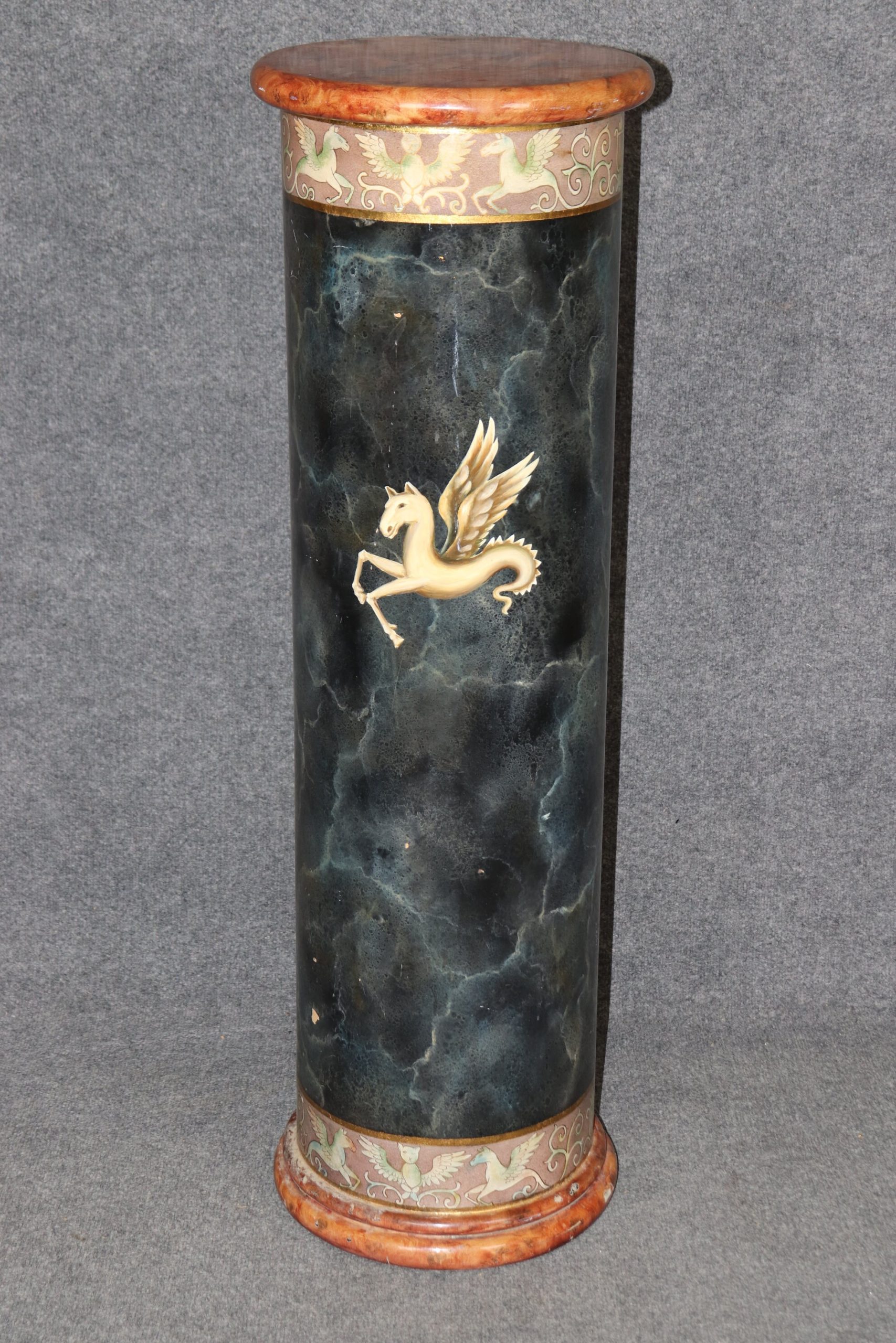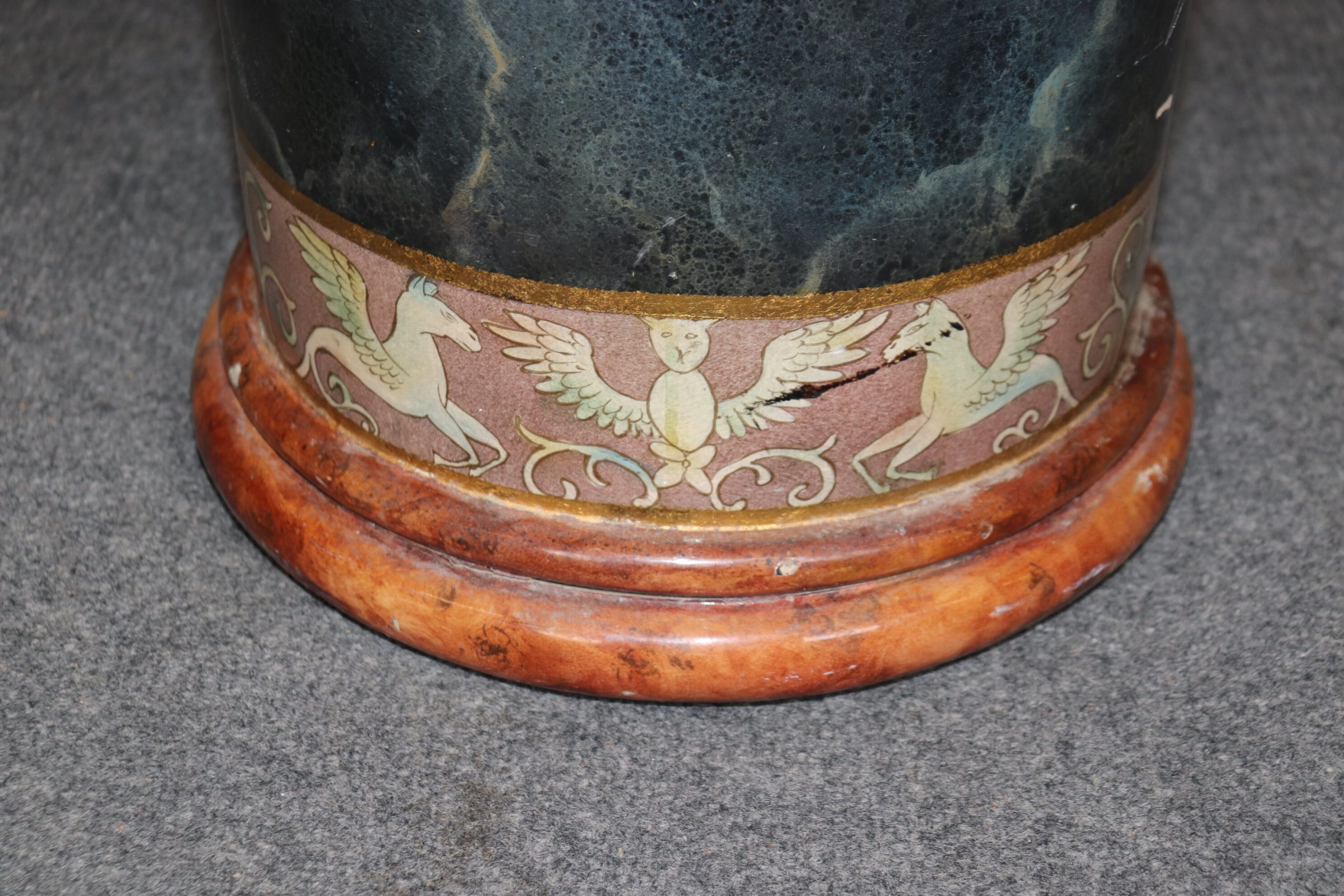 This vintage Continental style paint decorated pedestal table is perfect for you and your home! This piece is bound to bring a sense of minimalistic luxury and modernism into your home or place of choosing and is perfect for any entryway, living room, bedroom, bathroom or office! This piece is equipped with a faux marble top. This piece will have your guests mesmerized by its design and will have them asking if it is indeed the famed artist/sculptor! This piece is in good vintage condition with the exception of some minor surface scratches as to be expected, but otherwise good condition.