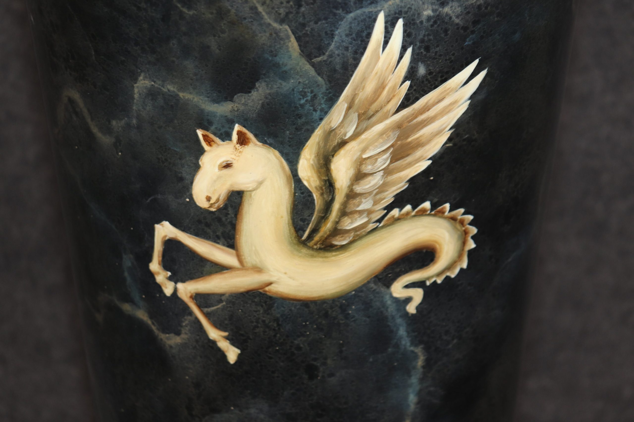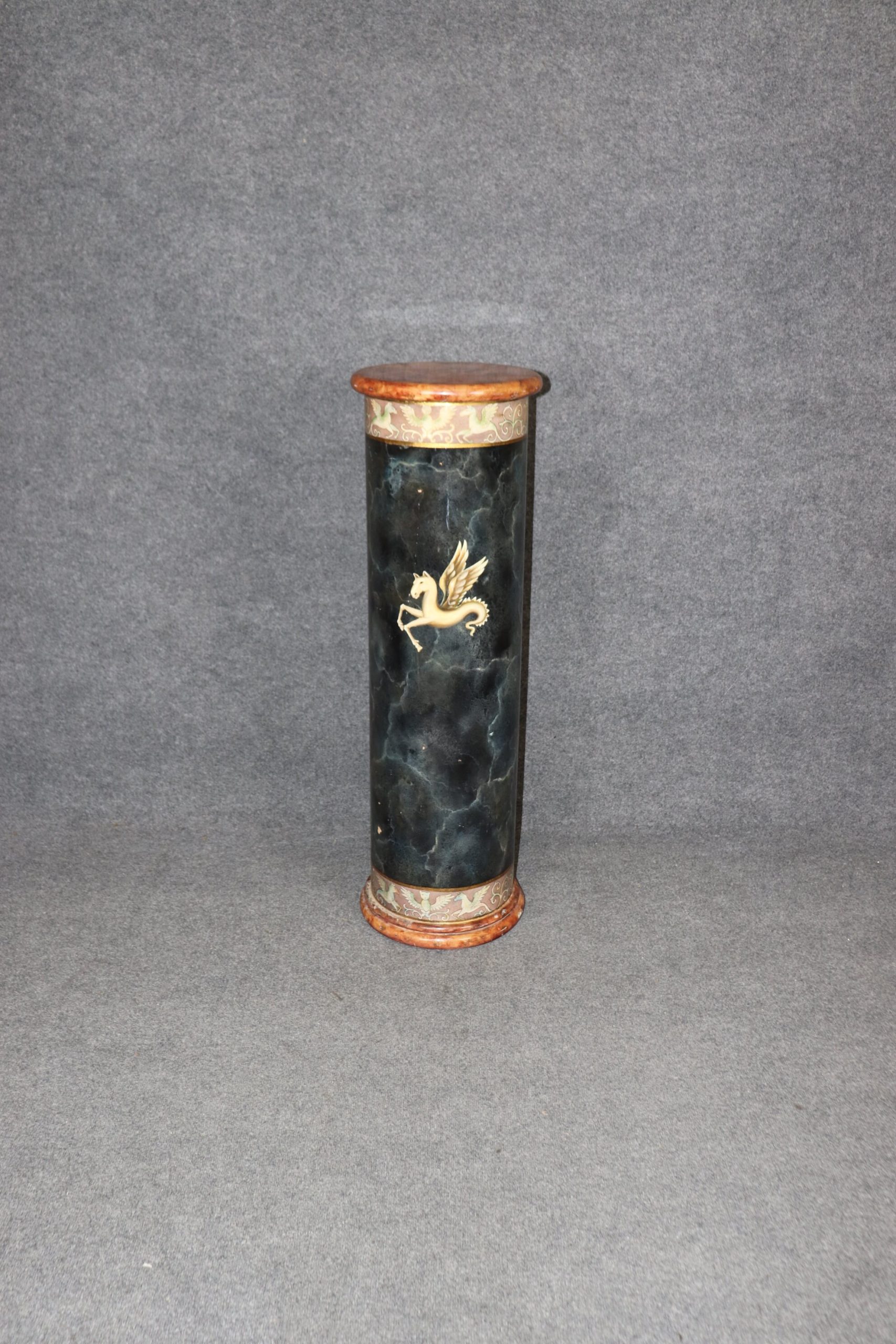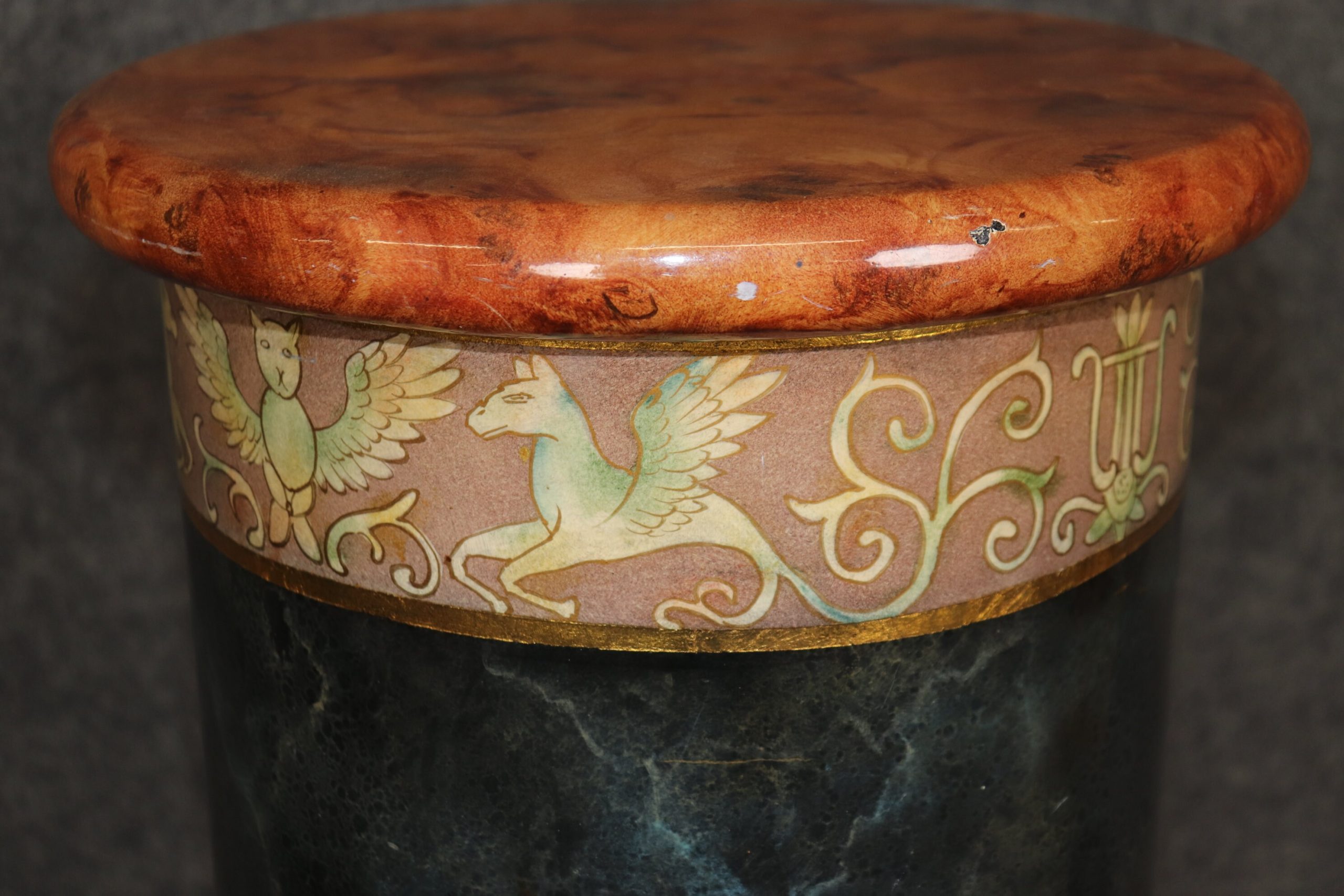 This vintage Continental style paint decorated pedestal table is perfect for you and your home! This piece is bound to bring a sense of minimalistic luxury and modernism into your home or place of choosing and is perfect for any entryway, living room, bedroom, bathroom or office! This piece is equipped with a faux marble top. This piece will have your guests mesmerized by its design and will have them asking if it is indeed the famed artist/sculptor! This piece is in good vintage condition with the exception of some minor surface scratches as to be expected, but otherwise good condition.