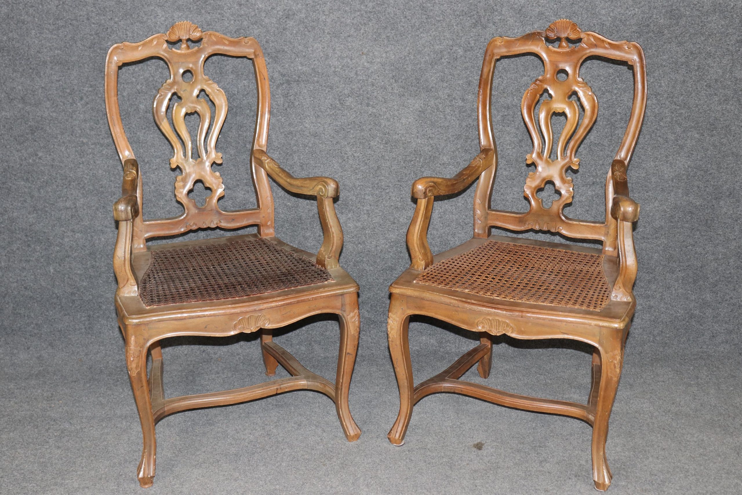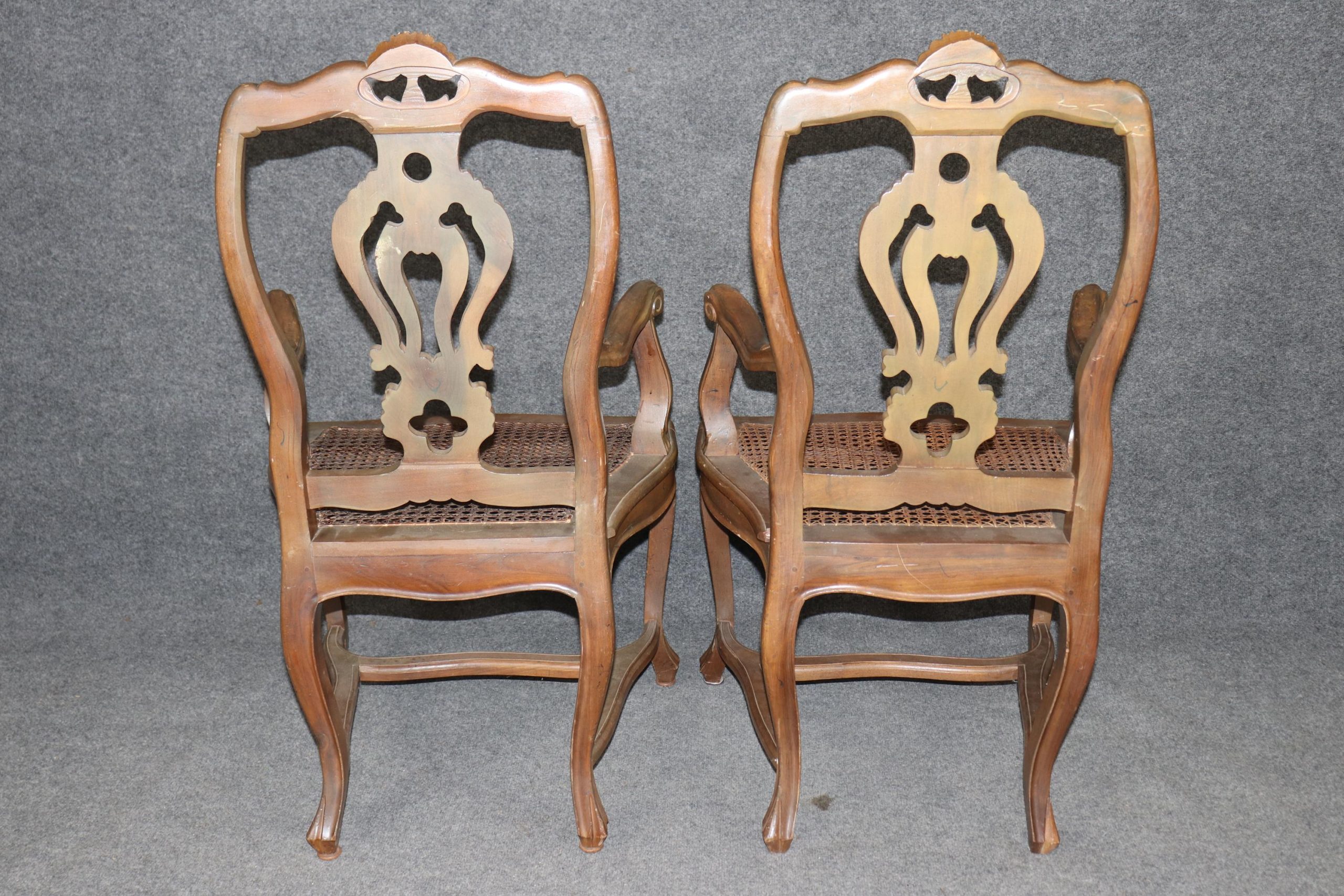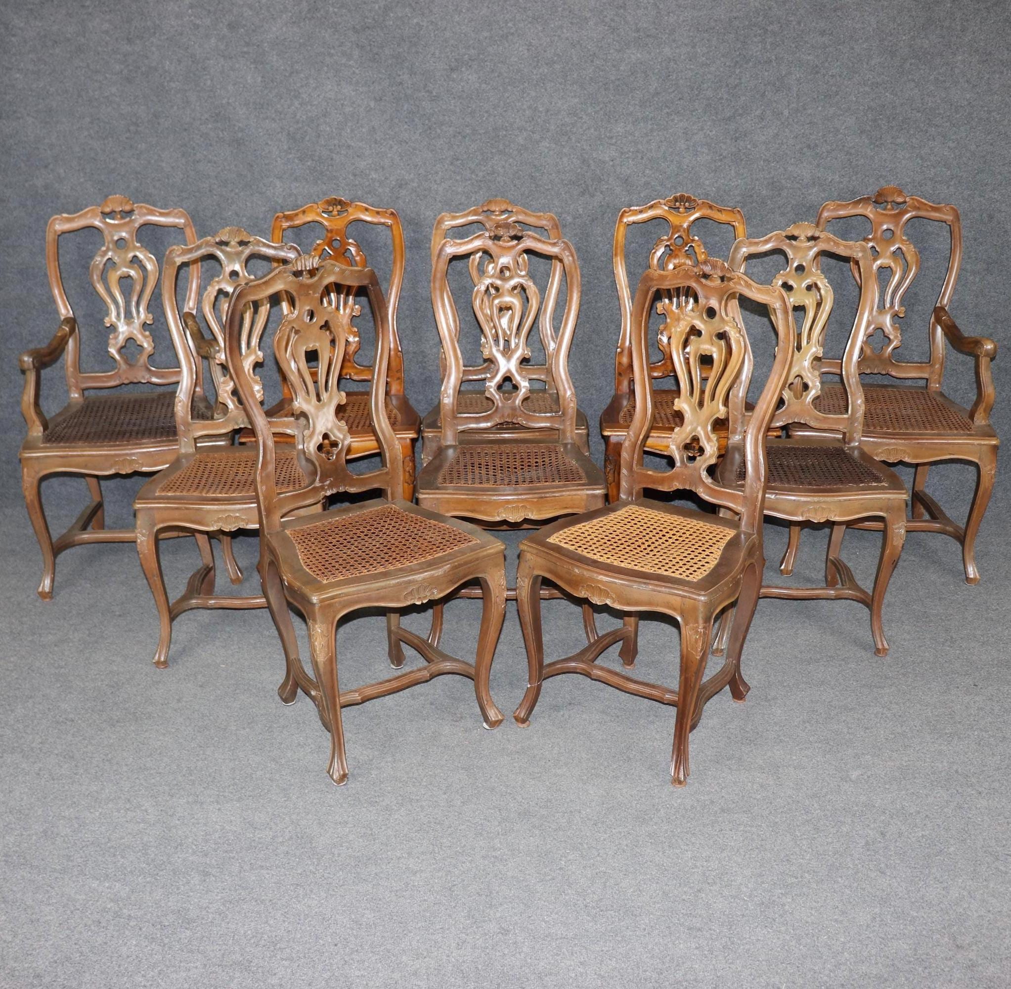 This vintage set of 10 Country French style dining room chairs with cane seats is of the highest quality! These chairs are perfect for you and your home and will bring a sense of luxury and sophistication into your dining room, office or place of choosing! There are 2 arm and 8 side chairs, perfect for around you dining table or conference table. One really nice aspect of these chairs, in particular, is their capability to be paired with a variety of other styles you may already have in your home. Antique furniture and vintage pieces have stood the test of time and this set of chairs is no exception! With their quality materials and great craftsmanship this set is bound to last you and your family for many years to come. The chairs are in vintage condition with damage to the cane and 2 discolored chairs along with light surface scratches and minor finish loss, as to be expected of a set from the 1950s.