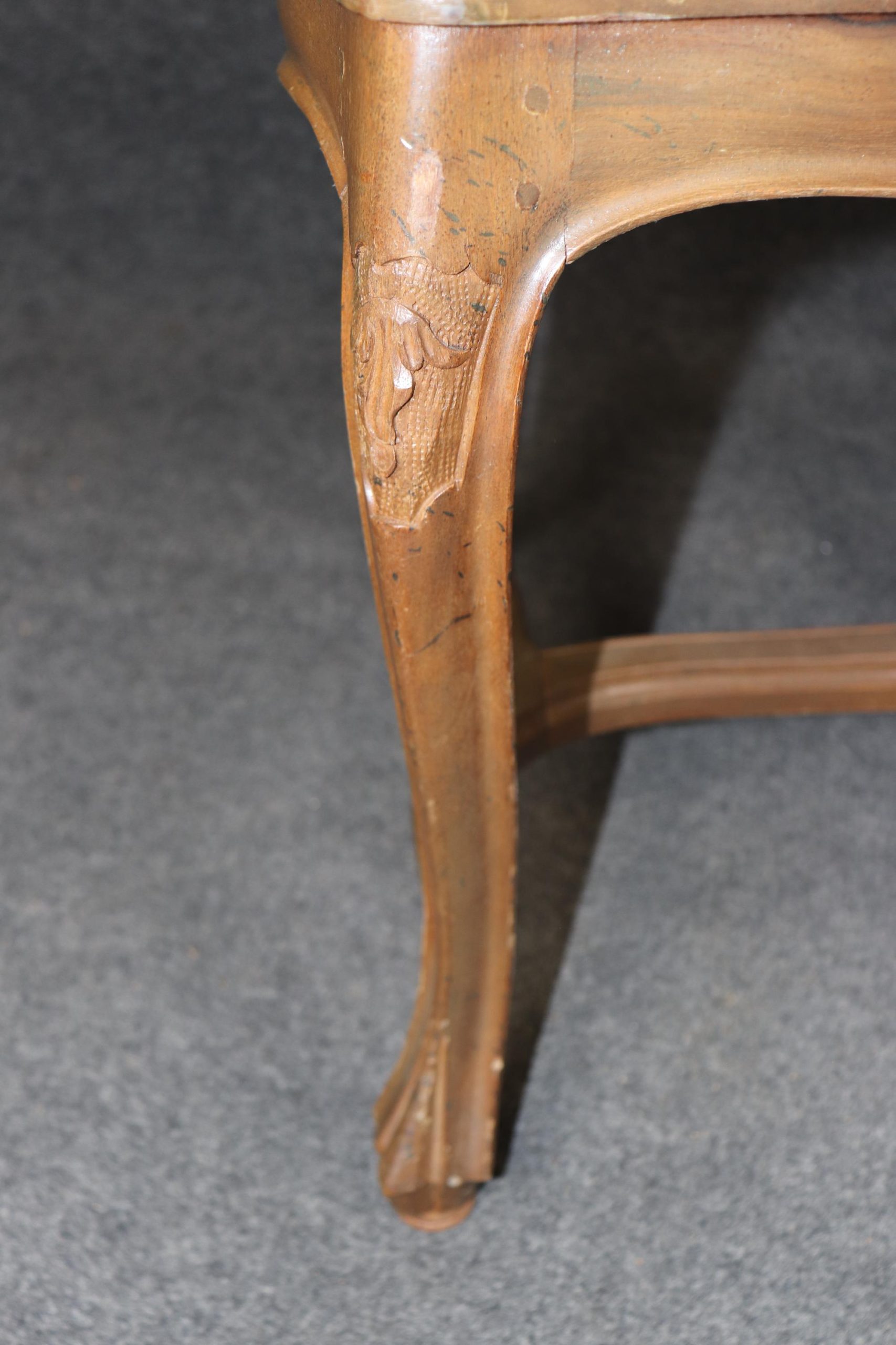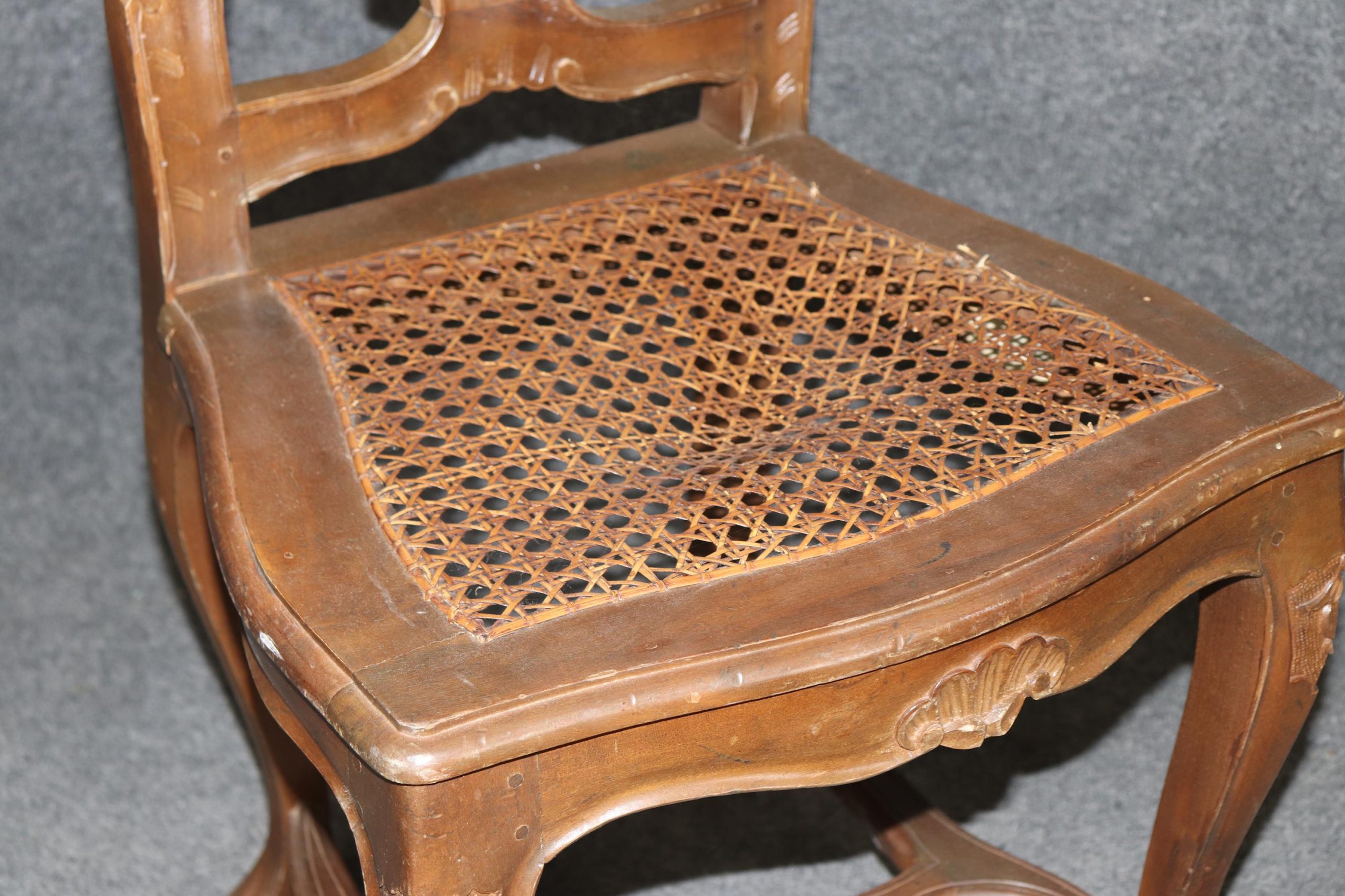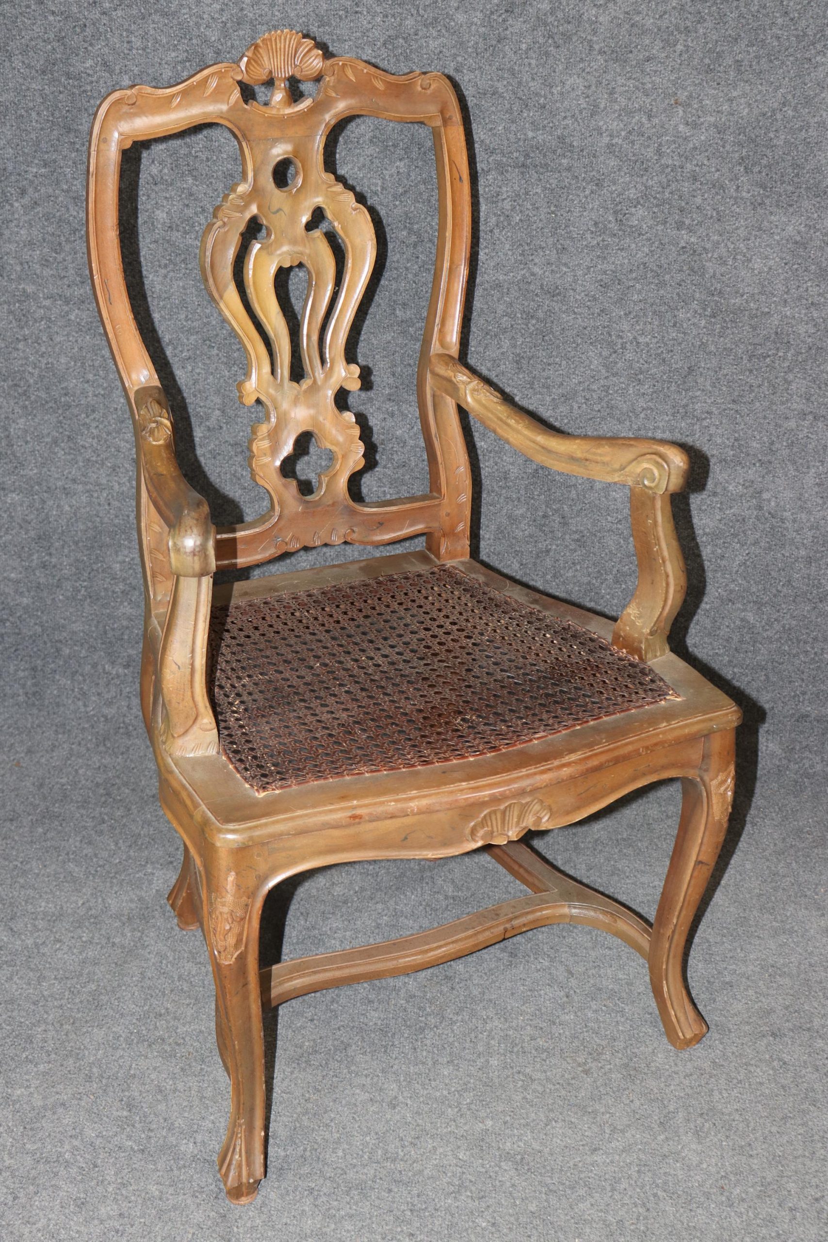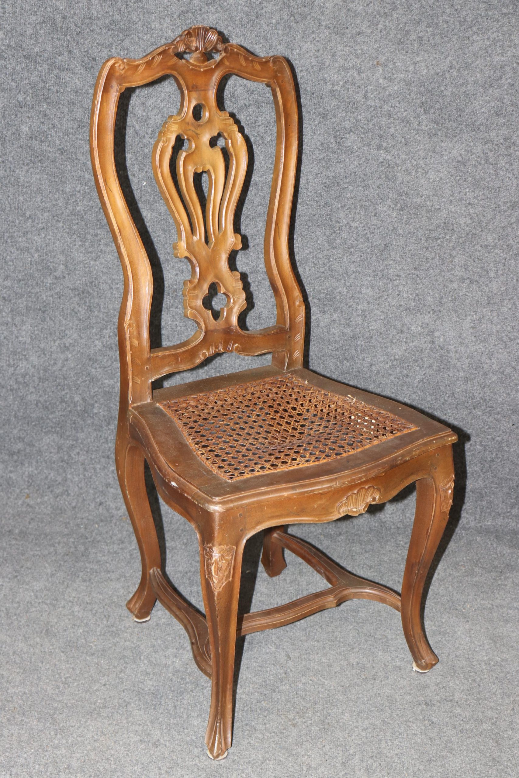 This vintage set of 10 Country French style dining room chairs with cane seats is of the highest quality! These chairs are perfect for you and your home and will bring a sense of luxury and sophistication into your dining room, office or place of choosing! There are 2 arm and 8 side chairs, perfect for around you dining table or conference table. One really nice aspect of these chairs, in particular, is their capability to be paired with a variety of other styles you may already have in your home. Antique furniture and vintage pieces have stood the test of time and this set of chairs is no exception! With their quality materials and great craftsmanship this set is bound to last you and your family for many years to come. The chairs are in vintage condition with damage to the cane and 2 discolored chairs along with light surface scratches and minor finish loss, as to be expected of a set from the 1950s.