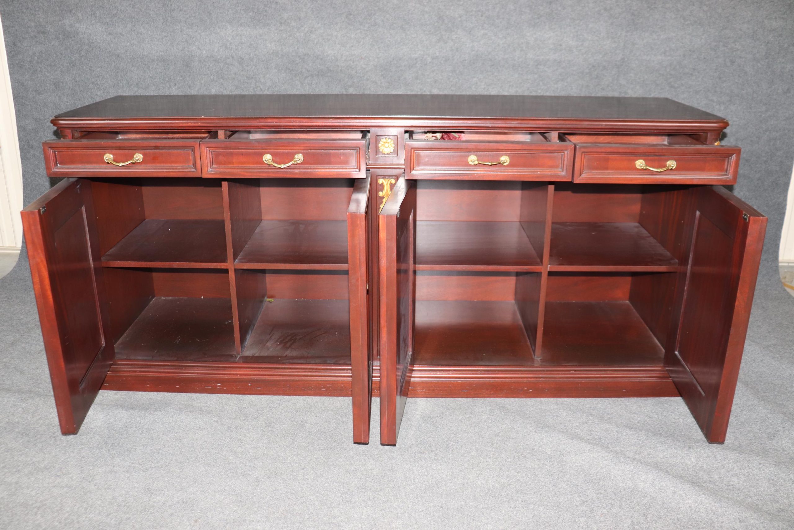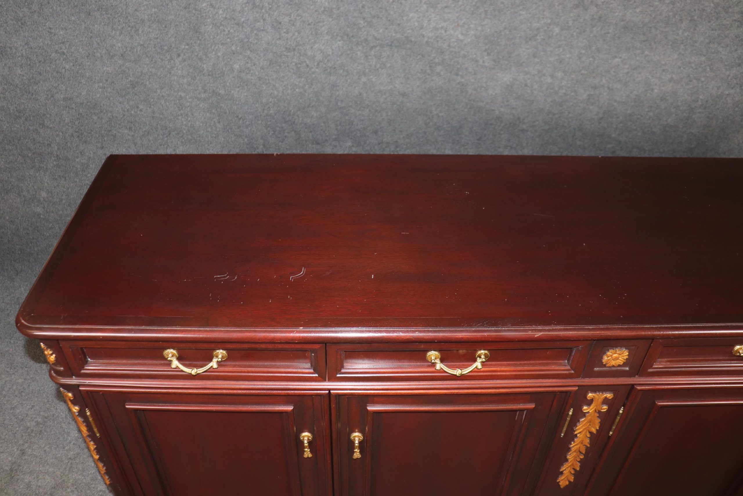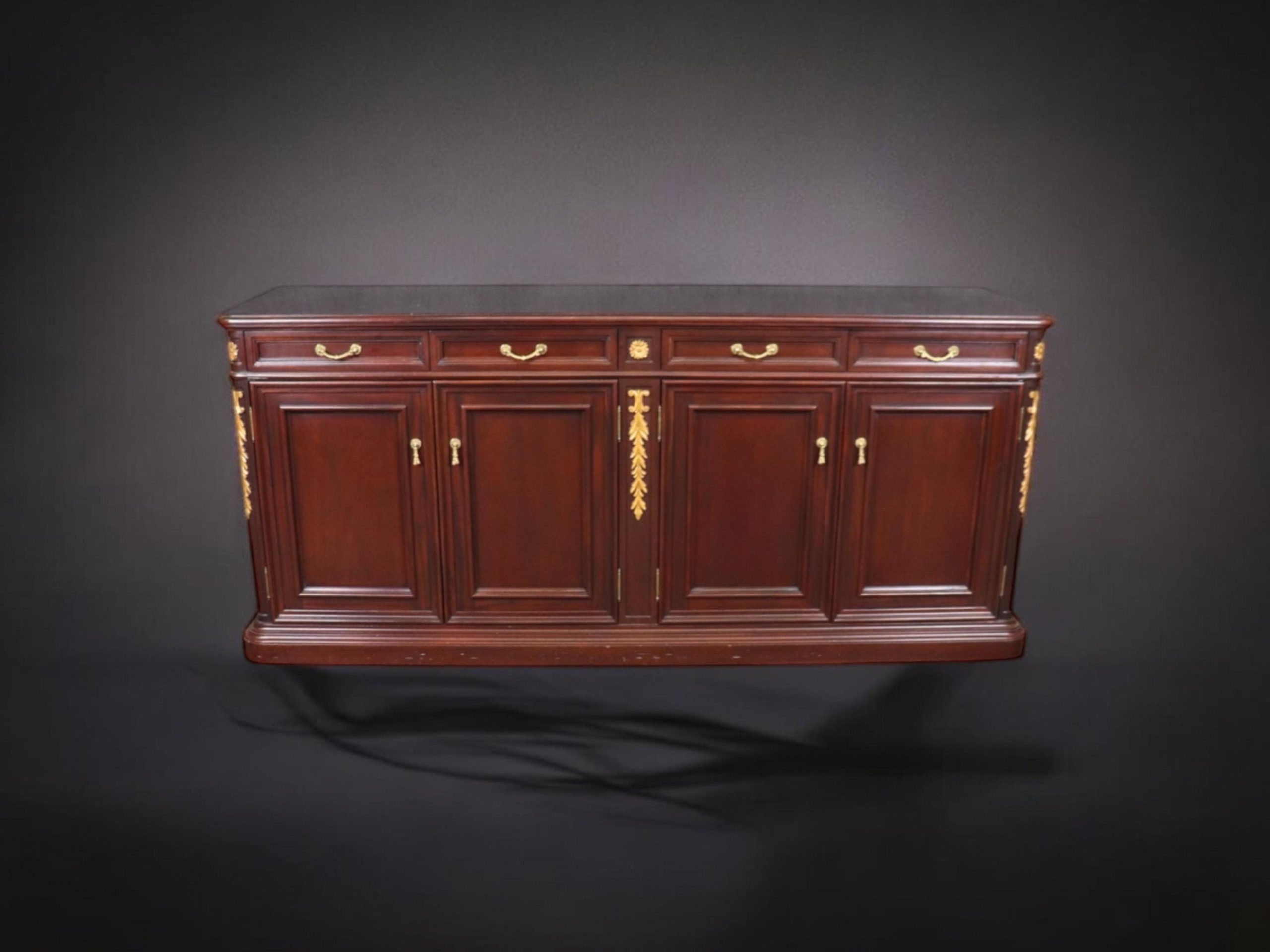 This vintage custom made Louis XVI Directoire Style Sideboard Buffett is made of the highest quality and is bound to bring a sense of class and luxury into your home or place of choosing! This piece has 4 large doors in the front that open up into a spacious area as well as 4 drawers, perfect for storing away your personal belongings! This piece is in good vintage condition with the exception or some light surface scratches as well as a few deeper scratches in the finish and some minor finish loss as to be expected with an item of this age but otherwise good condition.