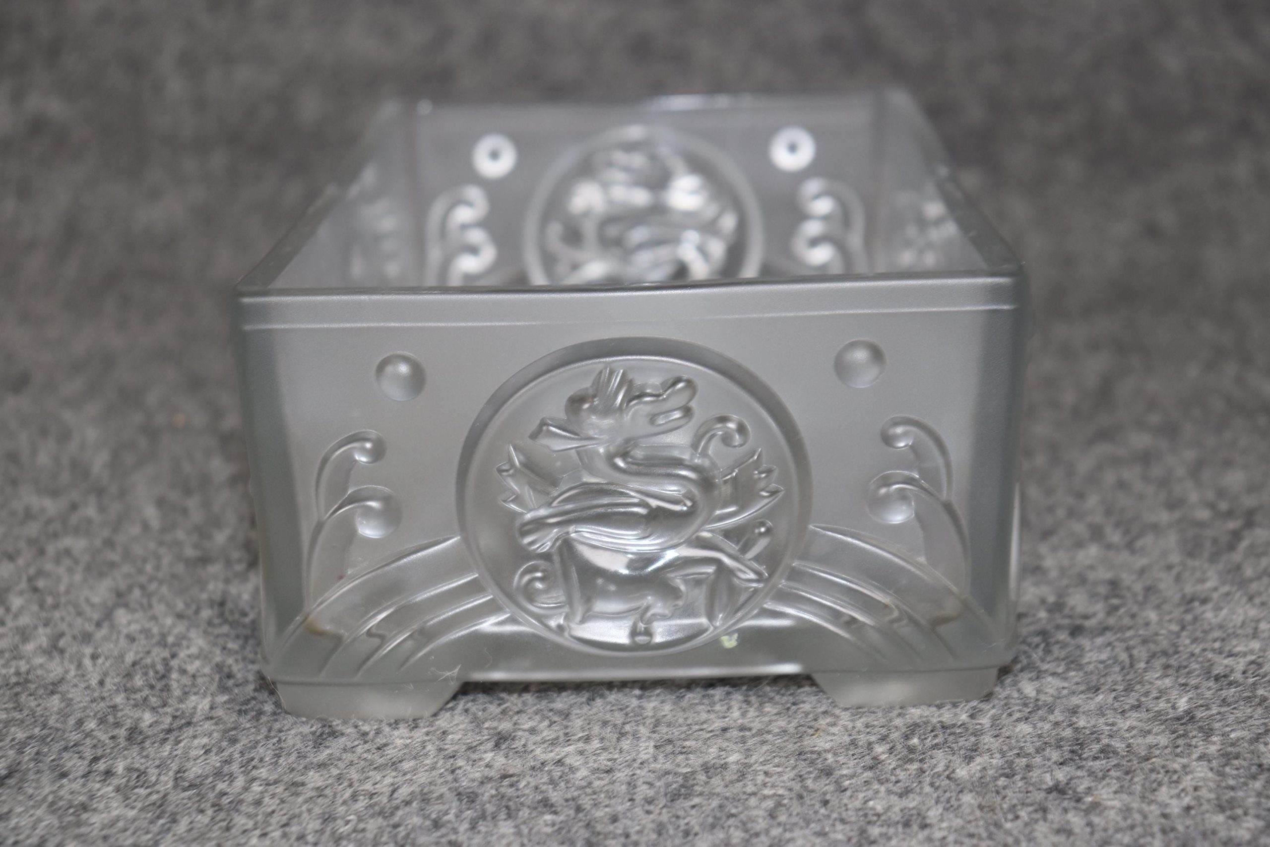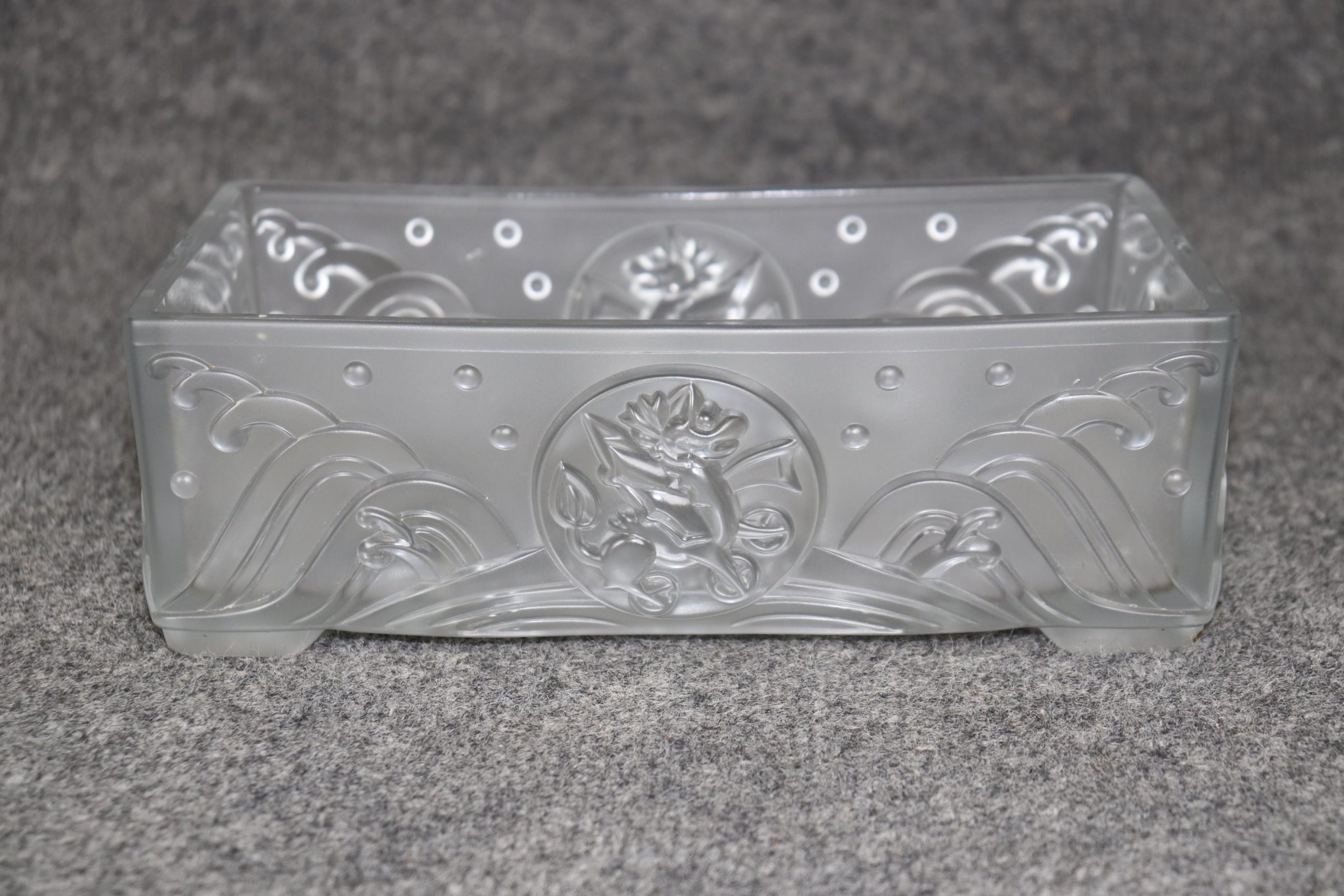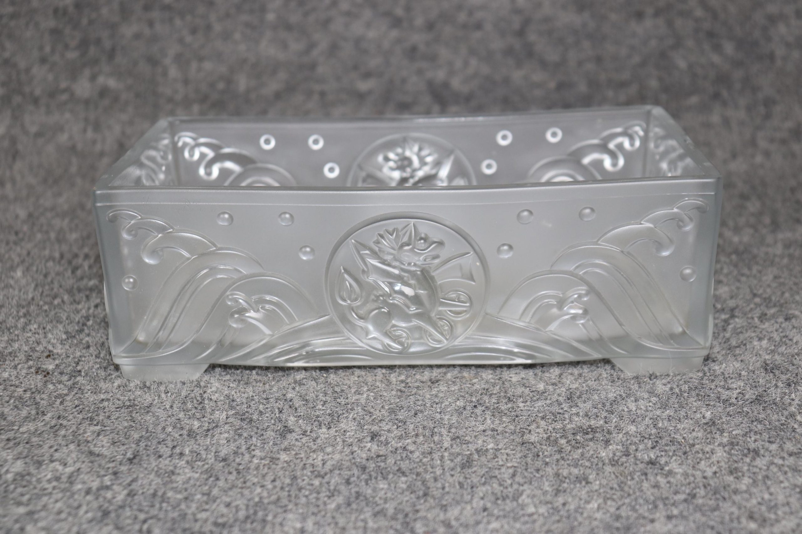 This Vintage French Art Deco Centerpiece or Small Compote in the Manner of Lalique is truly a breathe taking piece! Made of the highest quality this piece whispers tales of opulence from a bygone era and is bound to bring a sense of character and sophistication into your home or place of choosing. Although NOT SIGNED Lalique this piece could very well be Lalique as it is of the same quality of other similar pieces done by Lalique. Lalique was started in 1860 by Rene Lalique in Paris and ever since has been one of the leading manufacturers in luxury French glass and crystal they are still in business today and have made custom pieces for some very important politicians, musicians actors and many more throughout the years. This piece in particular features an Art Deco design as well as a dragon on the side medallion. This centerpiece is perfect for the top of any commode as well as any dining table and can also be used on a daily basis for storing your keys or whatever you desire. Antique and vintage furniture and décor have stood the test of time and this Lalique style piece is no exception! With its attention to detail and quality materials this piece will last you and your family for many years to come. The piece is in good vintage condition with the exception of some light wear to the bottom of the feet and some possible microscopic light scratches but otherwise good condition.