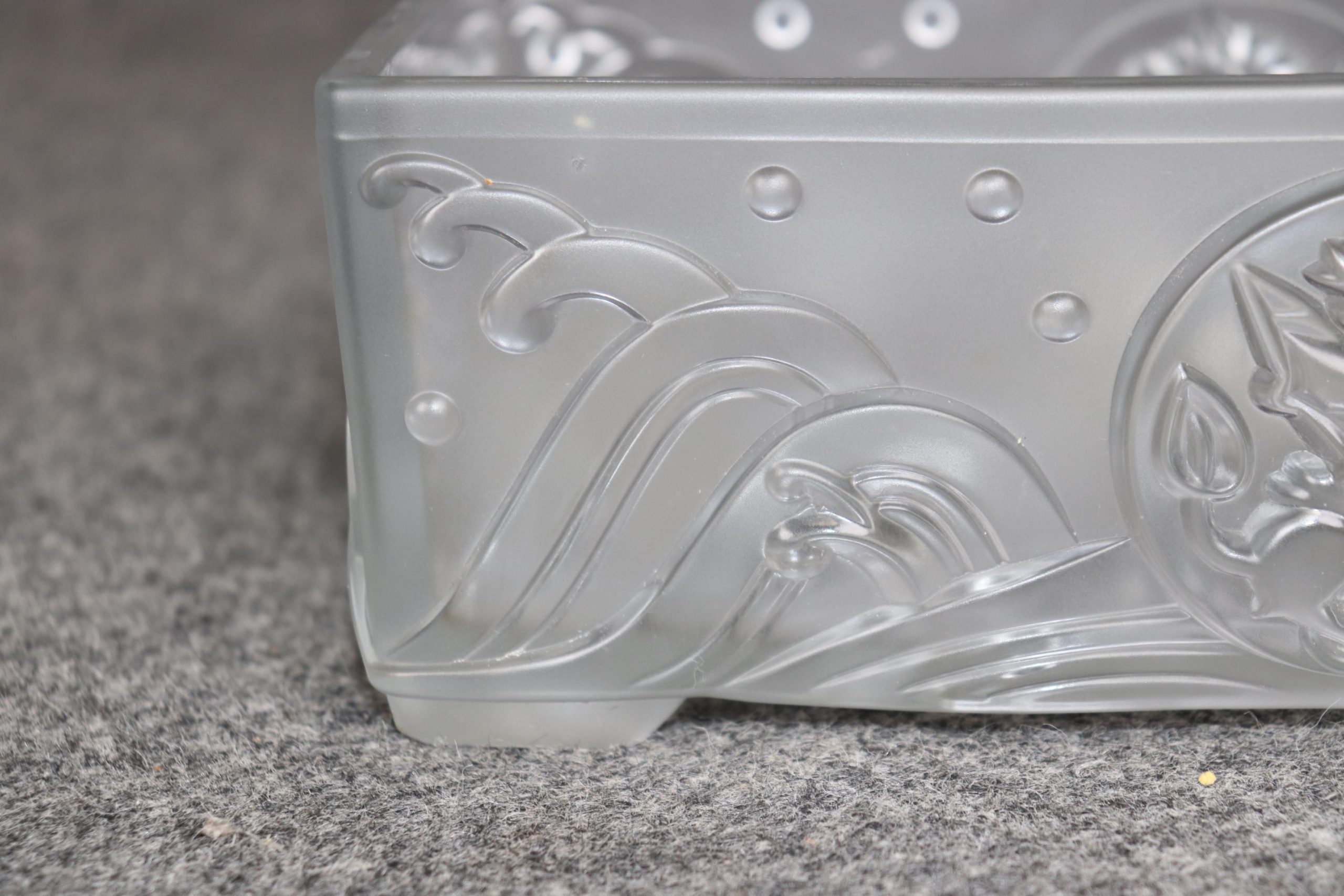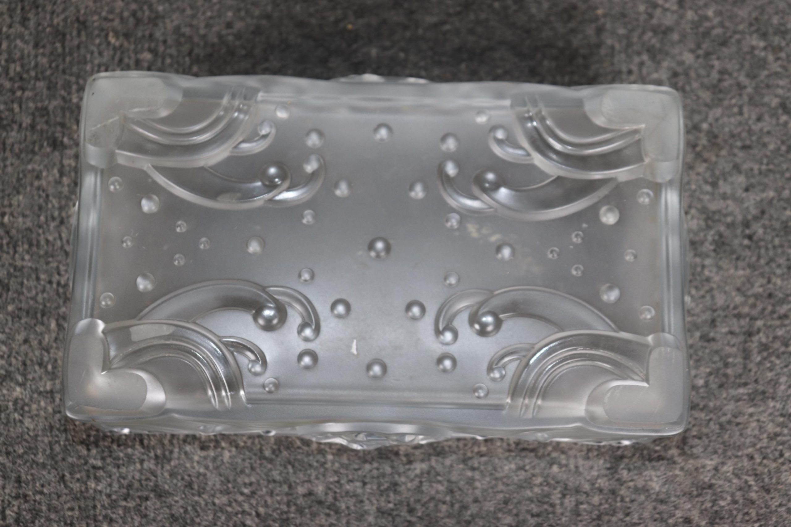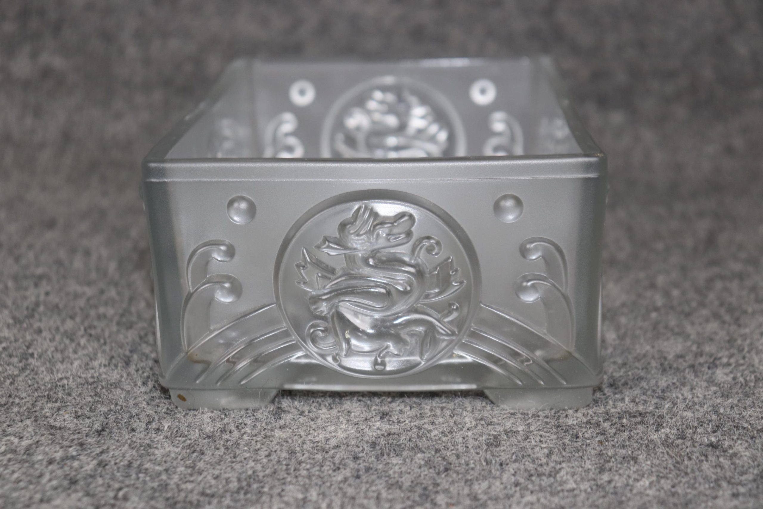 This Vintage French Art Deco Centerpiece or Small Compote in the Manner of Lalique is truly a breathe taking piece! Made of the highest quality this piece whispers tales of opulence from a bygone era and is bound to bring a sense of character and sophistication into your home or place of choosing. Although NOT SIGNED Lalique this piece could very well be Lalique as it is of the same quality of other similar pieces done by Lalique. Lalique was started in 1860 by Rene Lalique in Paris and ever since has been one of the leading manufacturers in luxury French glass and crystal they are still in business today and have made custom pieces for some very important politicians, musicians actors and many more throughout the years. This piece in particular features an Art Deco design as well as a dragon on the side medallion. This centerpiece is perfect for the top of any commode as well as any dining table and can also be used on a daily basis for storing your keys or whatever you desire. Antique and vintage furniture and décor have stood the test of time and this Lalique style piece is no exception! With its attention to detail and quality materials this piece will last you and your family for many years to come. The piece is in good vintage condition with the exception of some light wear to the bottom of the feet and some possible microscopic light scratches but otherwise good condition.