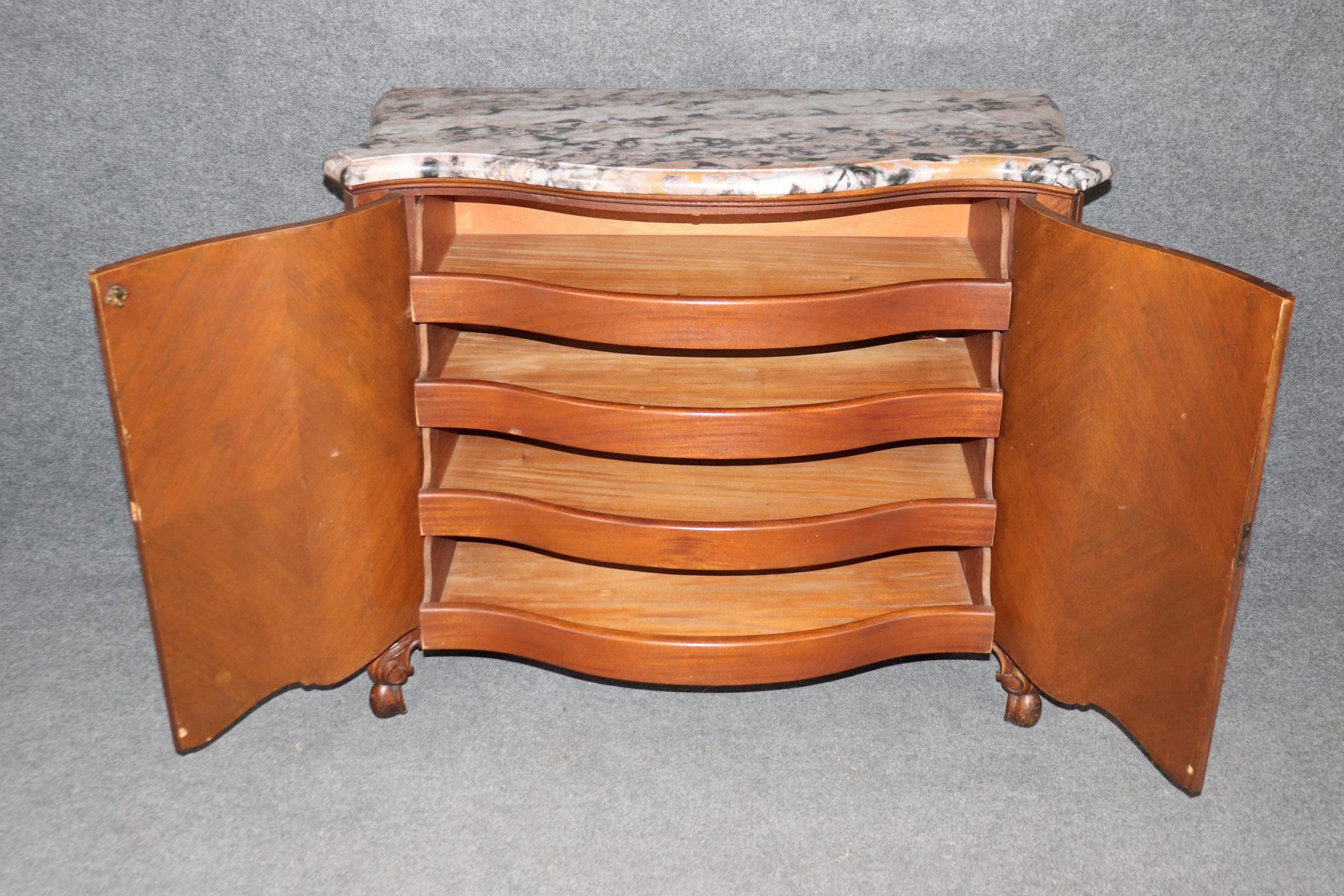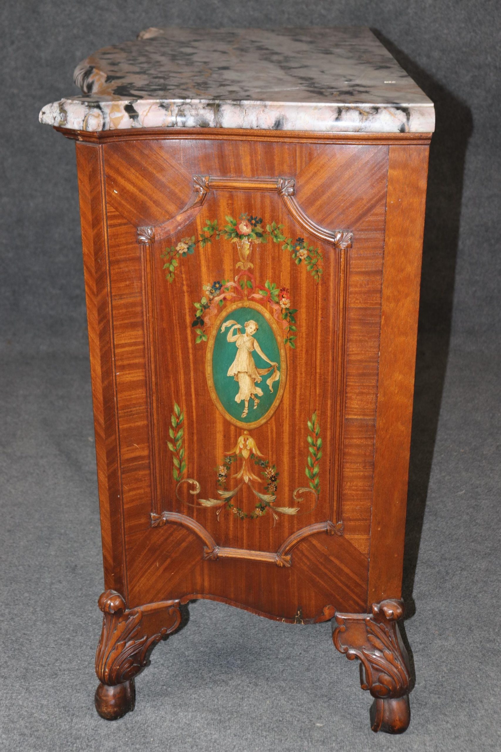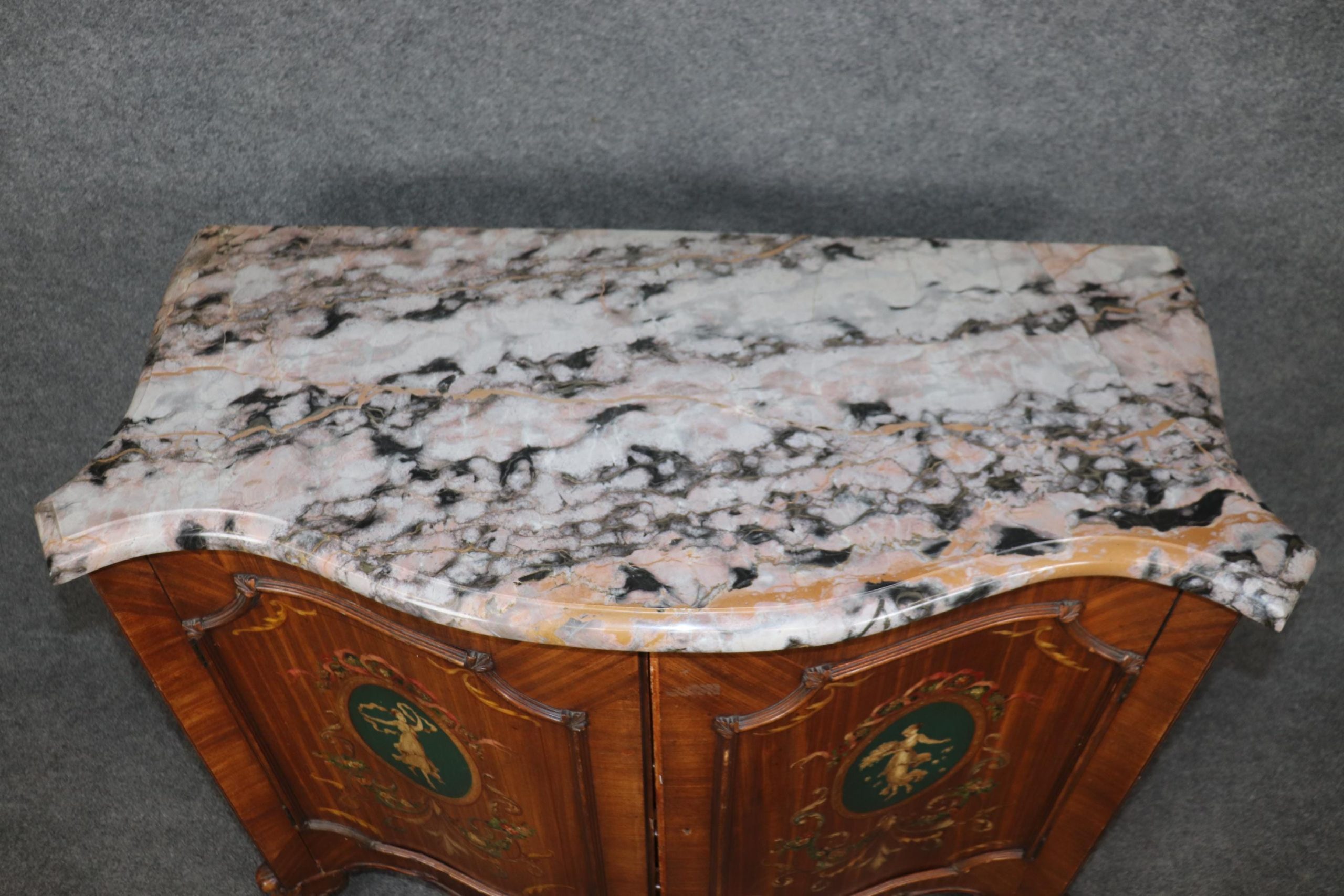 This vintage French carved oak marble top server sideboard is bound to bring a sense of luxury and character into your home or place of choosing! if you look at the photos provided, you can see the attention to detail in the Adams style paint decorations. The server is equipped with 4 drawers, perfect for storing your personal belongings! This is truly an exceptional piece, and is an opportunity to own something exceptional! This will make an excellent addition to your entryway, living room, office or place of your choosing and certainly have your guests mesmerized by the beautiful craftsmanship and attention to detail. Antique furniture and vintage pieces have stood the test of time and this marble top server is no exception! With its quality materials and great craftsmanship this piece is bound to last you and your family for many years to come. The server is in good vintage condition with minor light surface scratches to the base and surface scratches to the marble, otherwise good condition considering age.