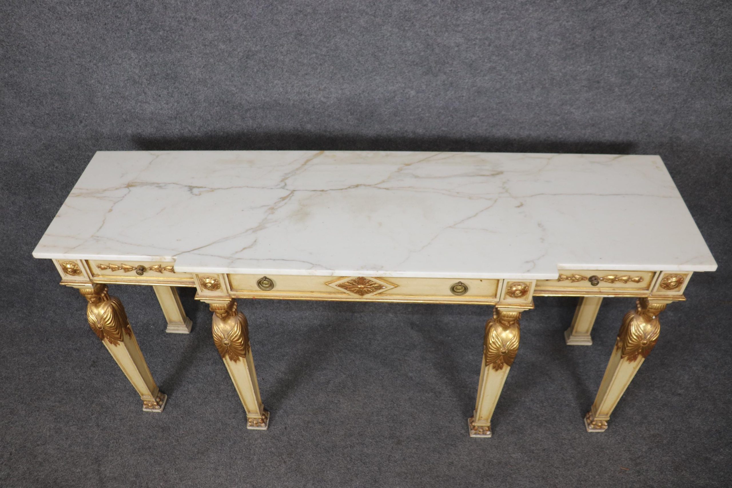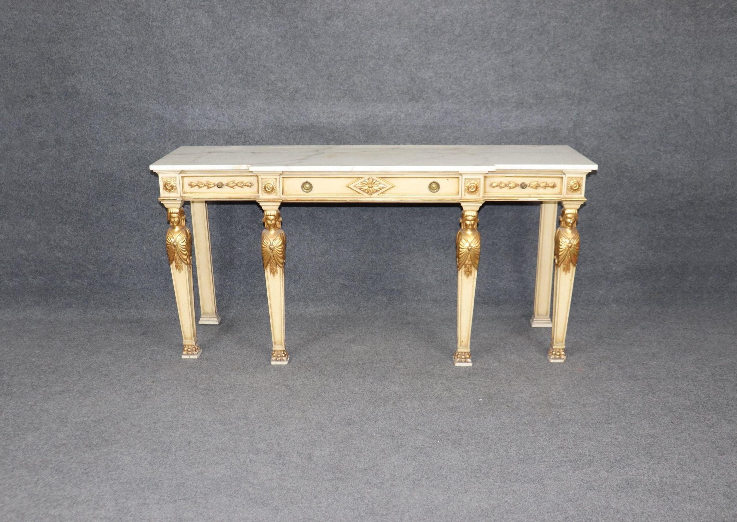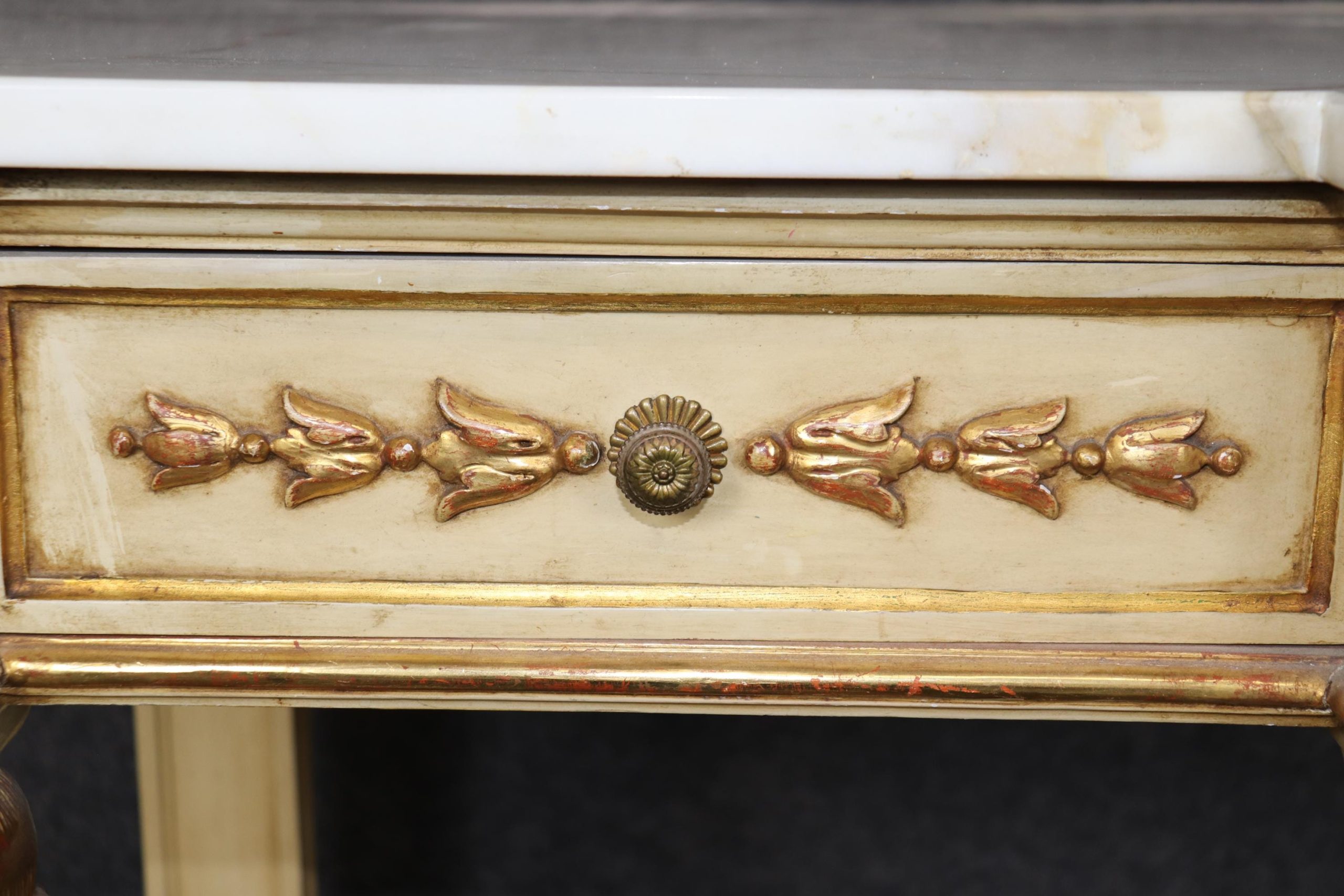 This vintage French Empire style creme and gilt marble top console table sofa table is made of the highest quality! If you look closely at the photos provided, you will see the attention to detail in the gilt decoration. There are 3 drawers, perfect for keeping your personal items safe. This console is perfect for your living room, entryway, bedroom, dining room or office! This piece can also be paired with a variety of other styles due to its simplistic yet luxurious design! This sofa table is bound to bring a lovely sense of sophistication and luxury into your home and will certainly be a conversation starter at your next gathering. The piece is in vintage condition with surface scratches and some finish loss as to be expected from an item of age and use.