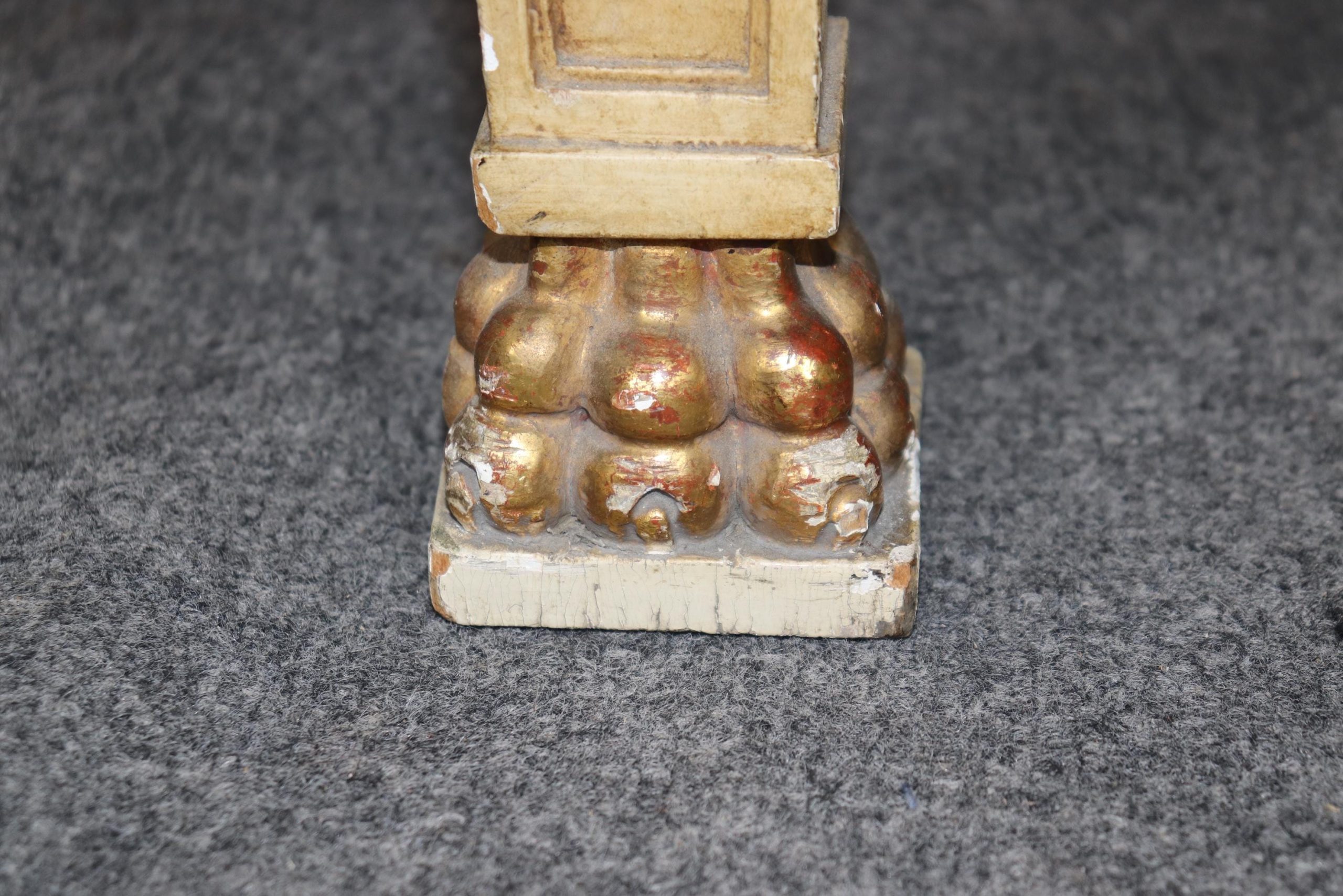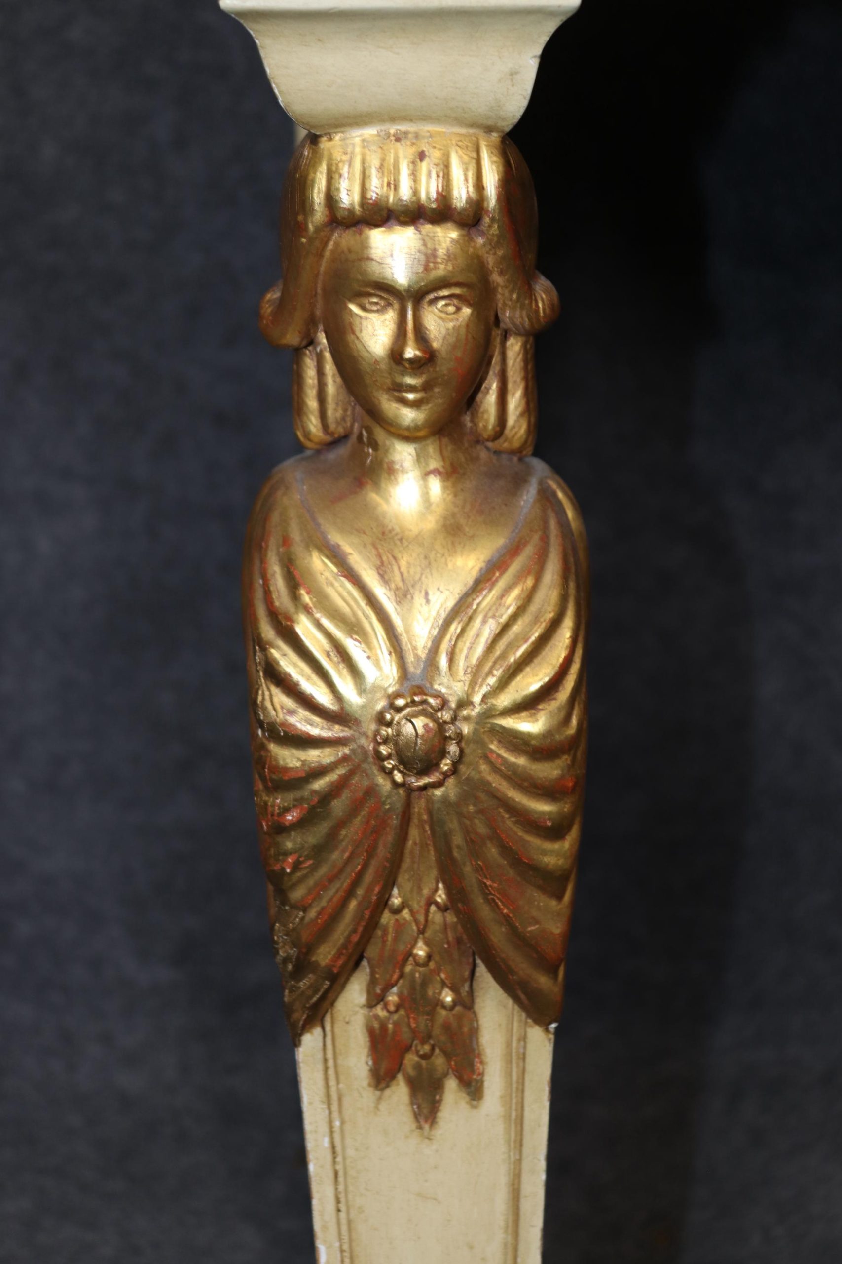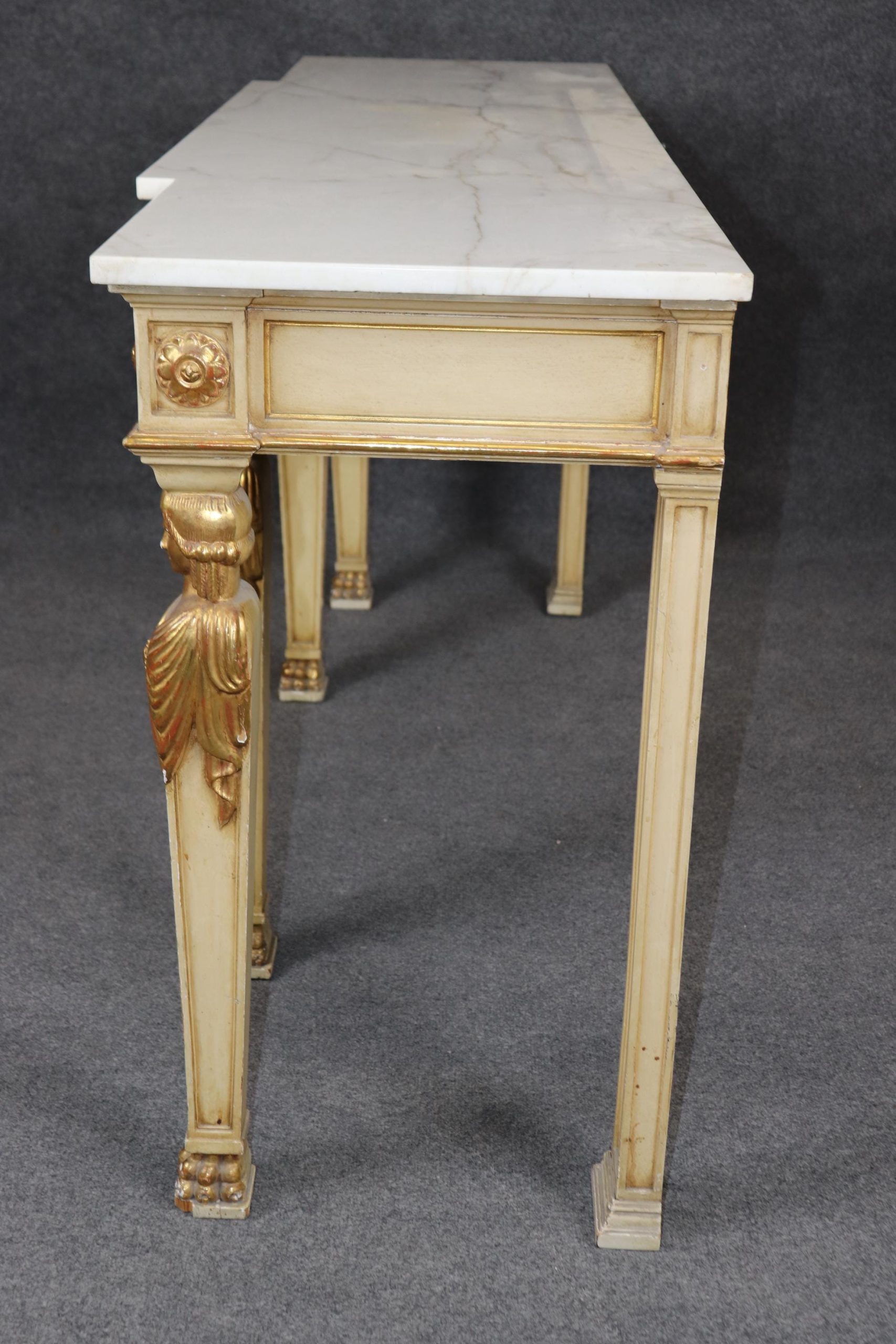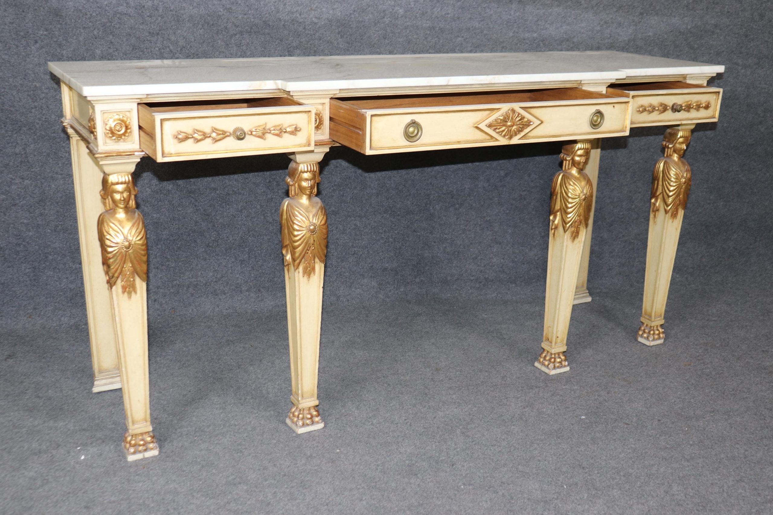 This vintage French Empire style creme and gilt marble top console table sofa table is made of the highest quality! If you look closely at the photos provided, you will see the attention to detail in the gilt decoration. There are 3 drawers, perfect for keeping your personal items safe. This console is perfect for your living room, entryway, bedroom, dining room or office! This piece can also be paired with a variety of other styles due to its simplistic yet luxurious design! This sofa table is bound to bring a lovely sense of sophistication and luxury into your home and will certainly be a conversation starter at your next gathering. The piece is in vintage condition with surface scratches and some finish loss as to be expected from an item of age and use.